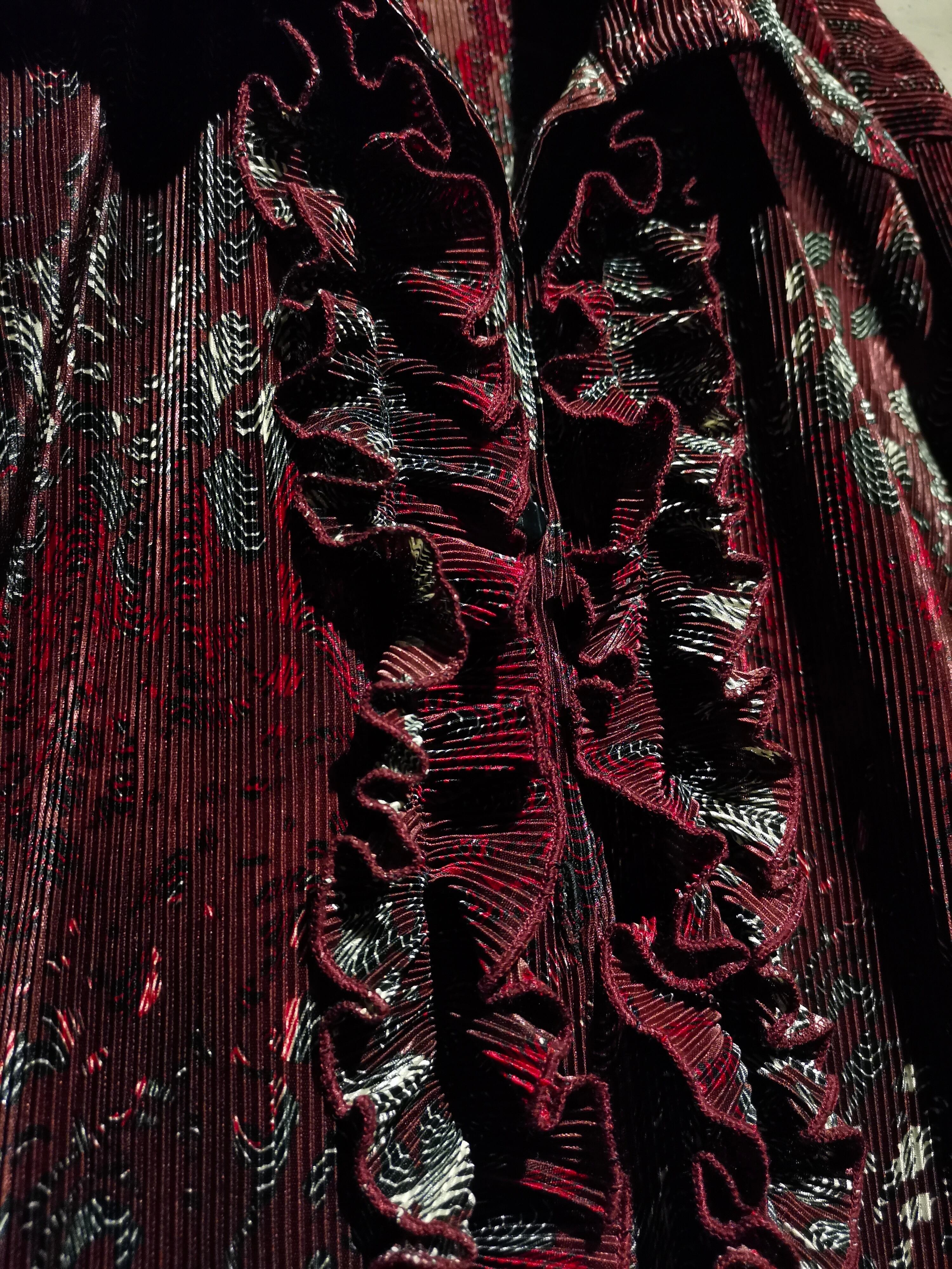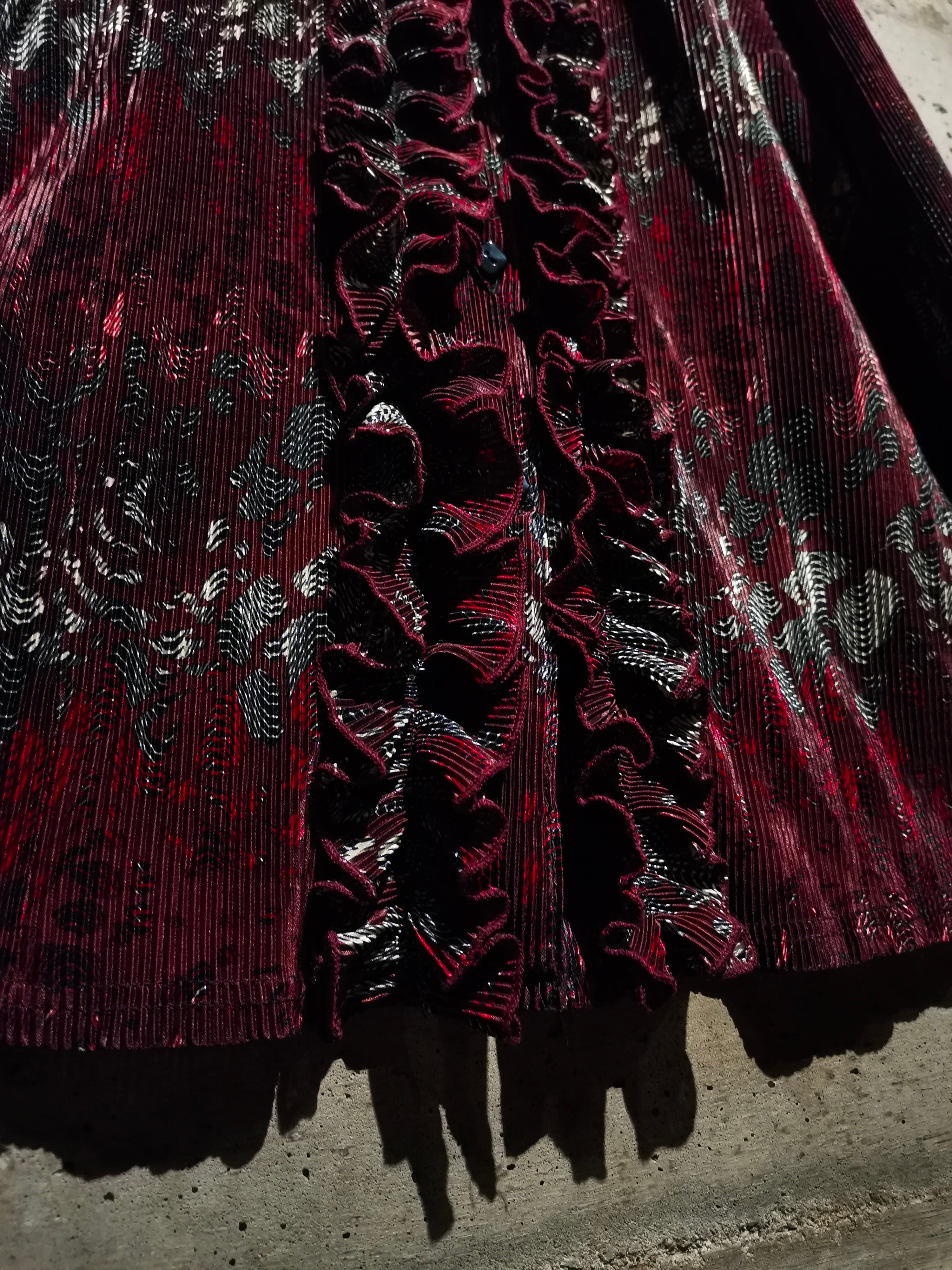 細かなプリーツに躍動的なフリル、そして美しい柄使いの掛け合わせにより、奥行き深い美しい仕上がりを見せる稀有な一品。