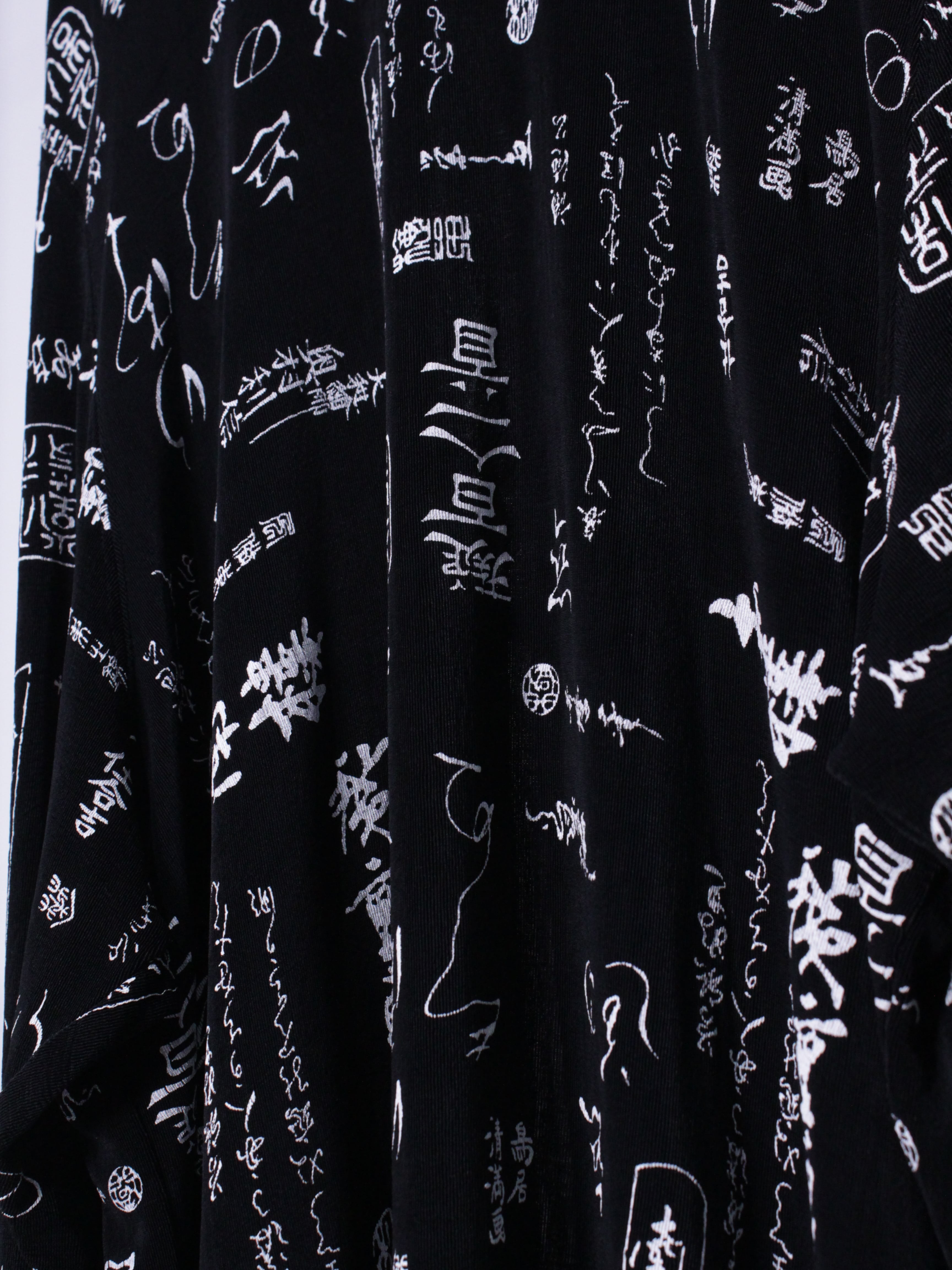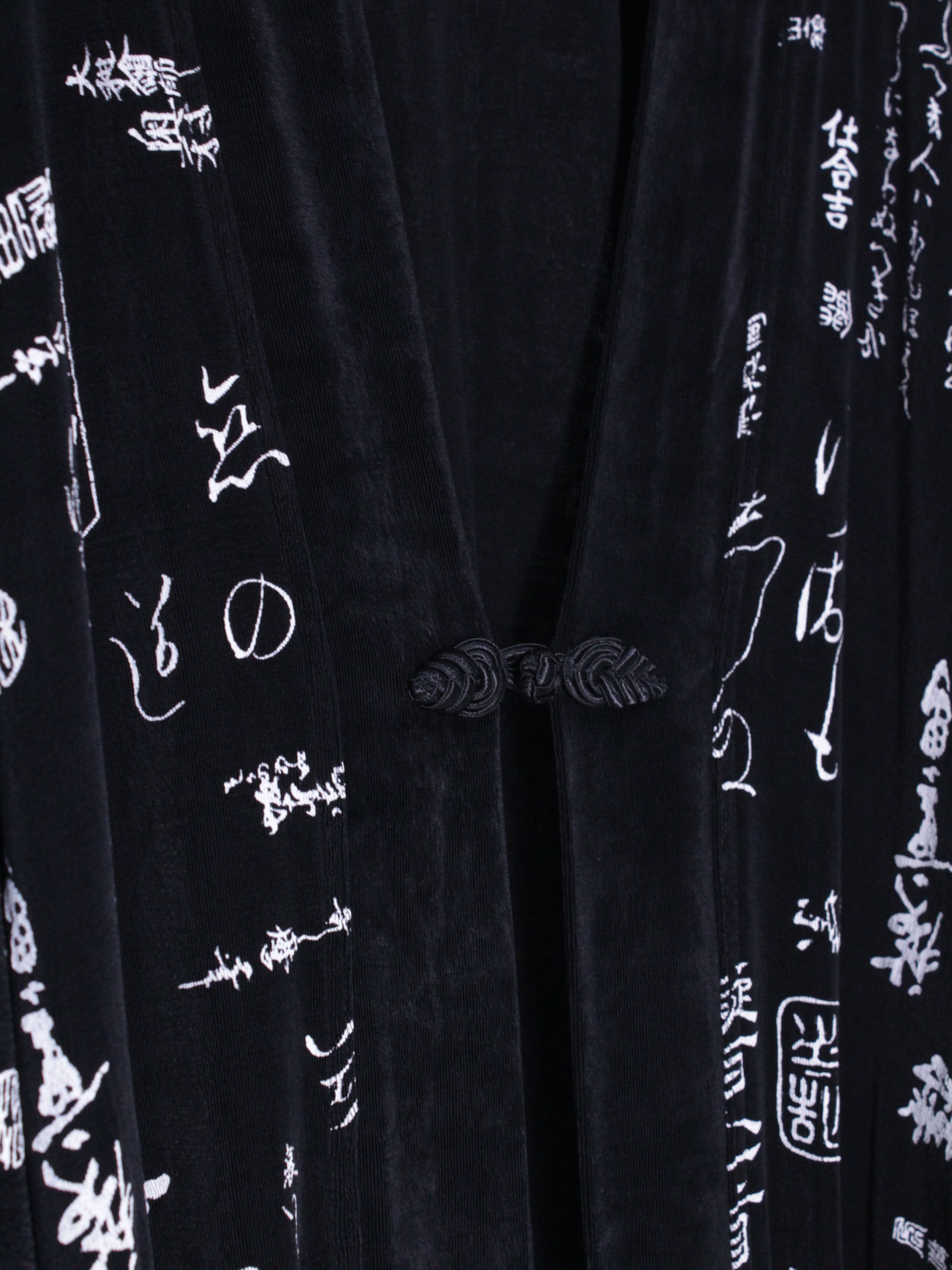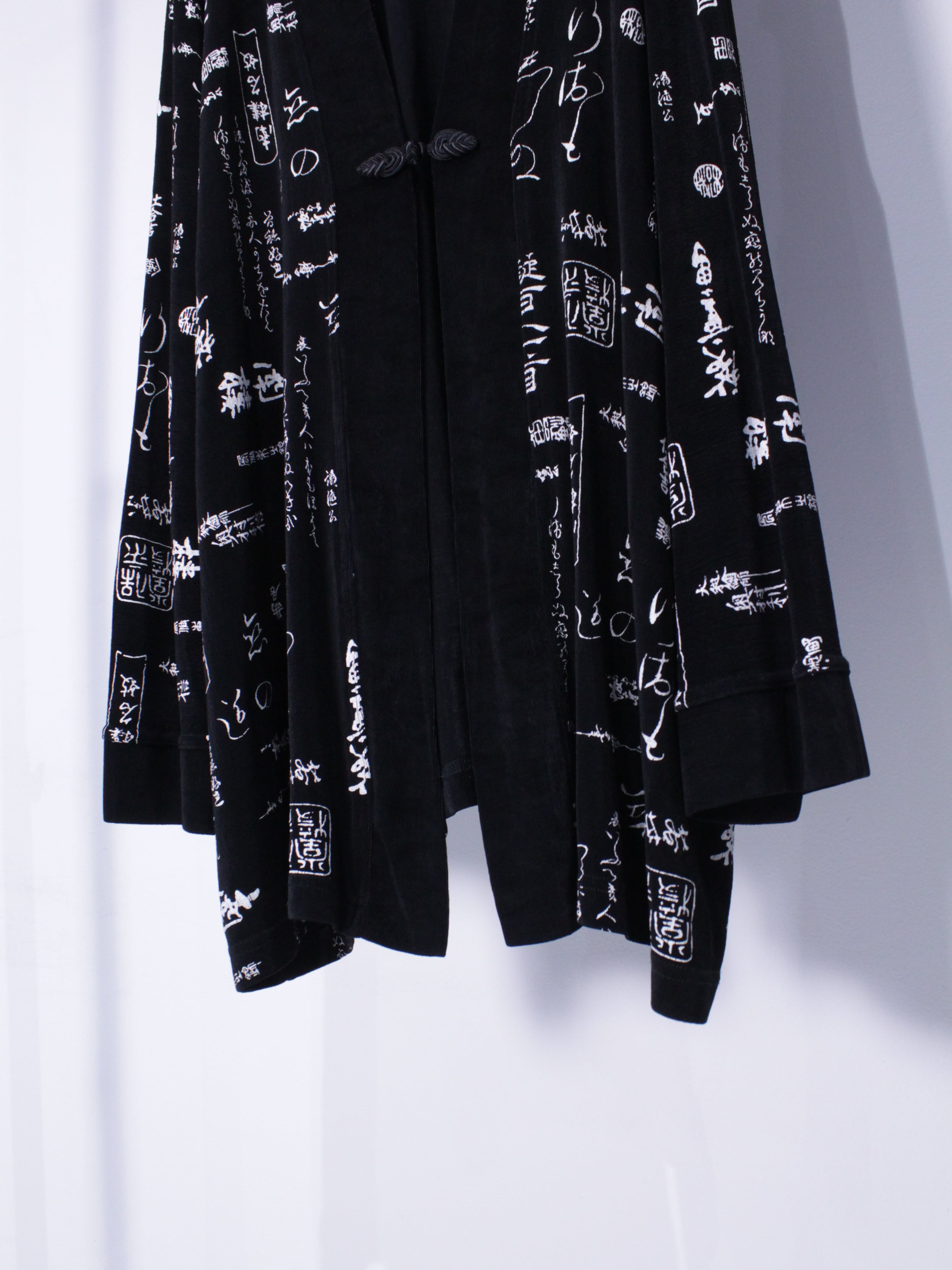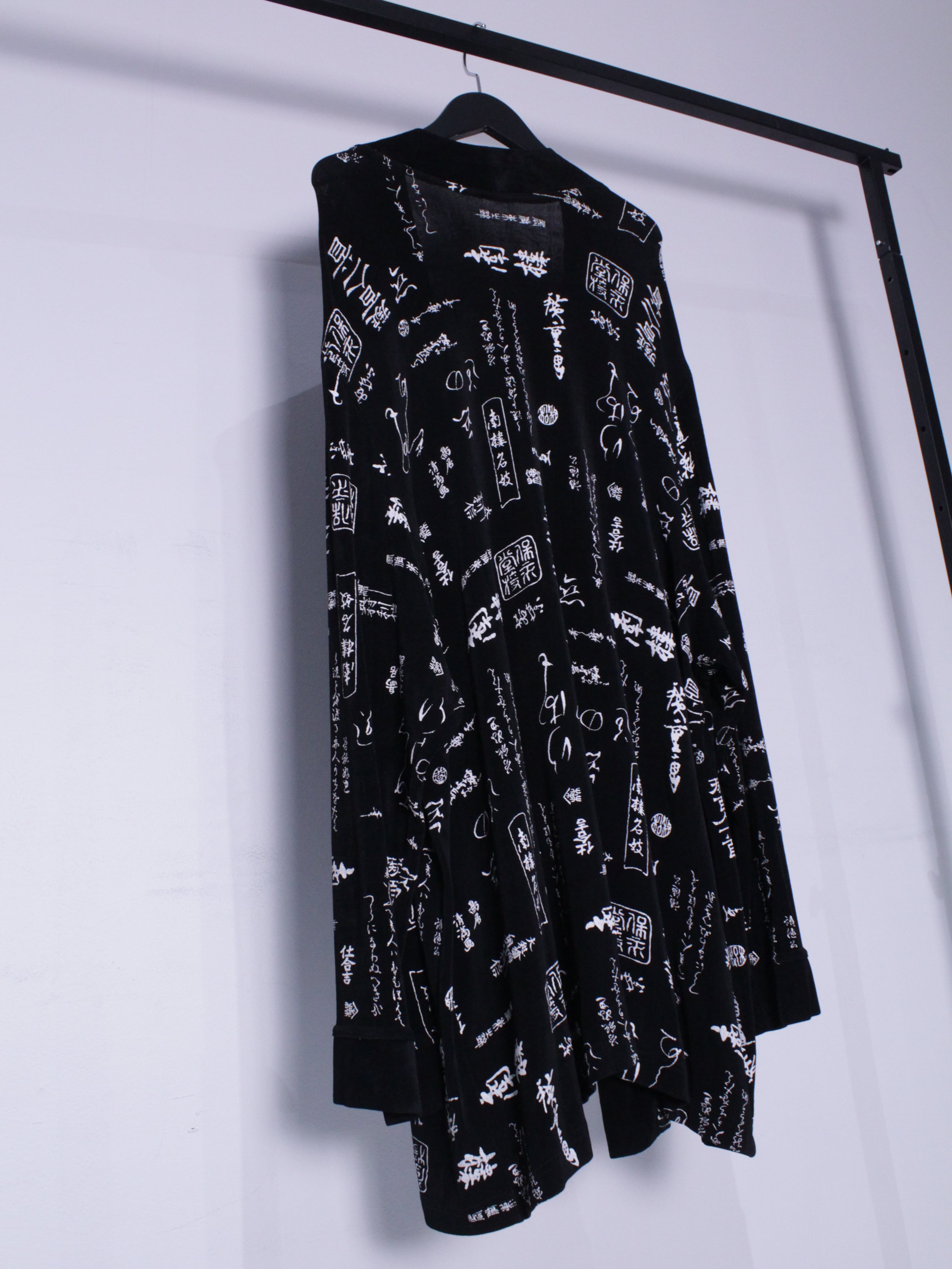 伸縮性のあるブラックのボディをベースに"漢字"をデザインに載せた、モードやチャイナな雰囲気漂う羽織。