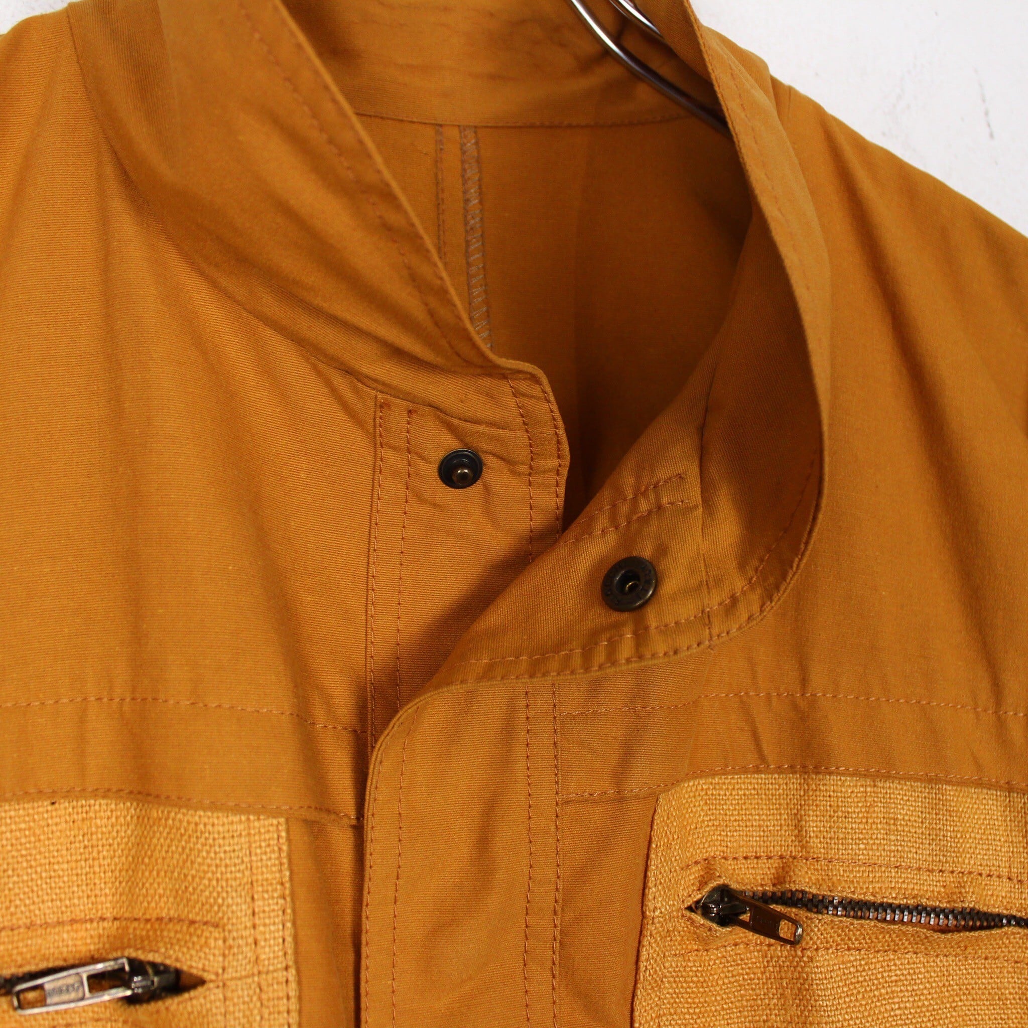 両胸のジップポケットには麻のようなガシッとした素材の切り替え、両ポケット部分にはレザーを切り替えた、様々な素材をふんだんに使用にしたクオリティの高い1着。