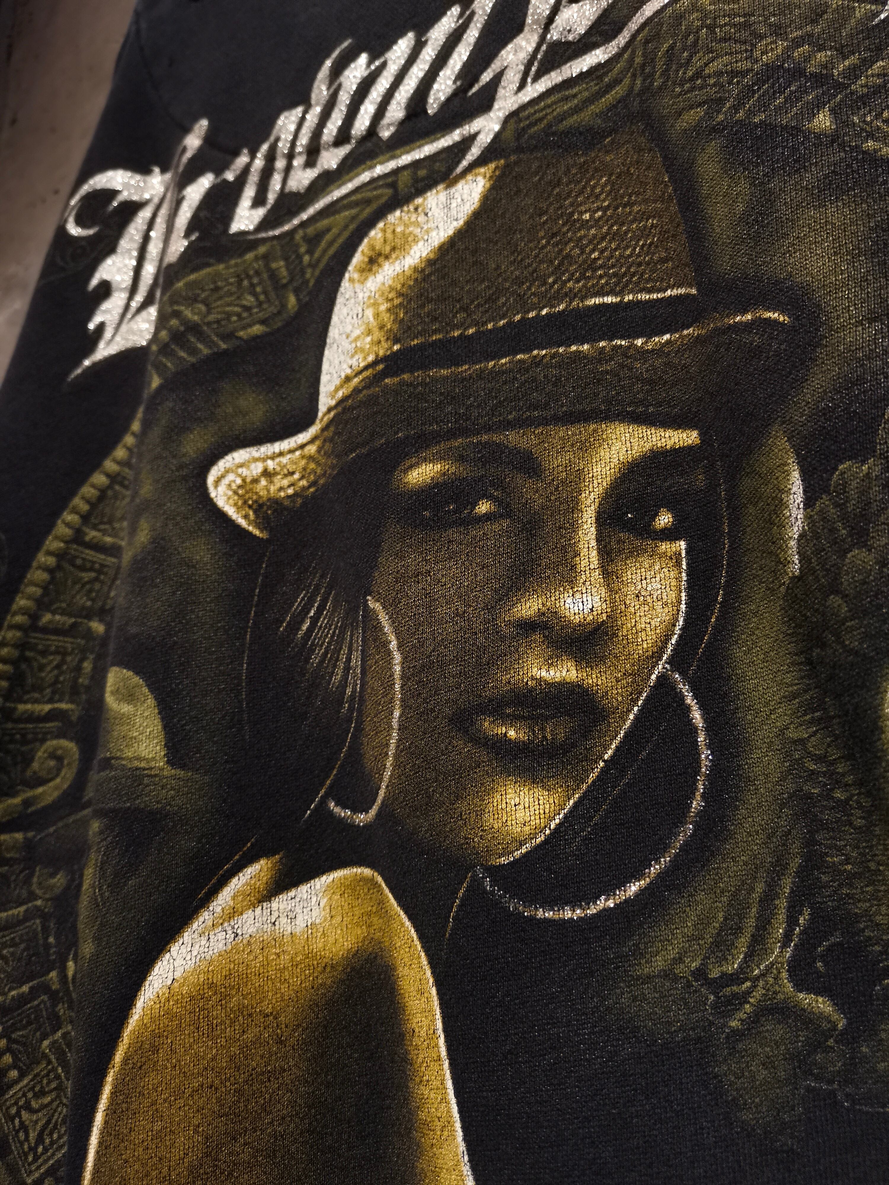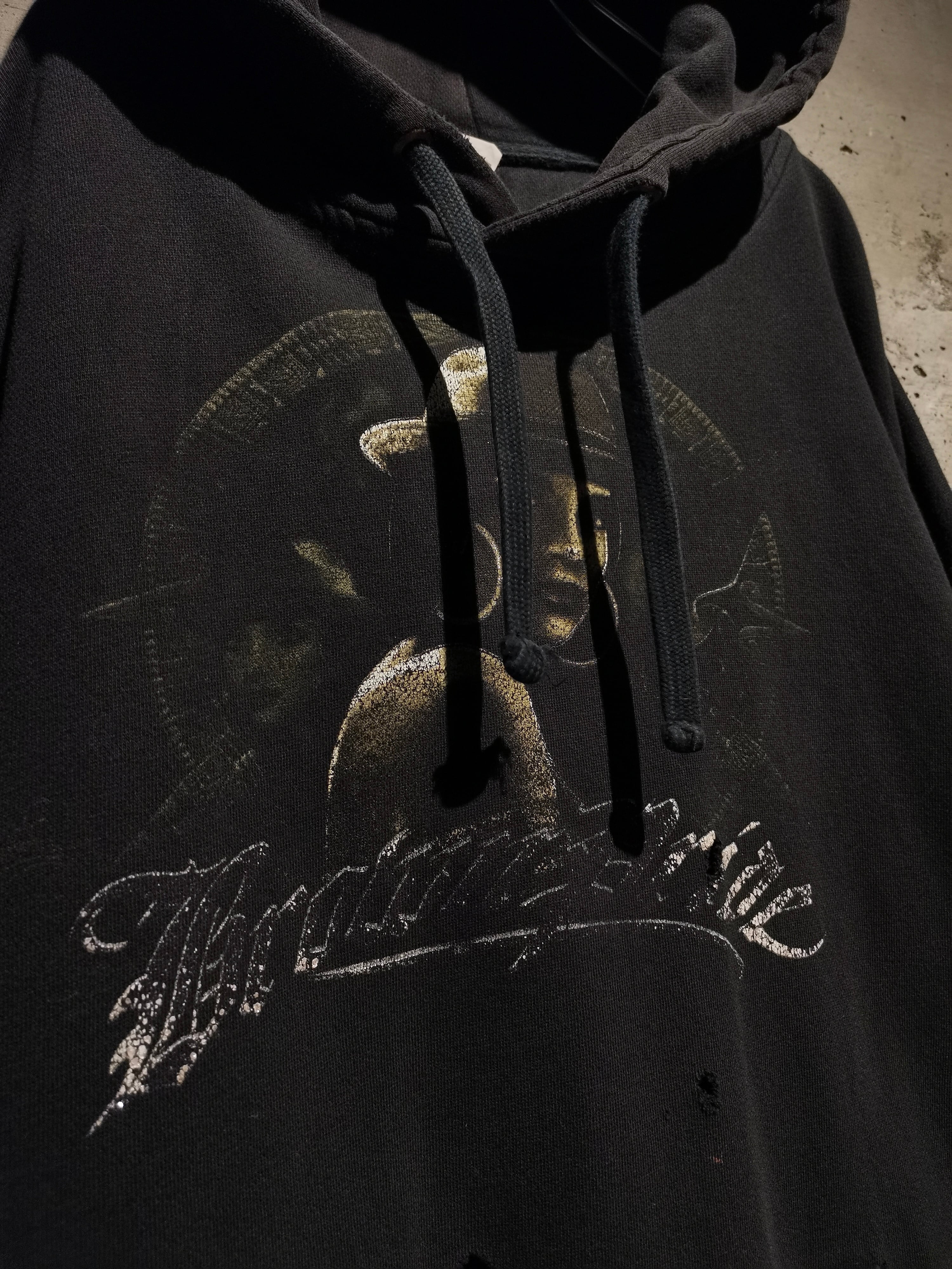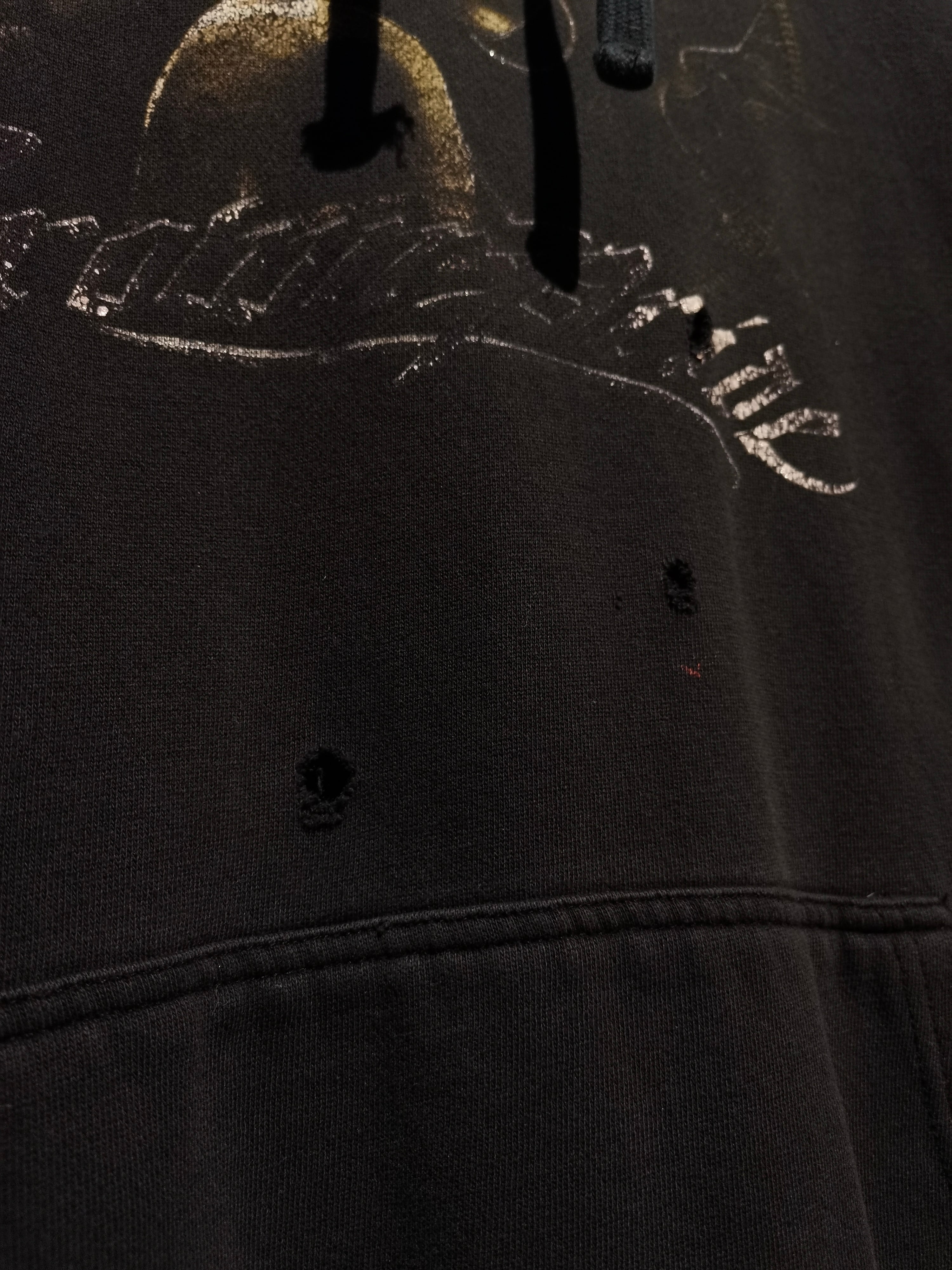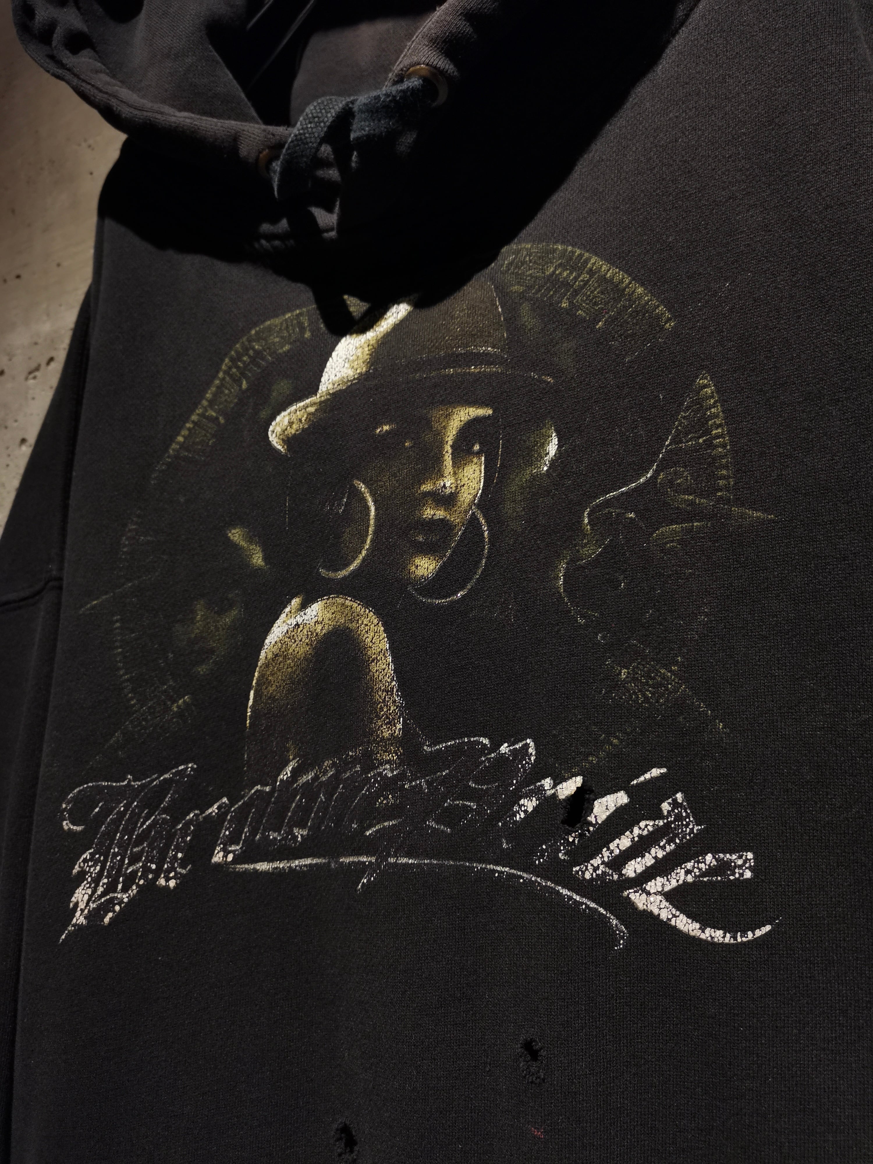 エイジングやダメージの効いたボディの退廃的な雰囲気とプリントのグラフィックのノリの掛け合わせが◎プリントには部分的にラメプリントを組み込まれたことによる、Bling-Blingな表情も非常にイケてますね。