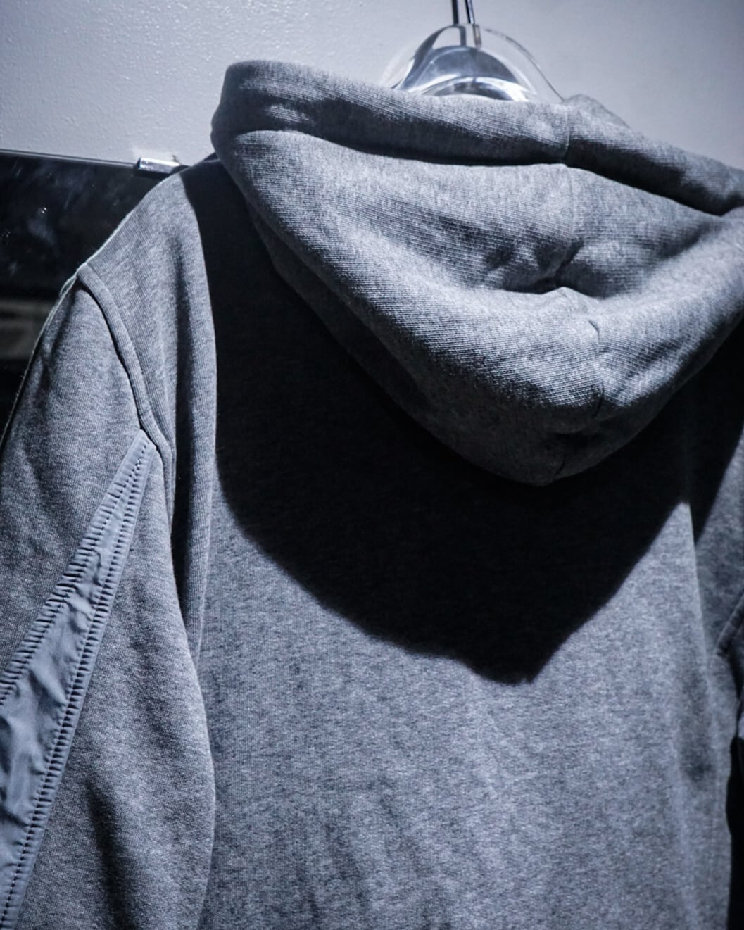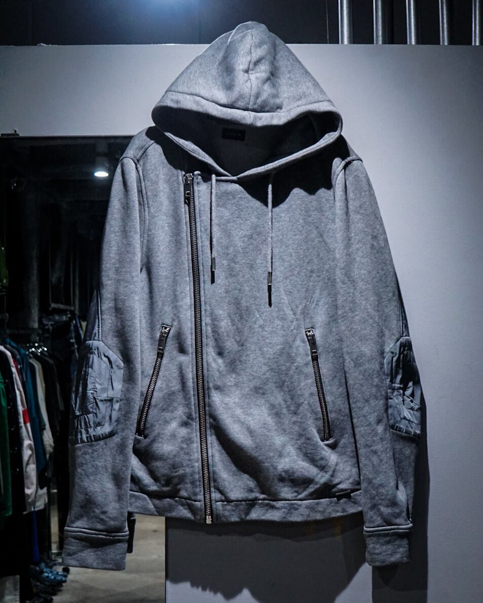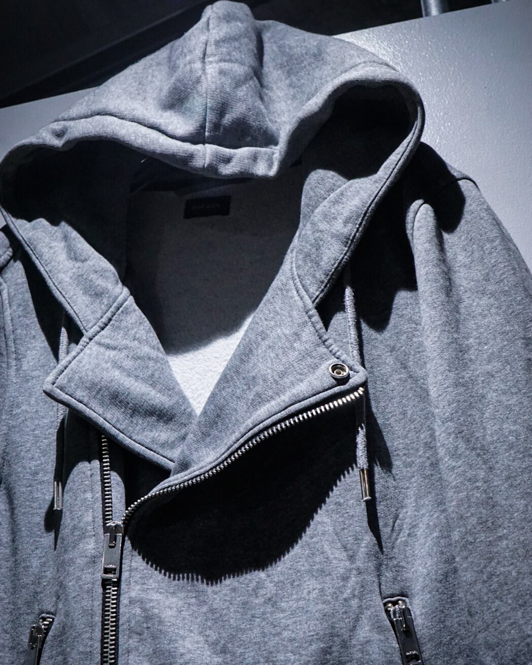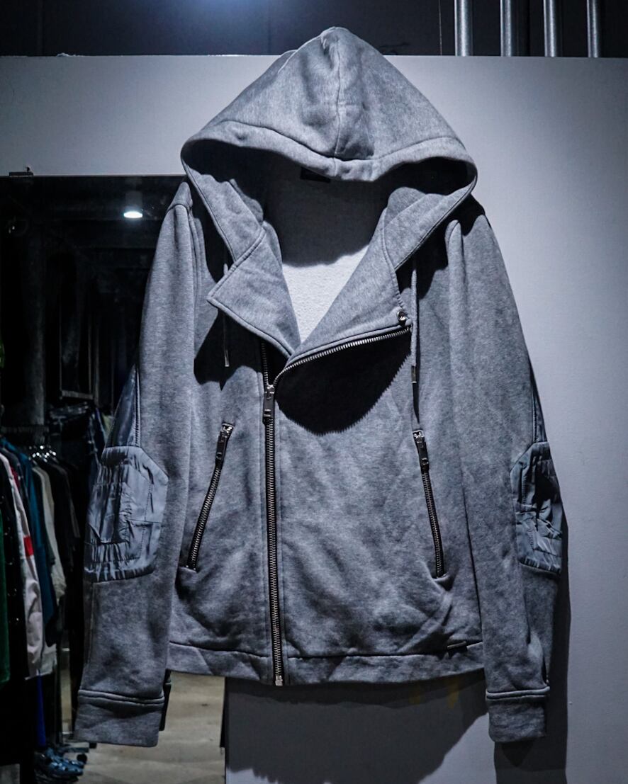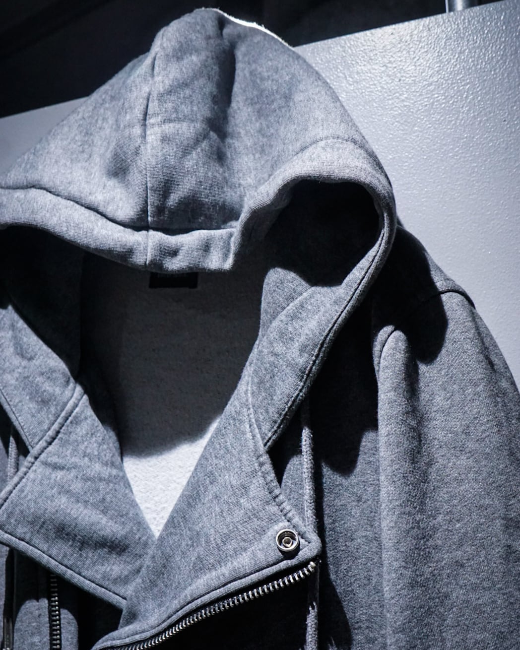 肉感のあるグレーのボディに、ダブルライダースジャケットのギミックが落とし込まれた稀有なジップアップフーディ。