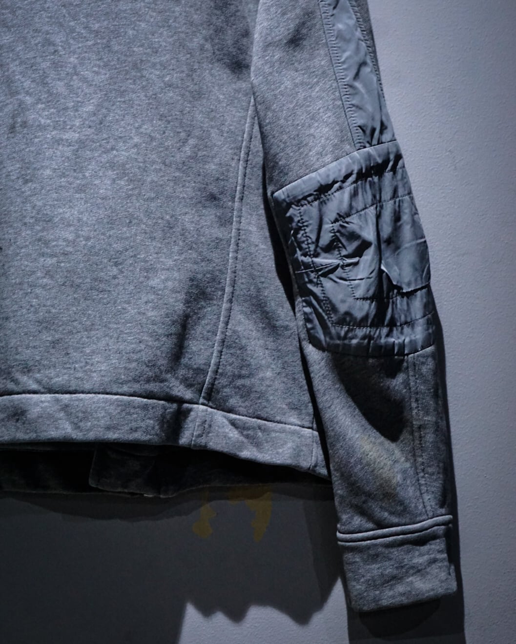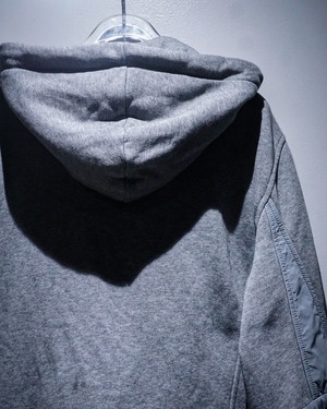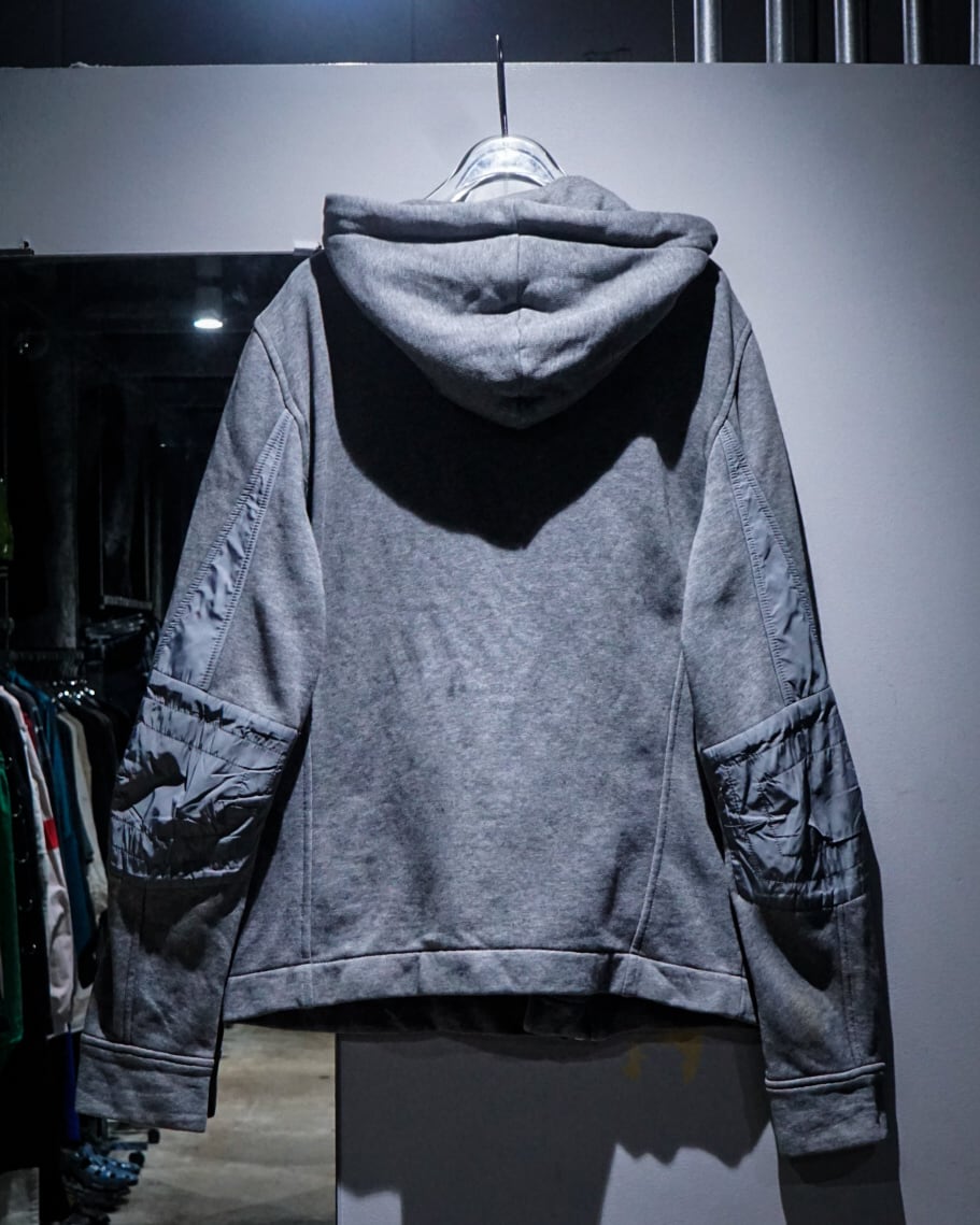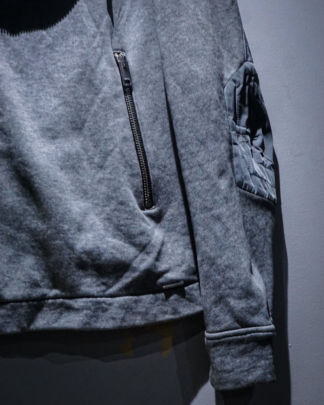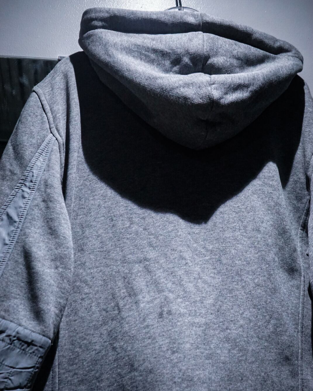 肉感のあるグレーのボディに、ダブルライダースジャケットのギミックが落とし込まれた稀有なジップアップフーディ。