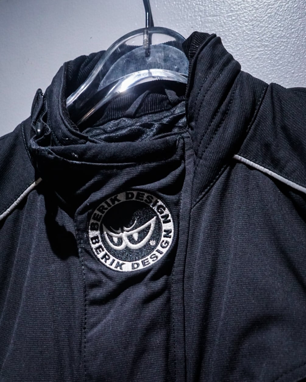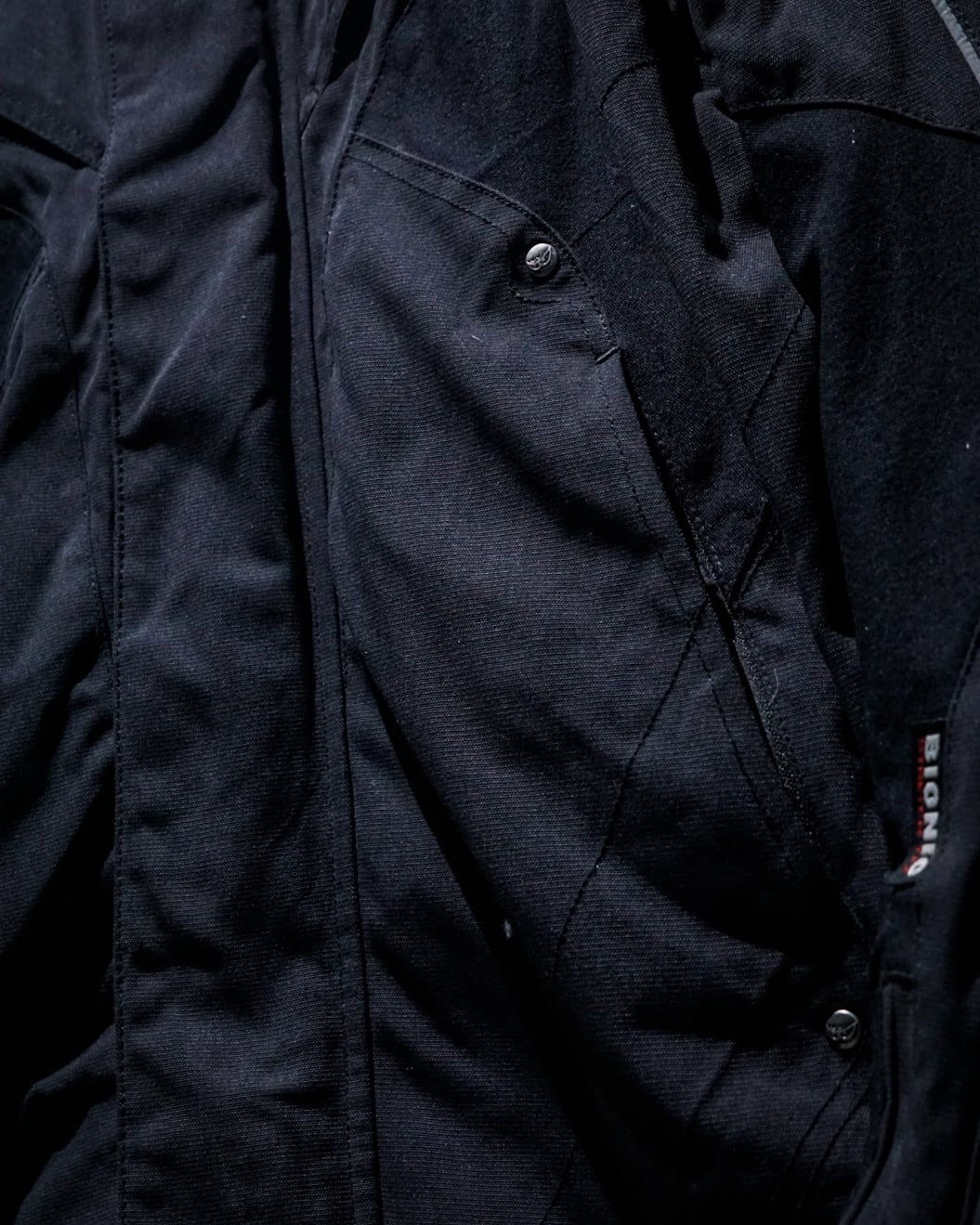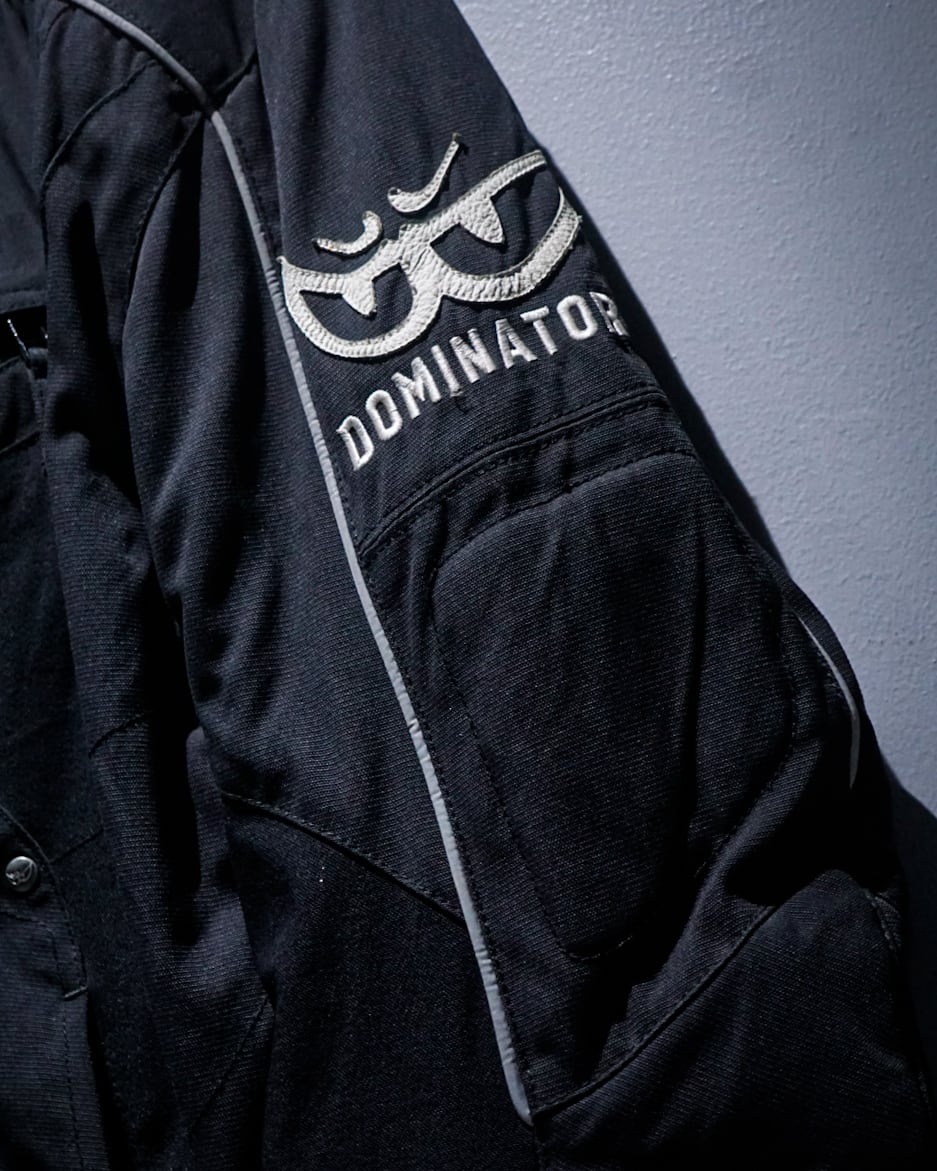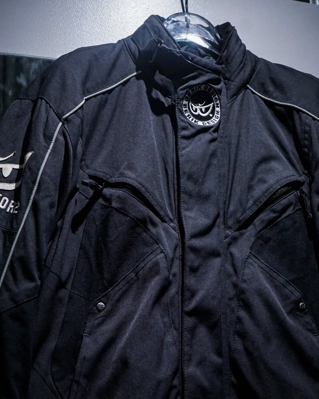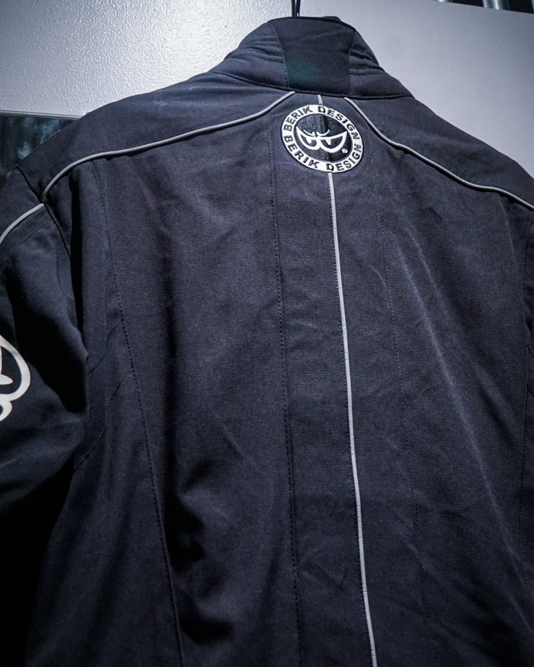 ブラックのナイロンボディをベースに、レーシングならではのギミックを盛り込んだ1着。