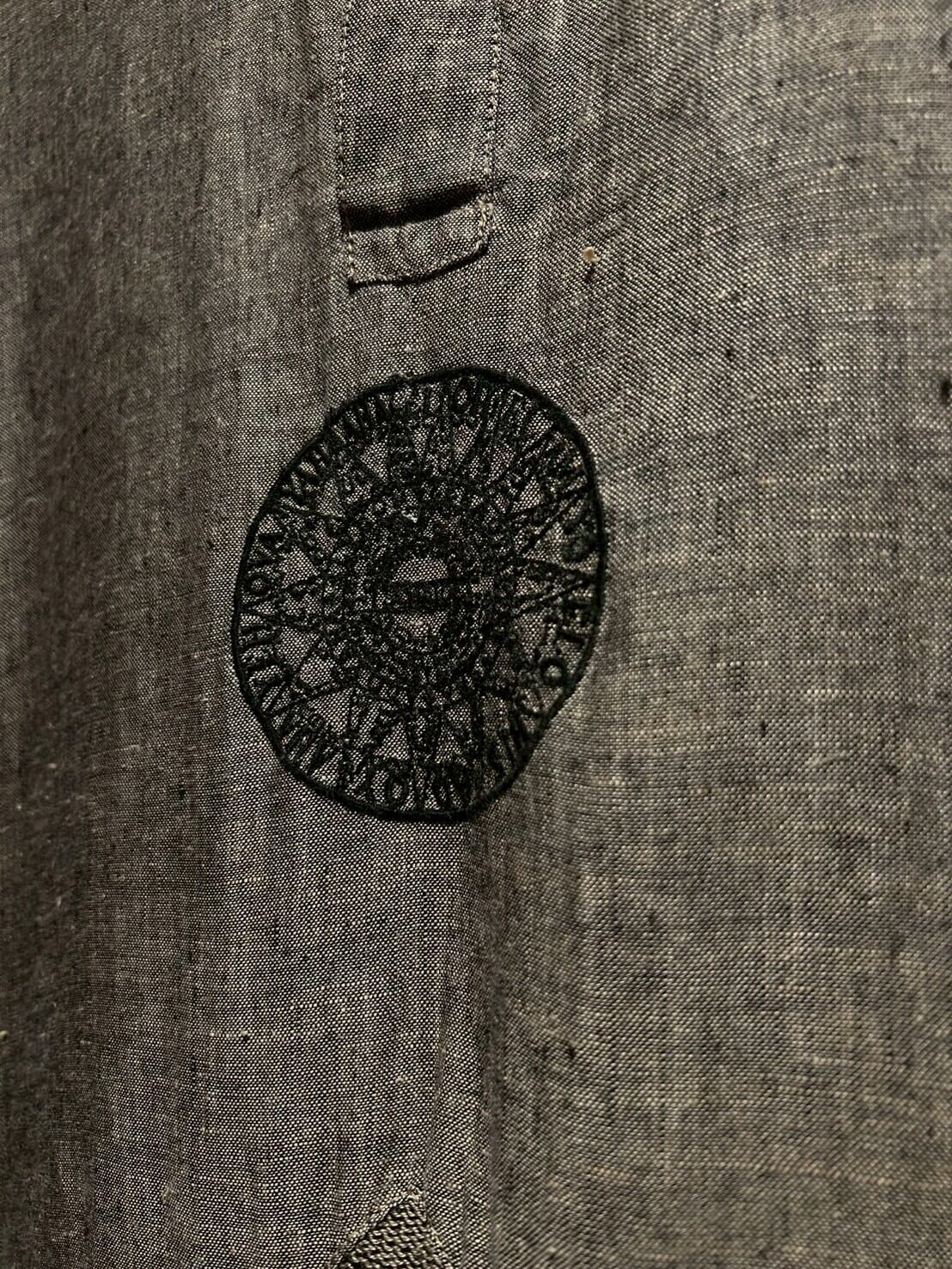 フロントには刺繍で幾何学的な柄模様を、裾付近にはハーフボタンのディテール。細やかデザインはさる事ながら、ワントーンのカラーリングの中に生地を切り替えた事で生まれる立体感が◎