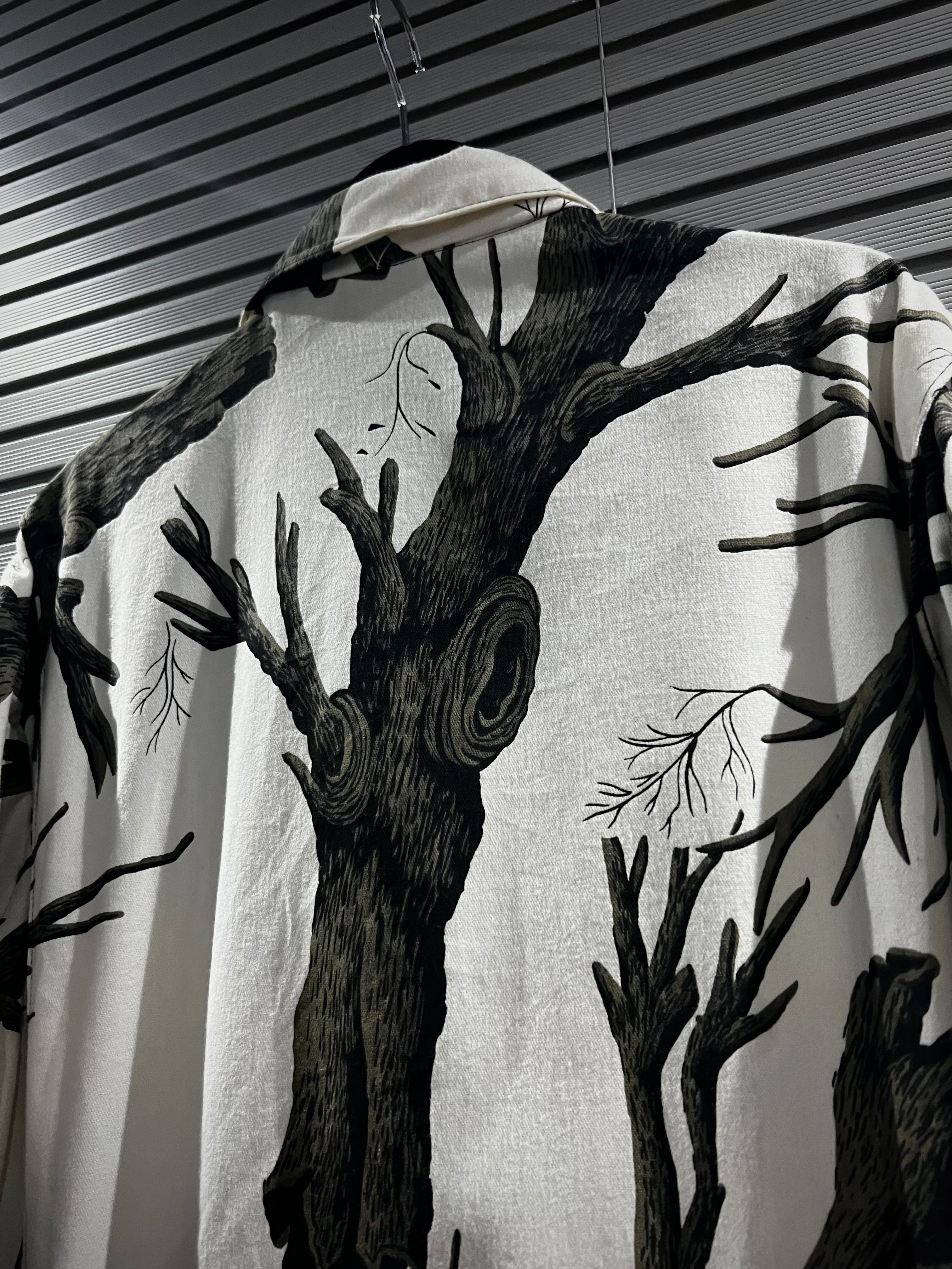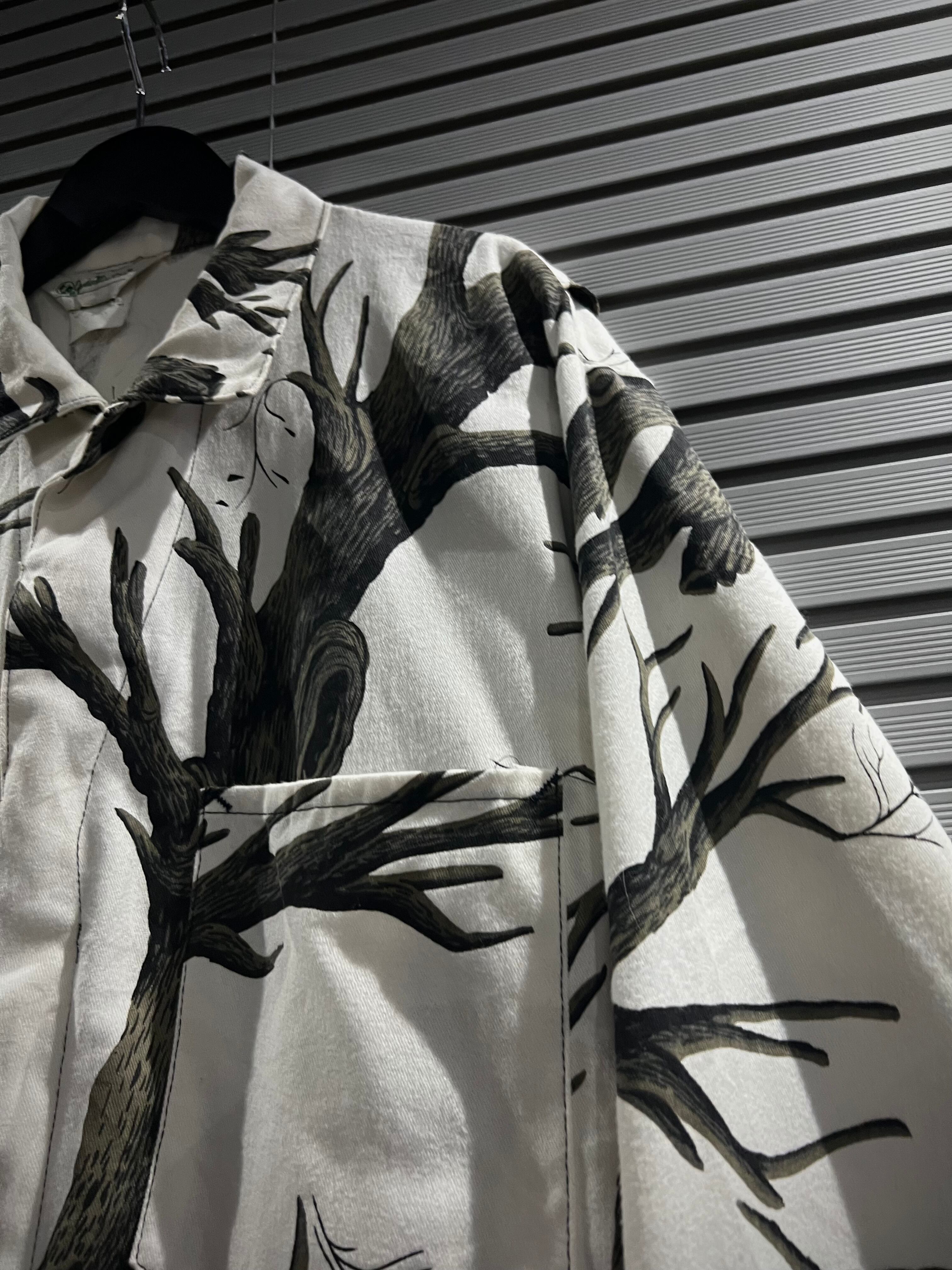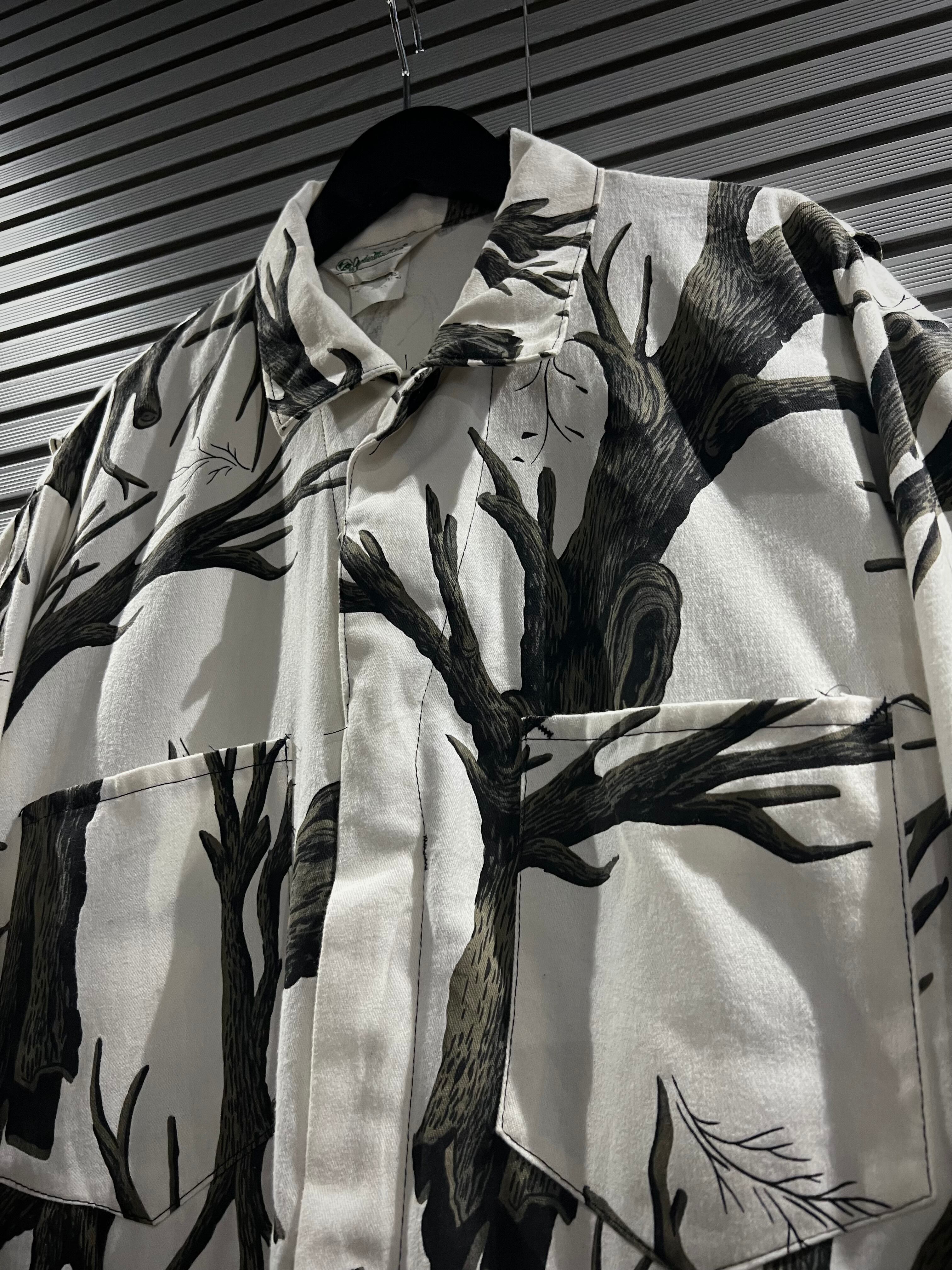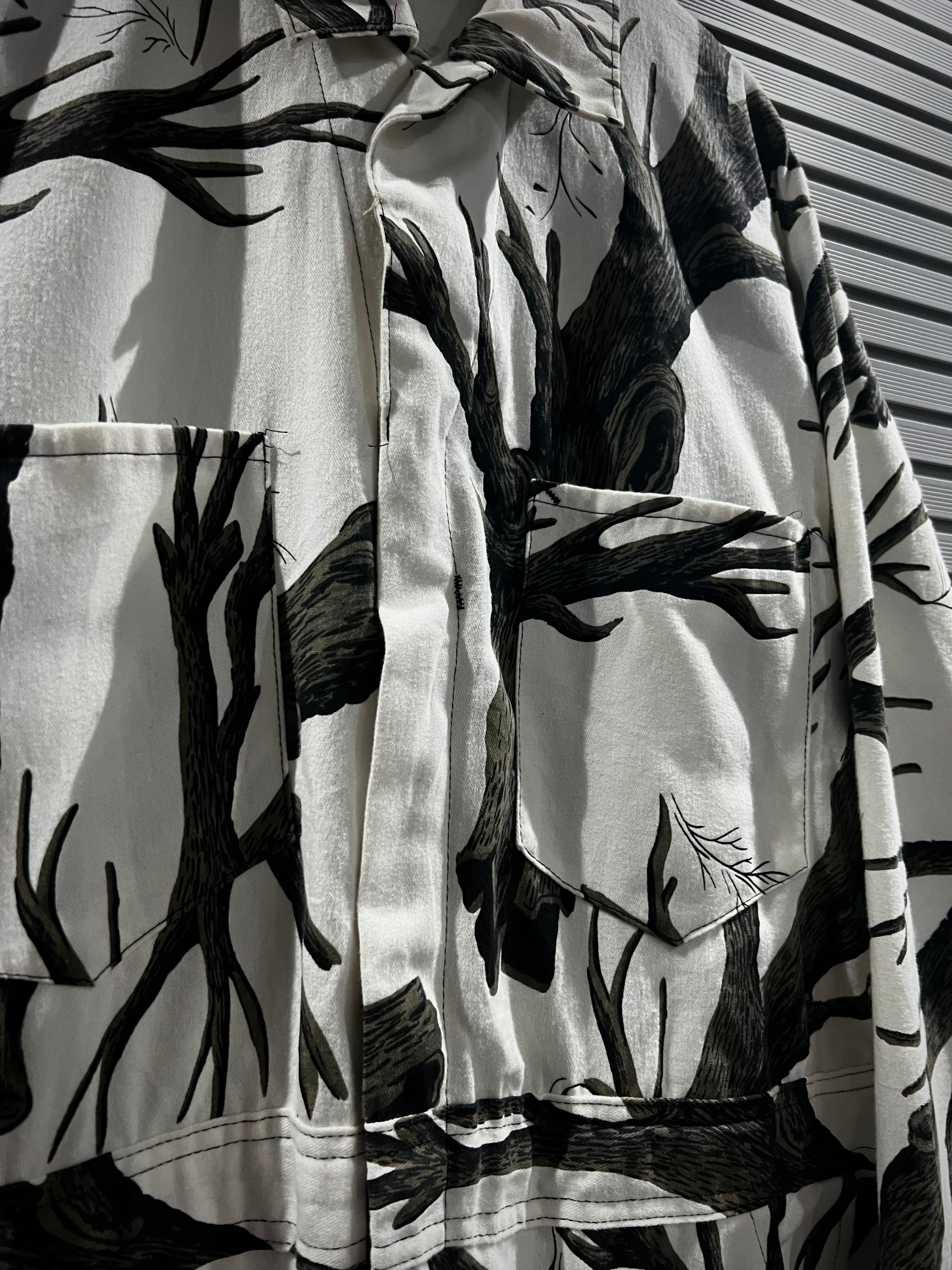 ホワイトベースにリアルな木と立体感のあるデザイン。両胸にはポケット、フロントは比翼仕立てとデザインを引き立てるディテールも素晴らしいですね。