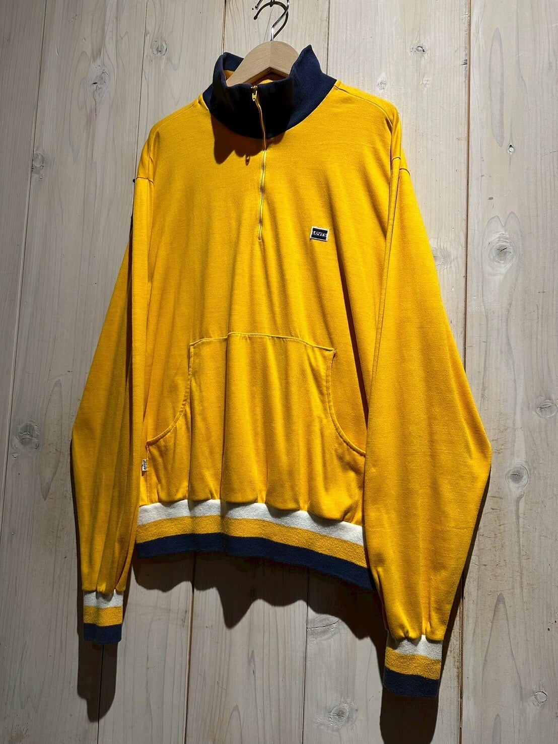 リブには白、黄色、ネイビーのラインに、ハイネックの首元にはネイビーの切り替え。この年代らしいレトロでどこかポップさも感じられるカラーバランスが最高です。