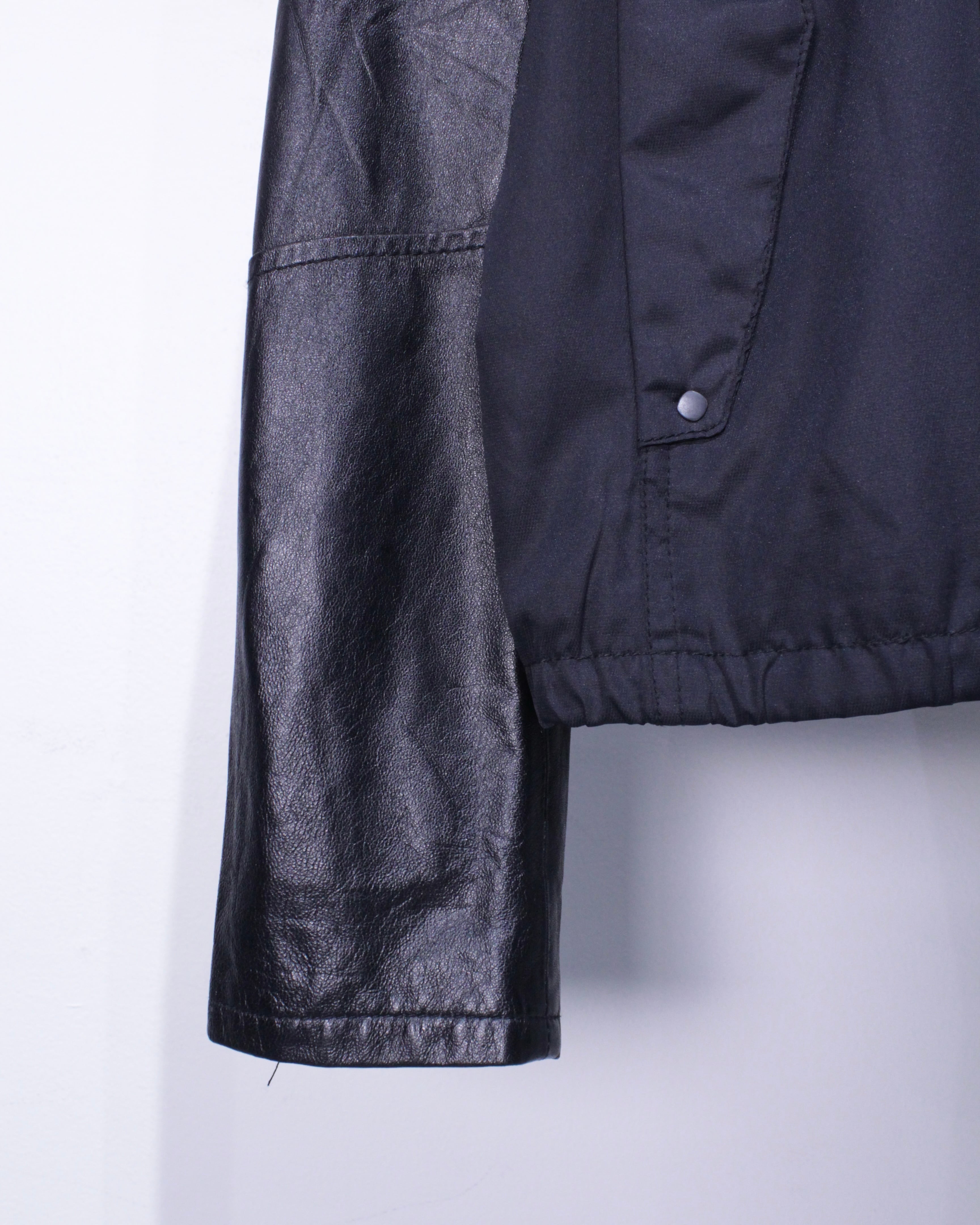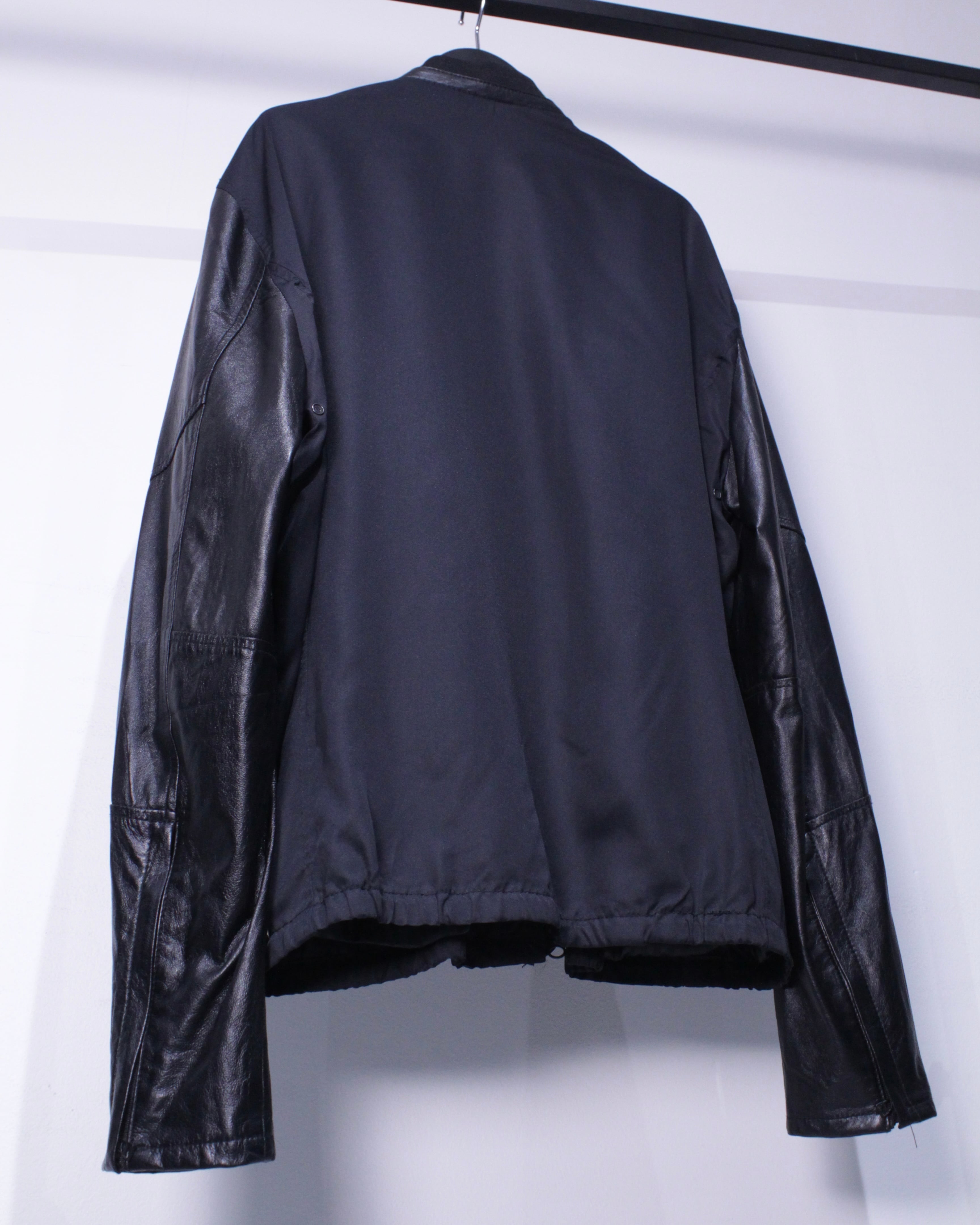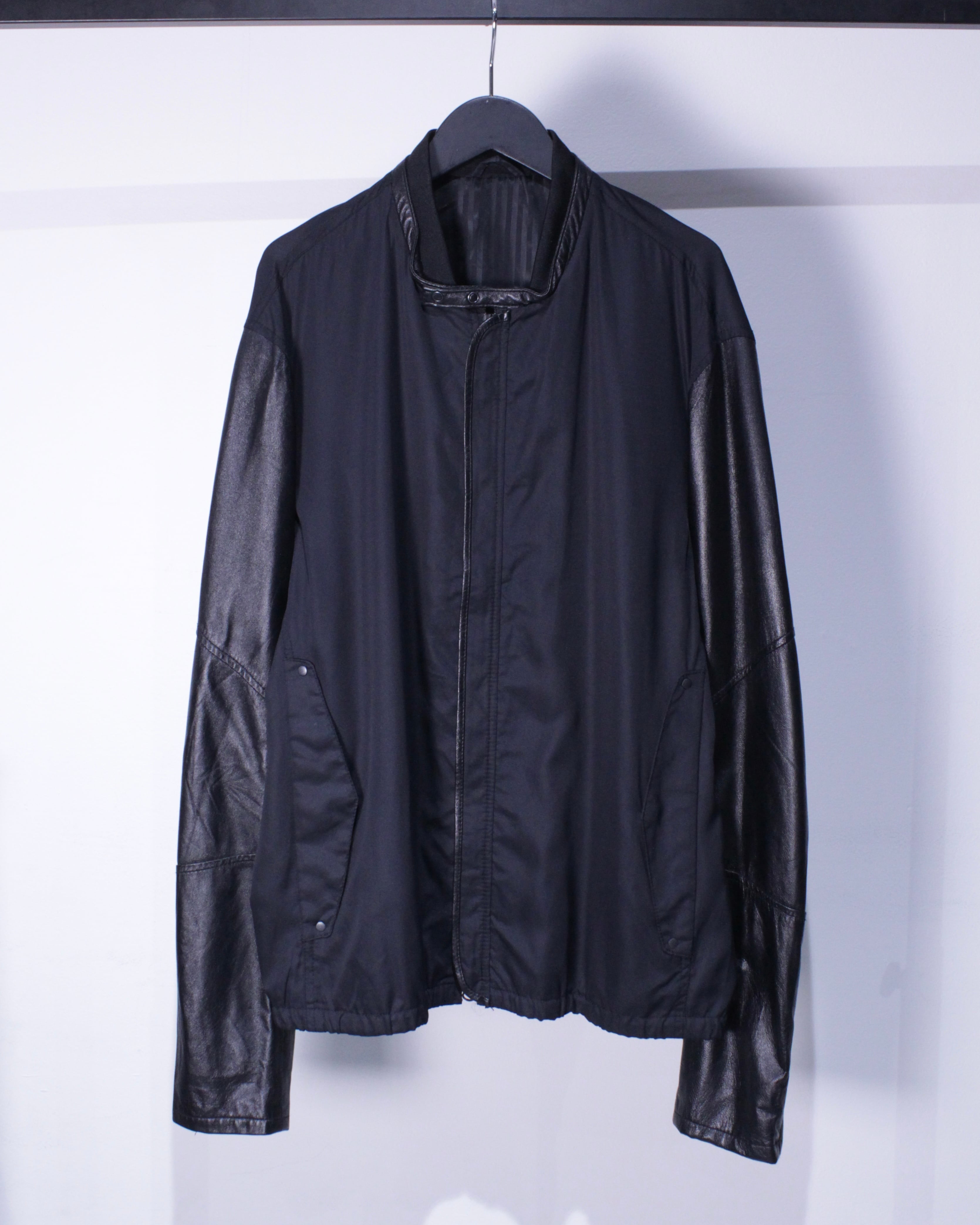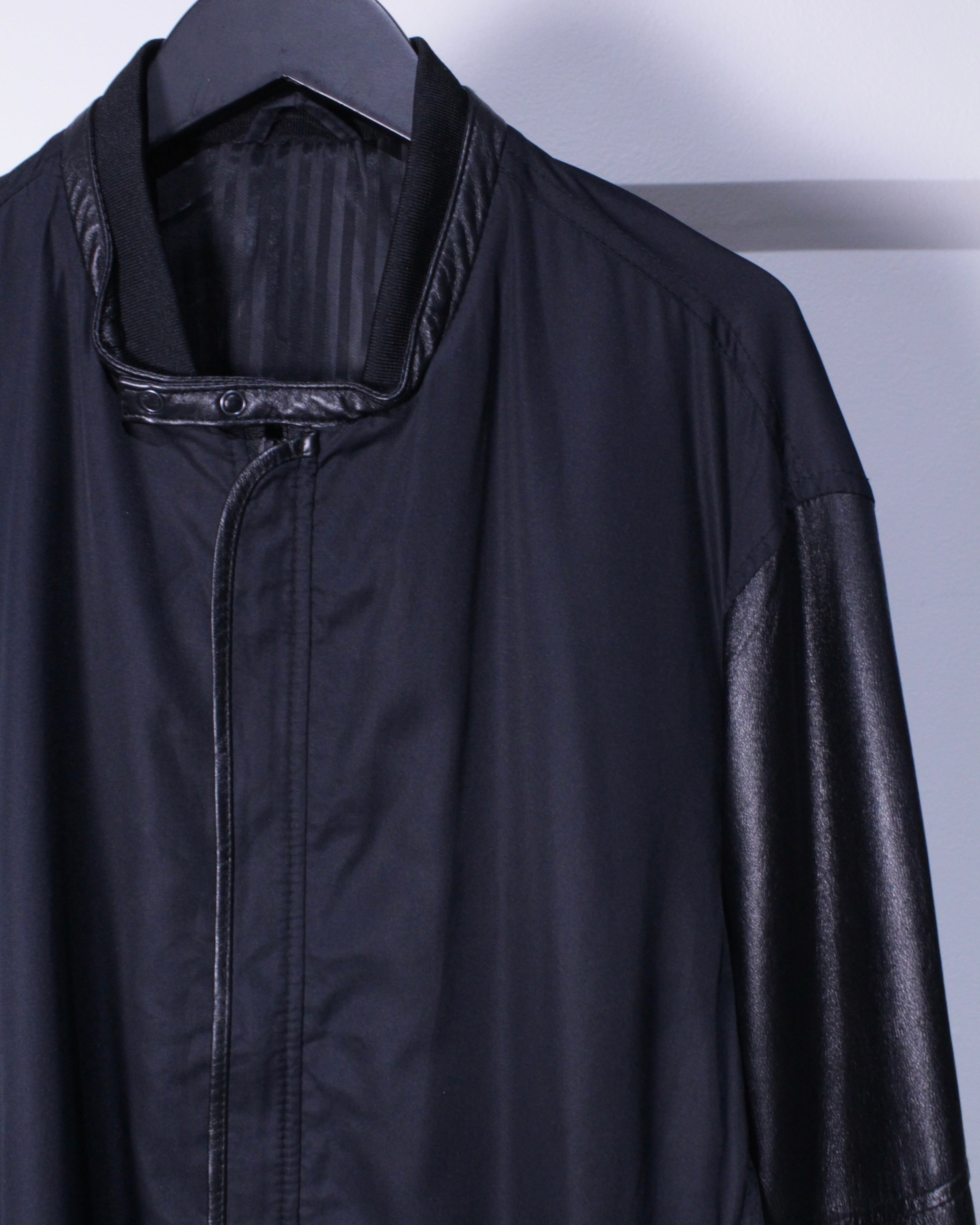柔らかくサラッとしたポリエステルのボディをベースに、袖にしなやかな肌触りの上質なラムレザーを切り替えたブルゾンジャケット。