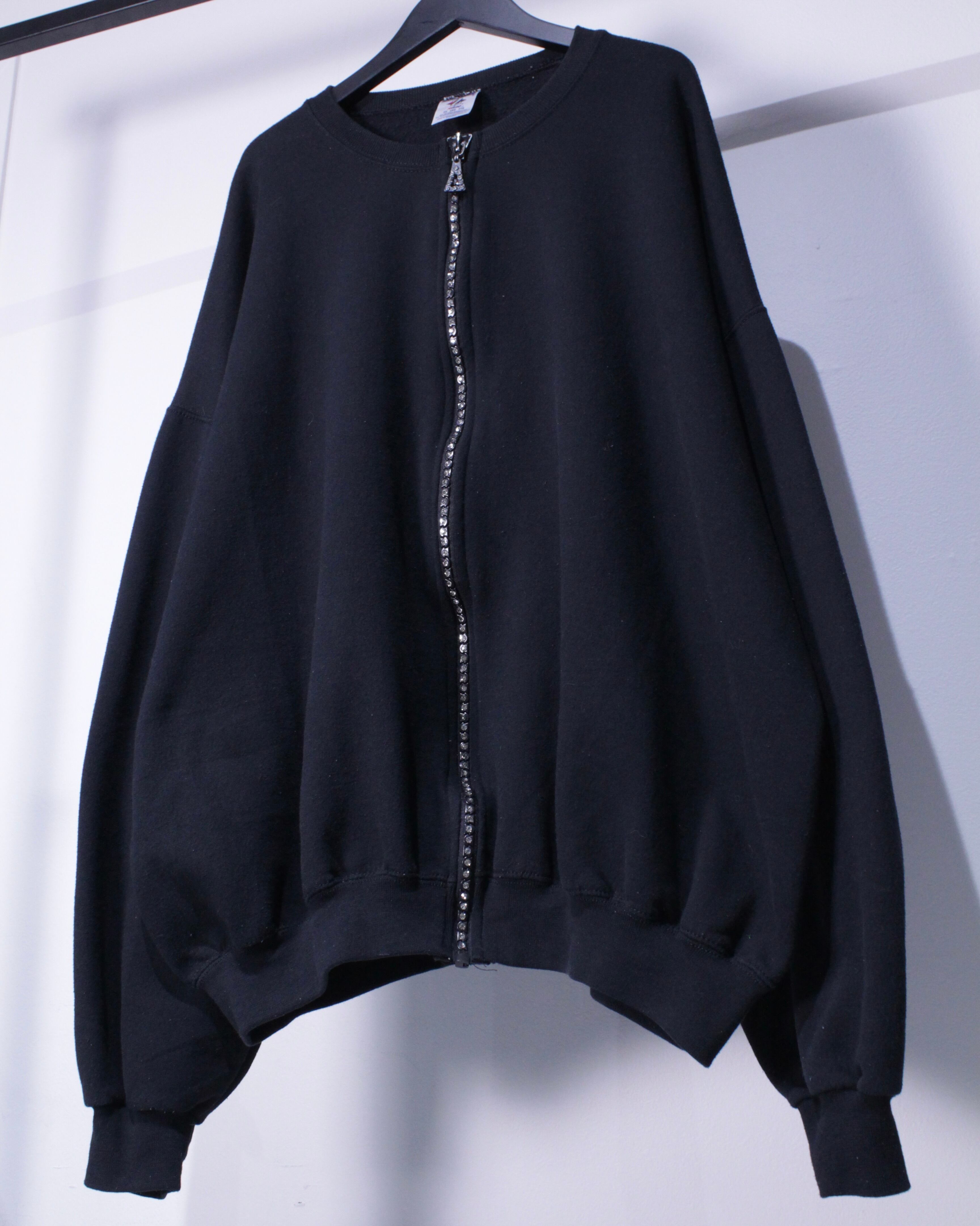 ブラックのスウェット素材をベースに、フロントのジップ部分にはラインストーンを施したジップジャケット。