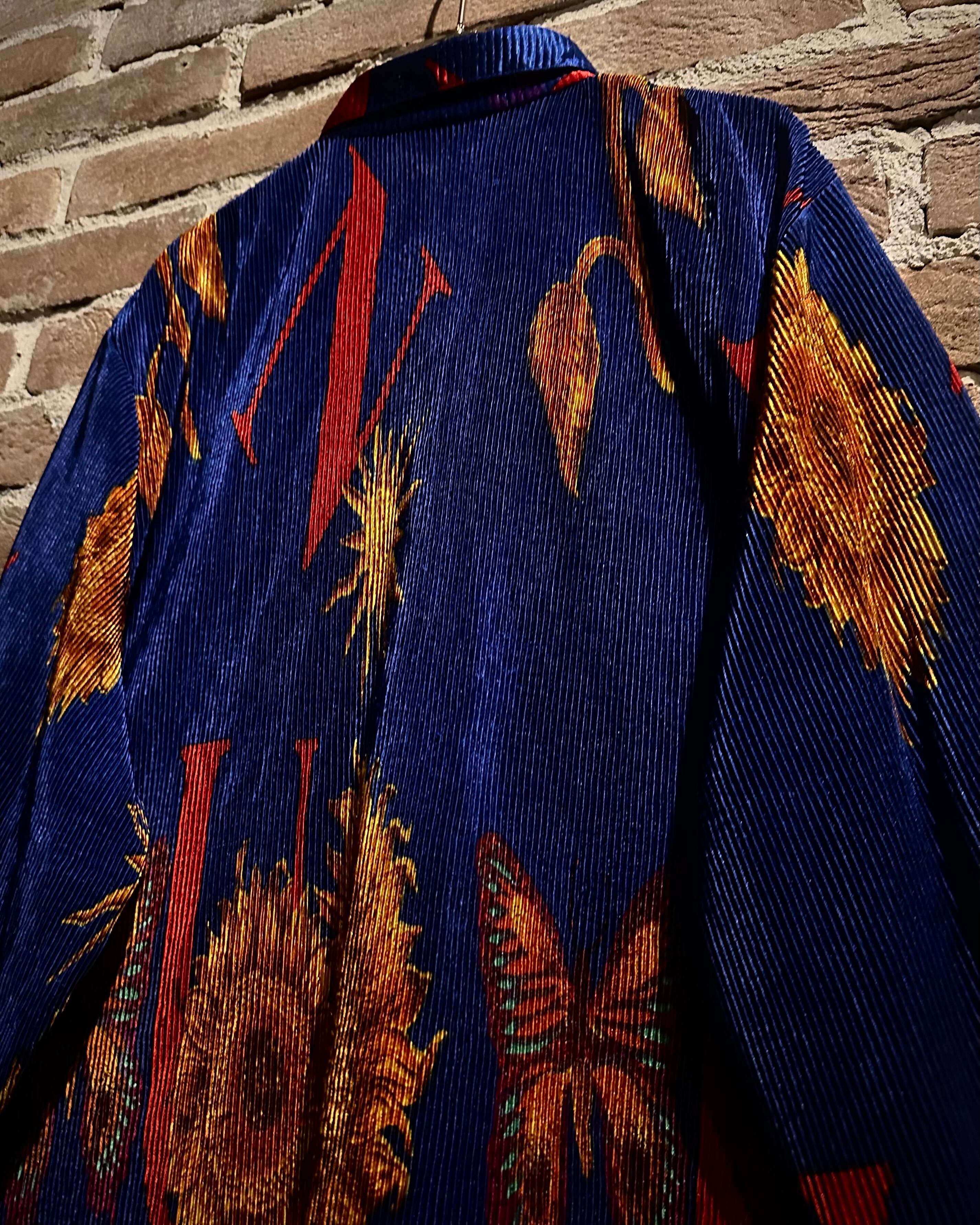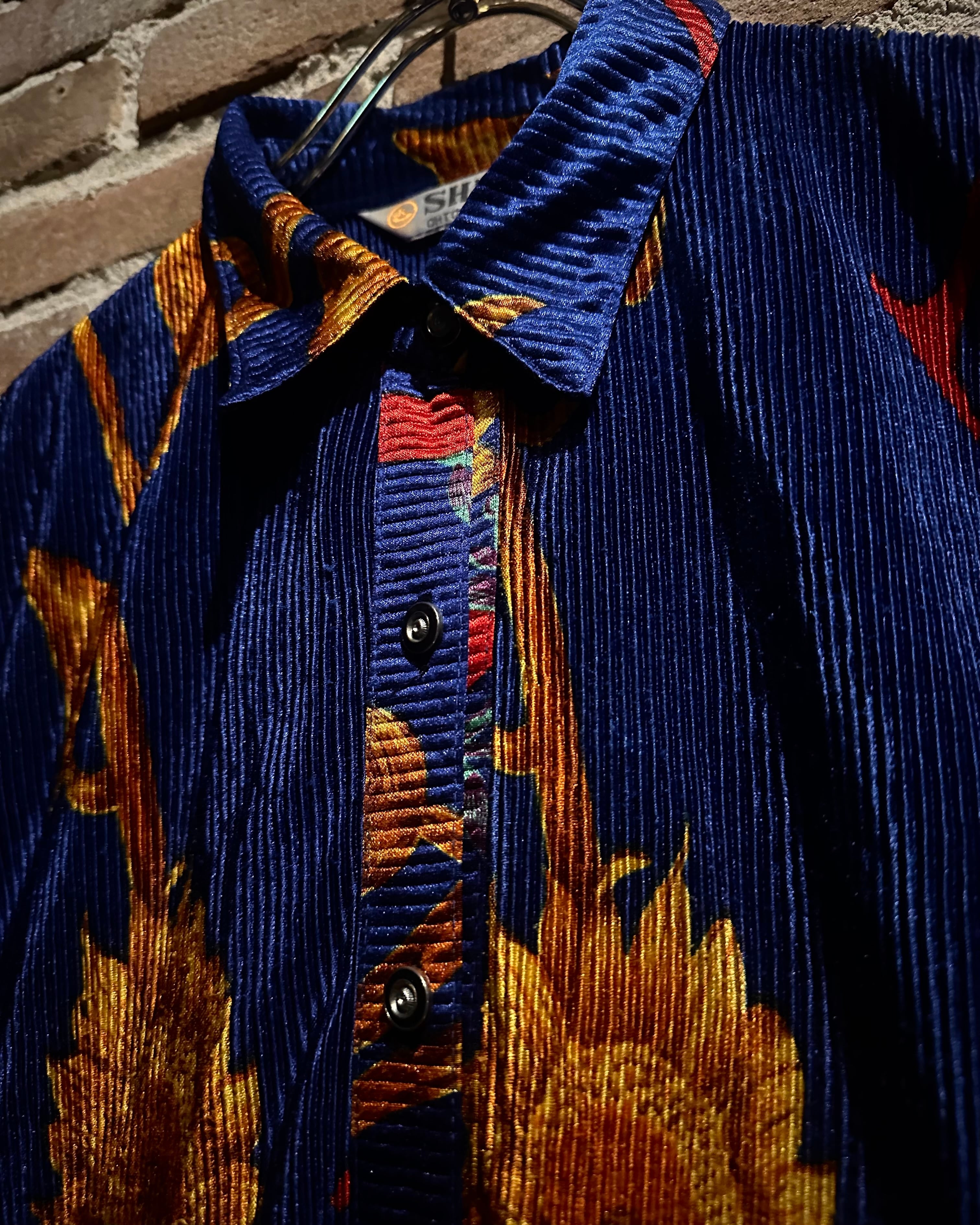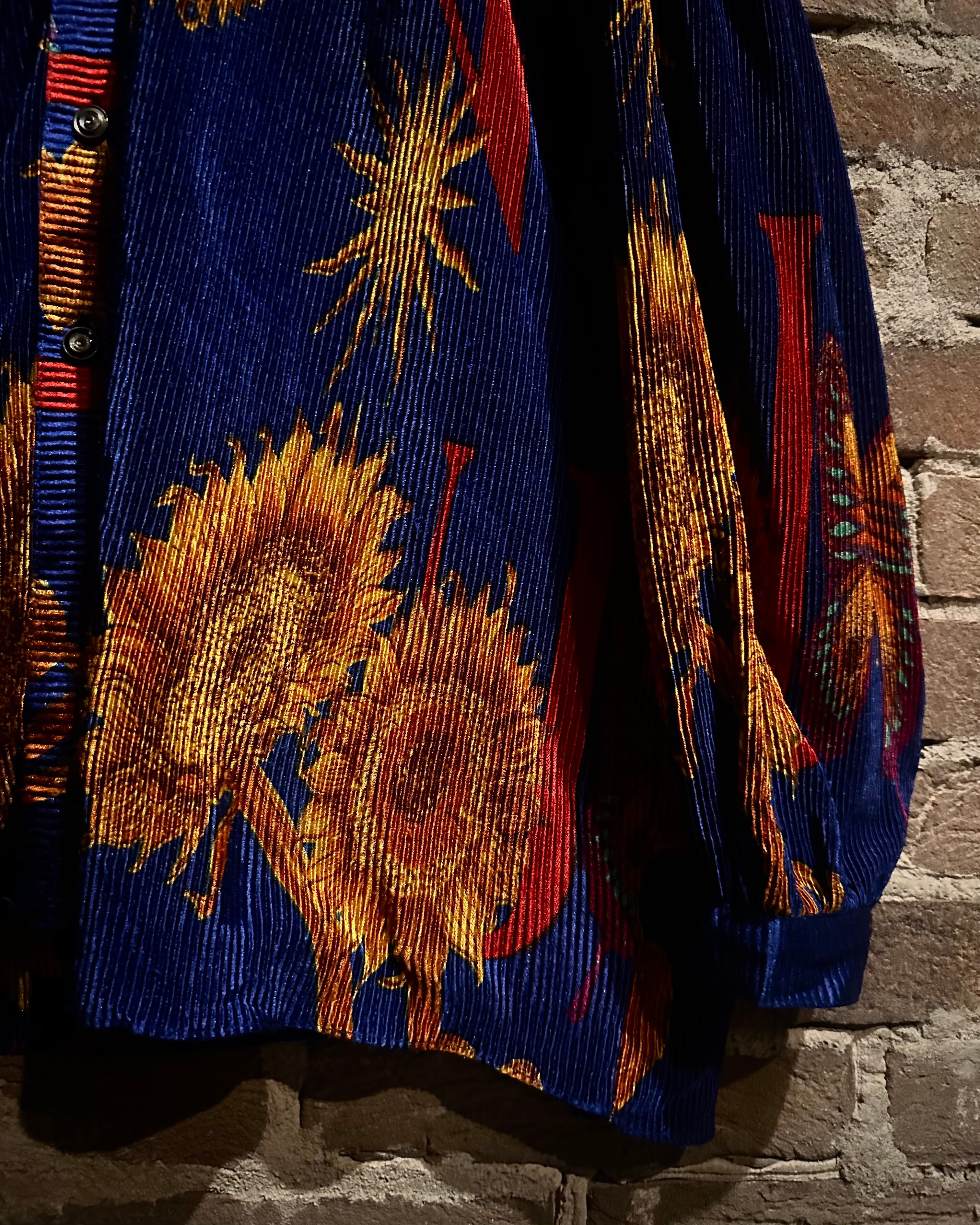 鮮やかな青のボディにひまわりを載せ、プリーツ加工を施した長袖シャツ。