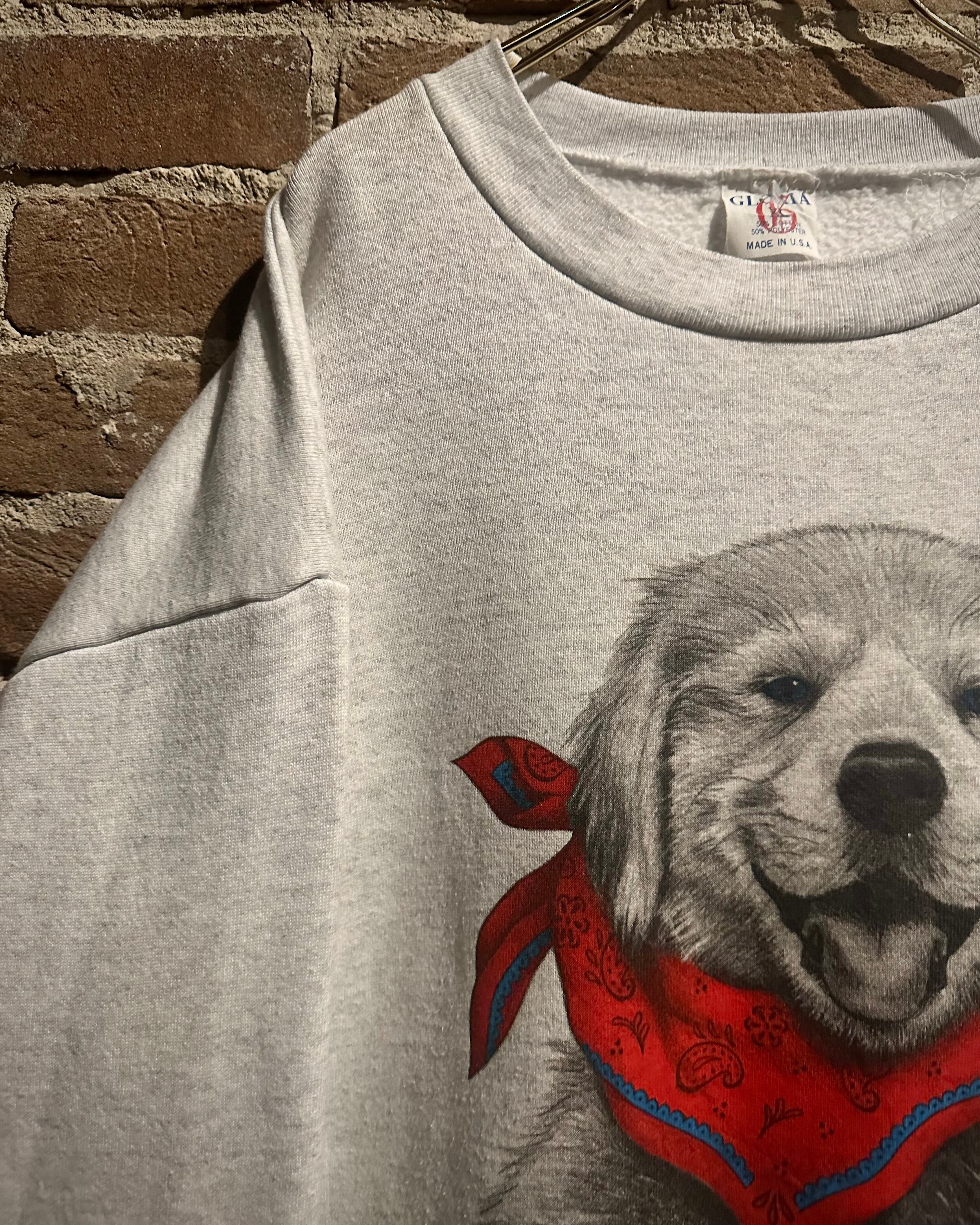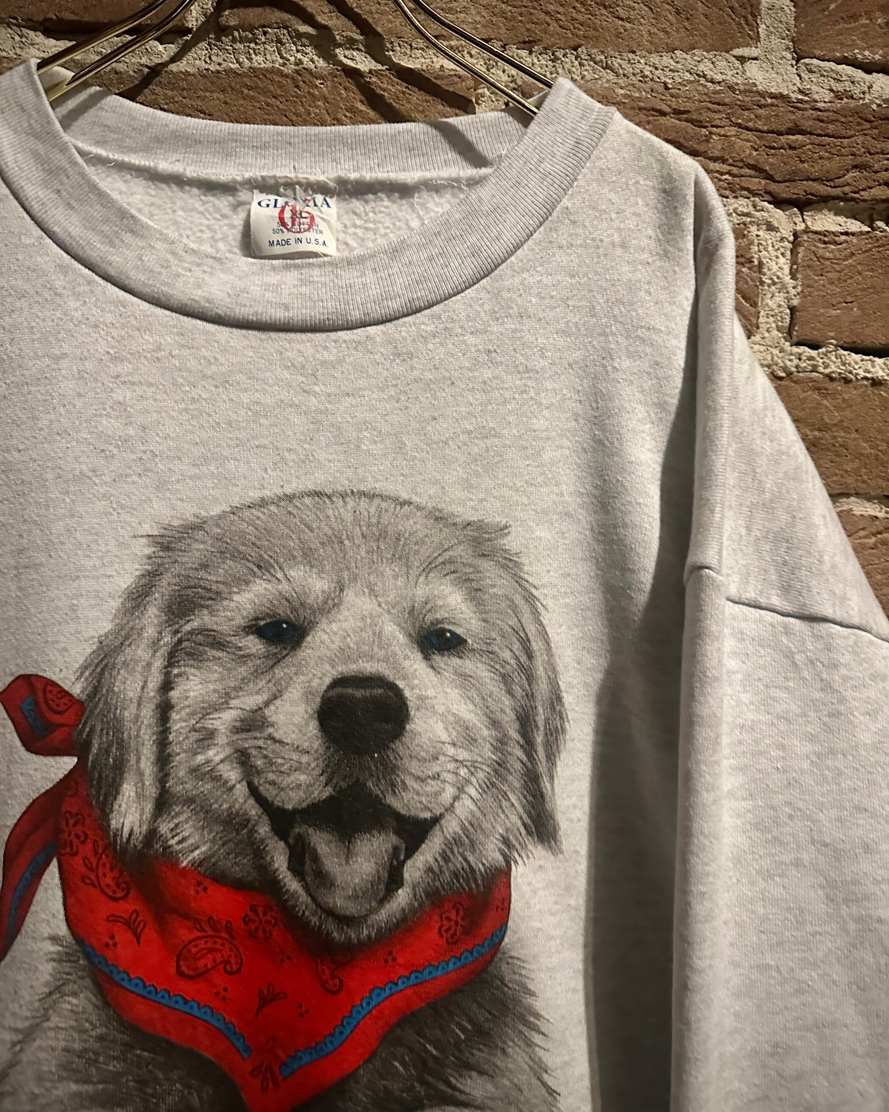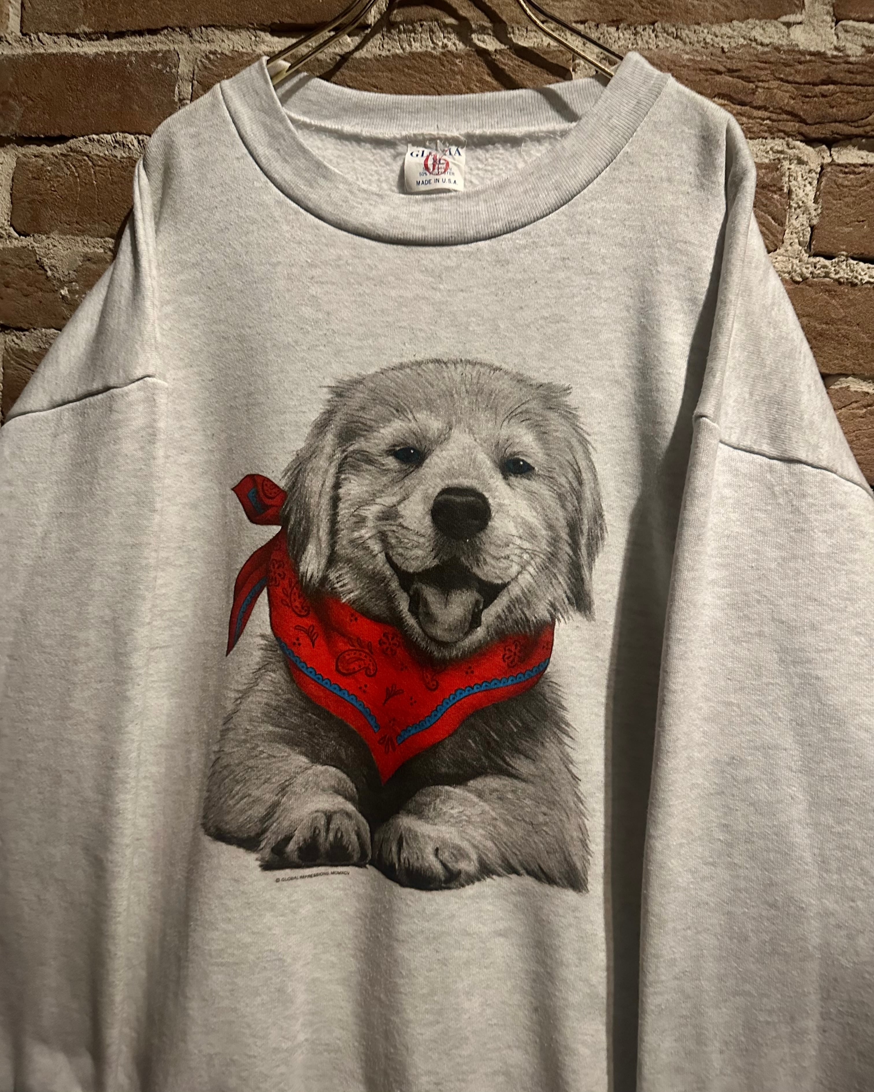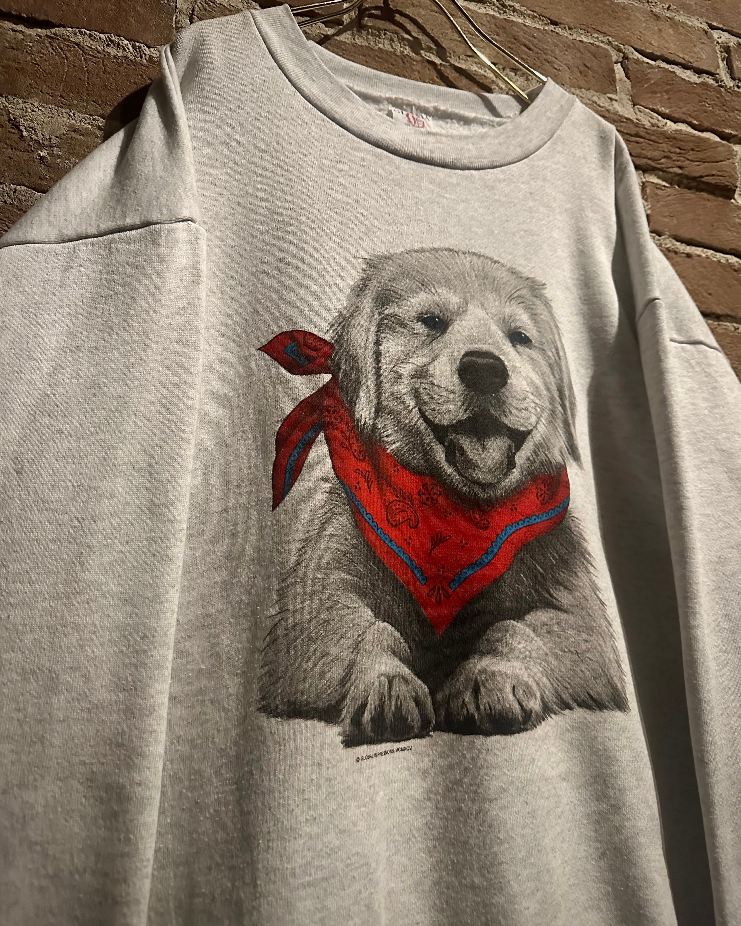 グレーのボディをベースとし、フロント中央にはバンダナを首に巻いた愛らしい子犬をプリントで載せたスウェットシャツ。
