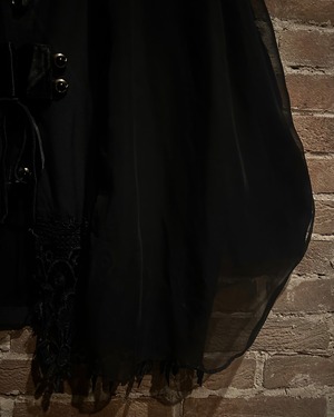 ネックラインには光沢を放つ生地をドッキング、フロントに施されたベルトがデザインのアクセントに。オールブラックの仕上がりながら、奥行きのある深みのある仕上がりとなっています。