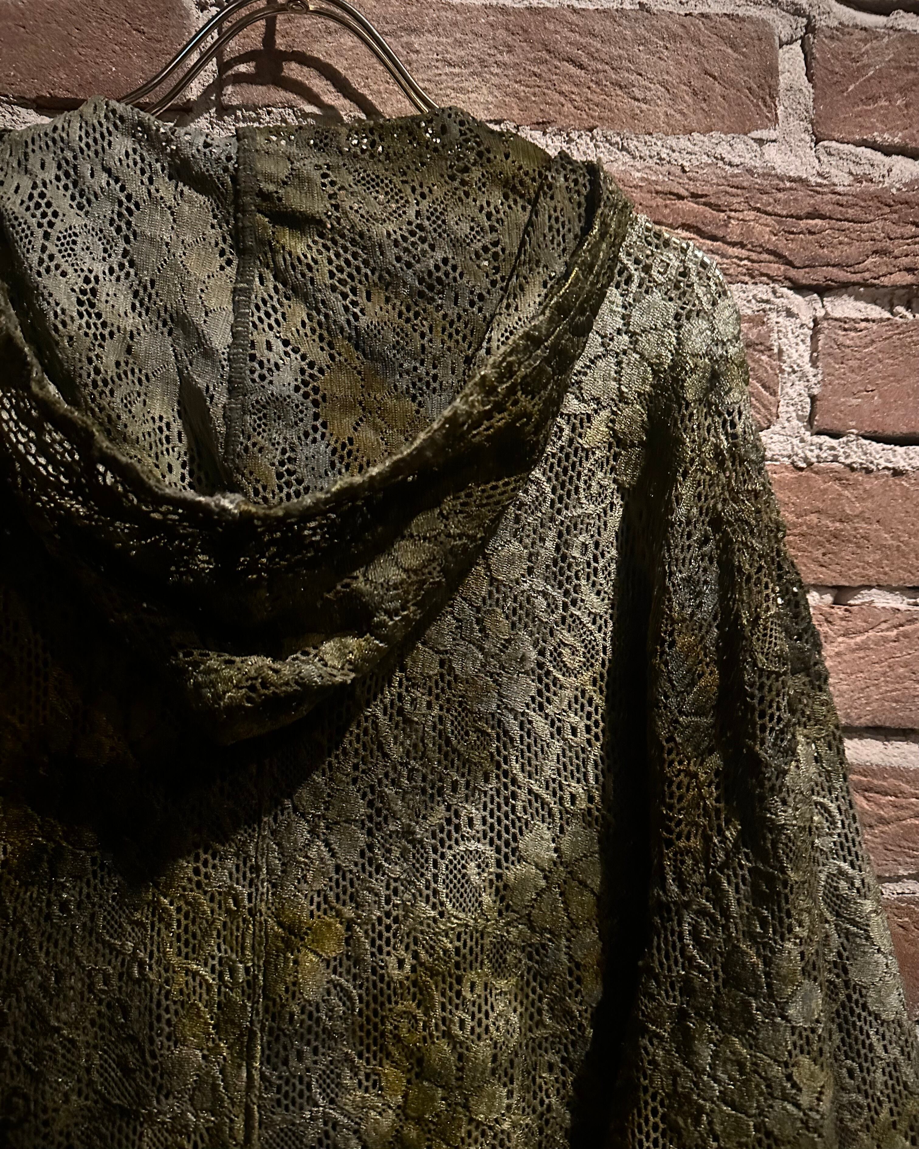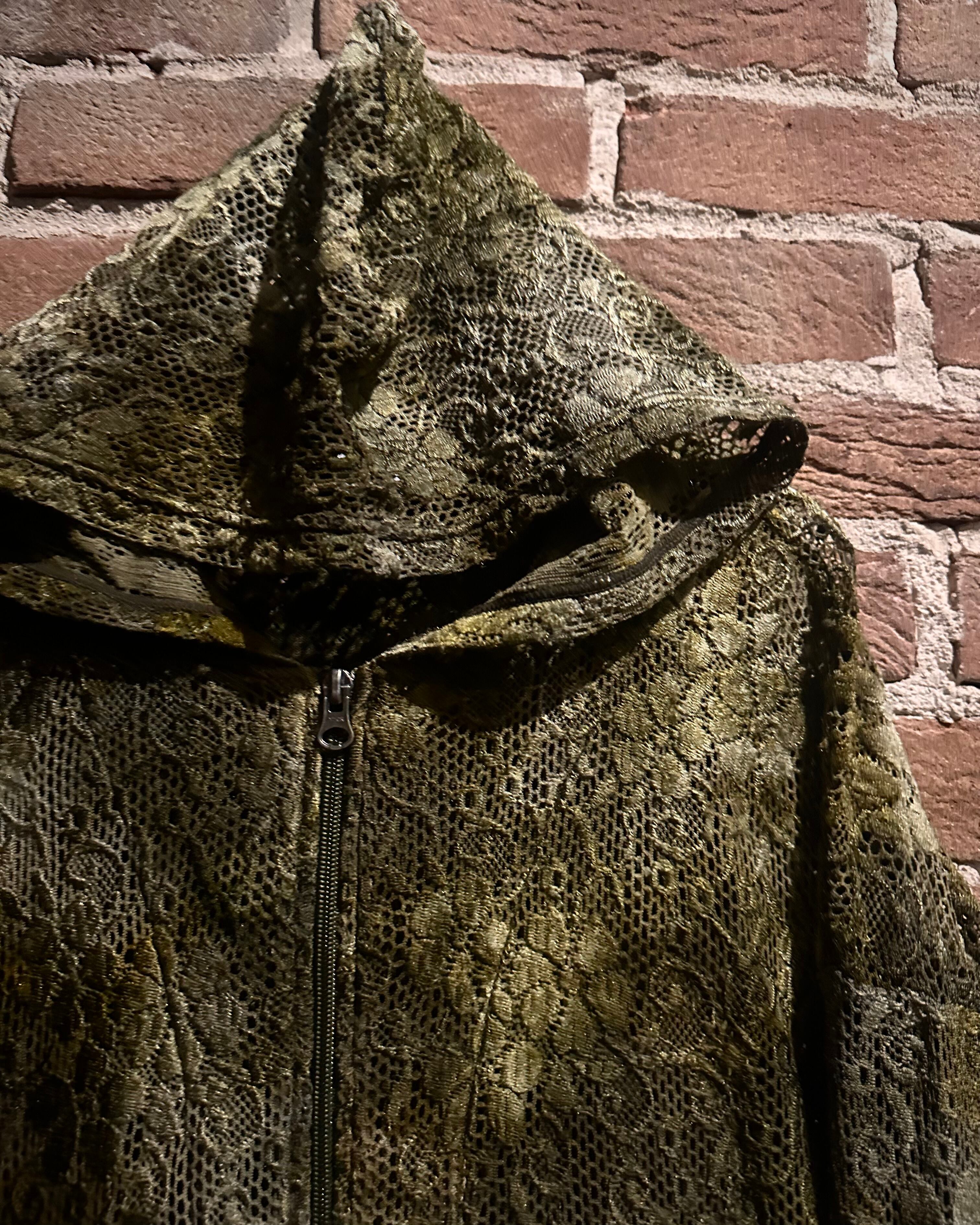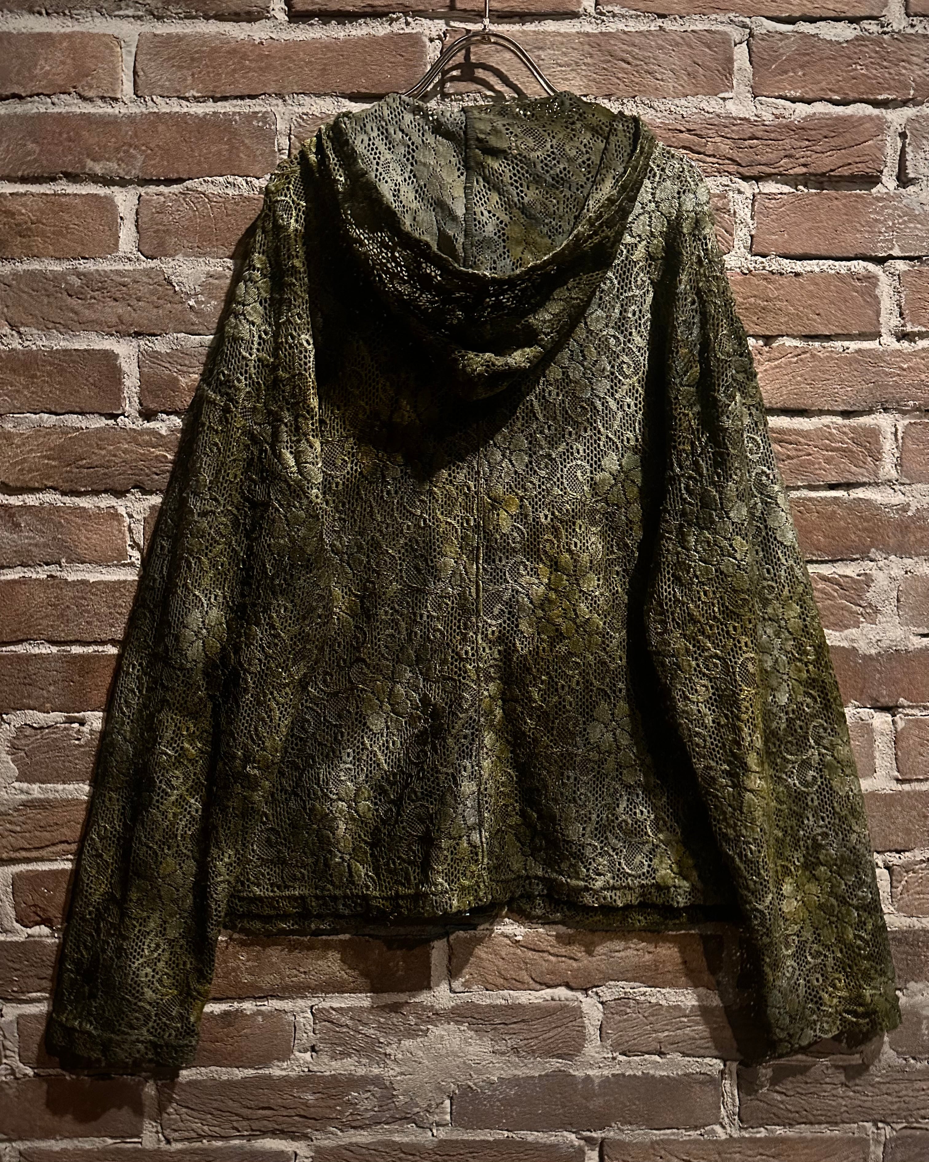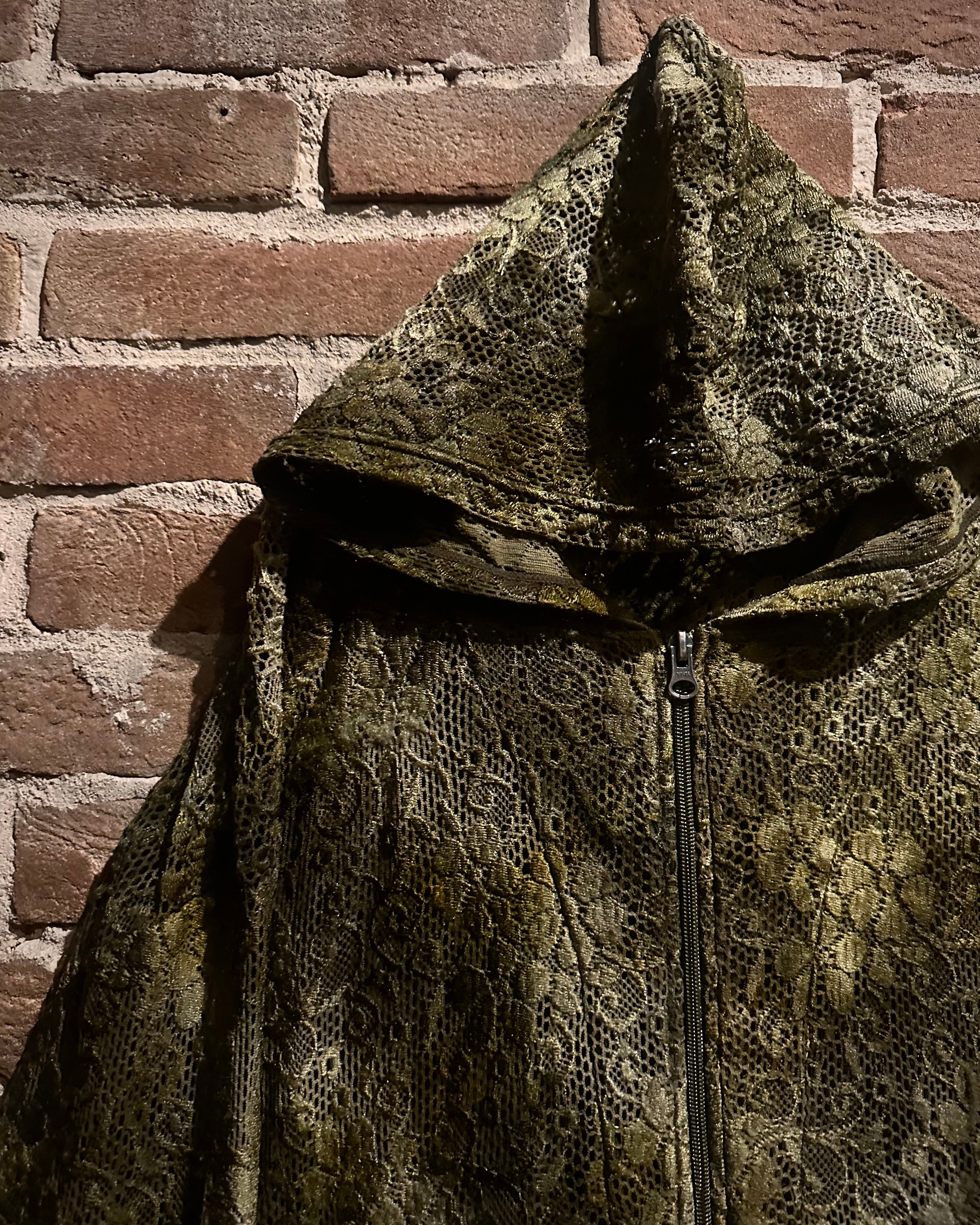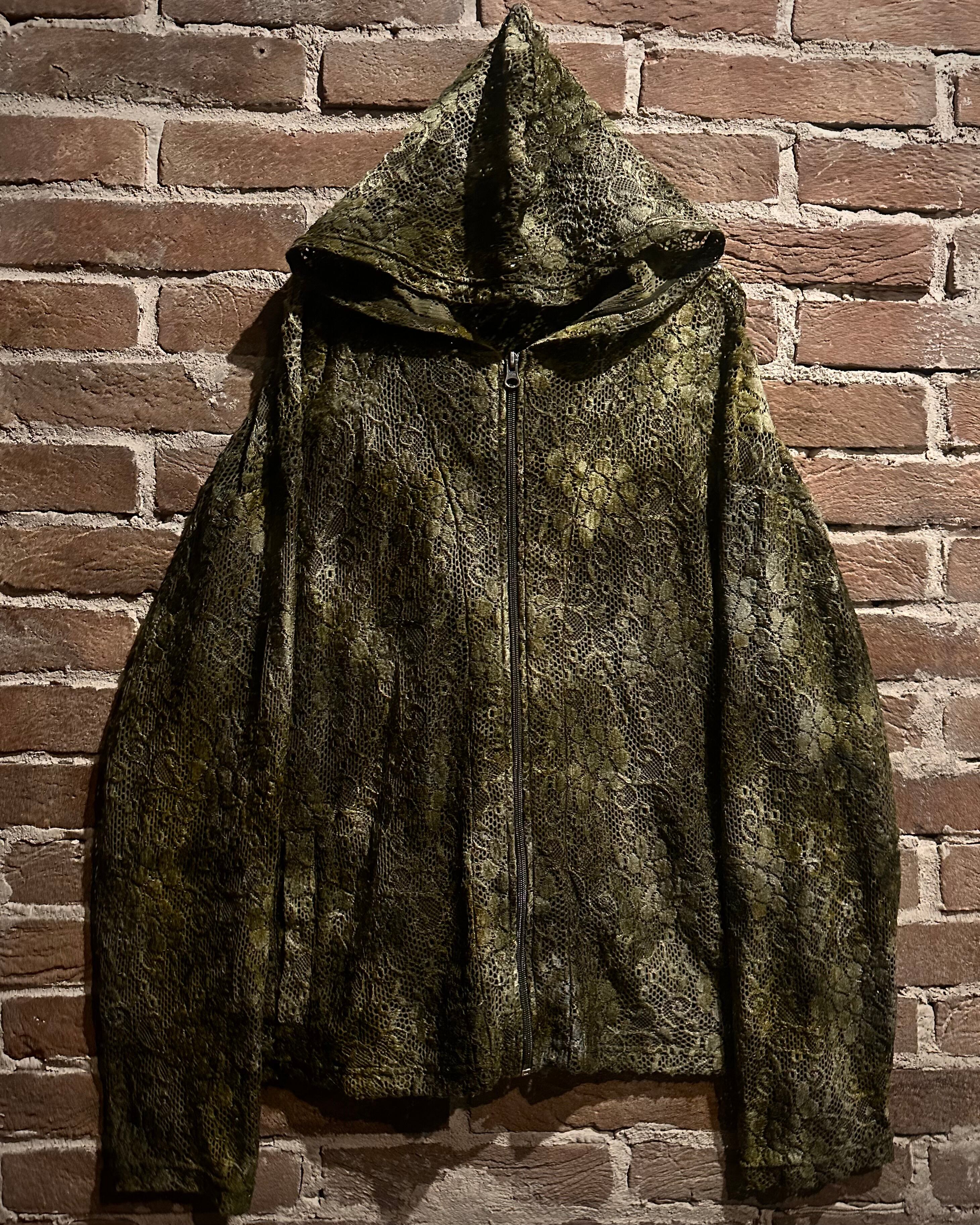 目の細やかなレース地のボディに、グラデーションがかった花柄を載せた稀有なレースのジップアップフーディ。