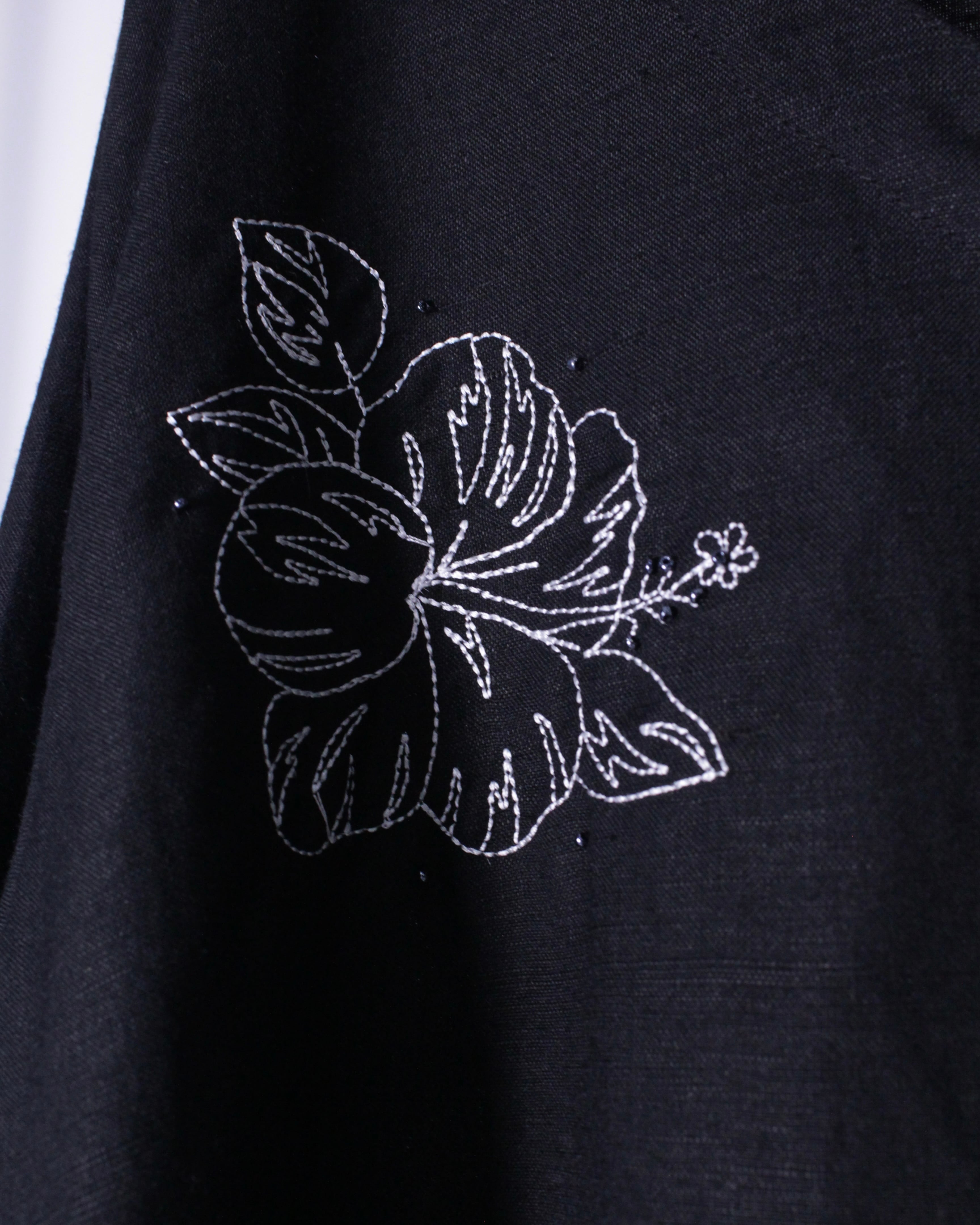 上質なリネン×レーヨン稀有な素材に加え、ブラックカラーと稀少性の高いボディに、ハイビスカスの花を刺繍で刻んだ半袖シャツジャケット。