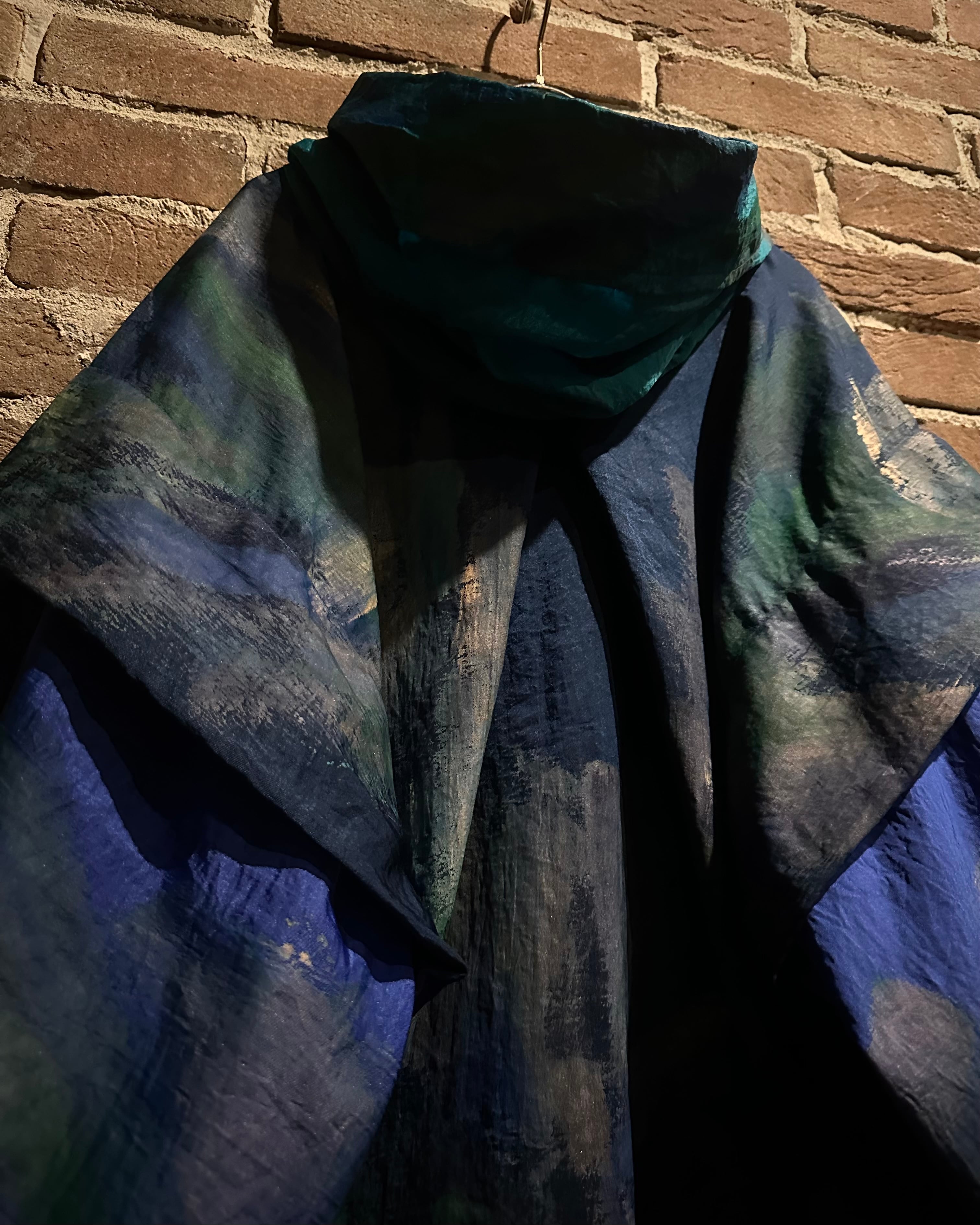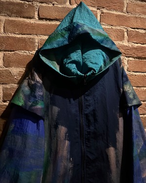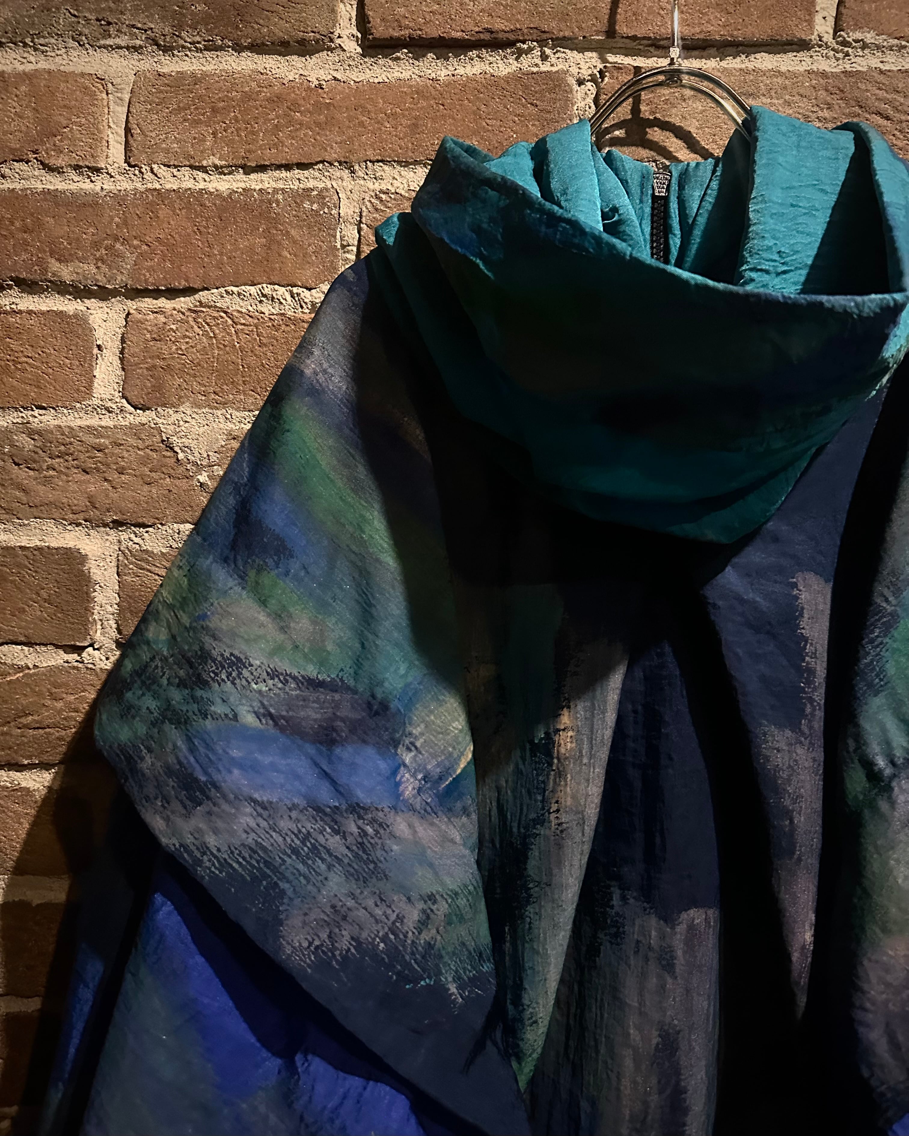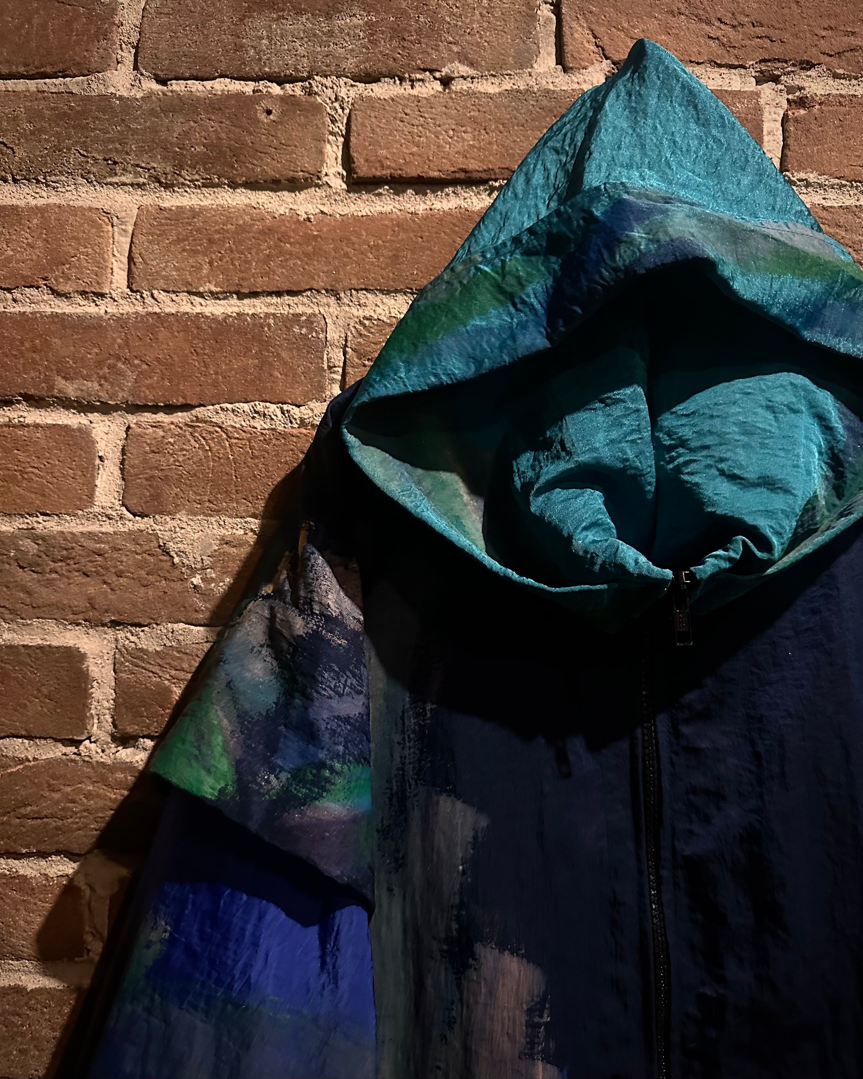 サラッとした薄手の素材感のボディに、筆で描いたようなグラデーション掛かったペイントデザインを載せたジップアップフーディージャケット。
