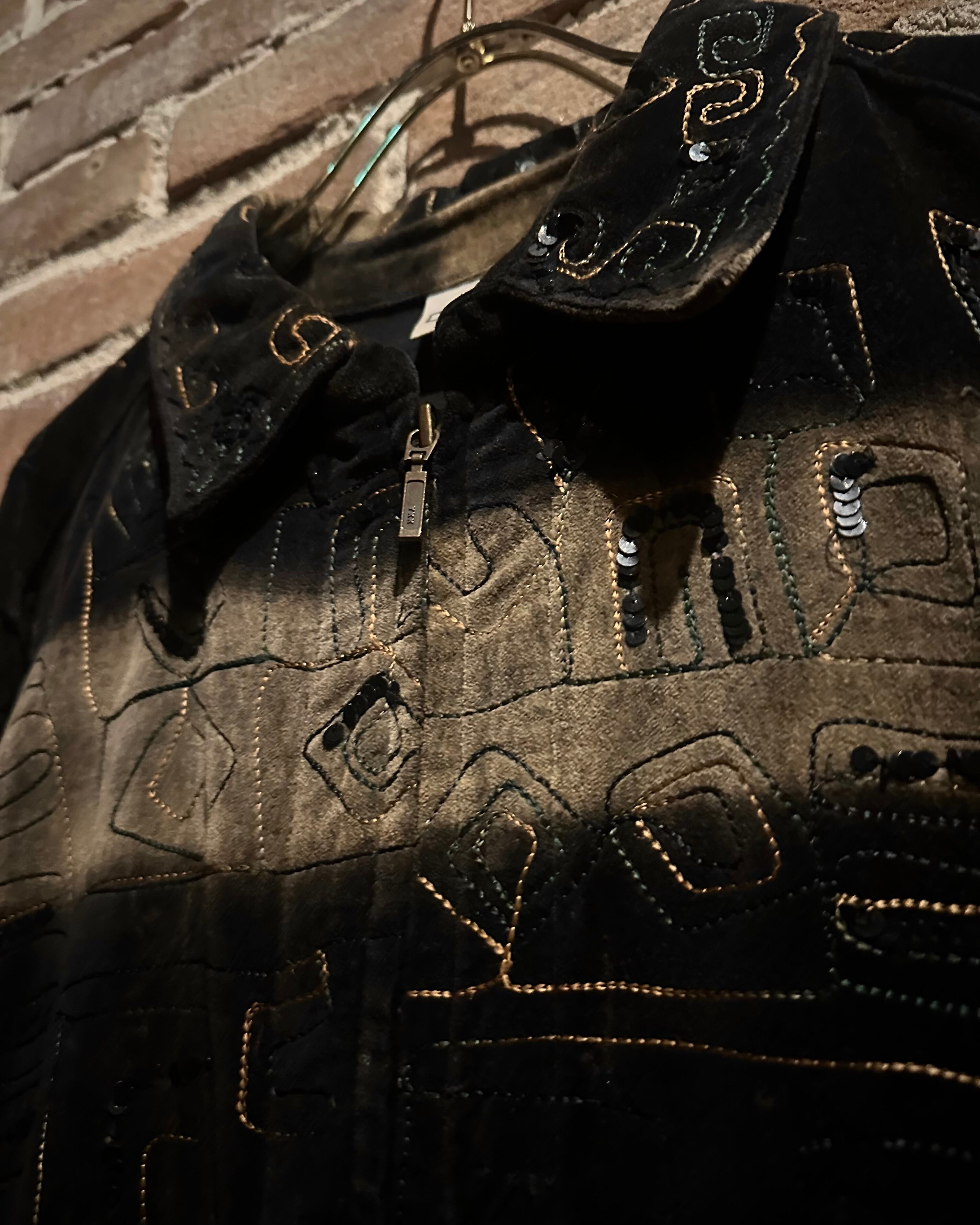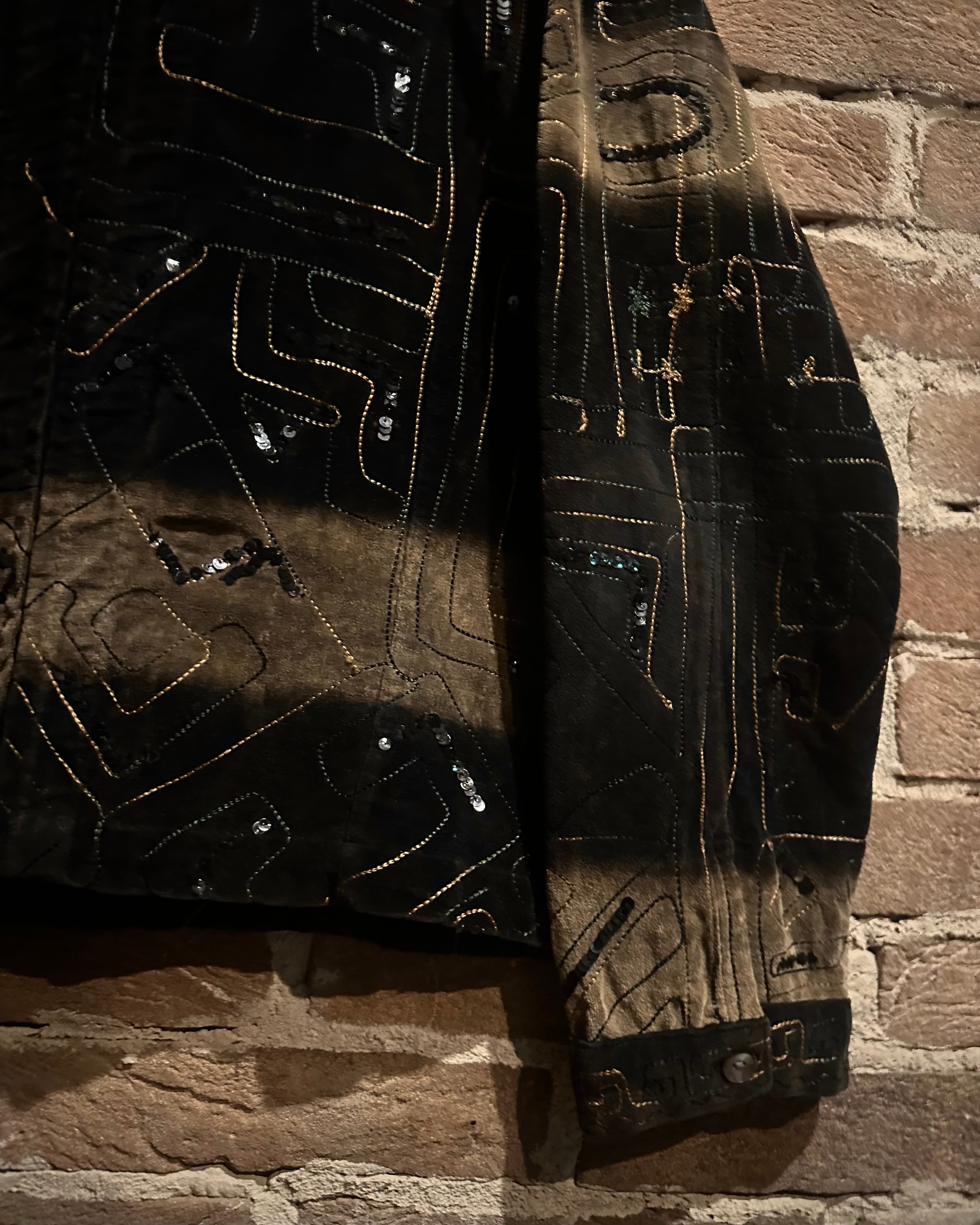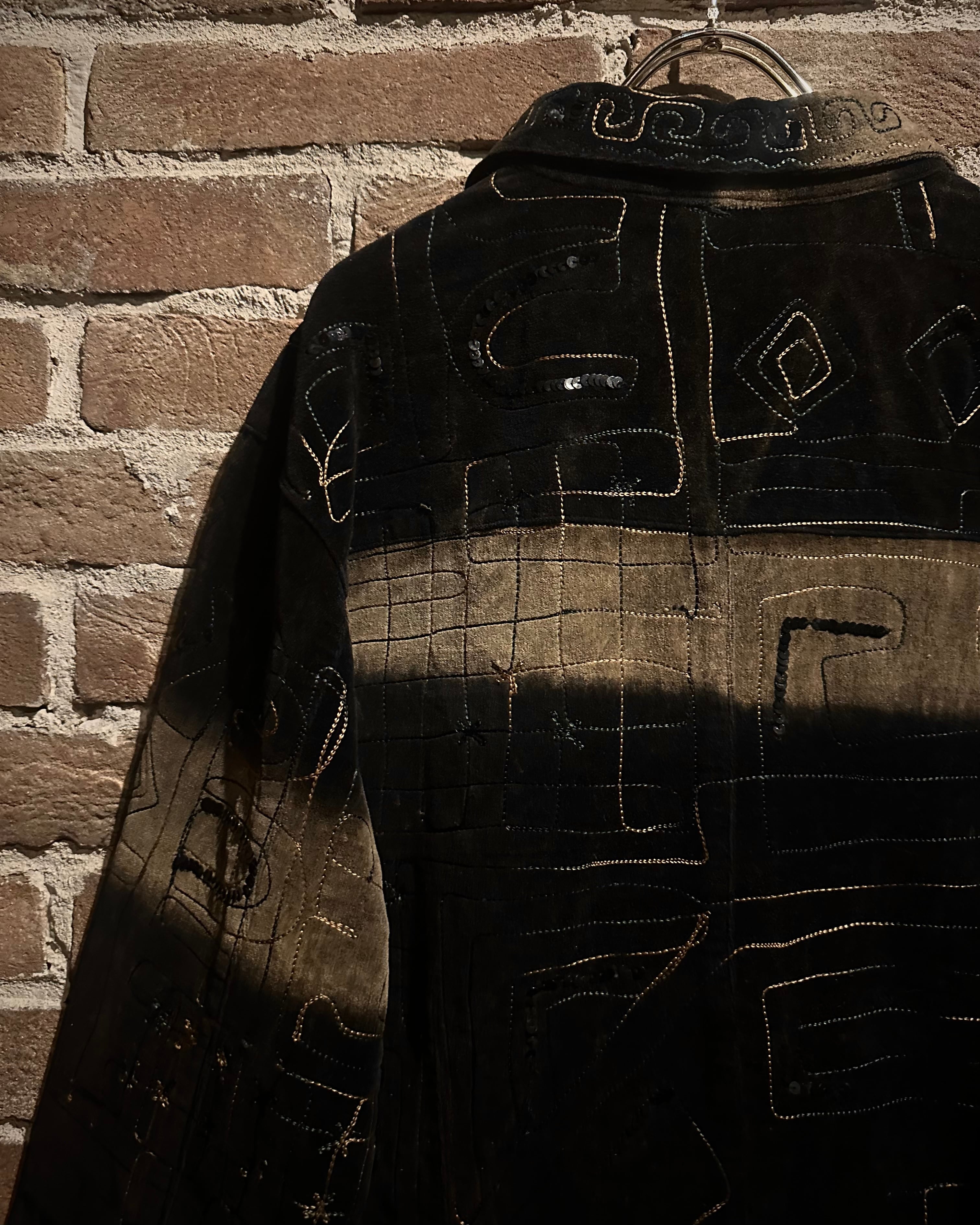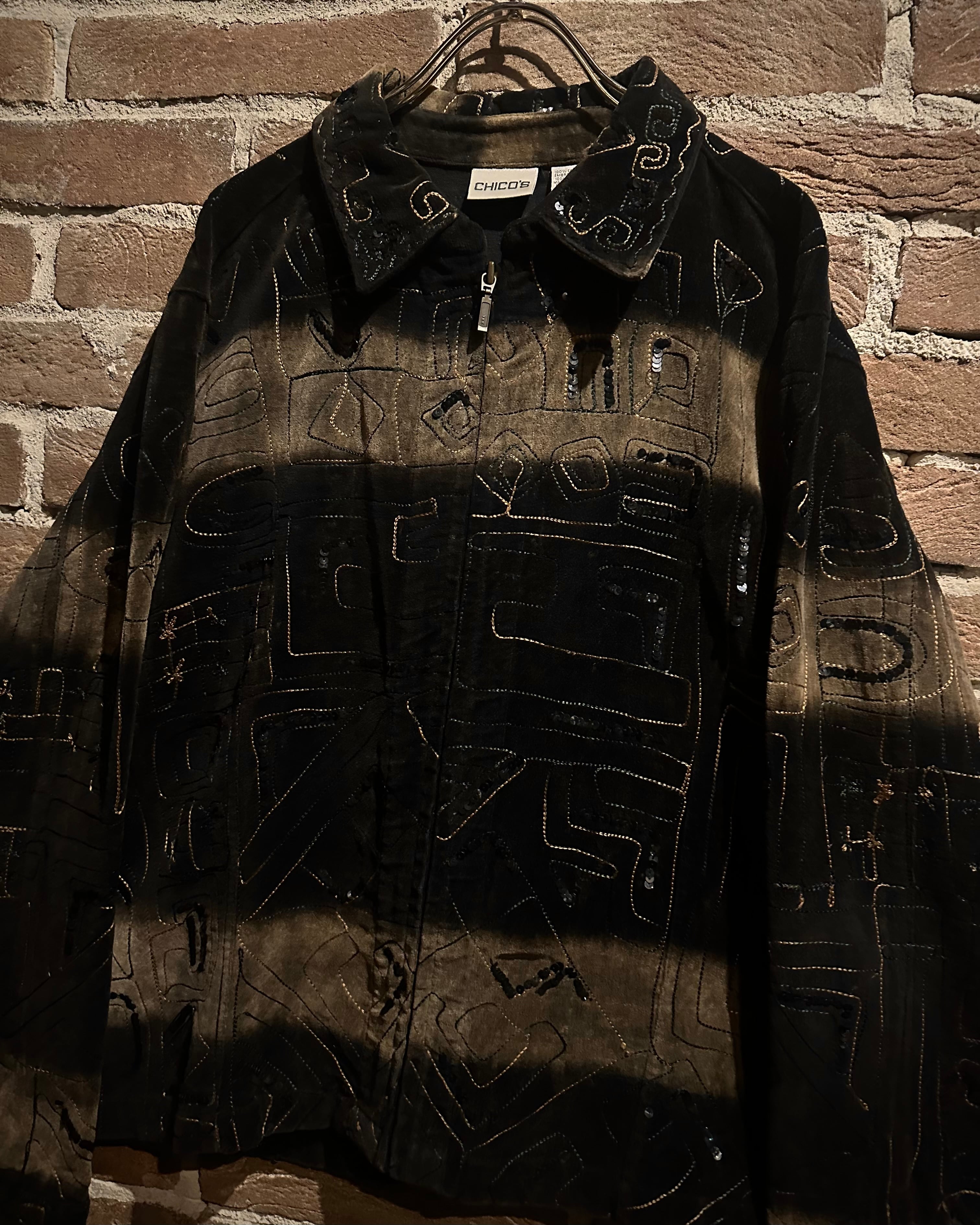 黒×ベージュのグラデーションがかったボーダーを載せたベロアのボディをベースに、全体的にランダムなステッチ、そしてスパンコールで装飾を施したジップアップジャケット。
