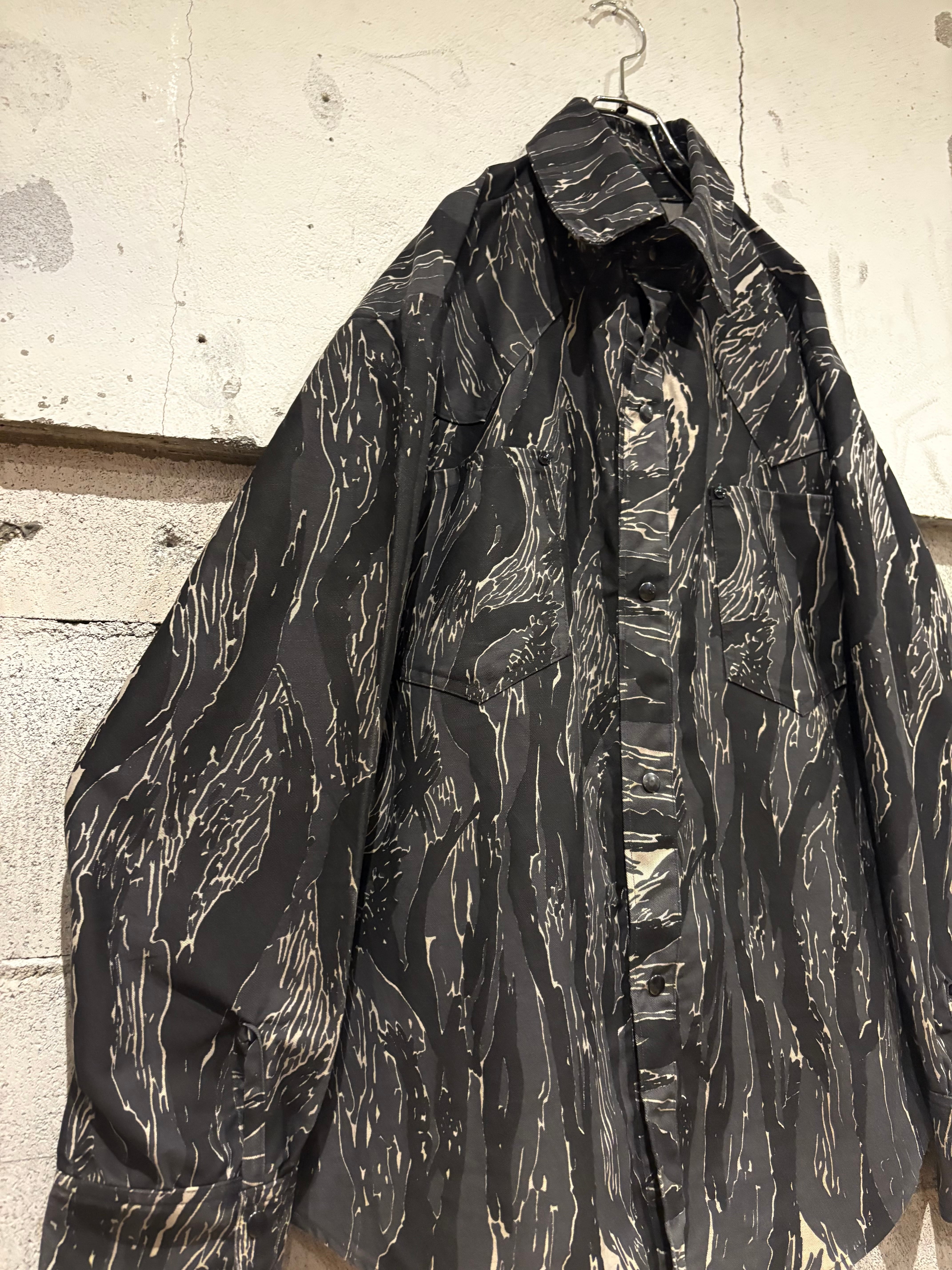 ハリ、コシのあるボディに、アメリカ軍で使用されていた、うねった野性的なパターンが特徴的なタイガーストライプ柄を載せたウエスタンシャツ。