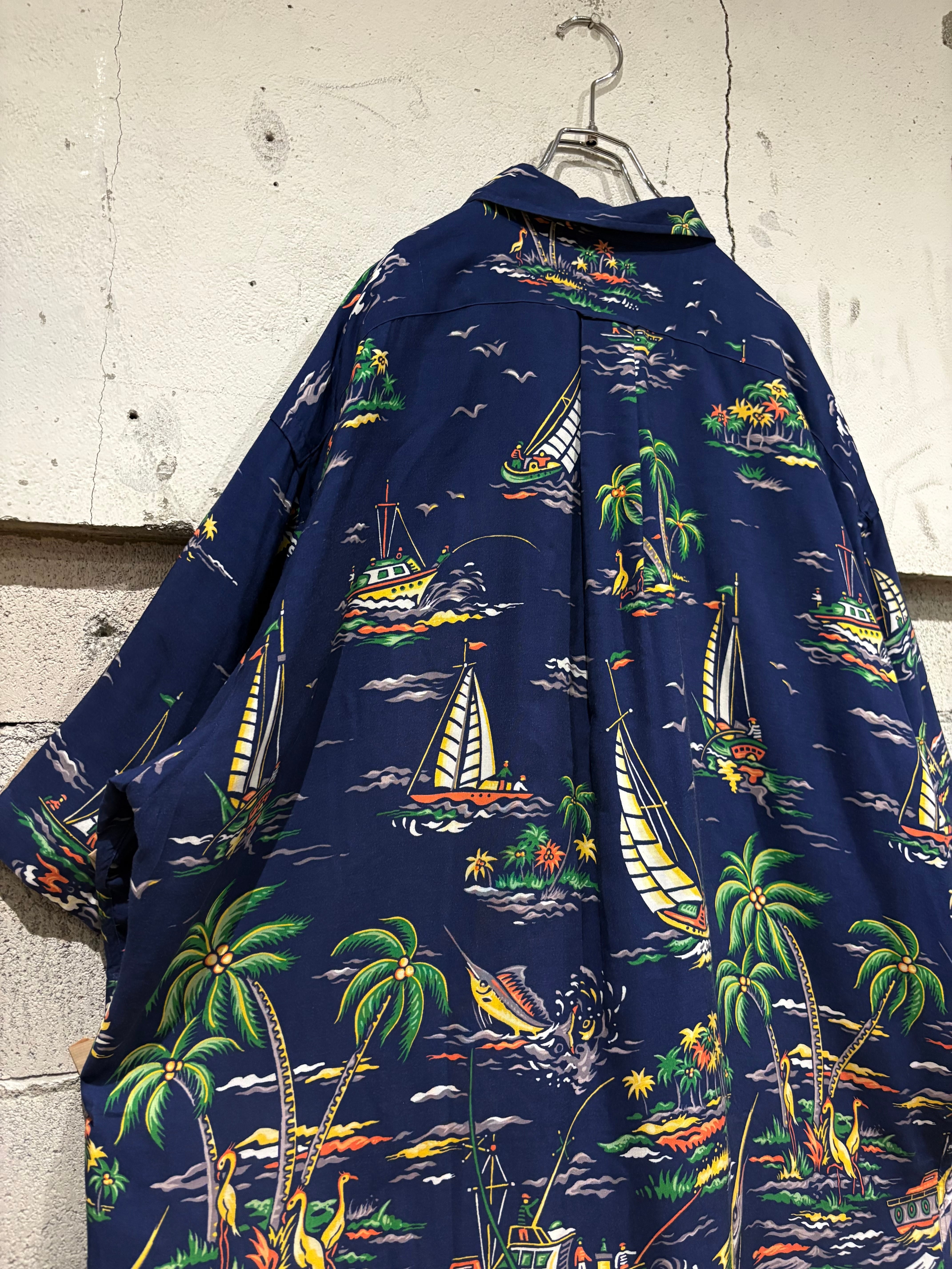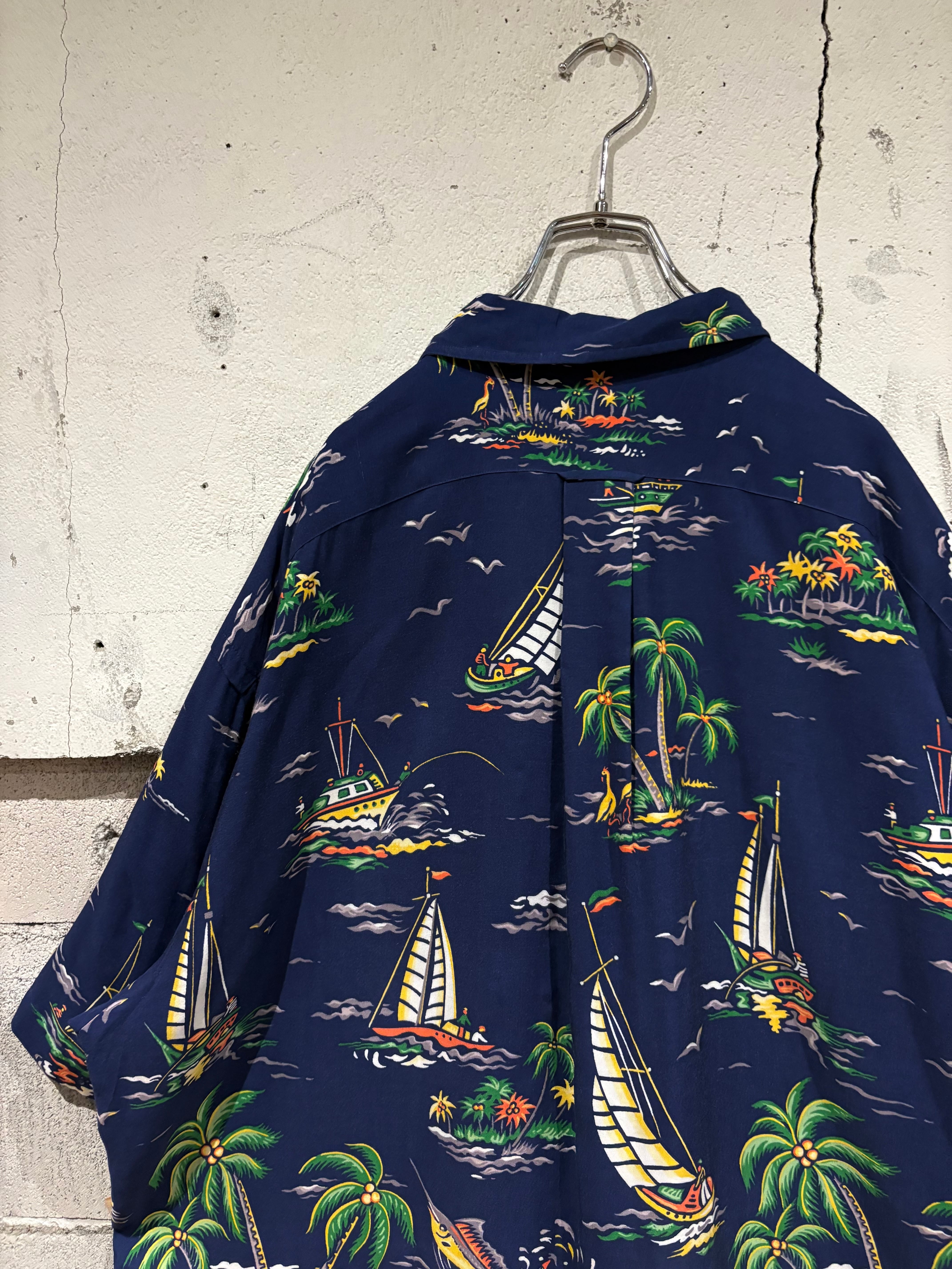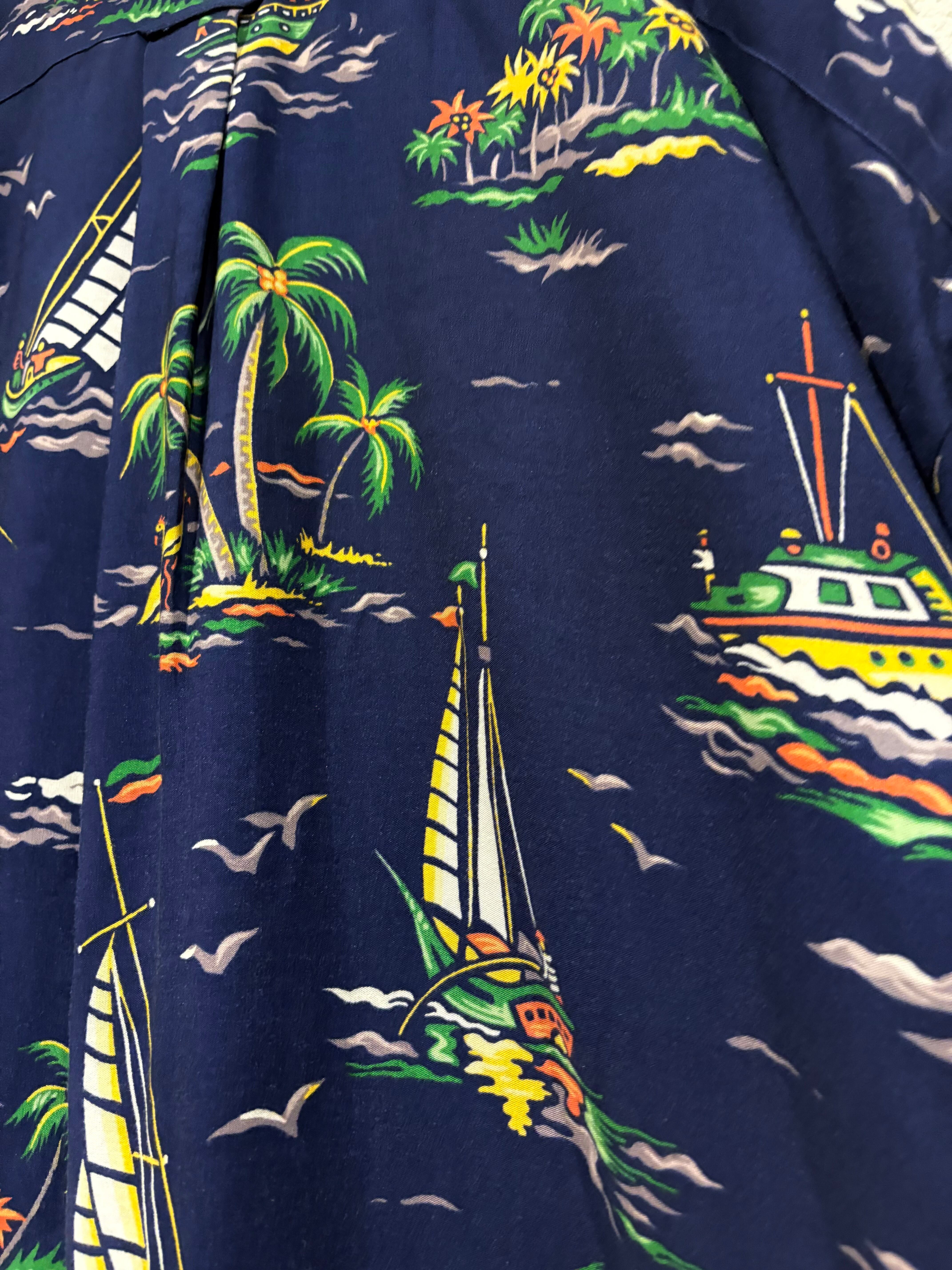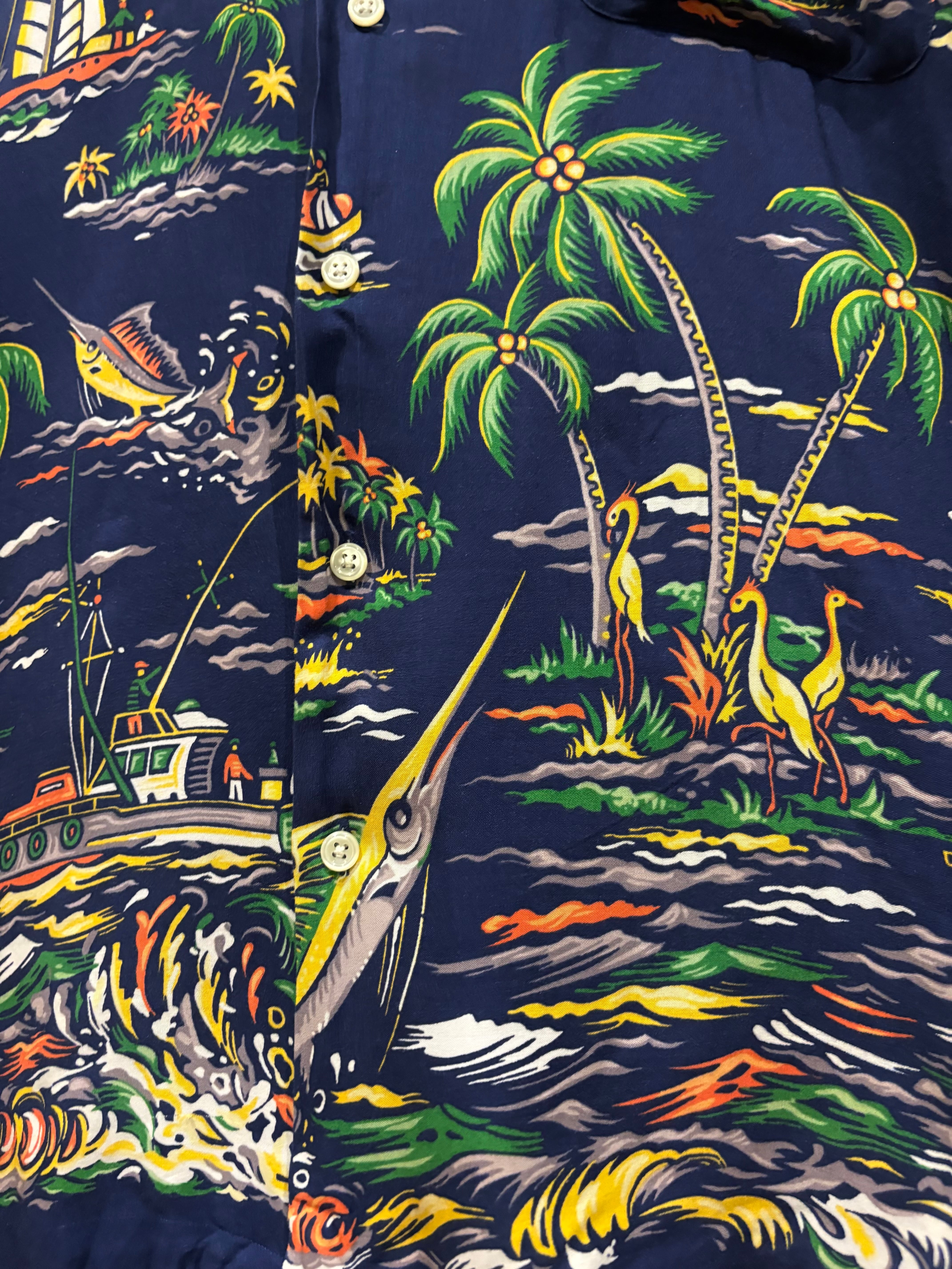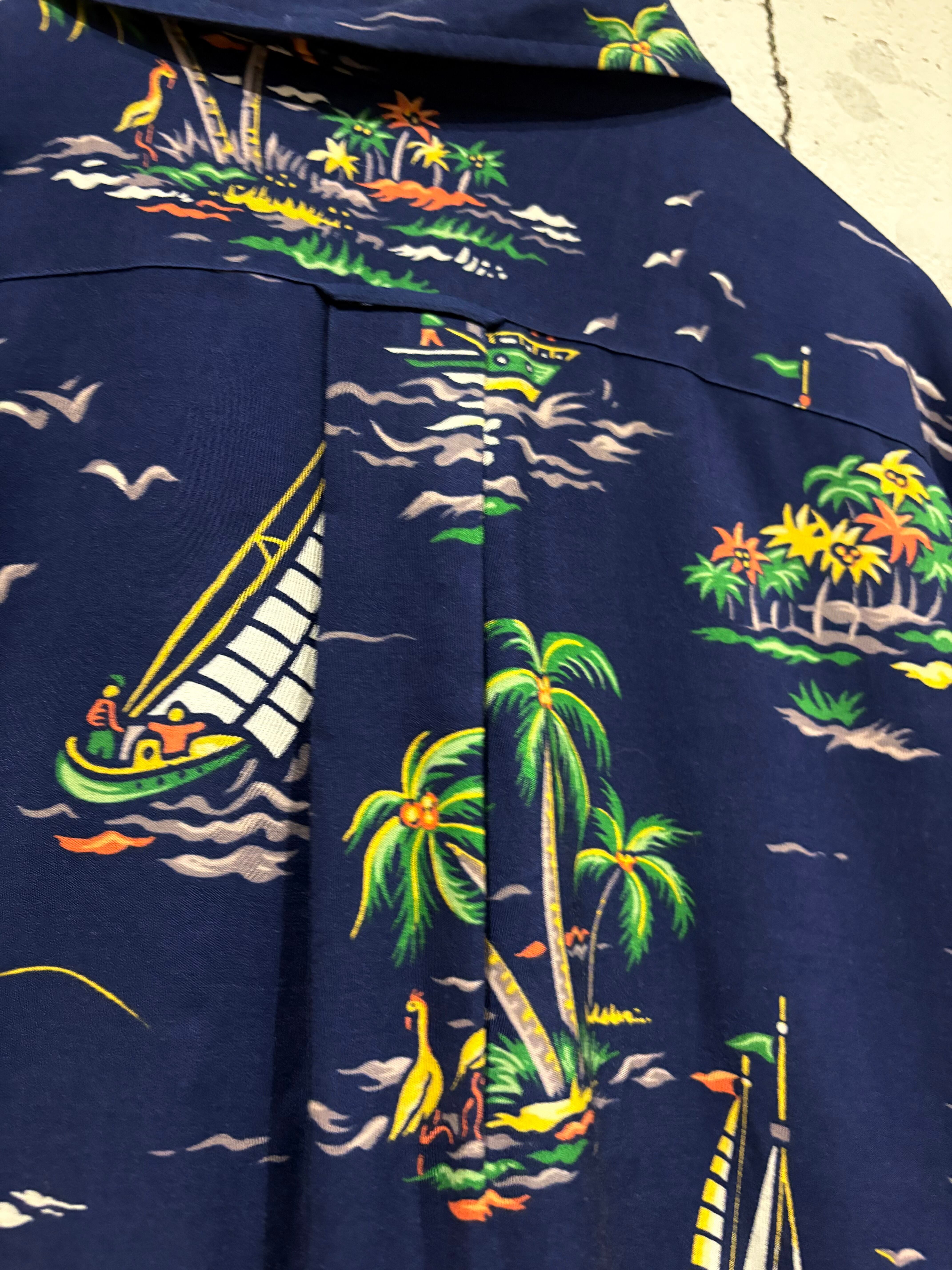 レーヨンを用いた深みのあるネイビーのボディをベースに、ヤシの木や鳥、船などマリンなデザインを、このアイテムらしく鮮やかなカラーリングで表現したアロハシャツの1着。