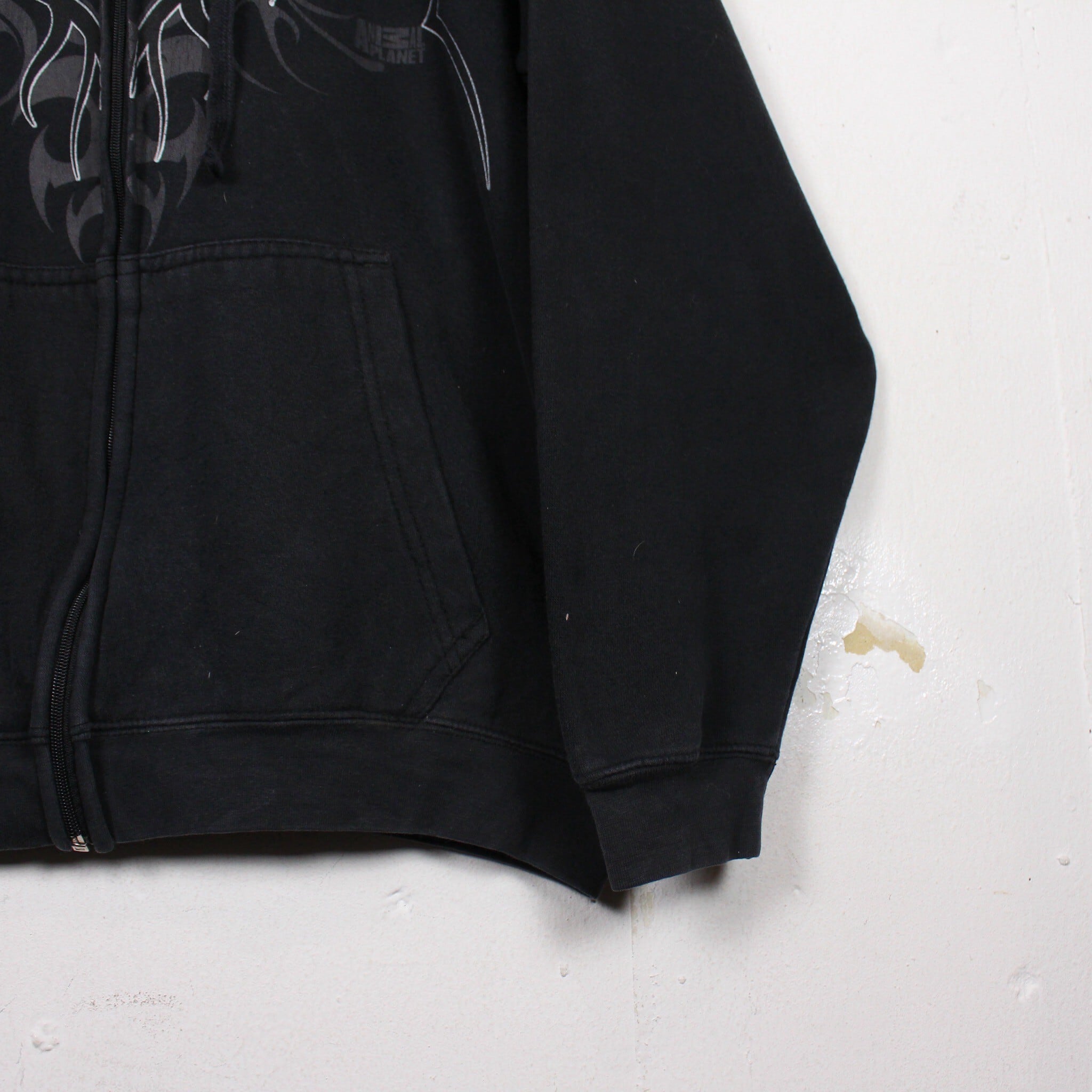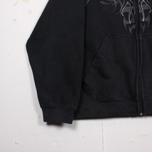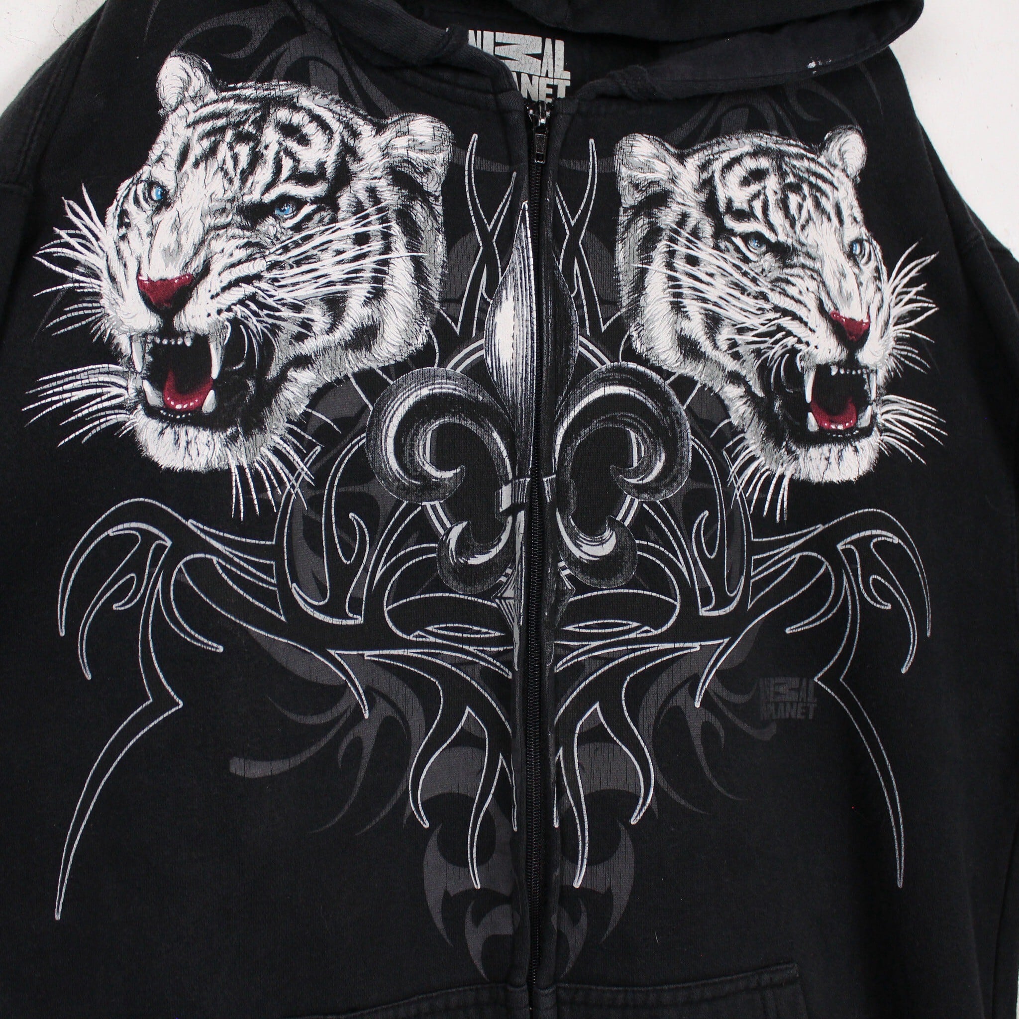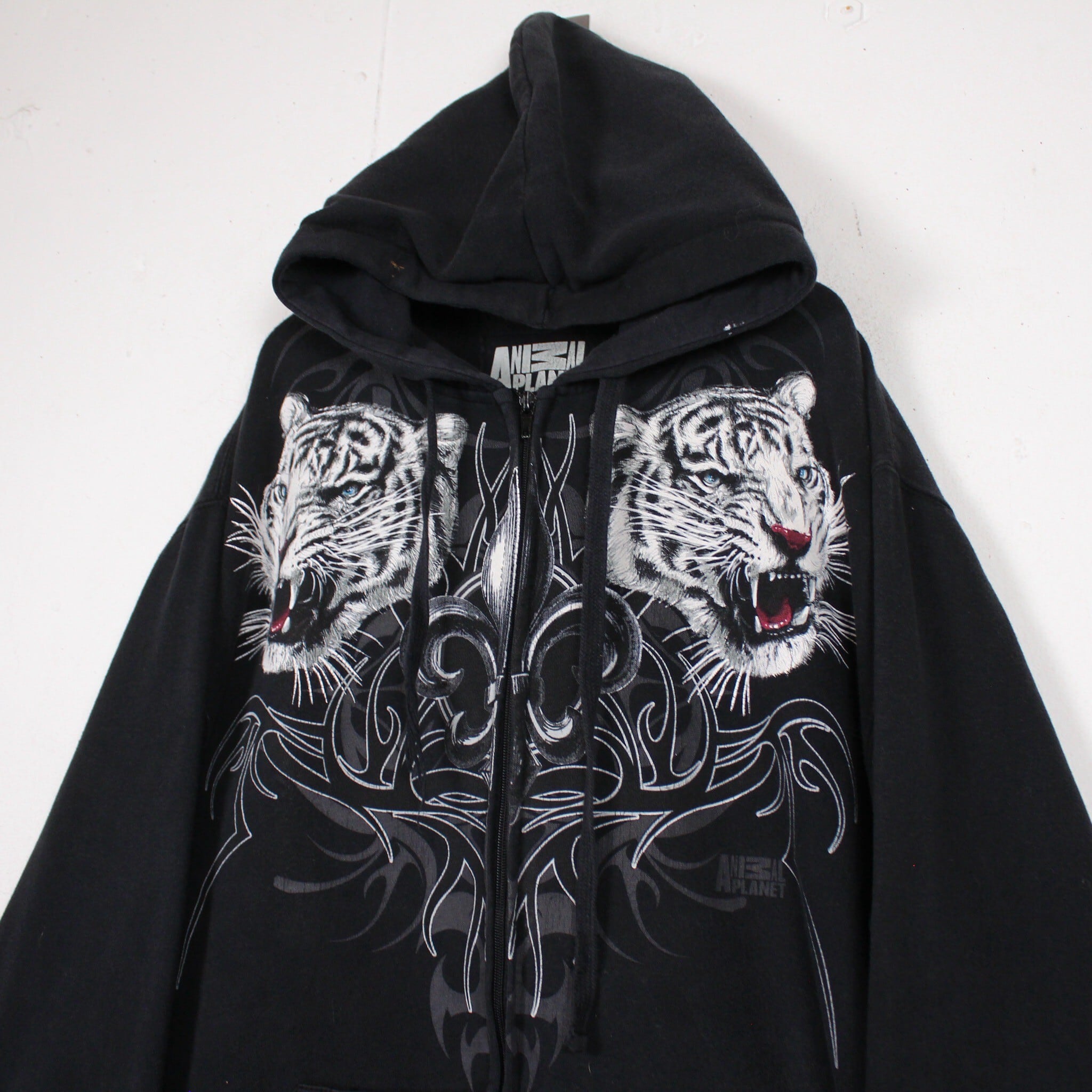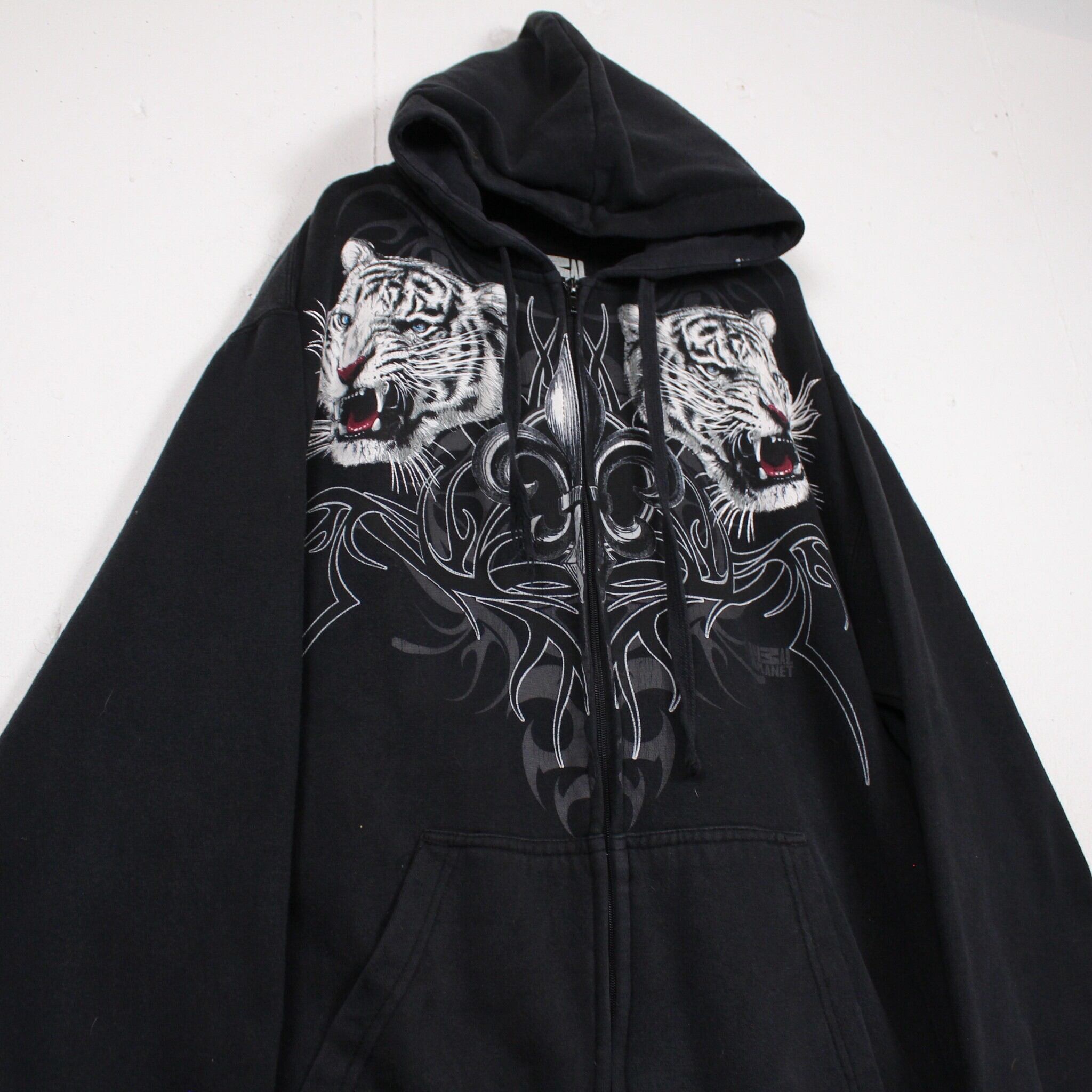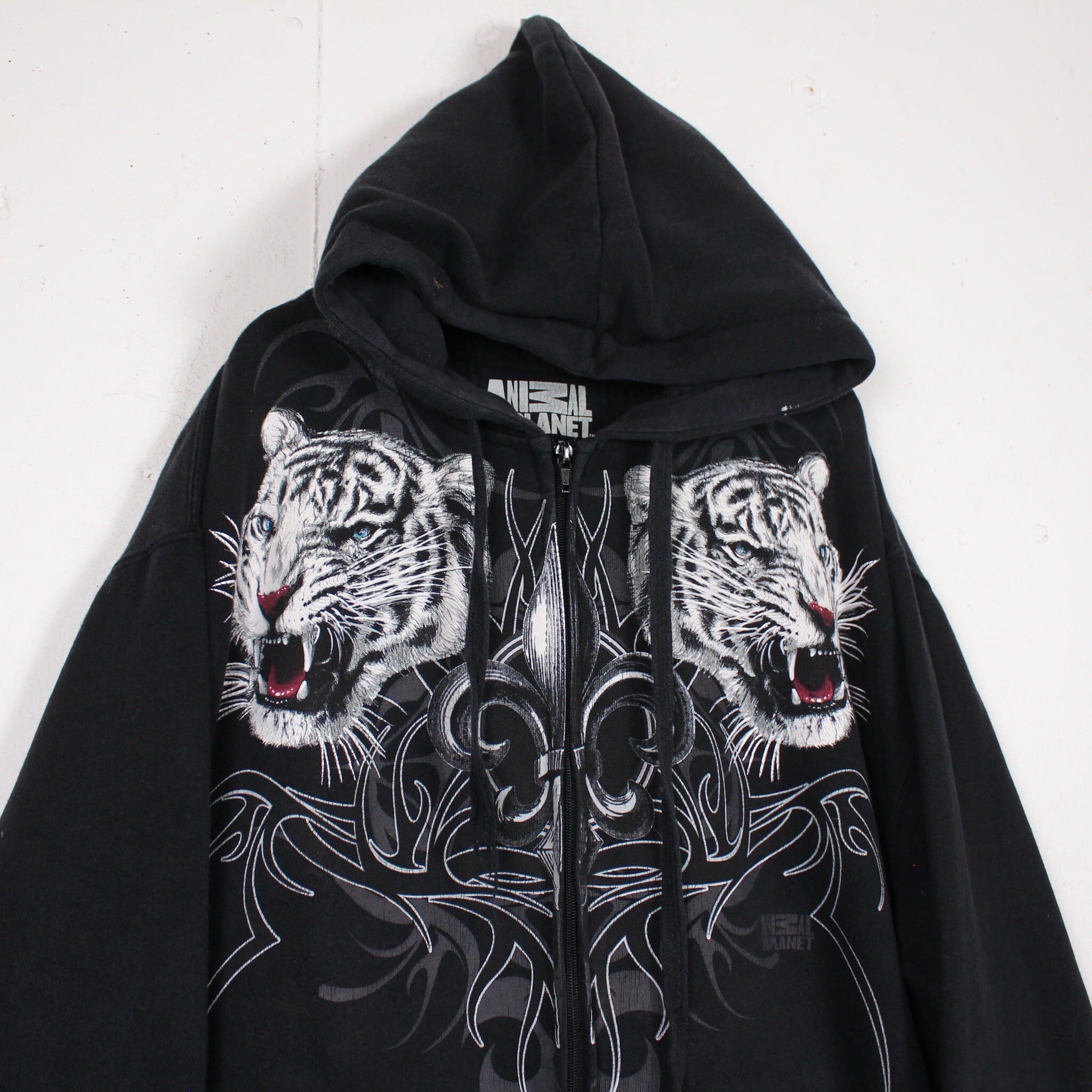 ブラックのボディをベースに、ホワイトタイガーとトライバル柄を載せたジップアップフーディ。