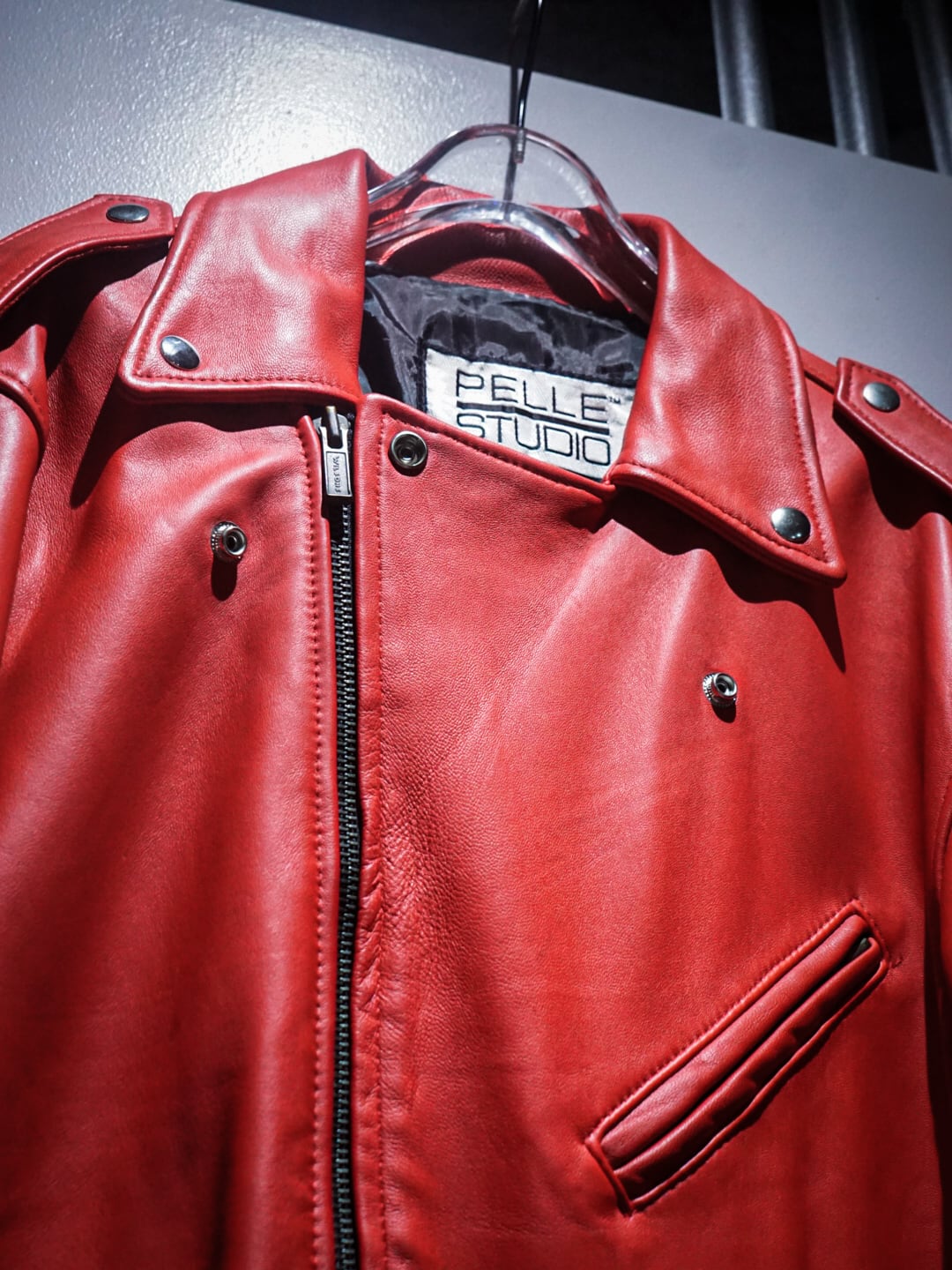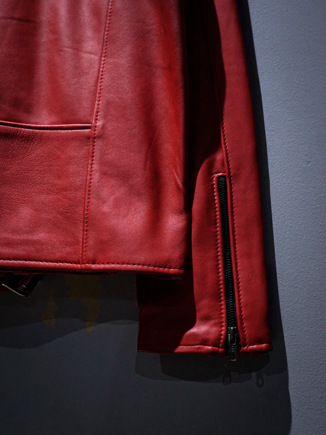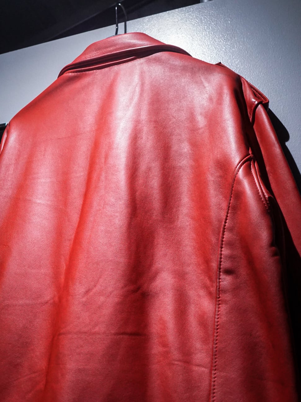 ダブルのライダースは定番アイテムですが、ラムレザーかつ、赤色と稀少なピース。きめ細やかなラムレザーからは高級感をムンムンに漂わせています。
