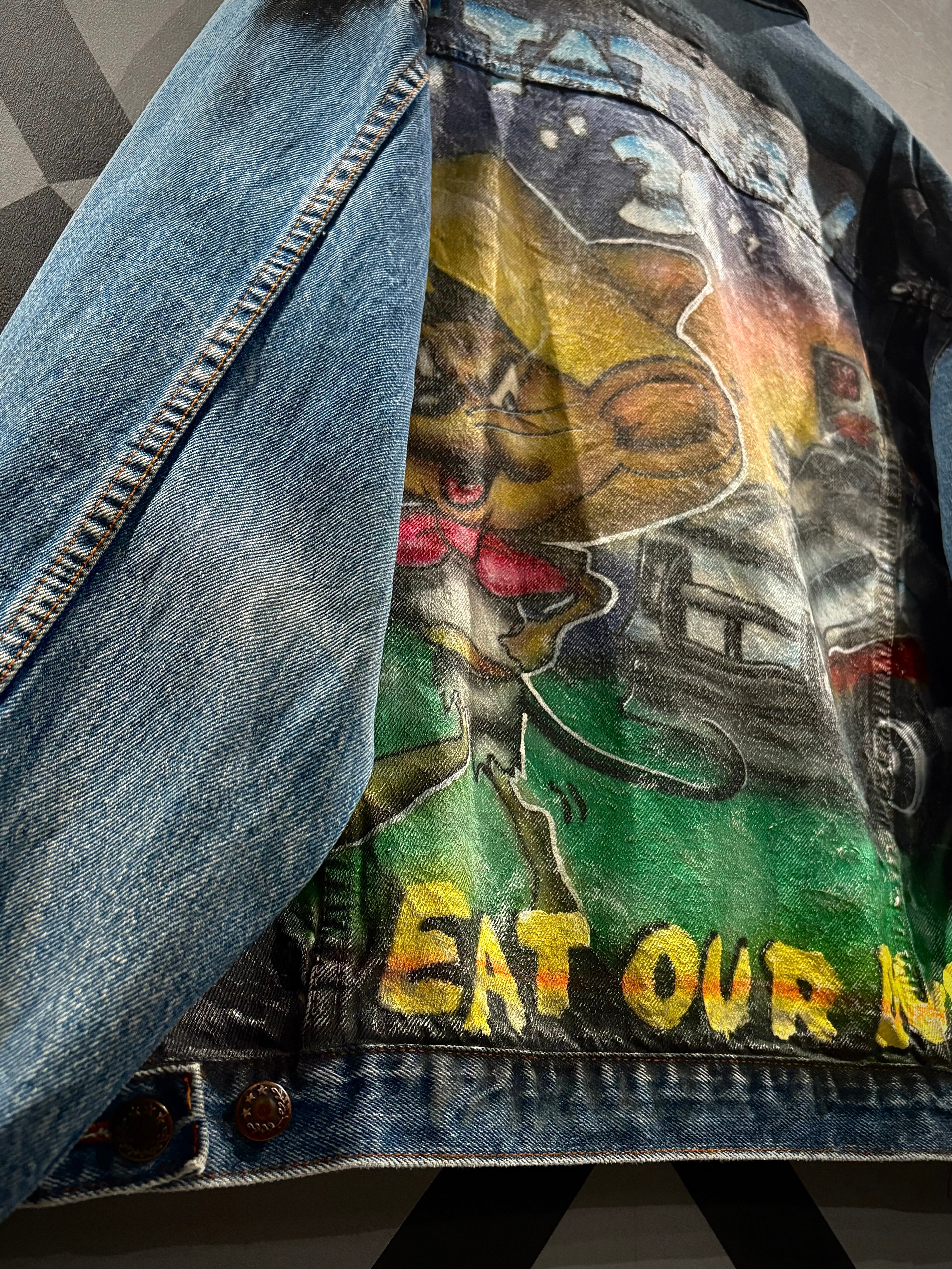 左肩、背面全体にデザインが施され、ネズミのキャラクターに車、そして"Eat Our Dust"と、私たちには勝てないよといった超ノリの良いデザイン。ハンドドローイングのクオリティもかなり高い、、、