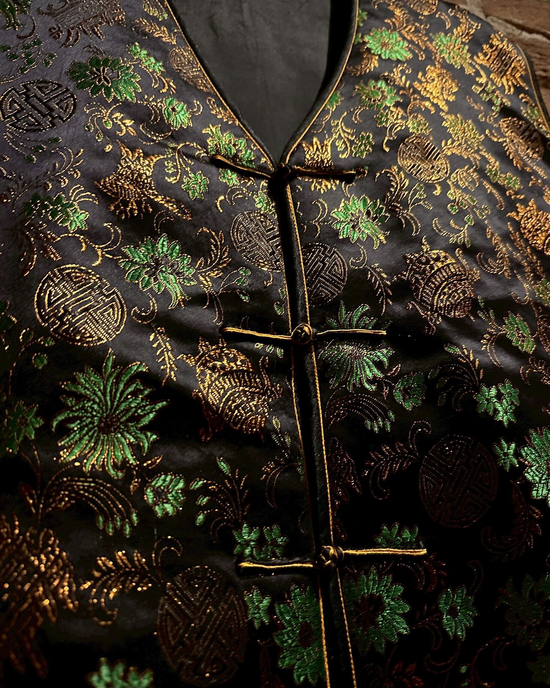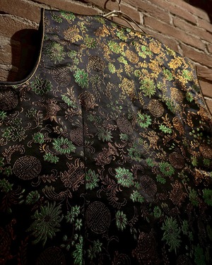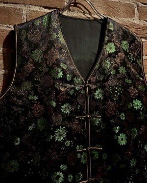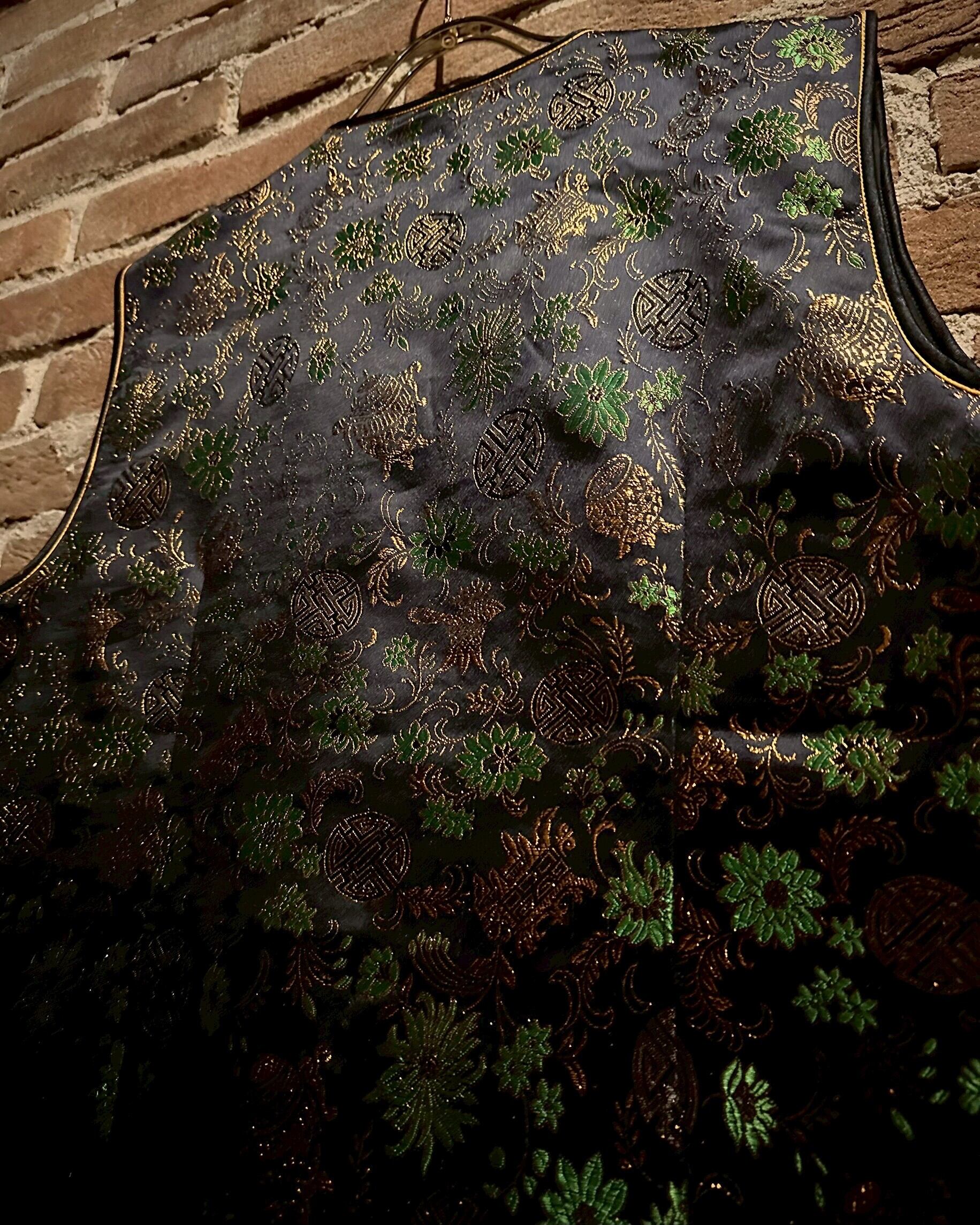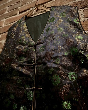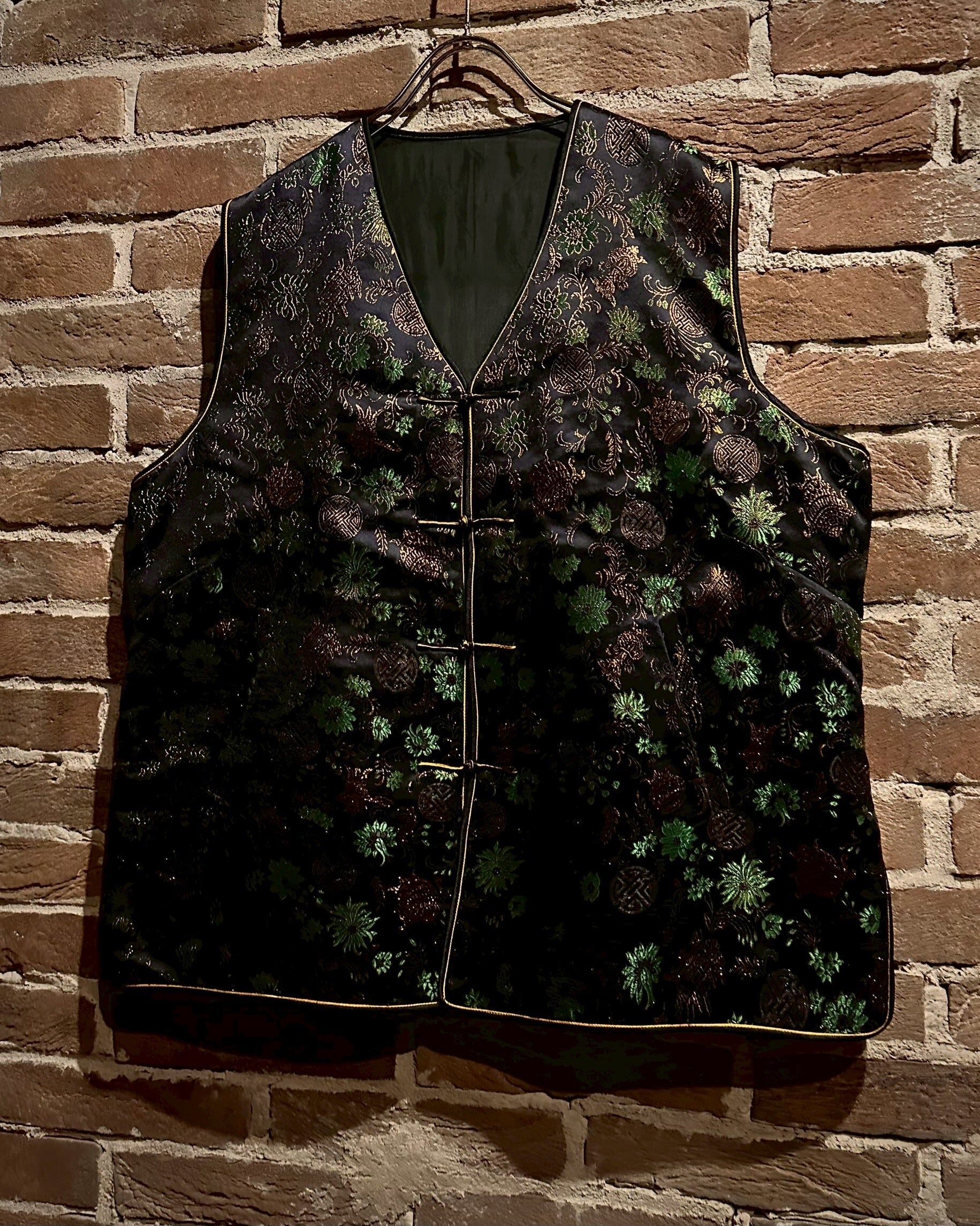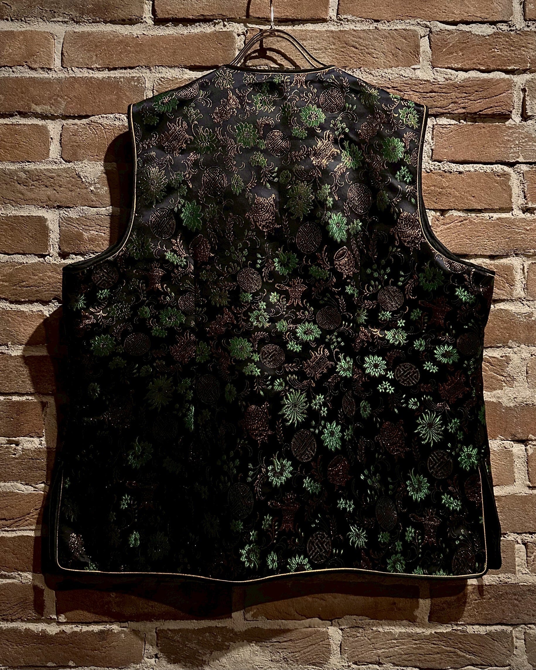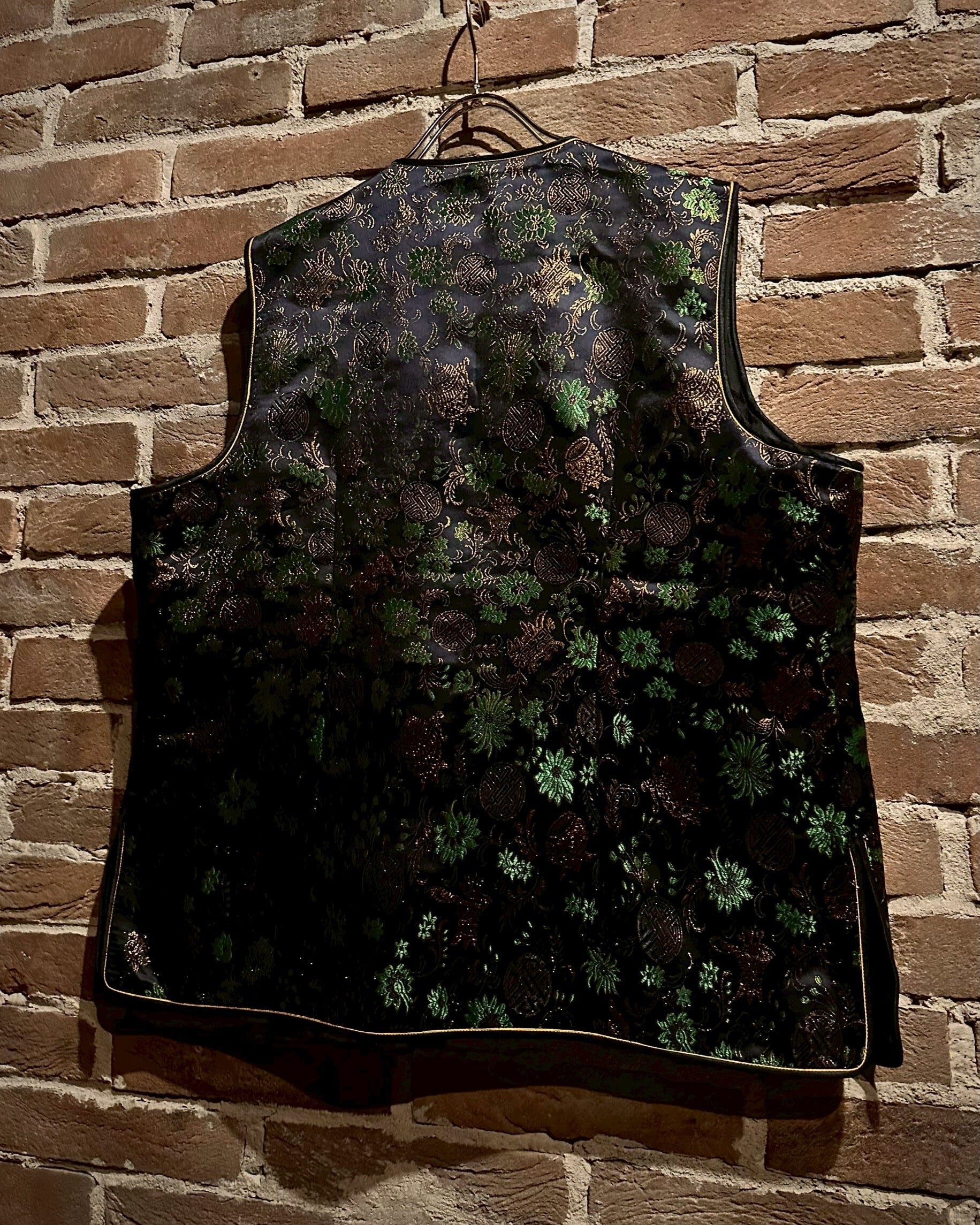ブラックカラーのボディをベースに、繊細な織りによって花や中華の伝統的な紋様をボディ全面に映し出したチャイナベスト。