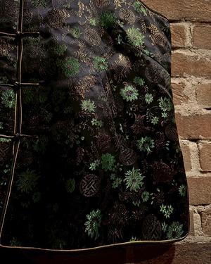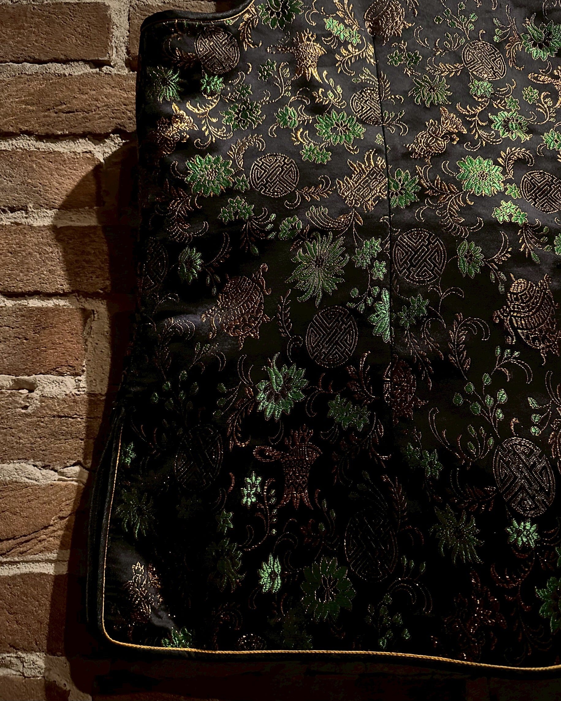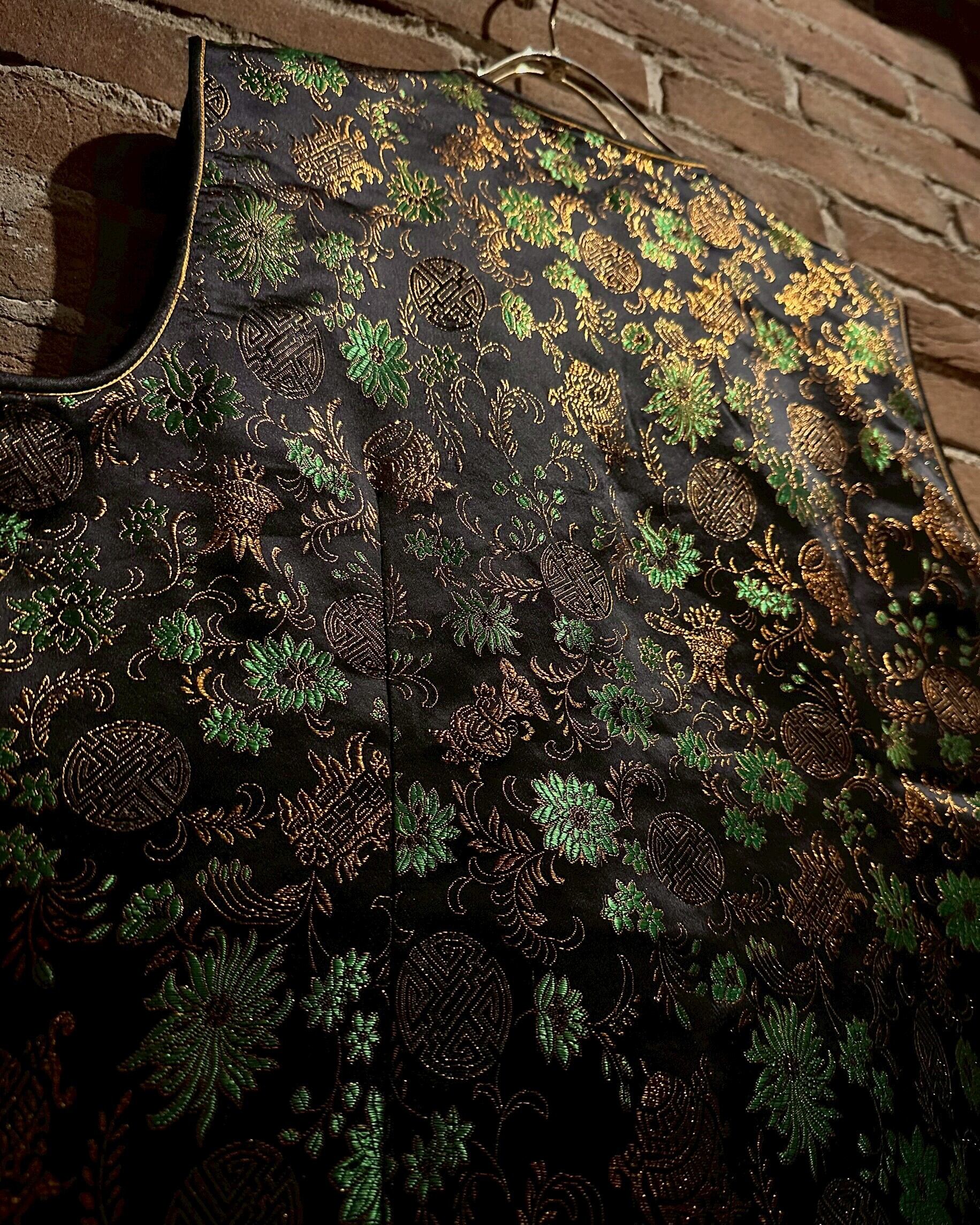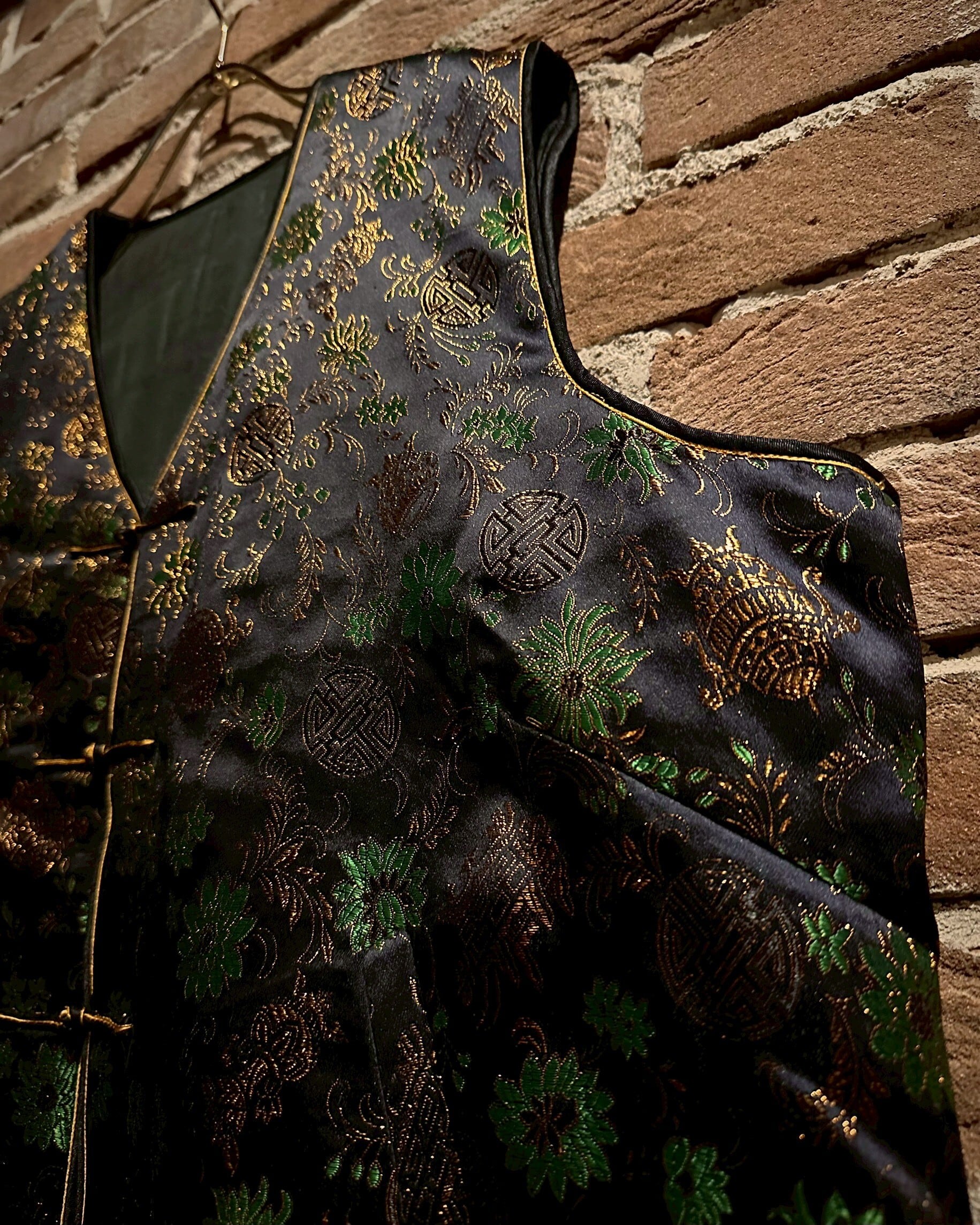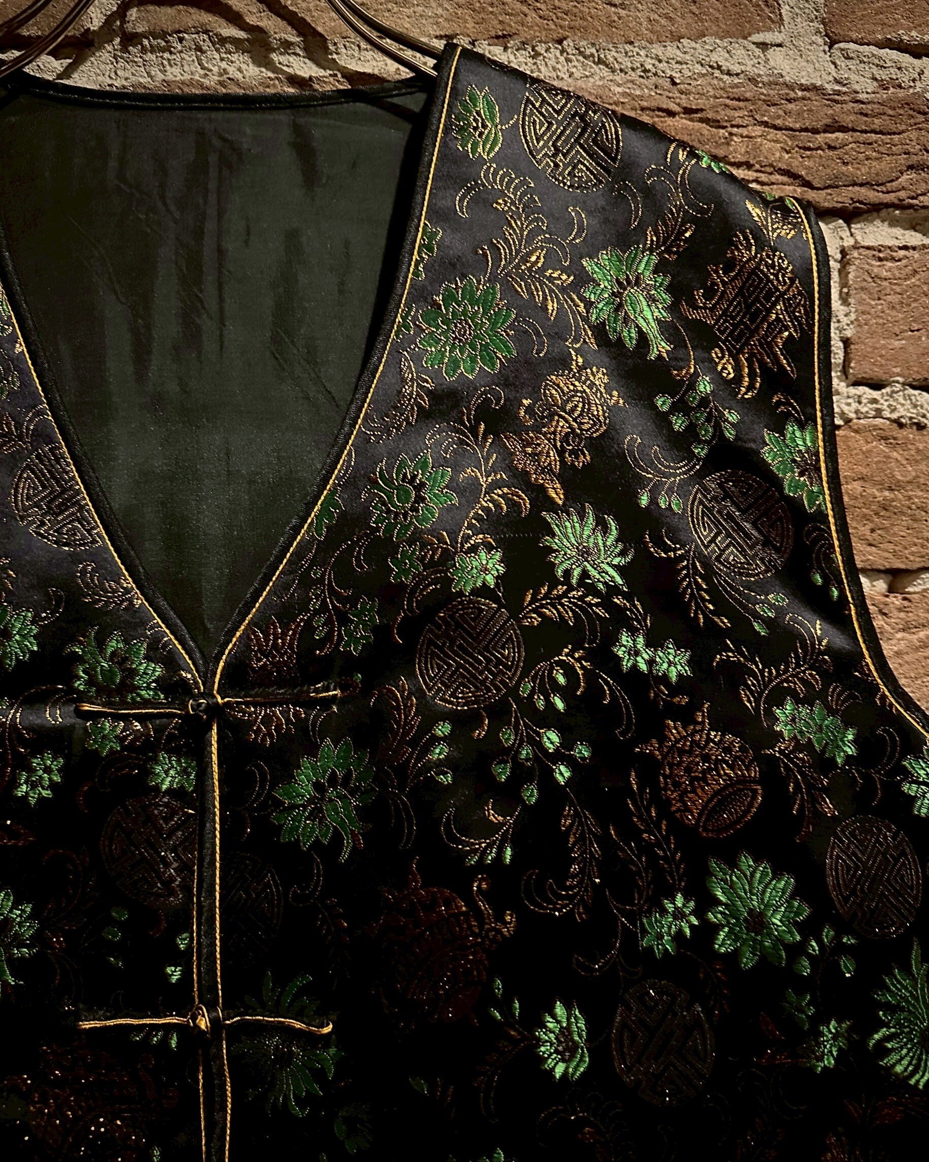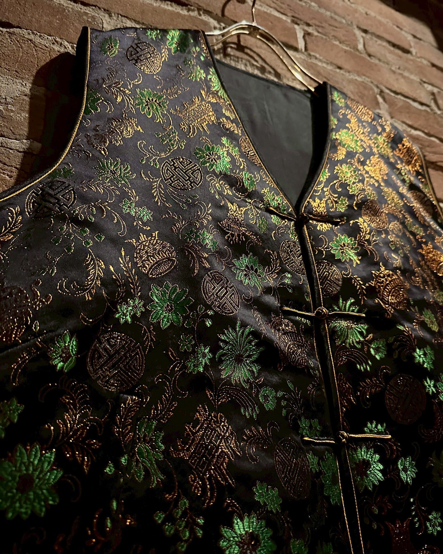 ブラックカラーのボディをベースに、繊細な織りによって花や中華の伝統的な紋様をボディ全面に映し出したチャイナベスト。