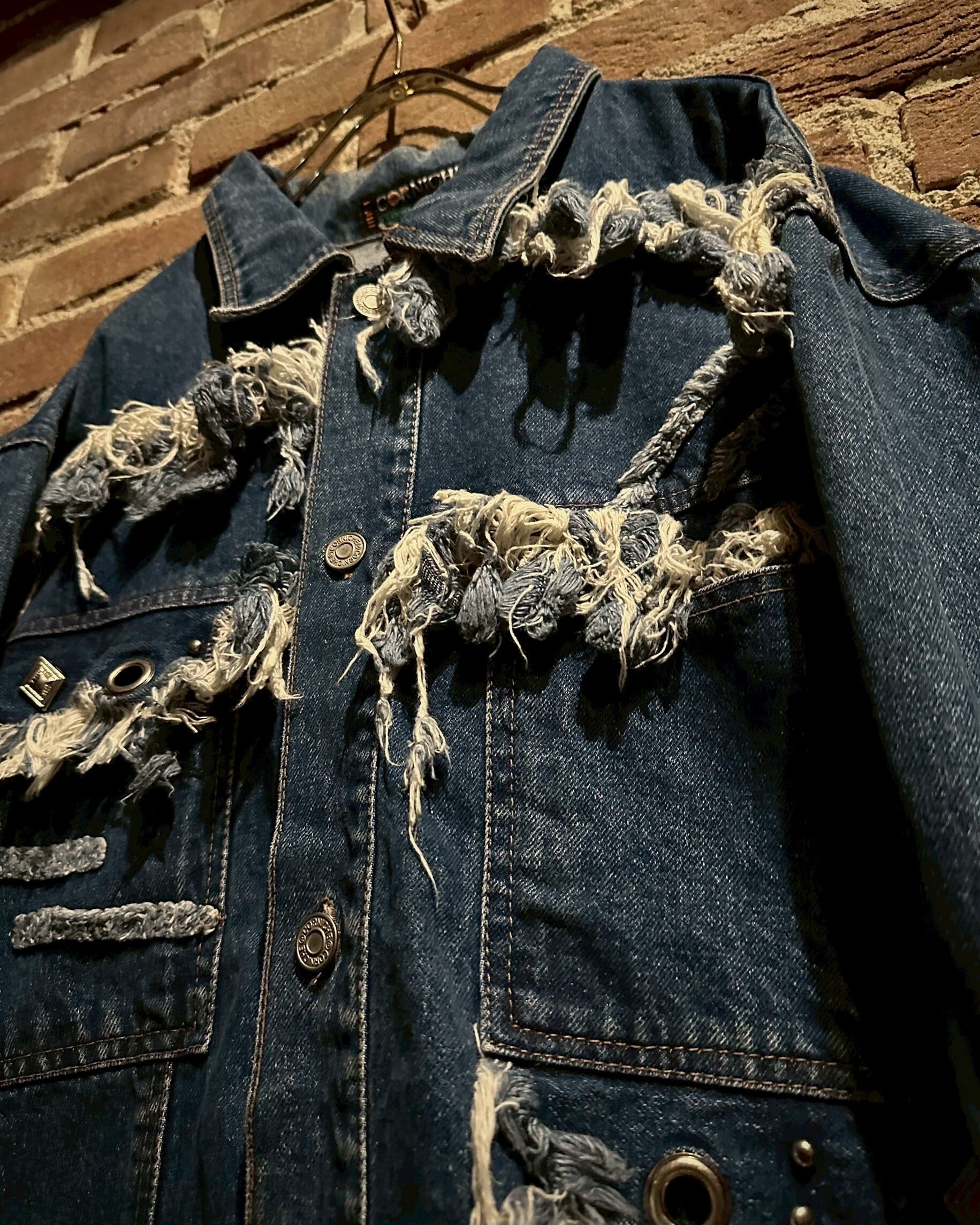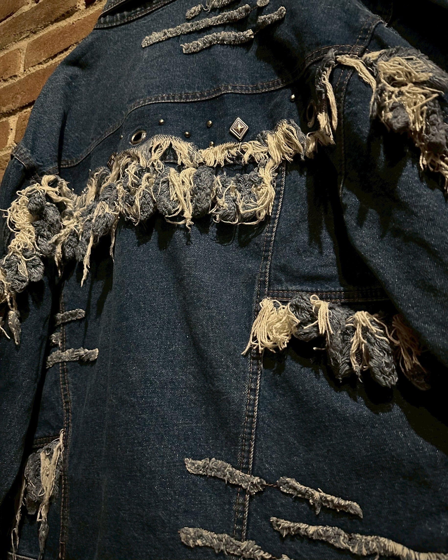 立体的かつボリューミーなフリンジに加えて、スタッズやハトメ、コンチョの装飾。カジュアルなデニムの表情にラグジュアルなエッセンスがMixされた、非常に完成度の高い1着。