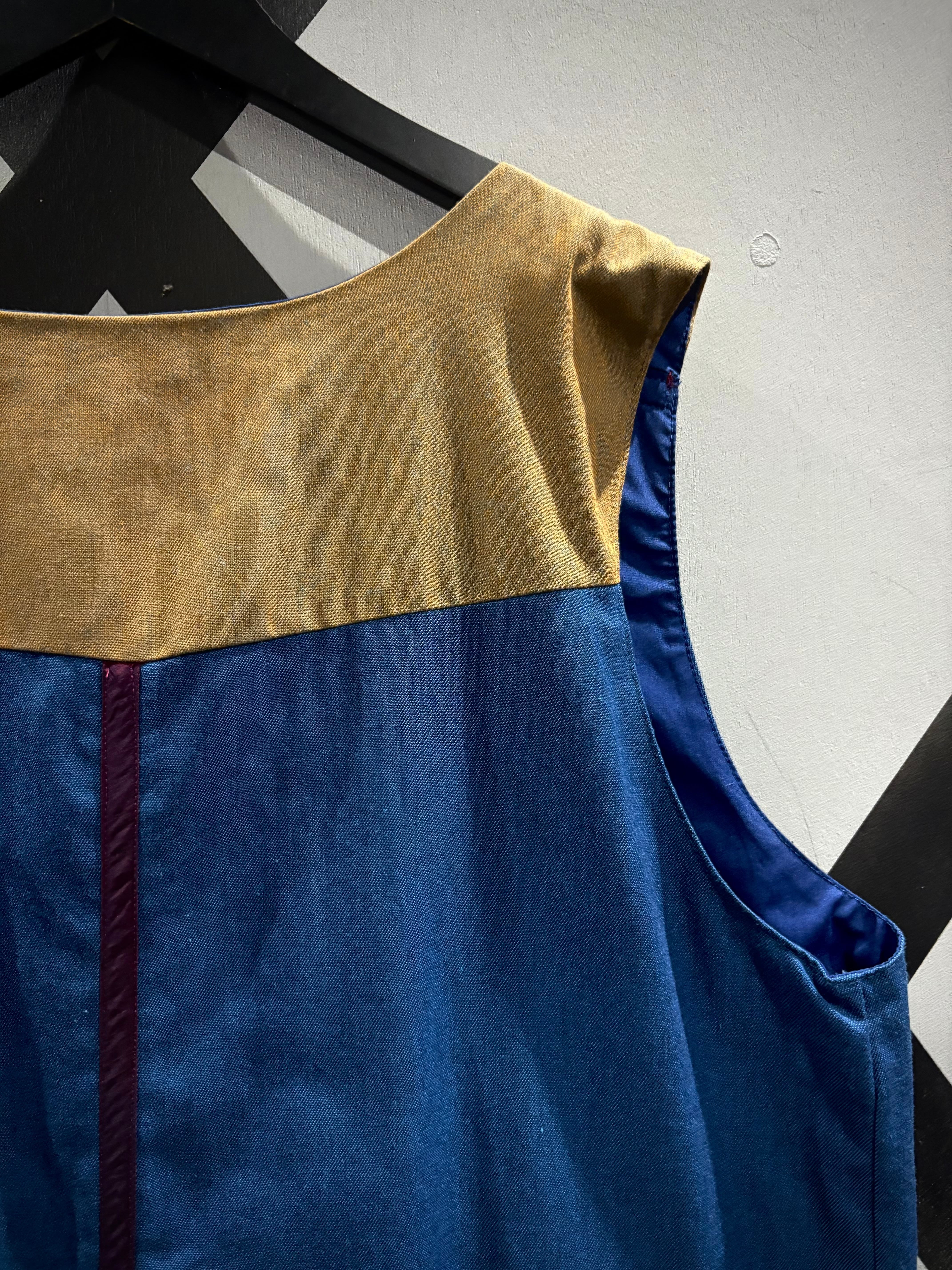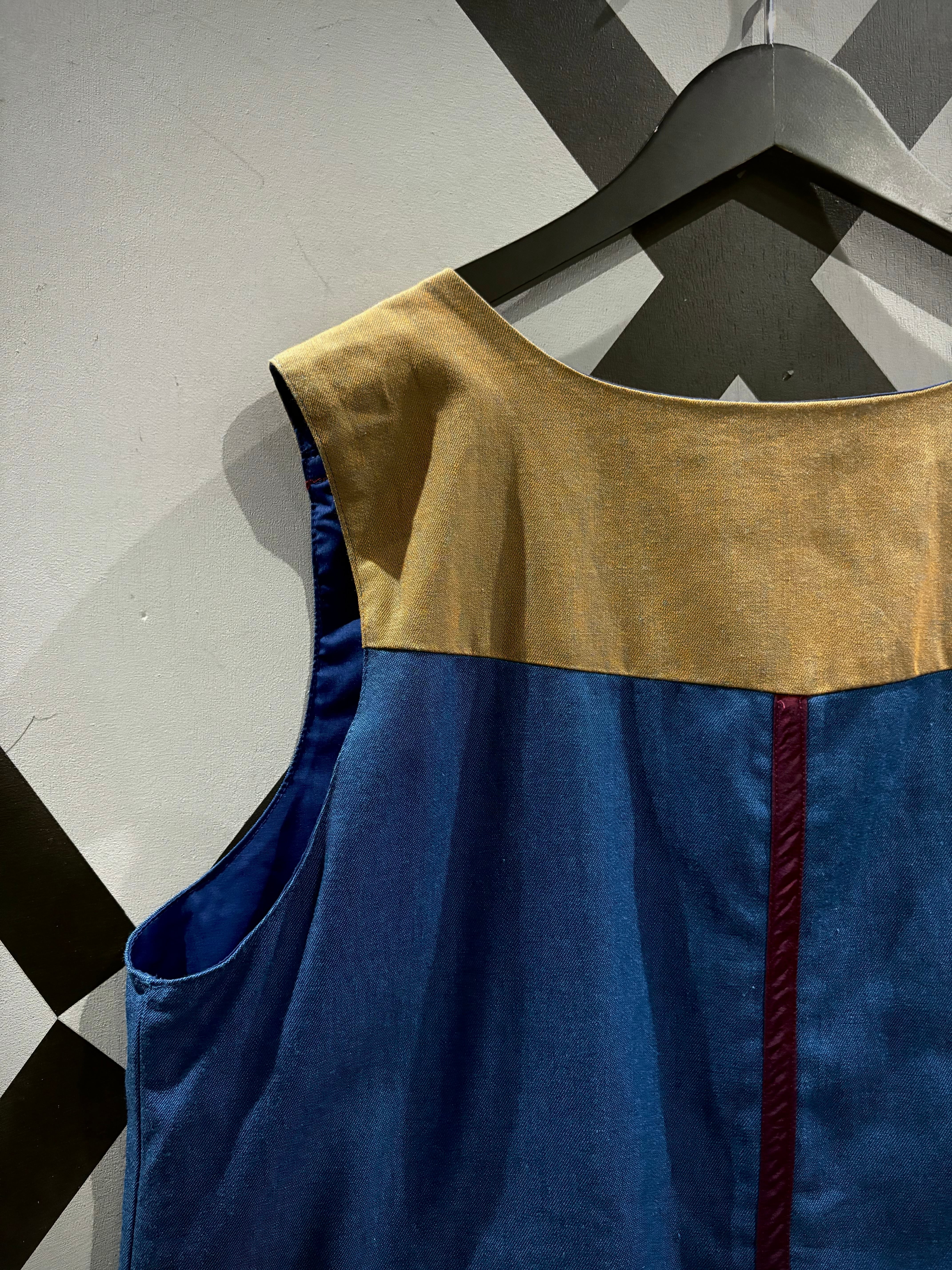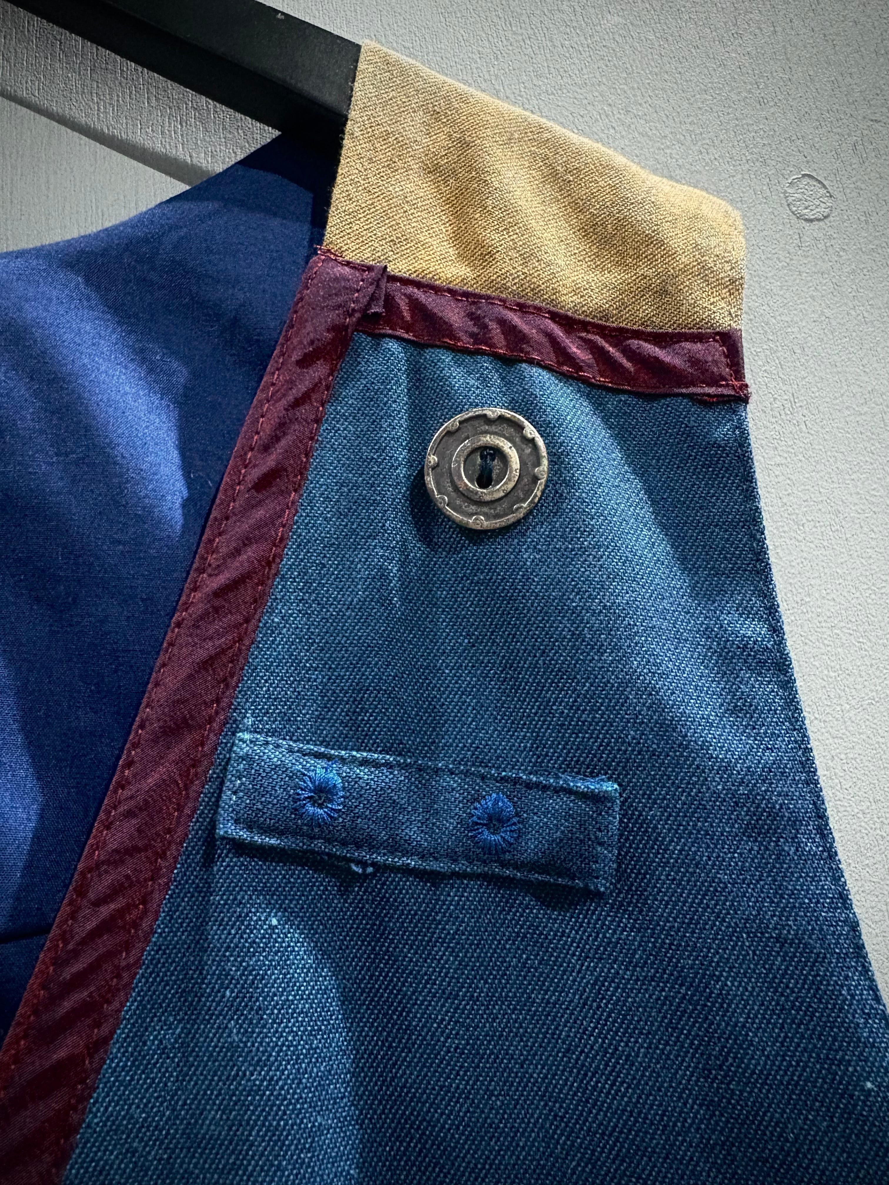 コットンポリを用いたブルーのボディをベースに、肩やフロント、ヨークにベージュ、随所に赤を切り替えた1着。
