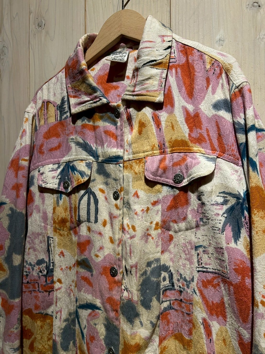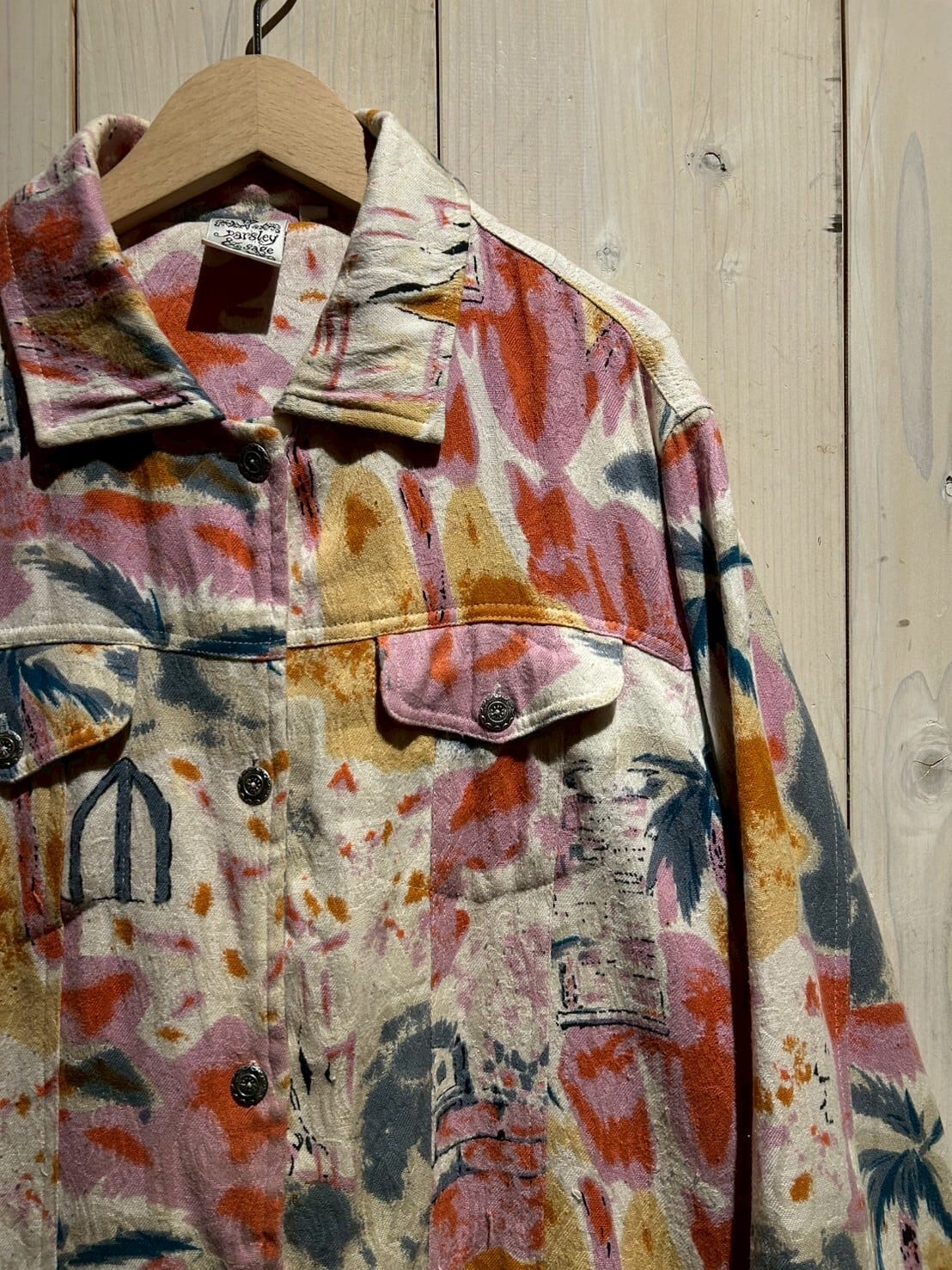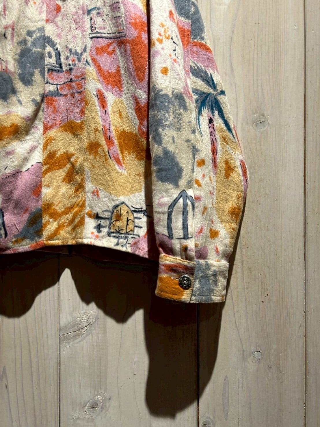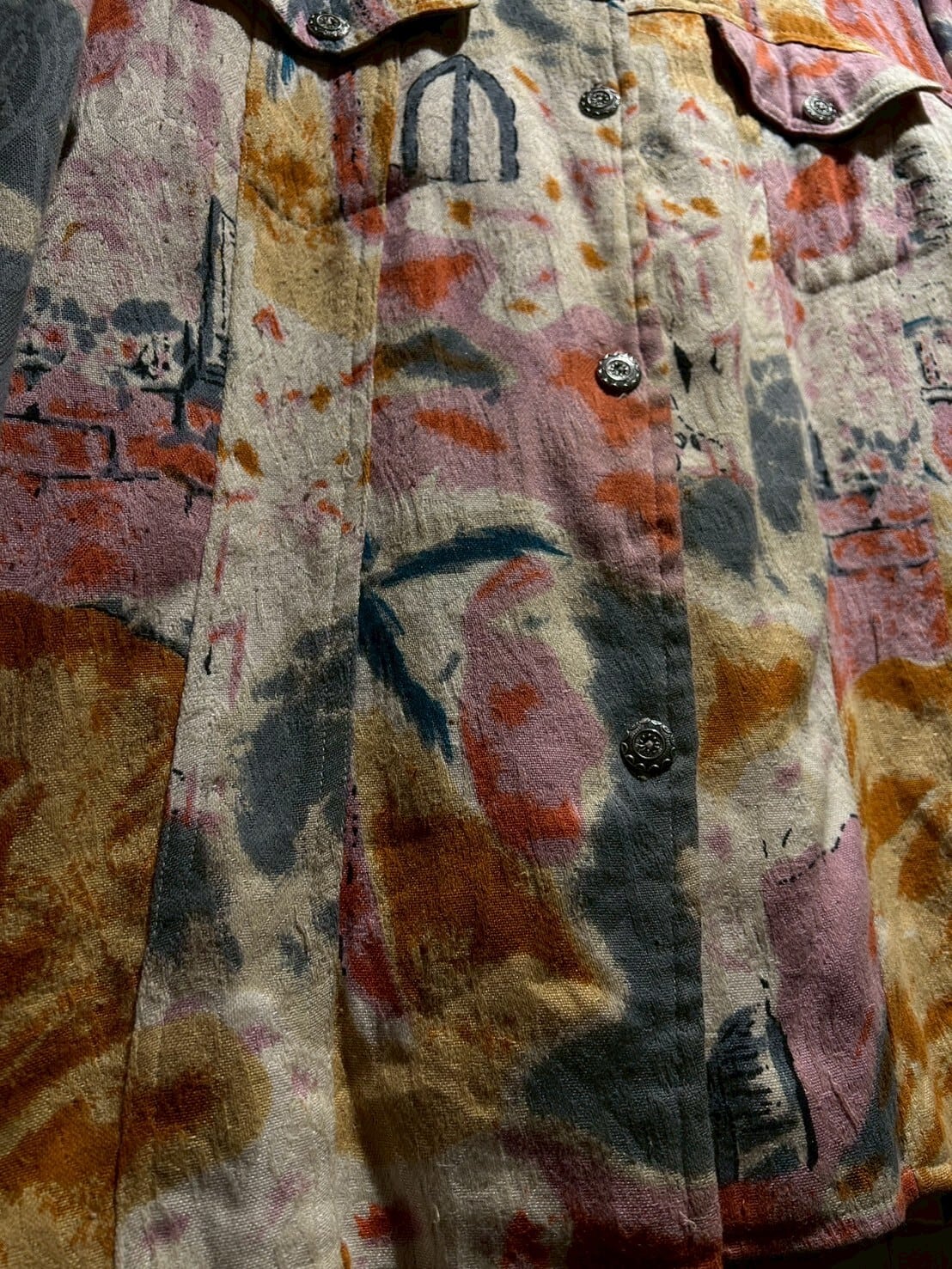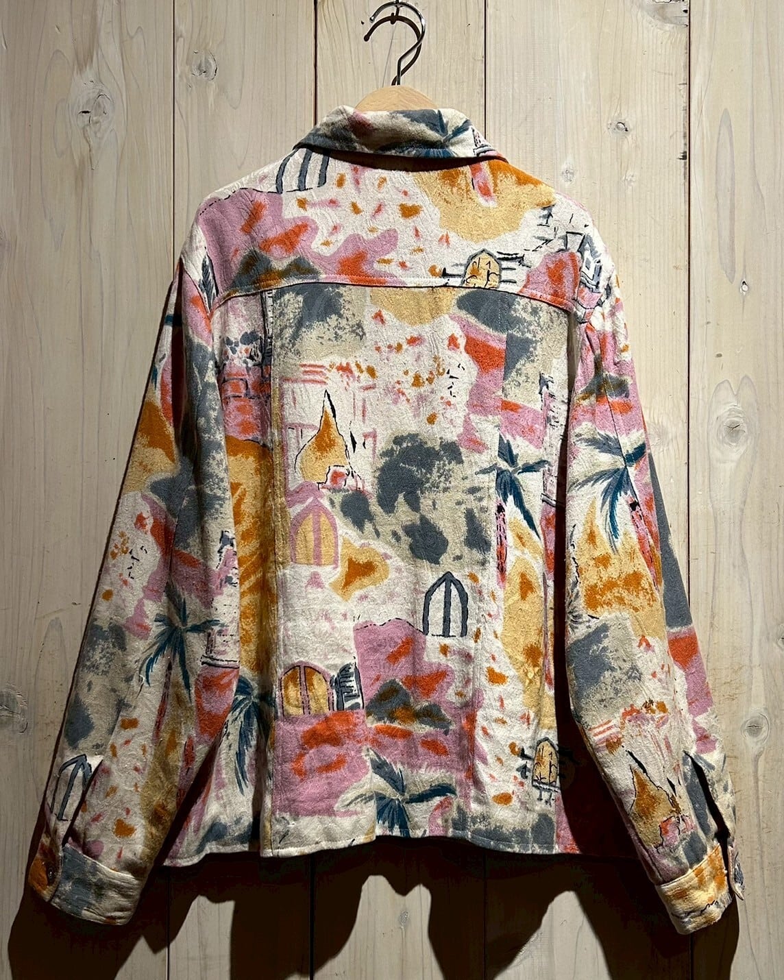 白のボディをベースとし、ボディ全体に淡い色味を用いたアーティスティックな柄を映し出したコットントラッカージャケット。