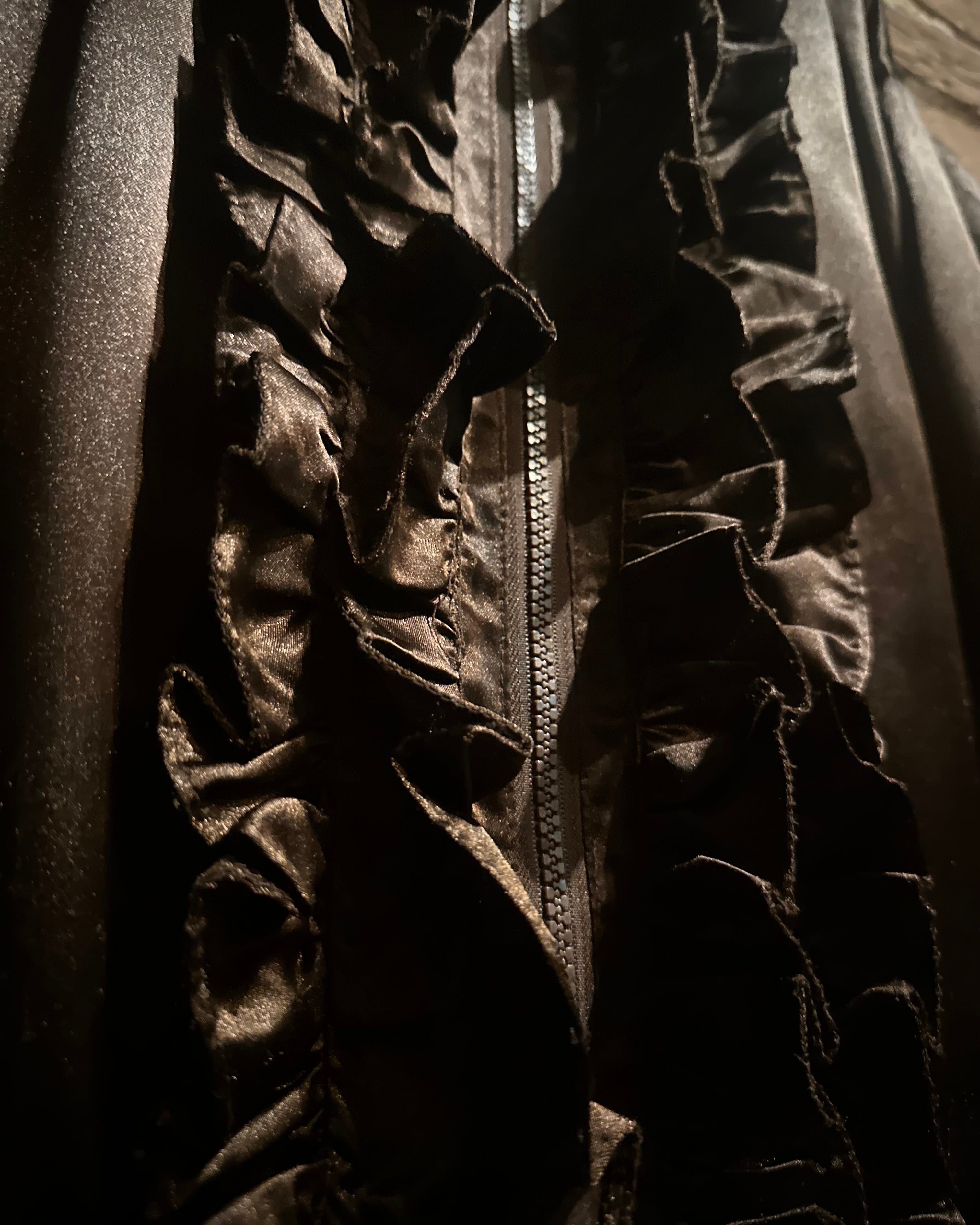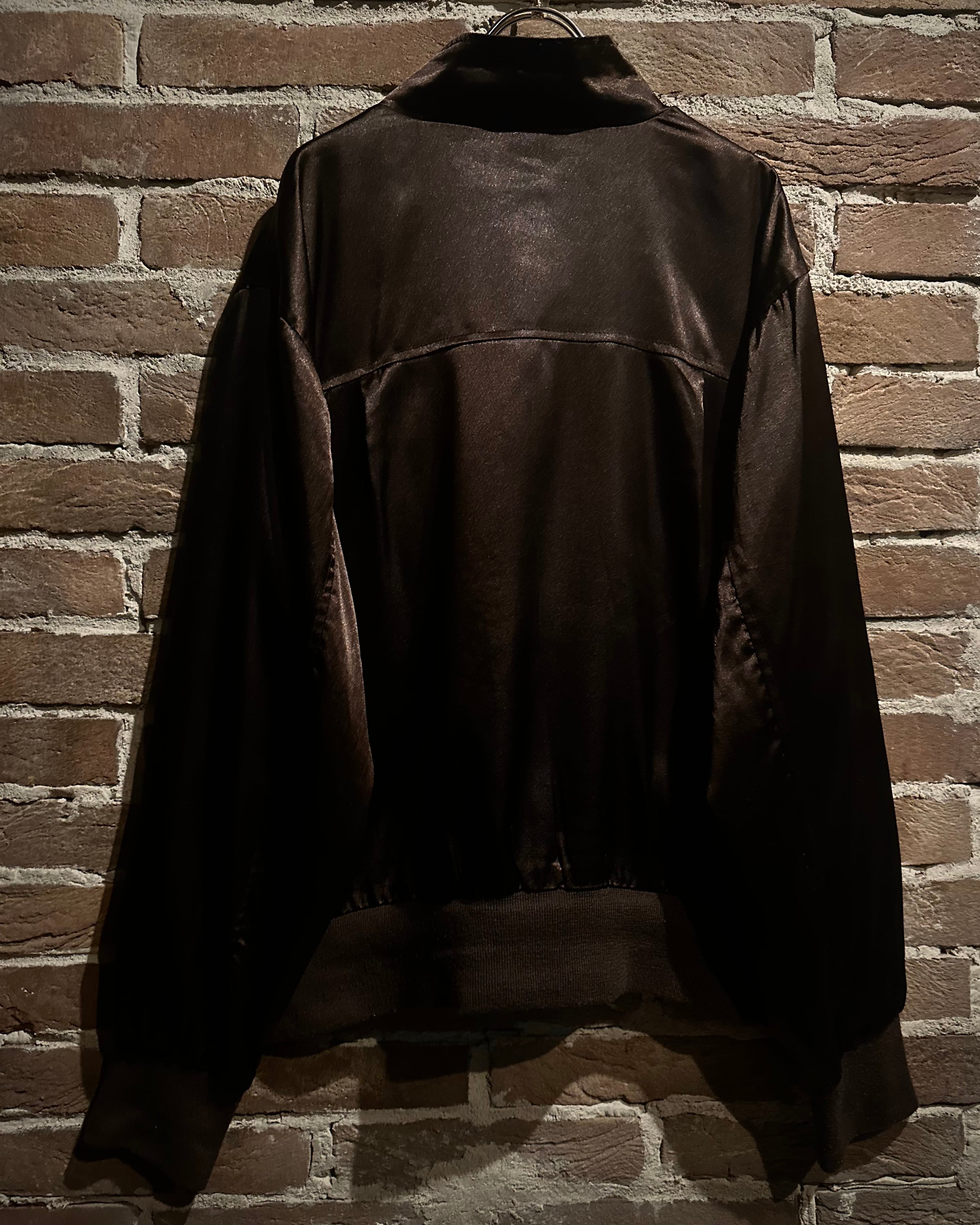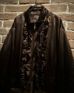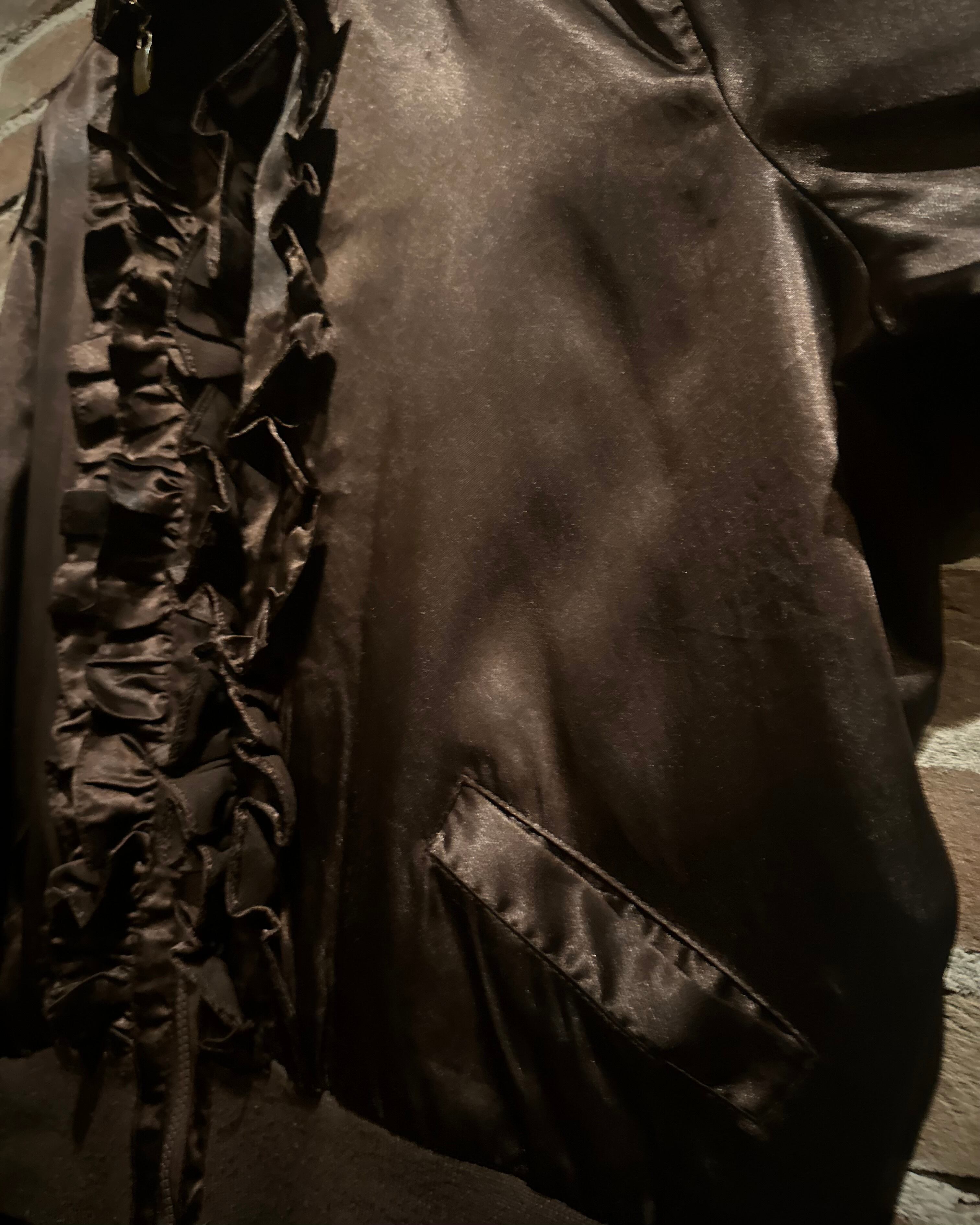 美しい光沢を帯びたブラウンカラーのファブリックをボディに用い、フロントにフリルの装飾を施した稀有かつスペシャルなブルゾンジャケット。