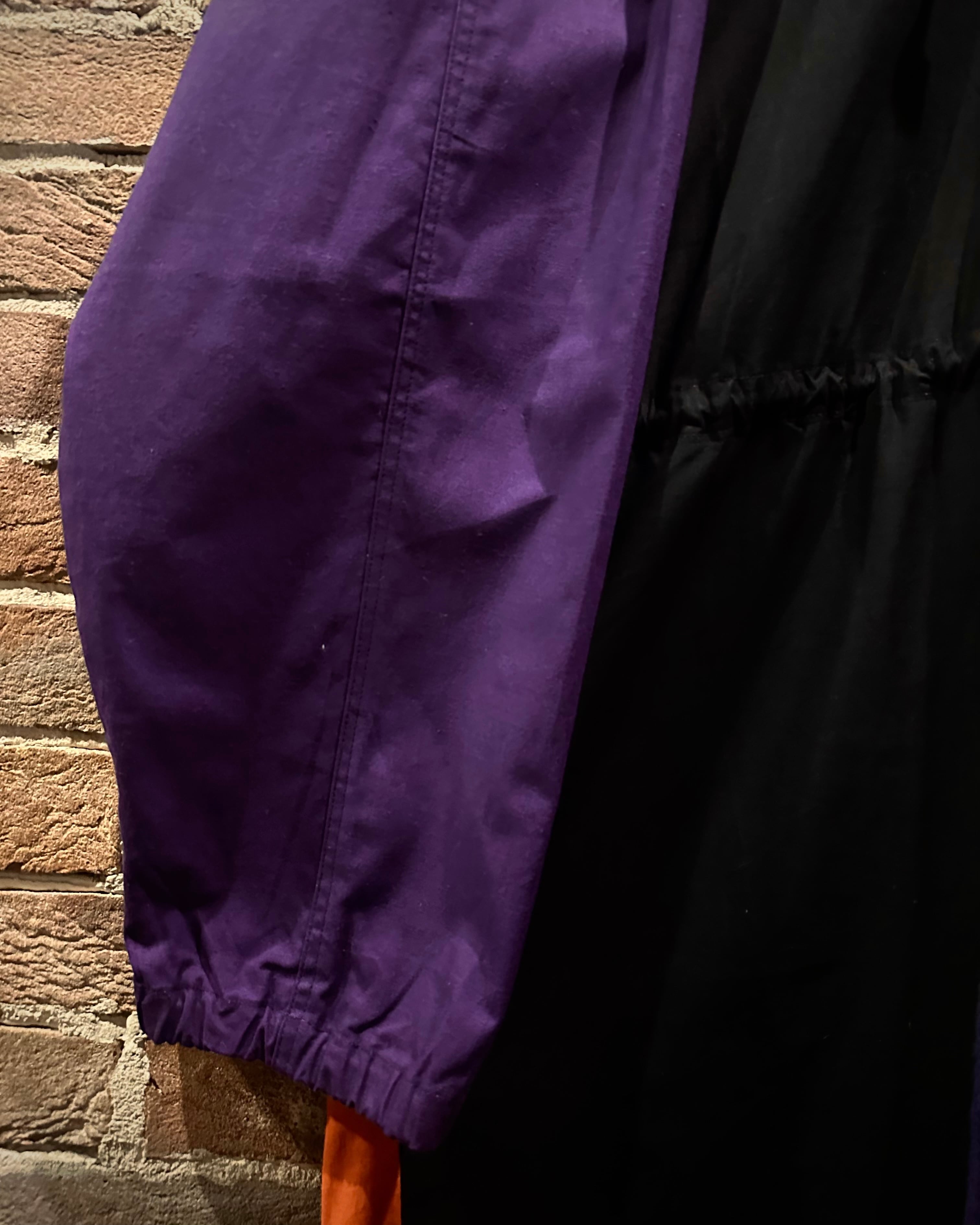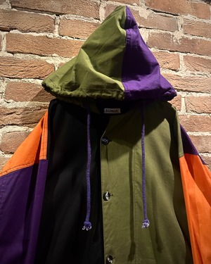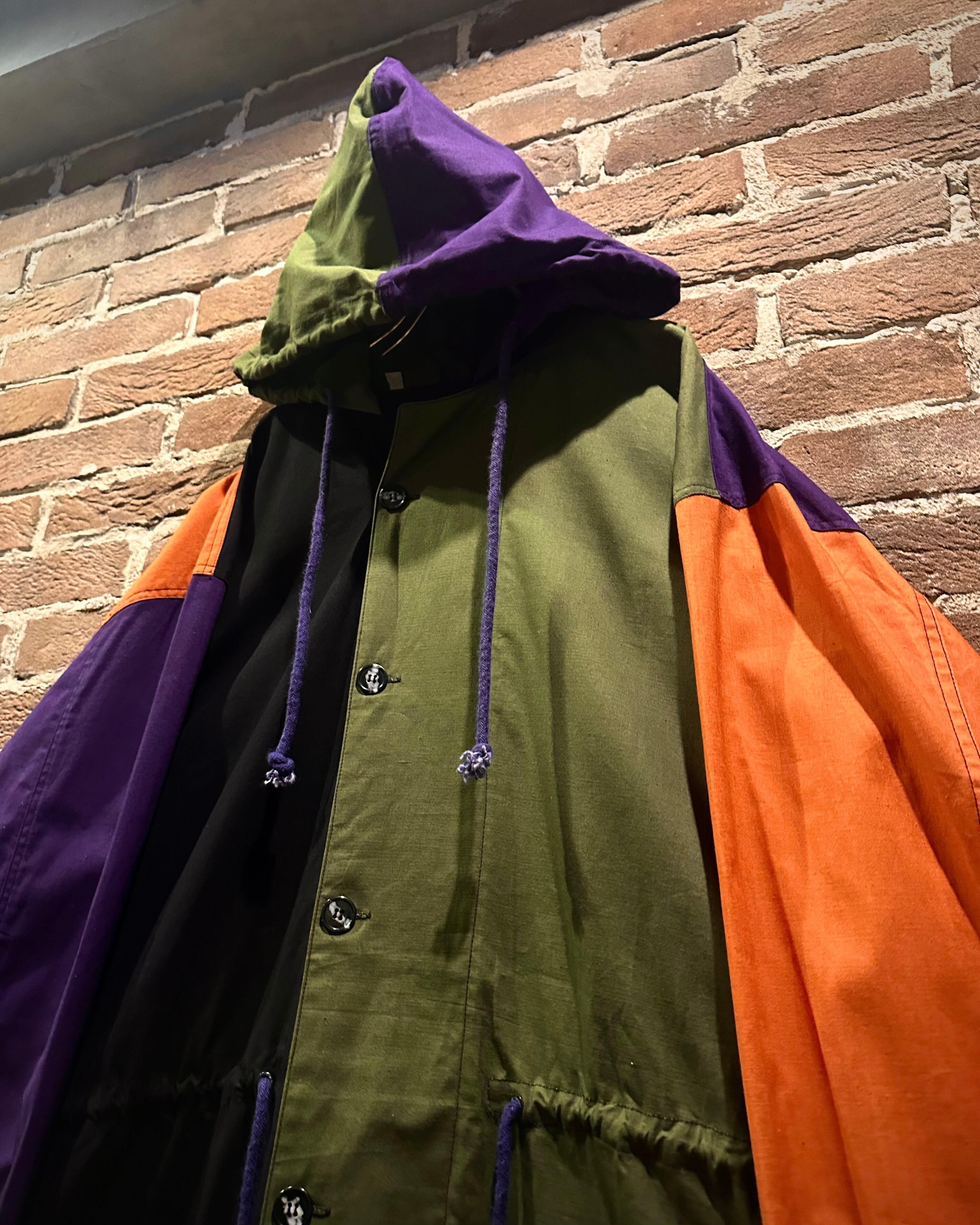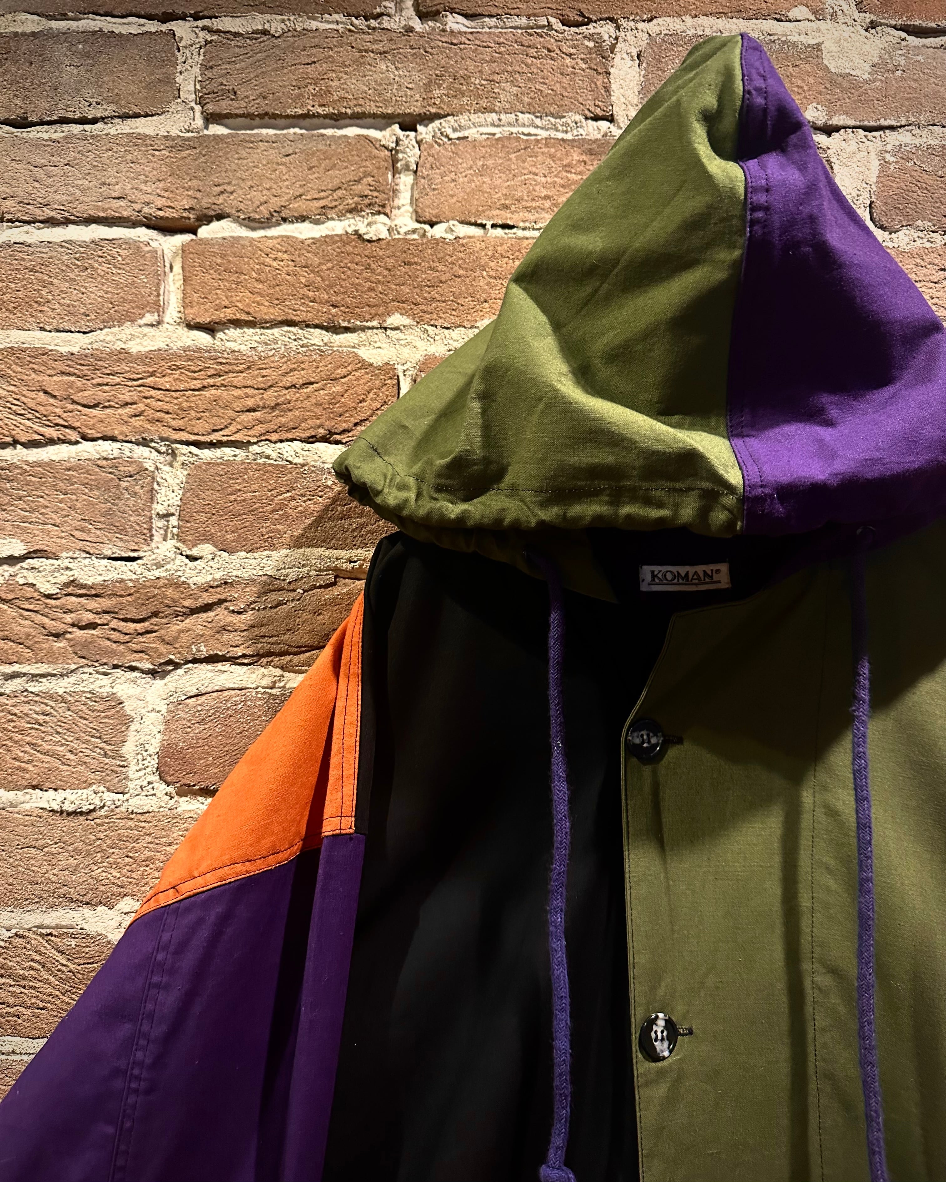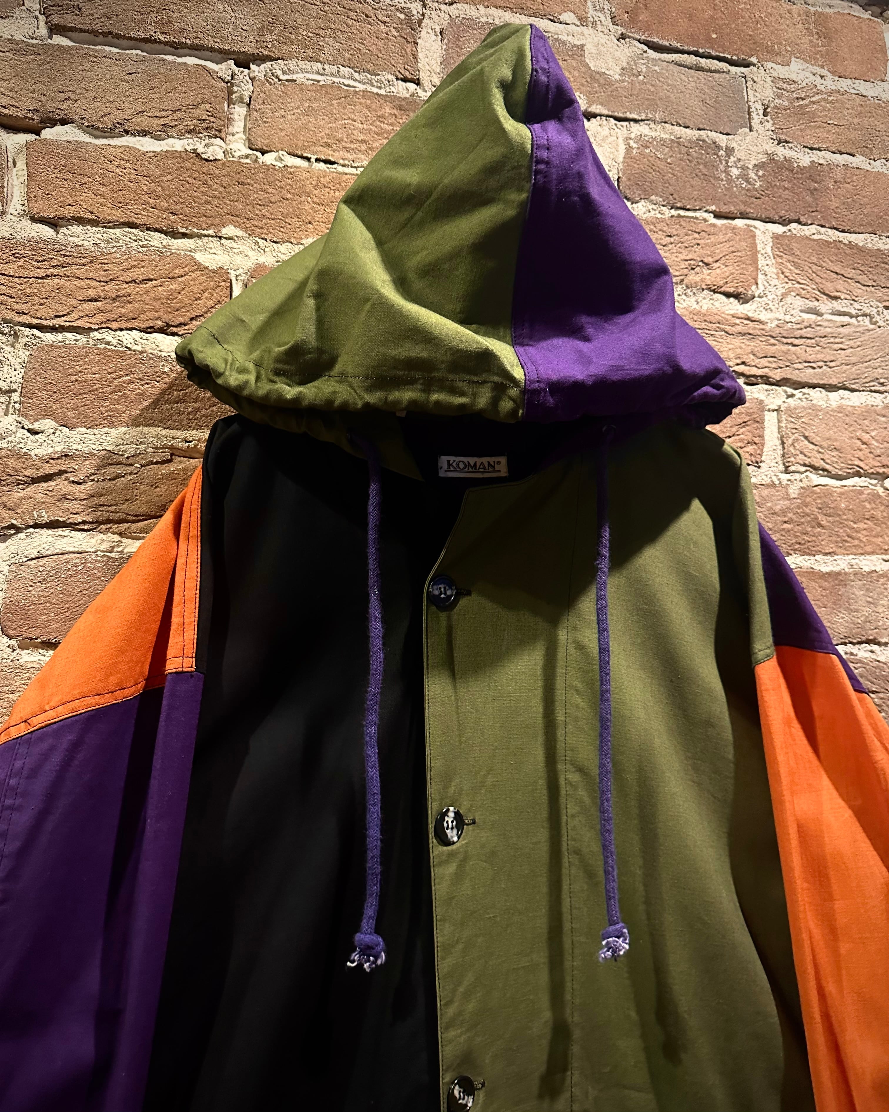 オレンジ、グリーン、パープル、ブラックのマルチなカラーリングによる切り替えを施した"KOMAN"のフーデッドコート。