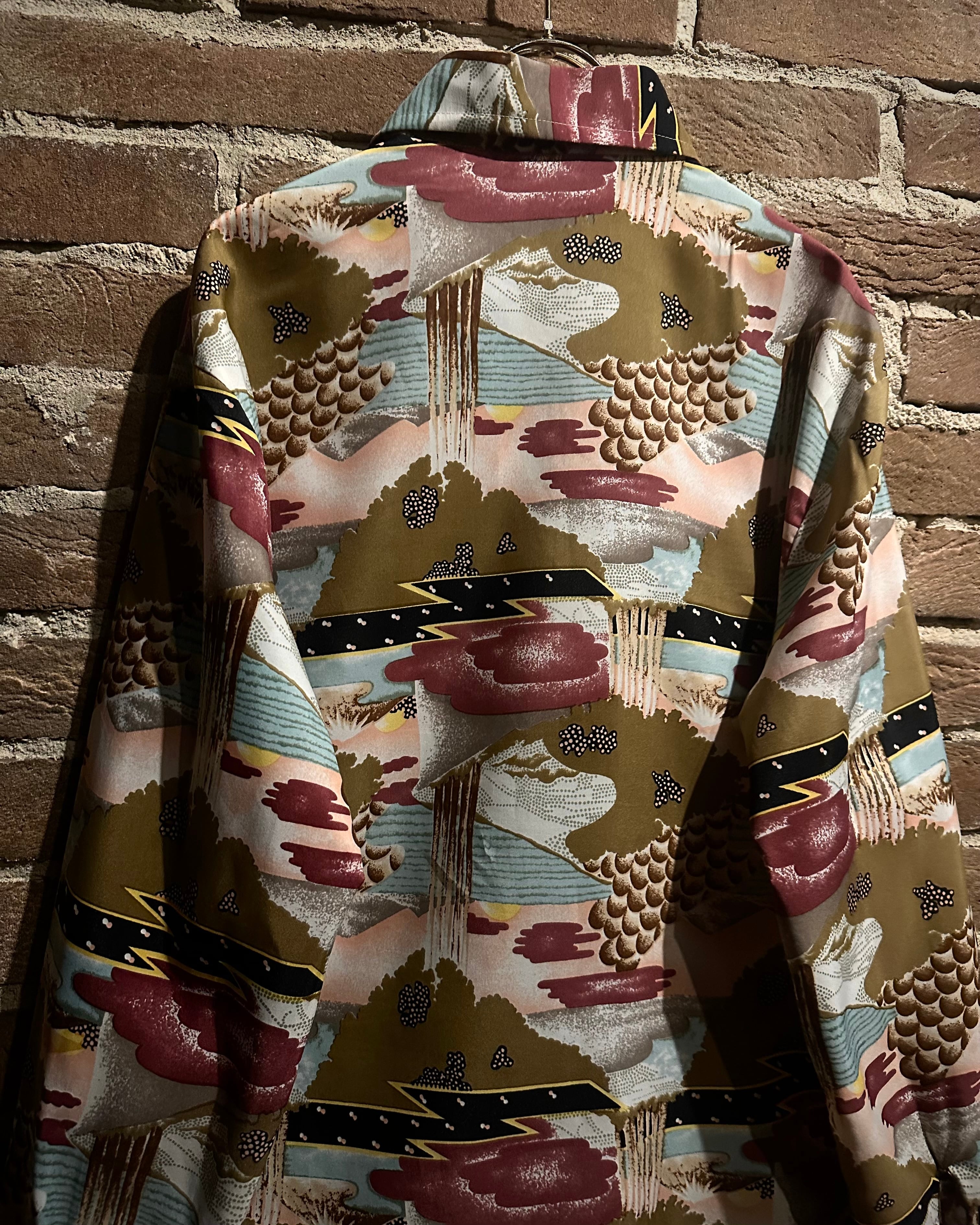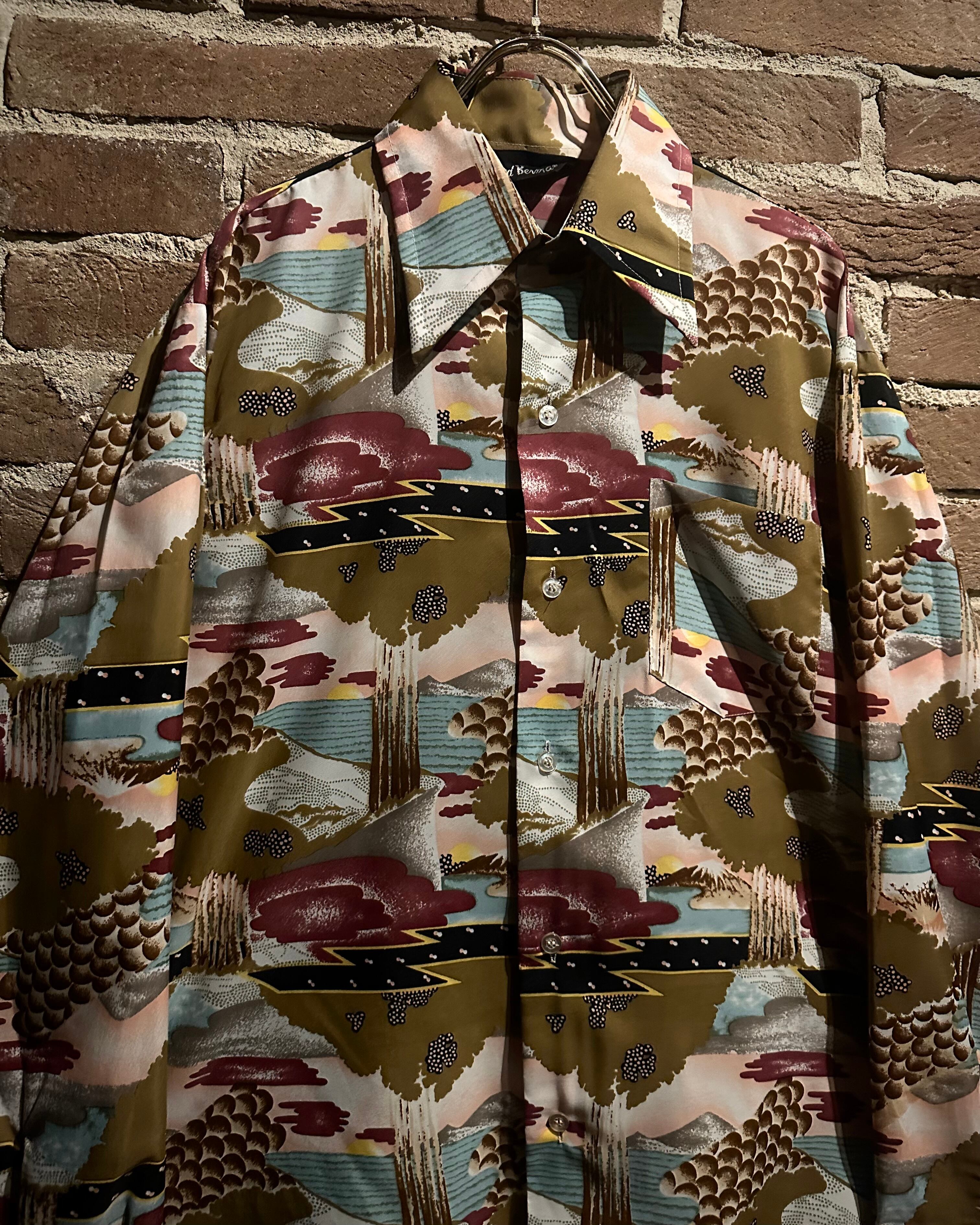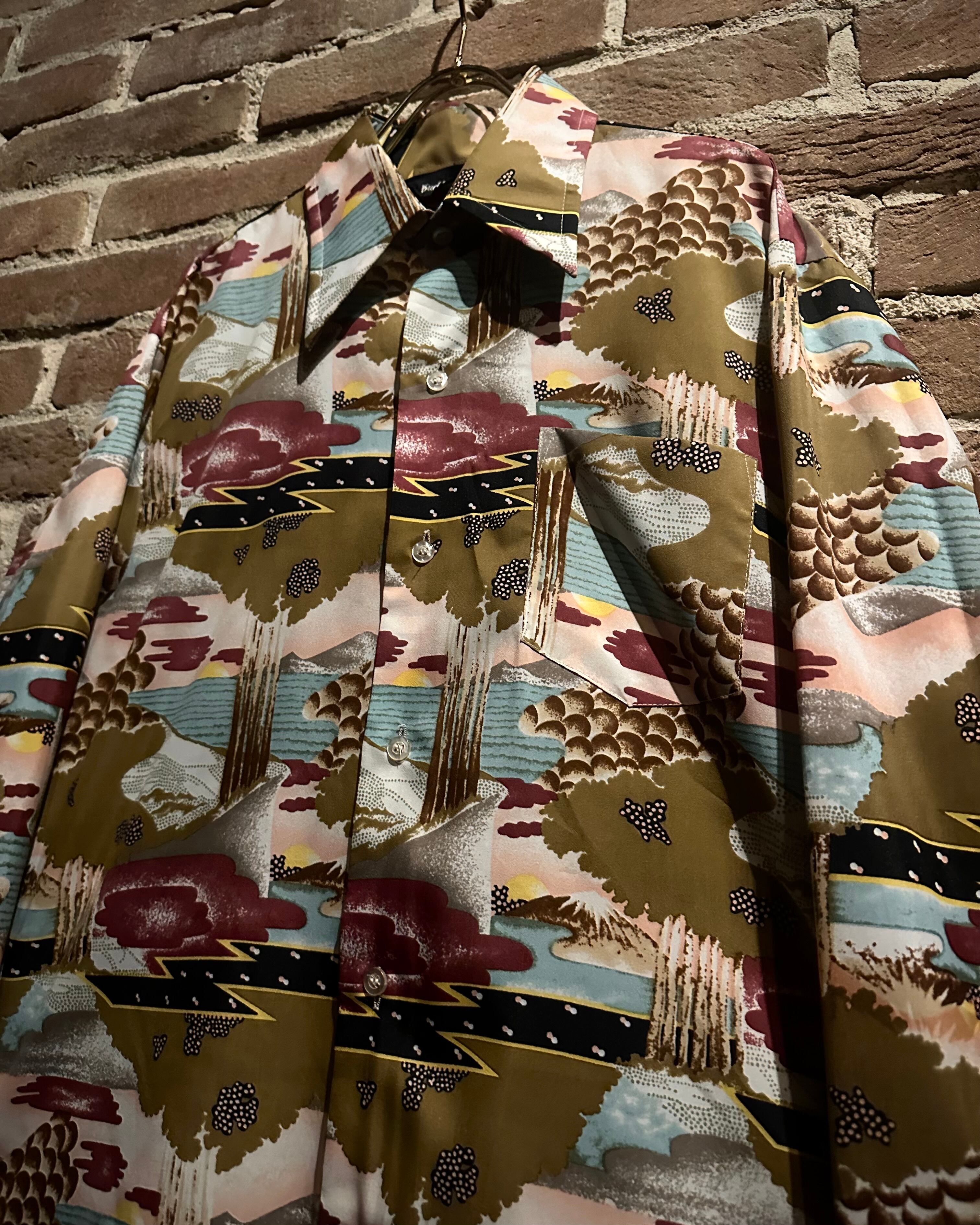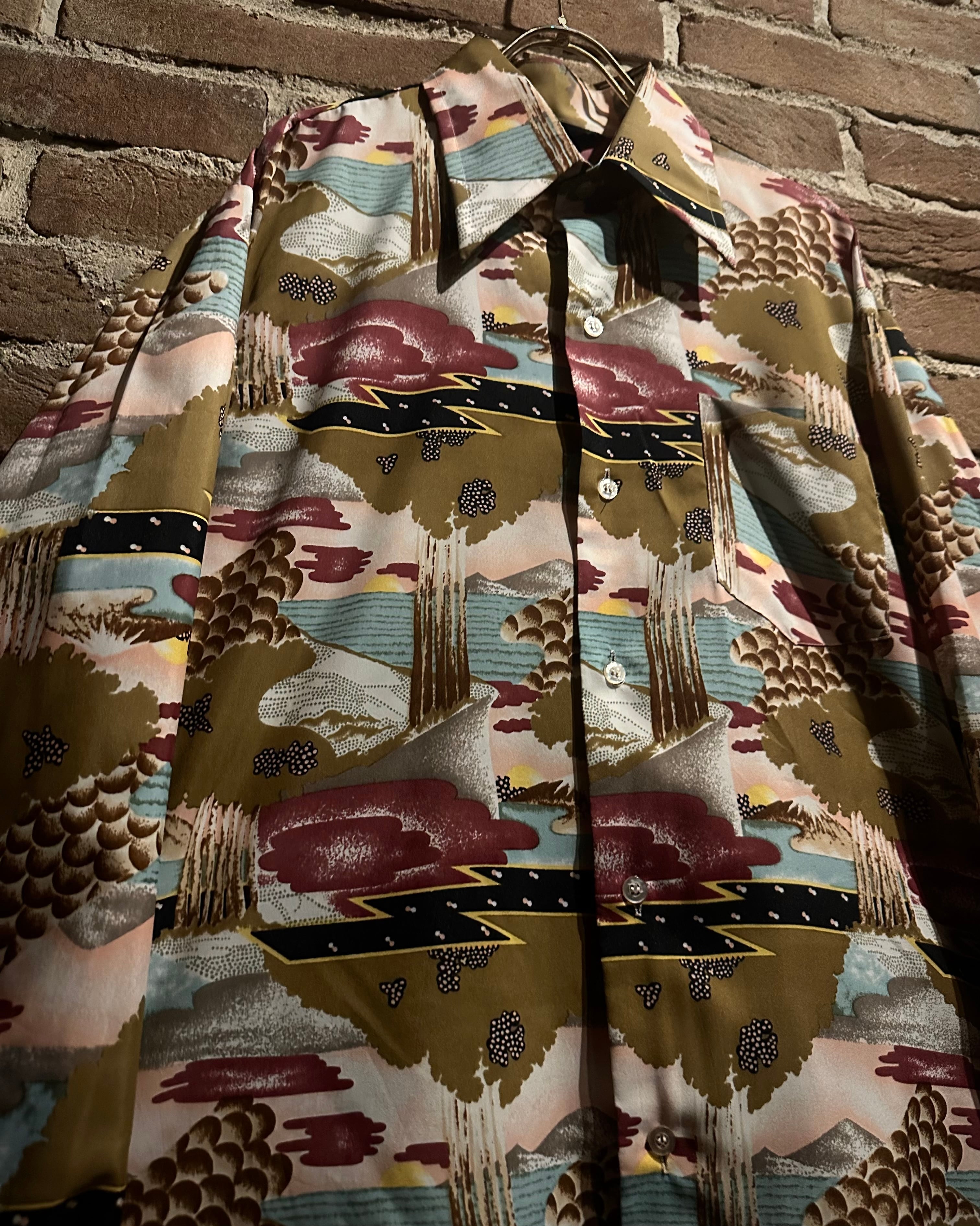 ツルッとした滑らかな質感のボディに、和な雰囲気を感じさせる柄模様を載せた70'sの長袖シャツ。
