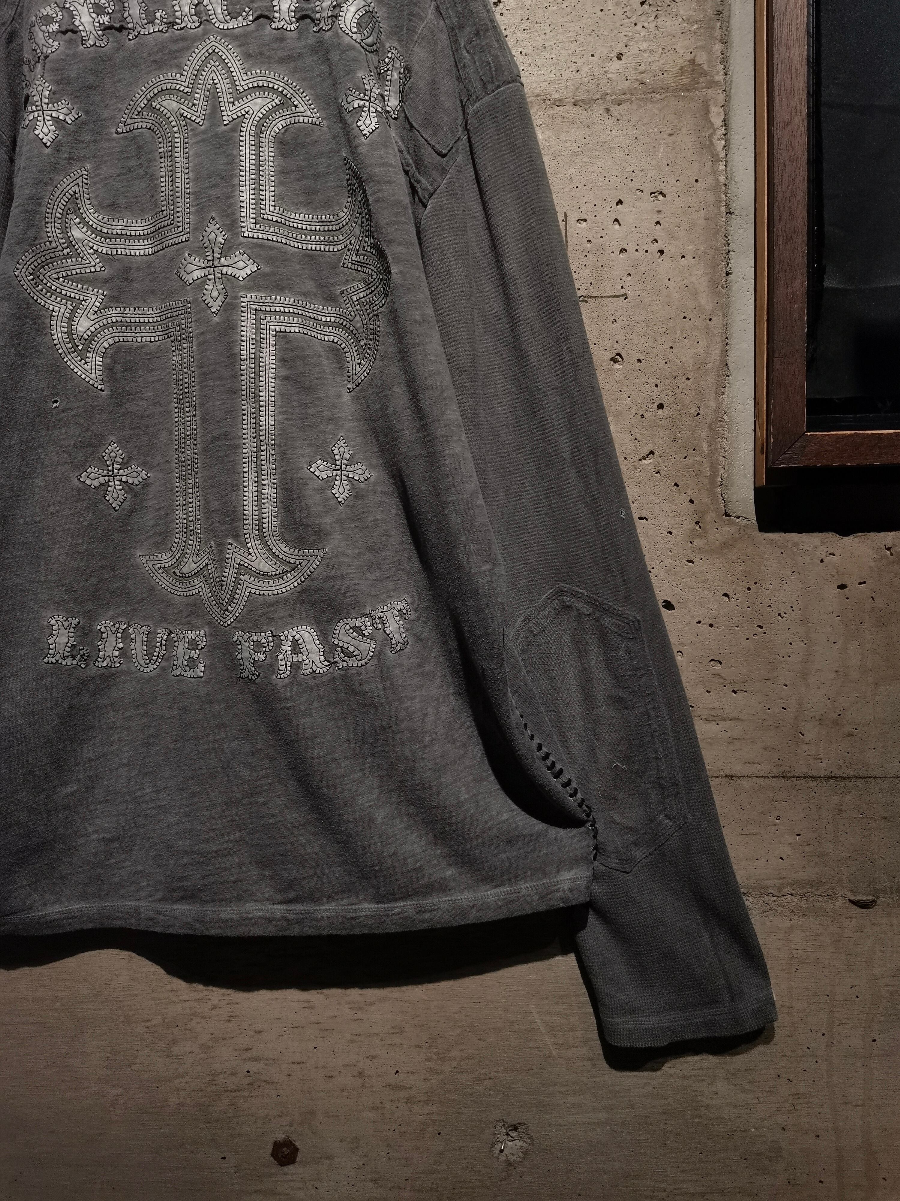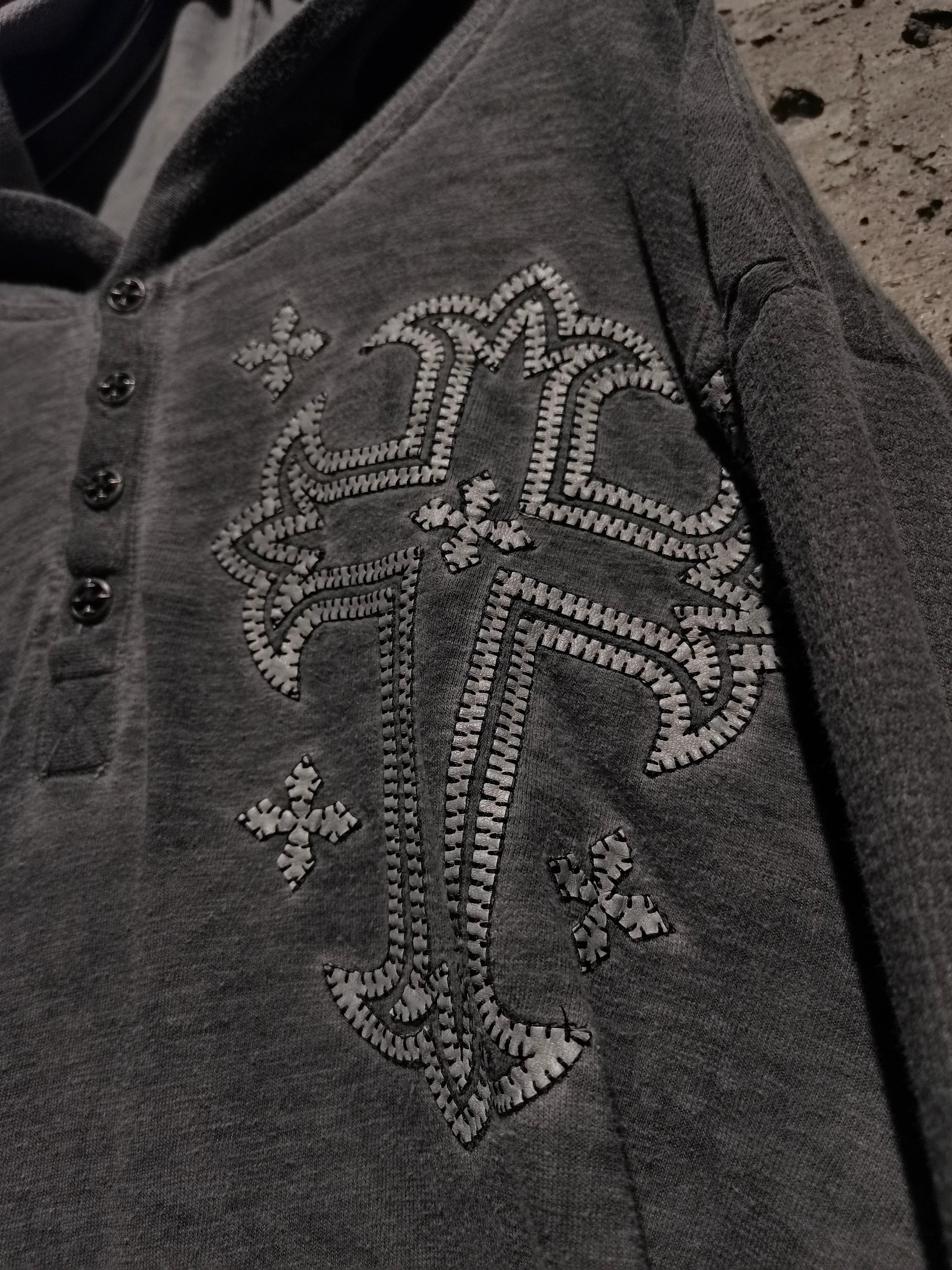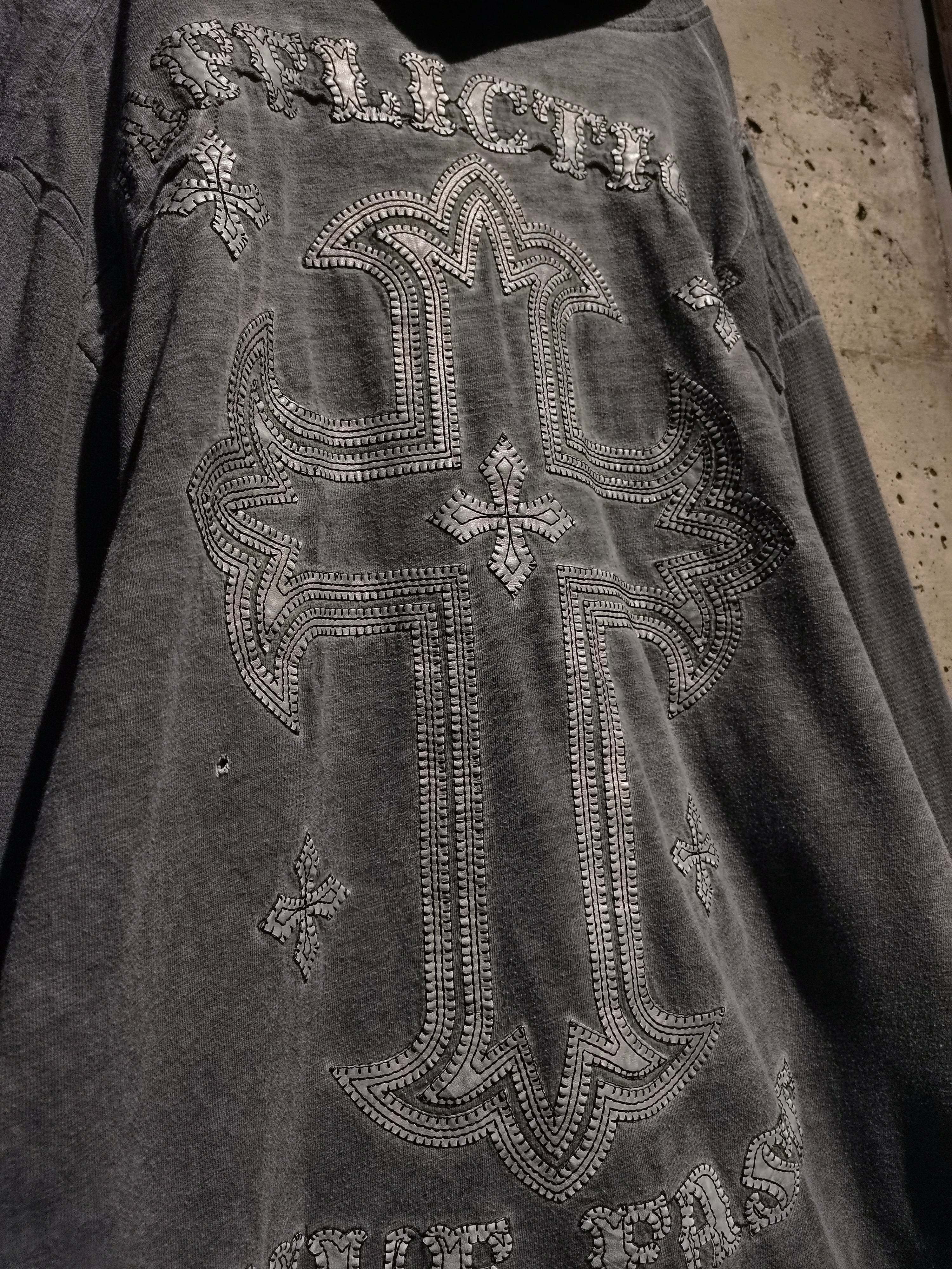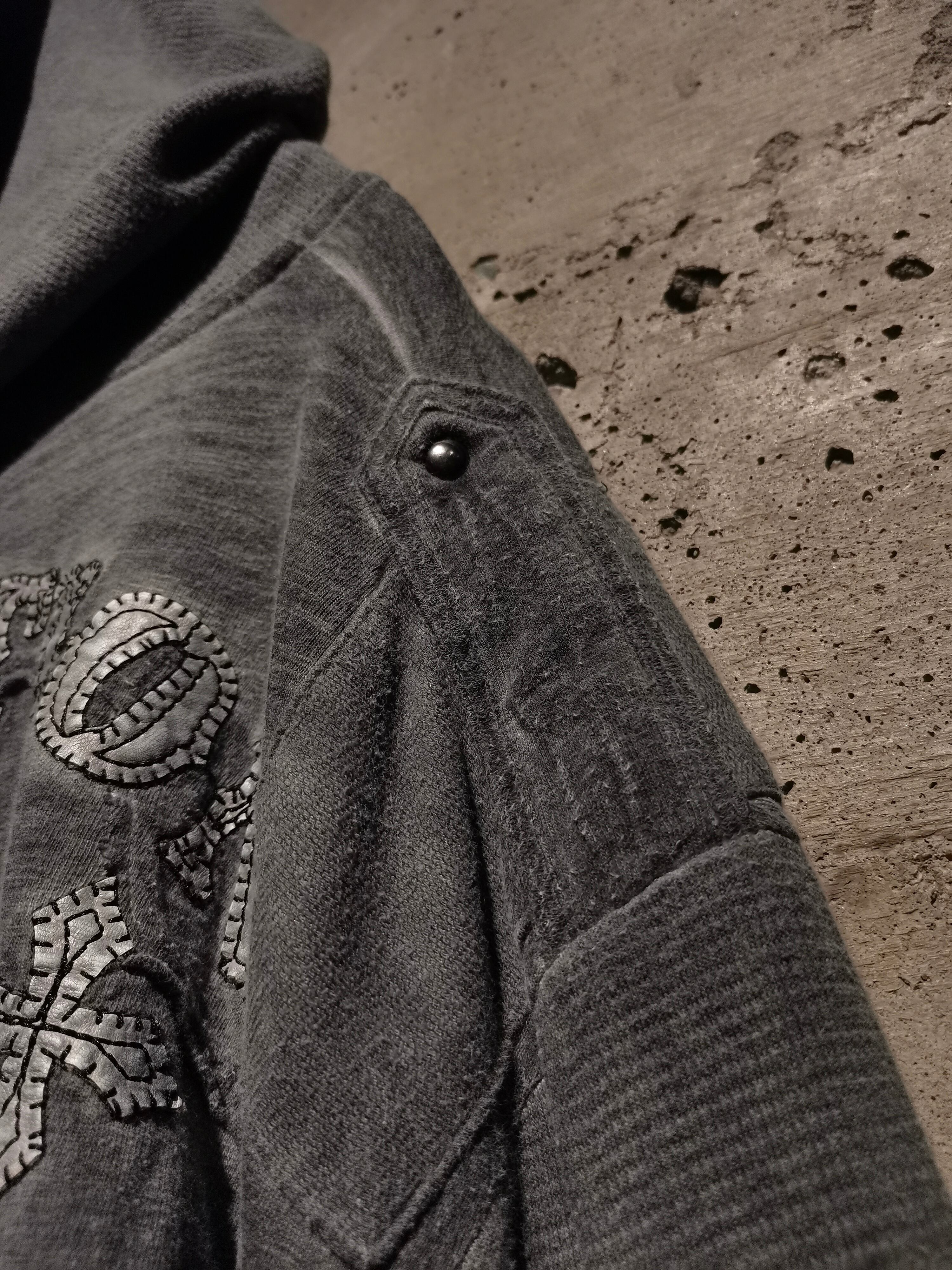 ライトな質感に仕上げられたフェード感の効いたグレーカラーのボディに、クロスモチーフのパッチを載せた1着。
