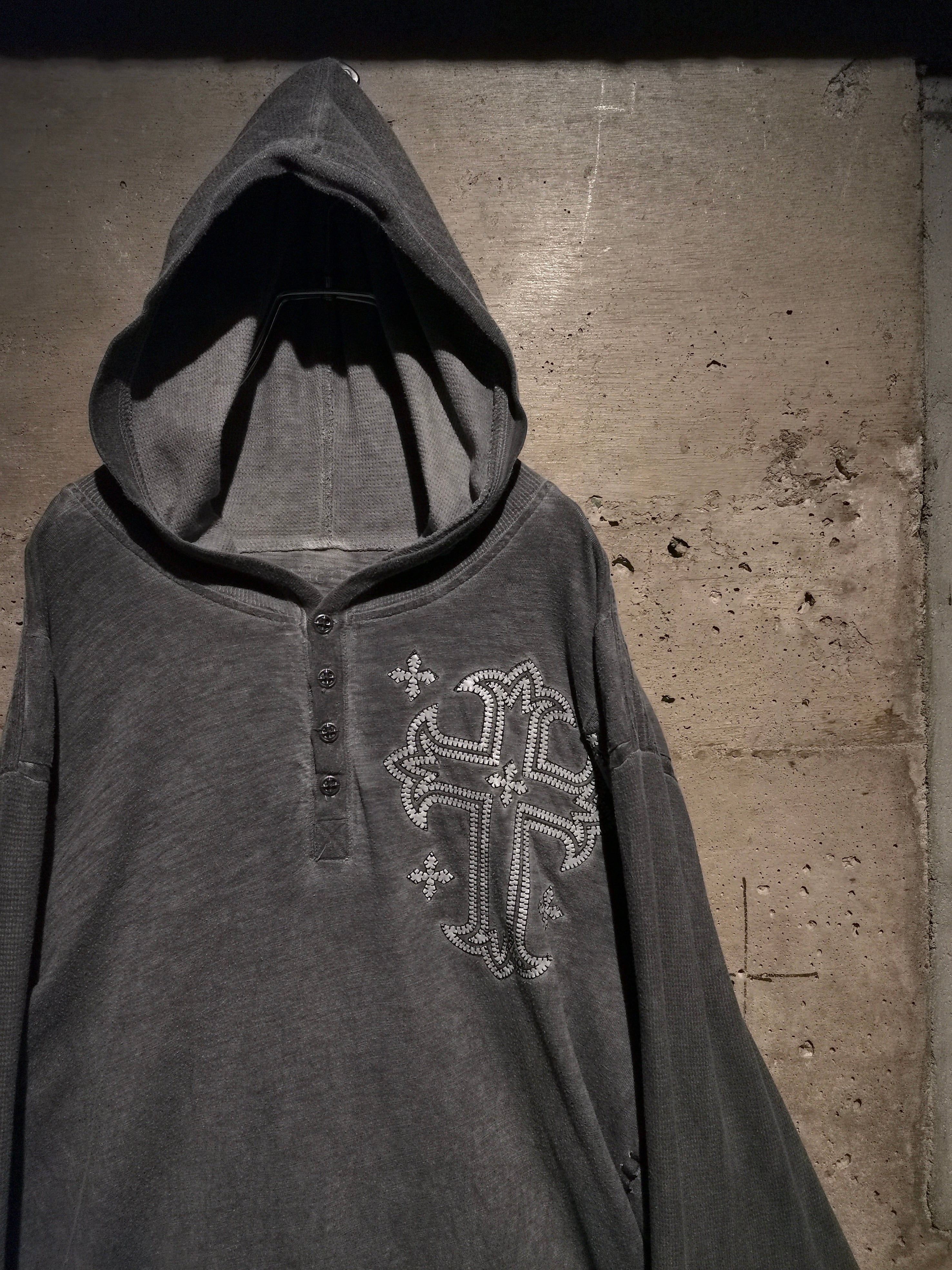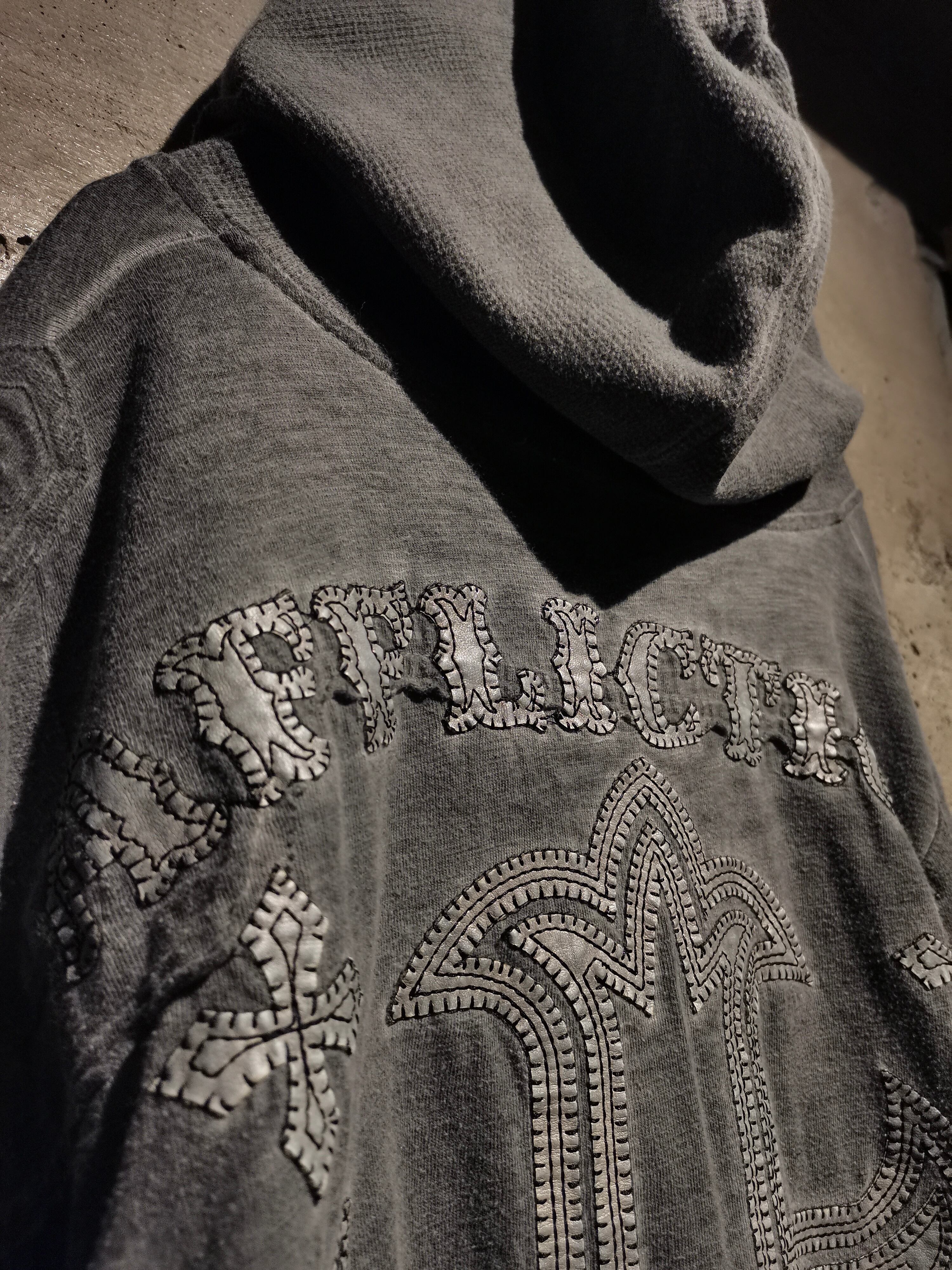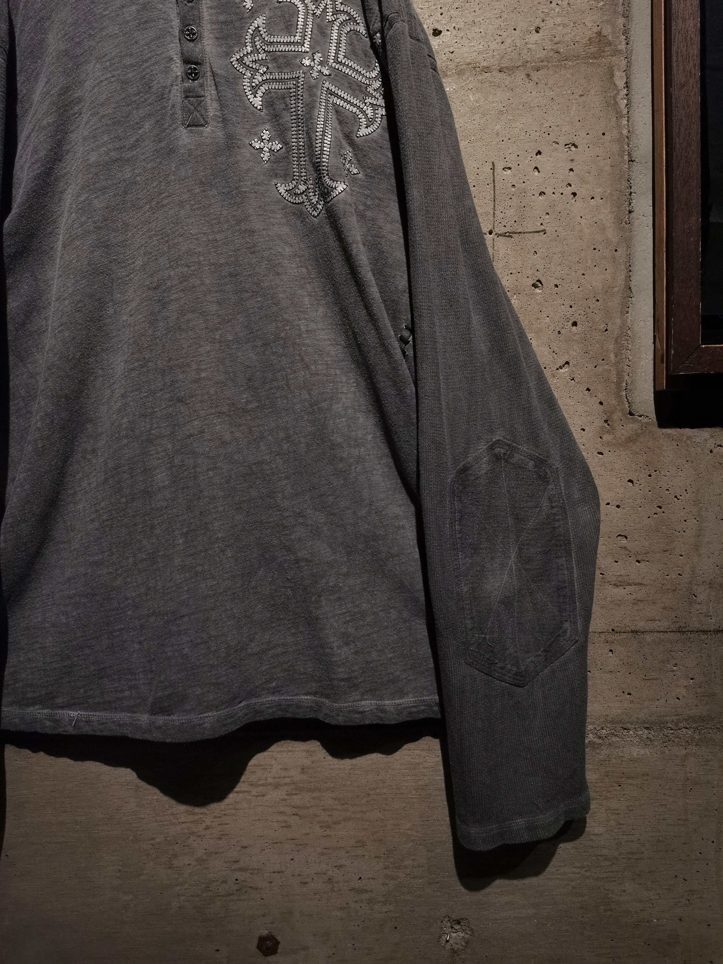 ライトな質感に仕上げられたフェード感の効いたグレーカラーのボディに、クロスモチーフのパッチを載せた1着。