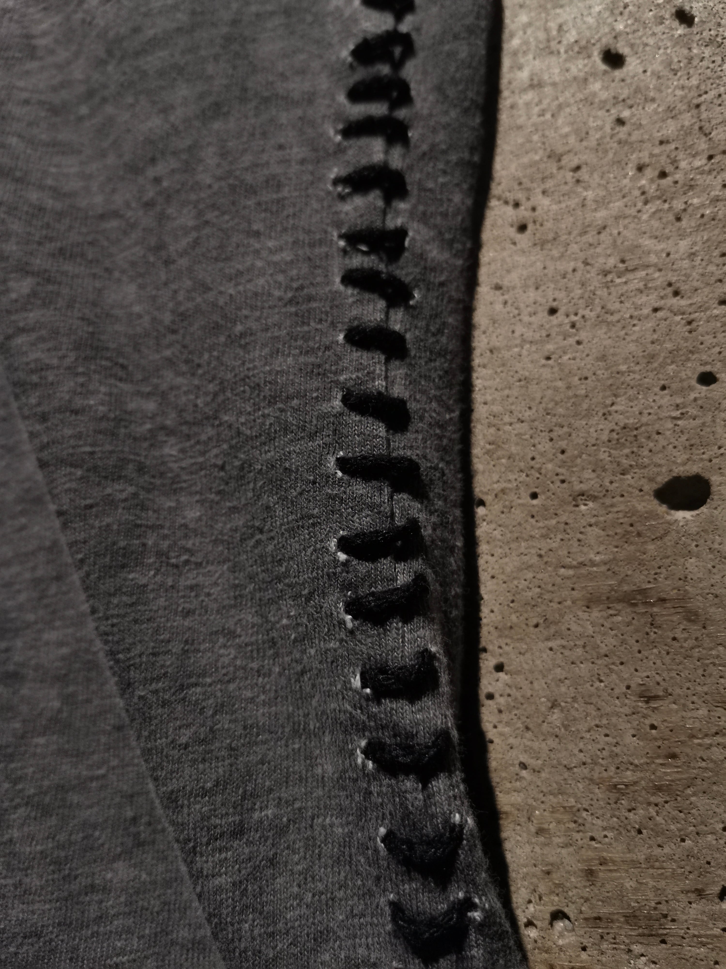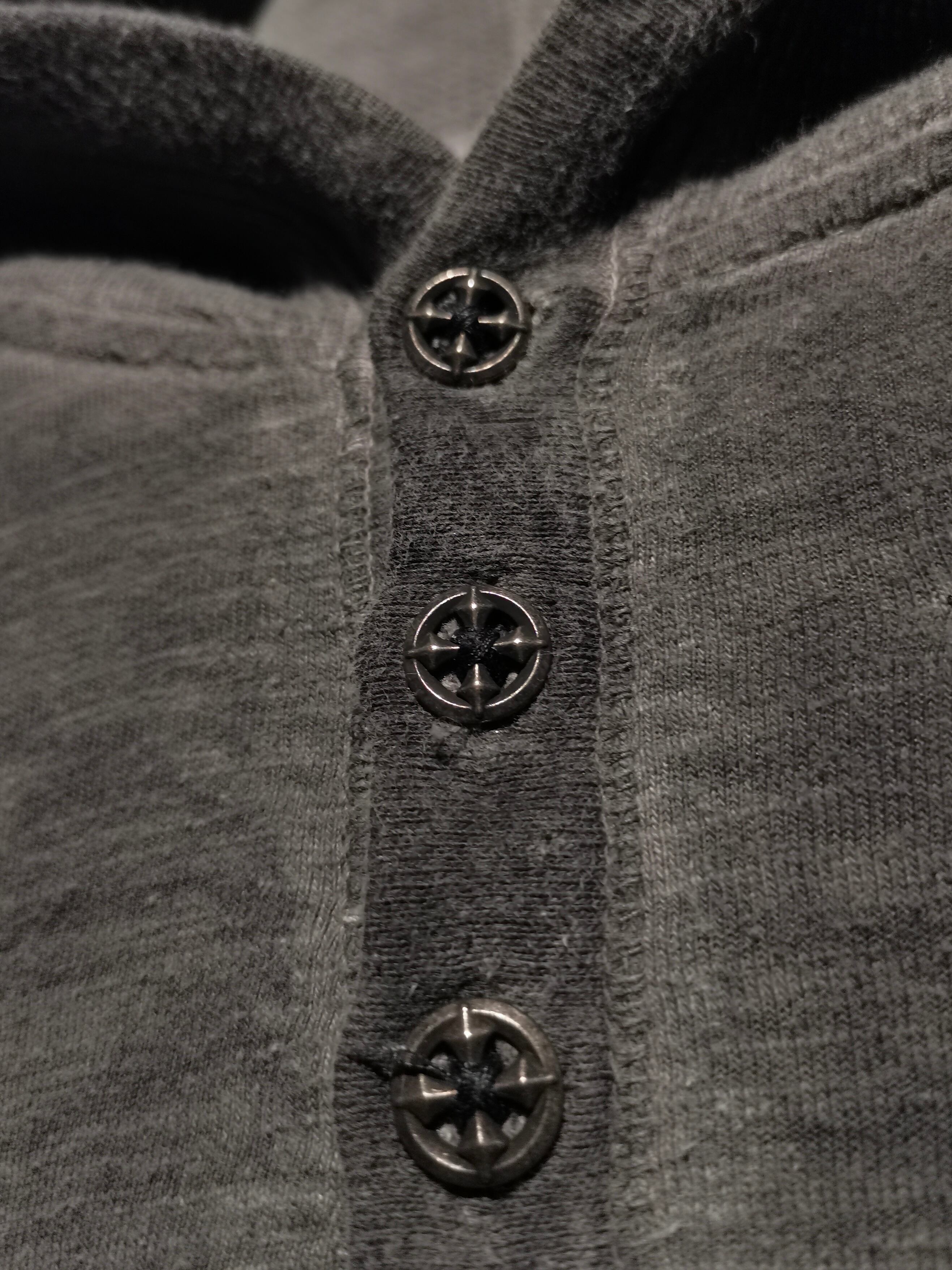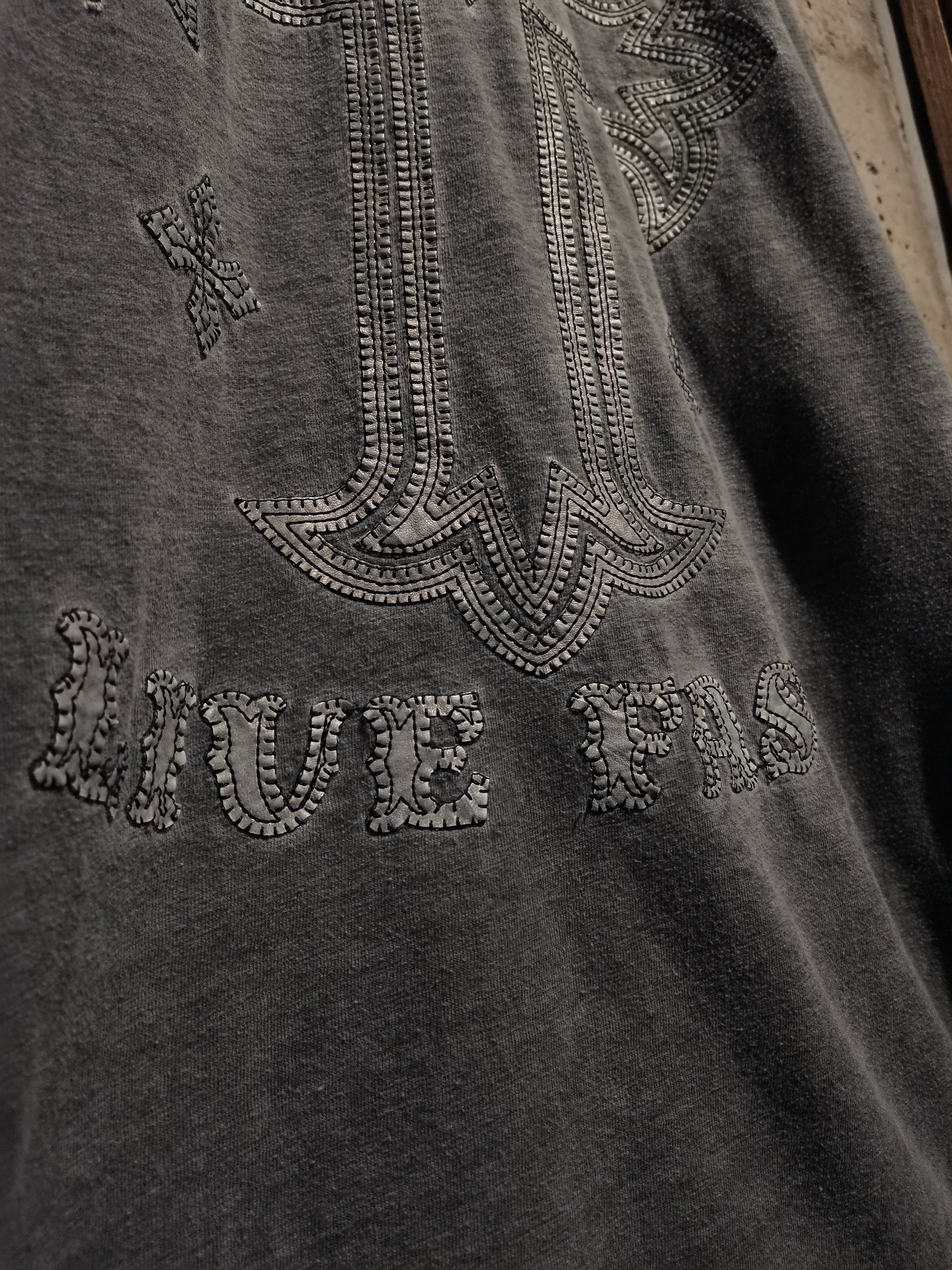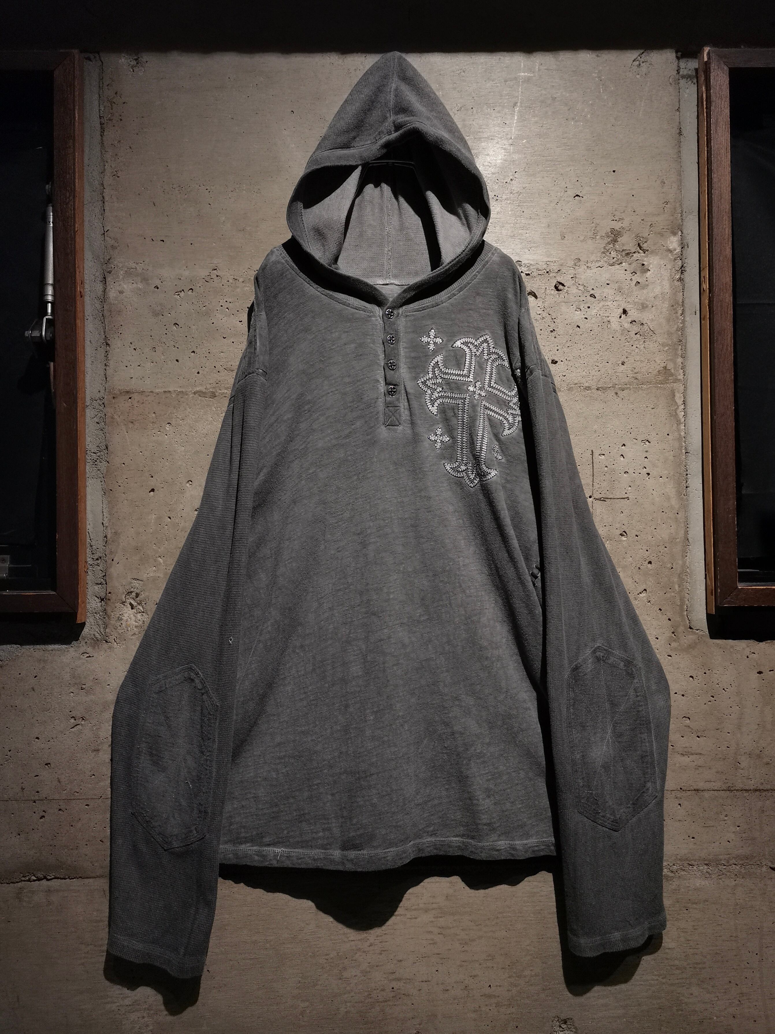ライトな質感に仕上げられたフェード感の効いたグレーカラーのボディに、クロスモチーフのパッチを載せた1着。