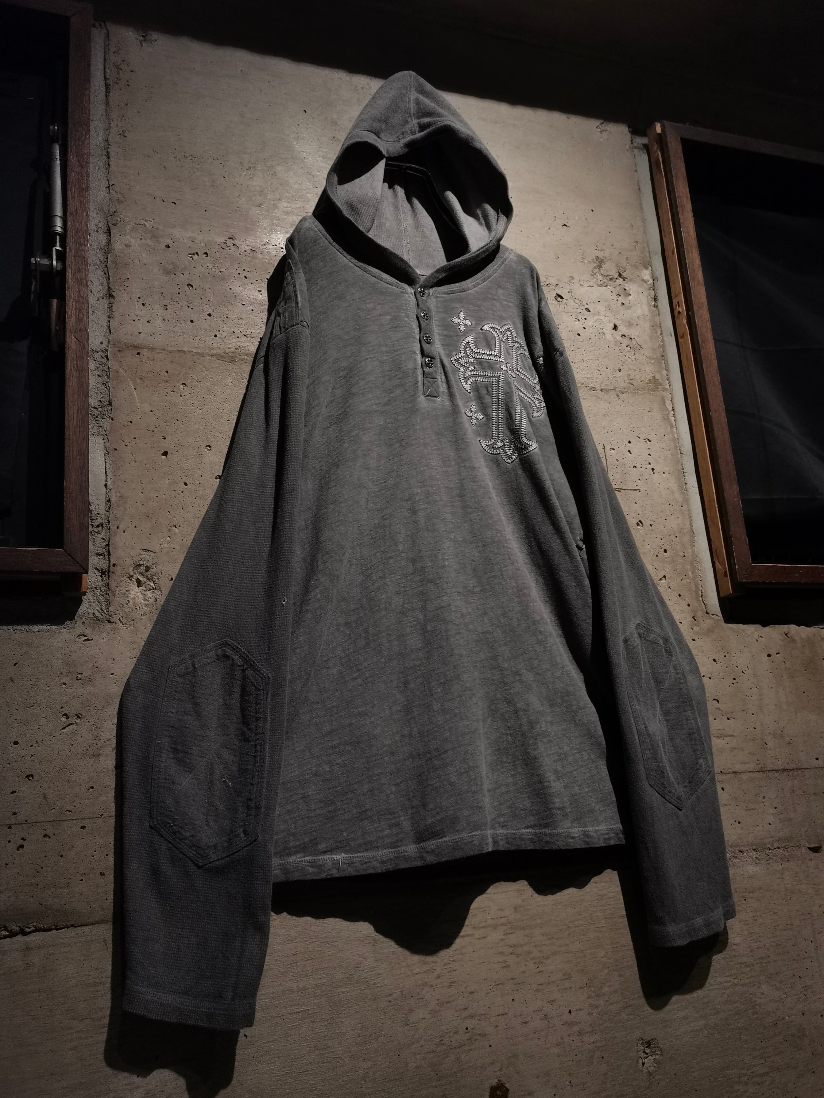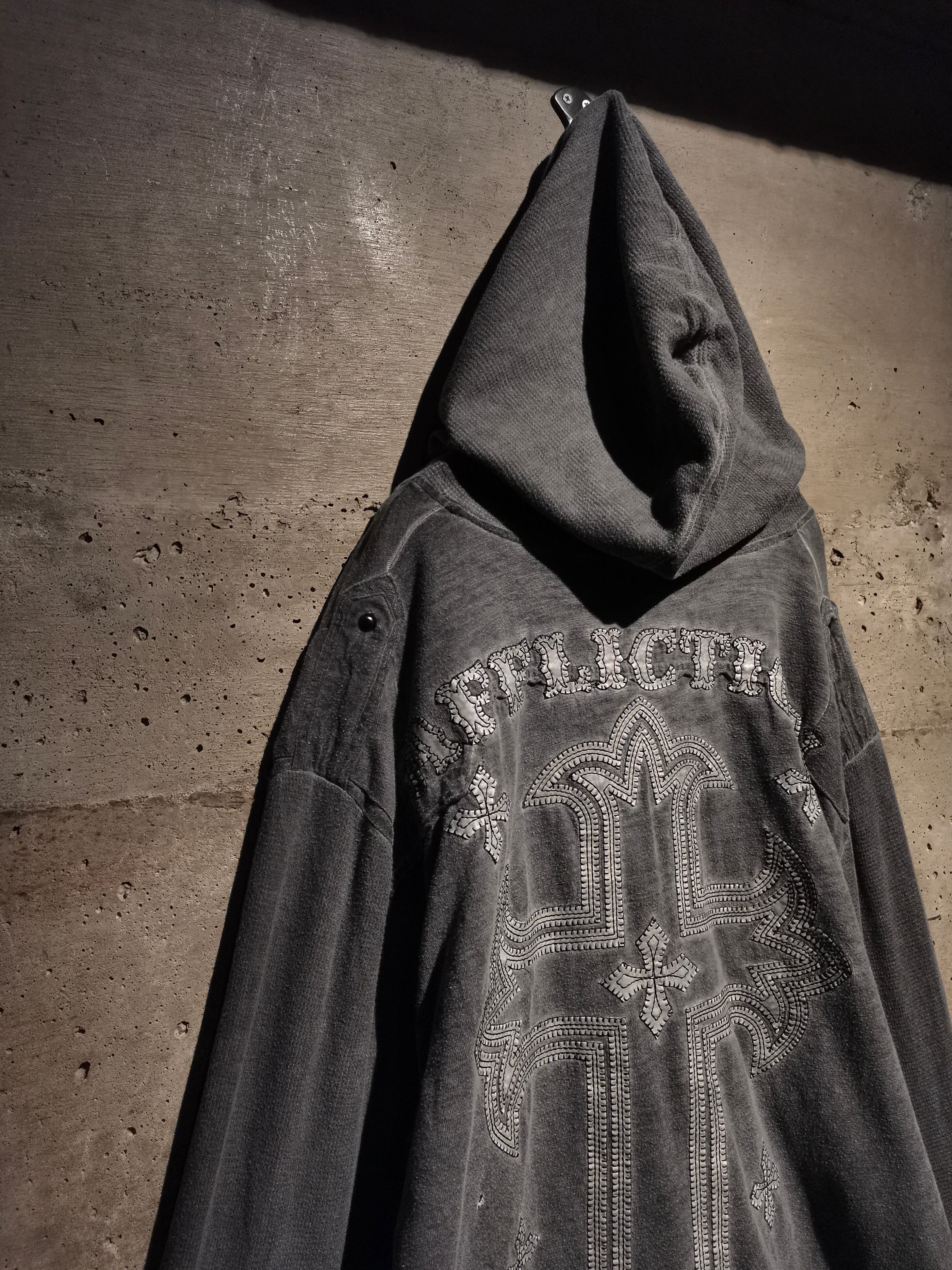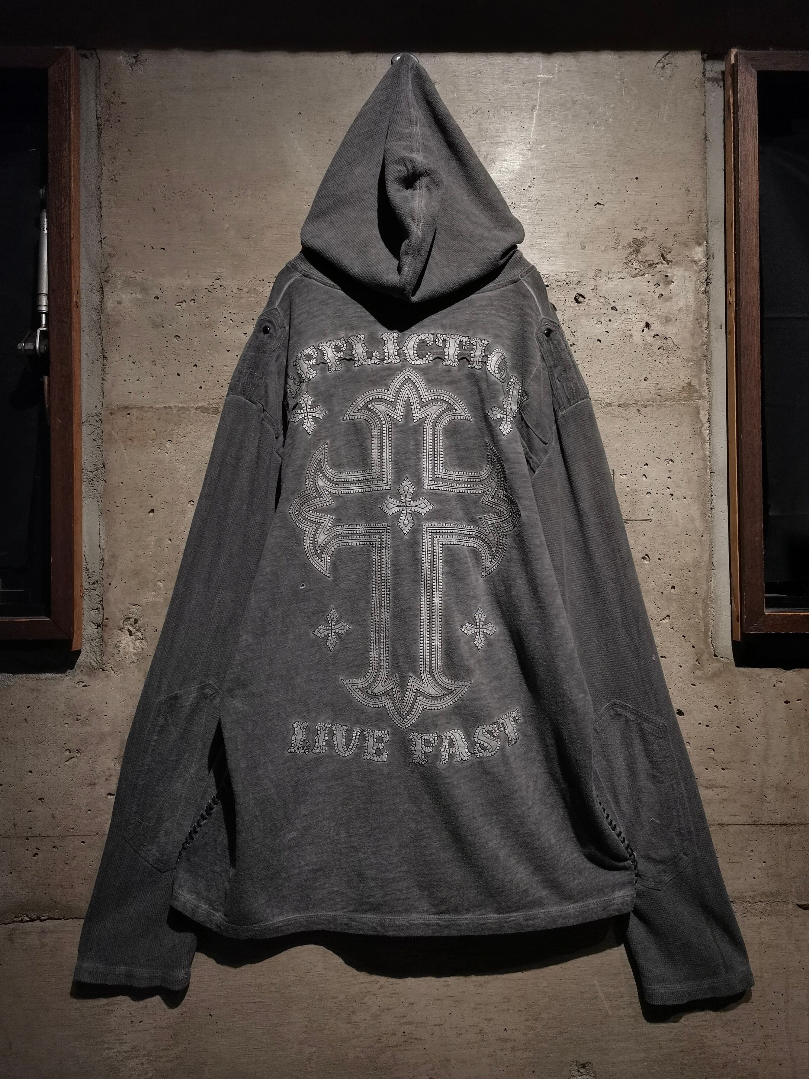 多くのアーティストやアスリートたちを魅了し、ジョシュ・バーネット、チャック・リデル、オジー・オズボーンなどとのコラボレーション実績もあるアメリカンカジュアルブランド"Affliction"より、稀有なフード付きの長袖Tシャツをご紹介いたします。
