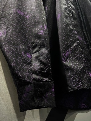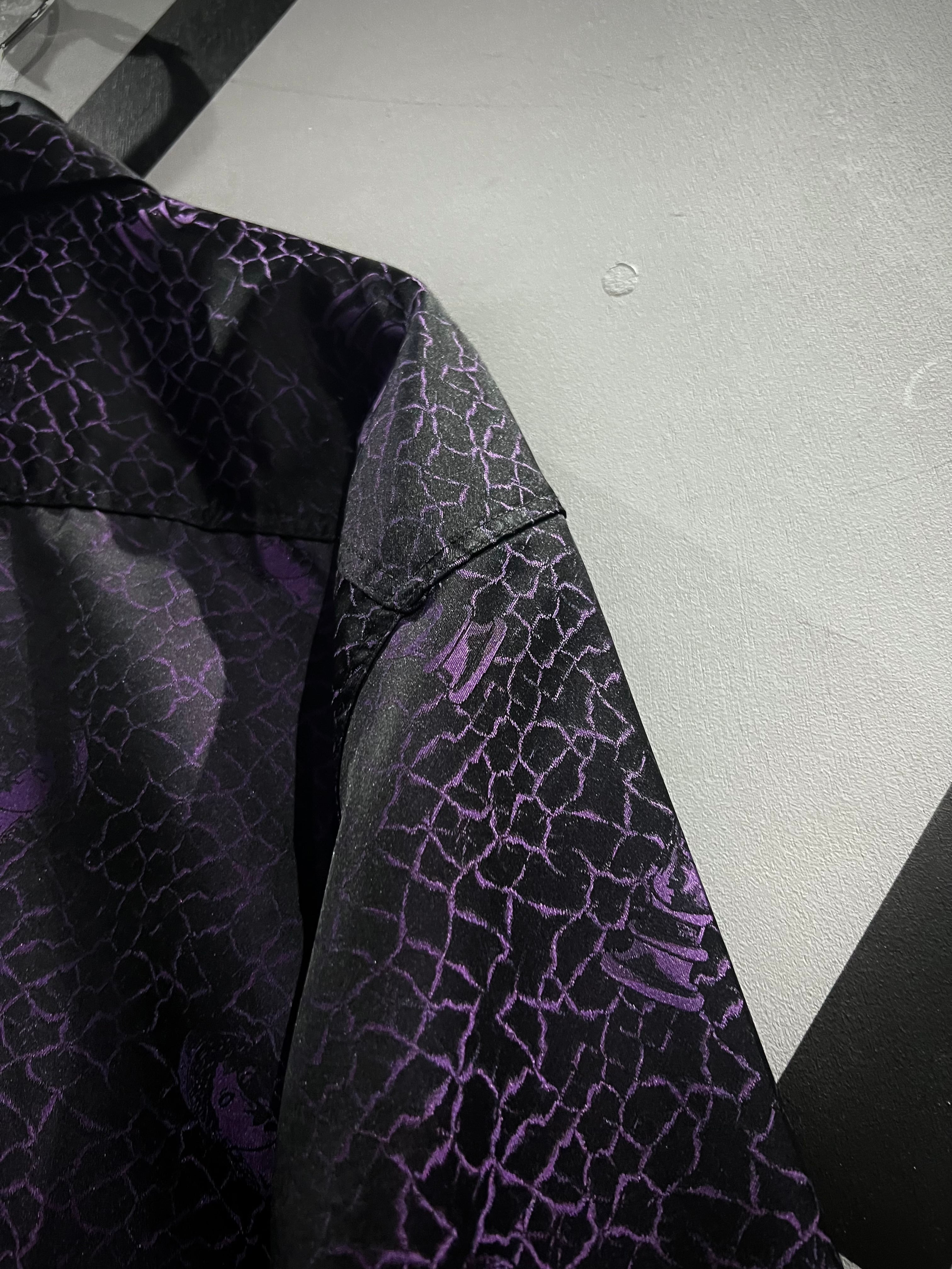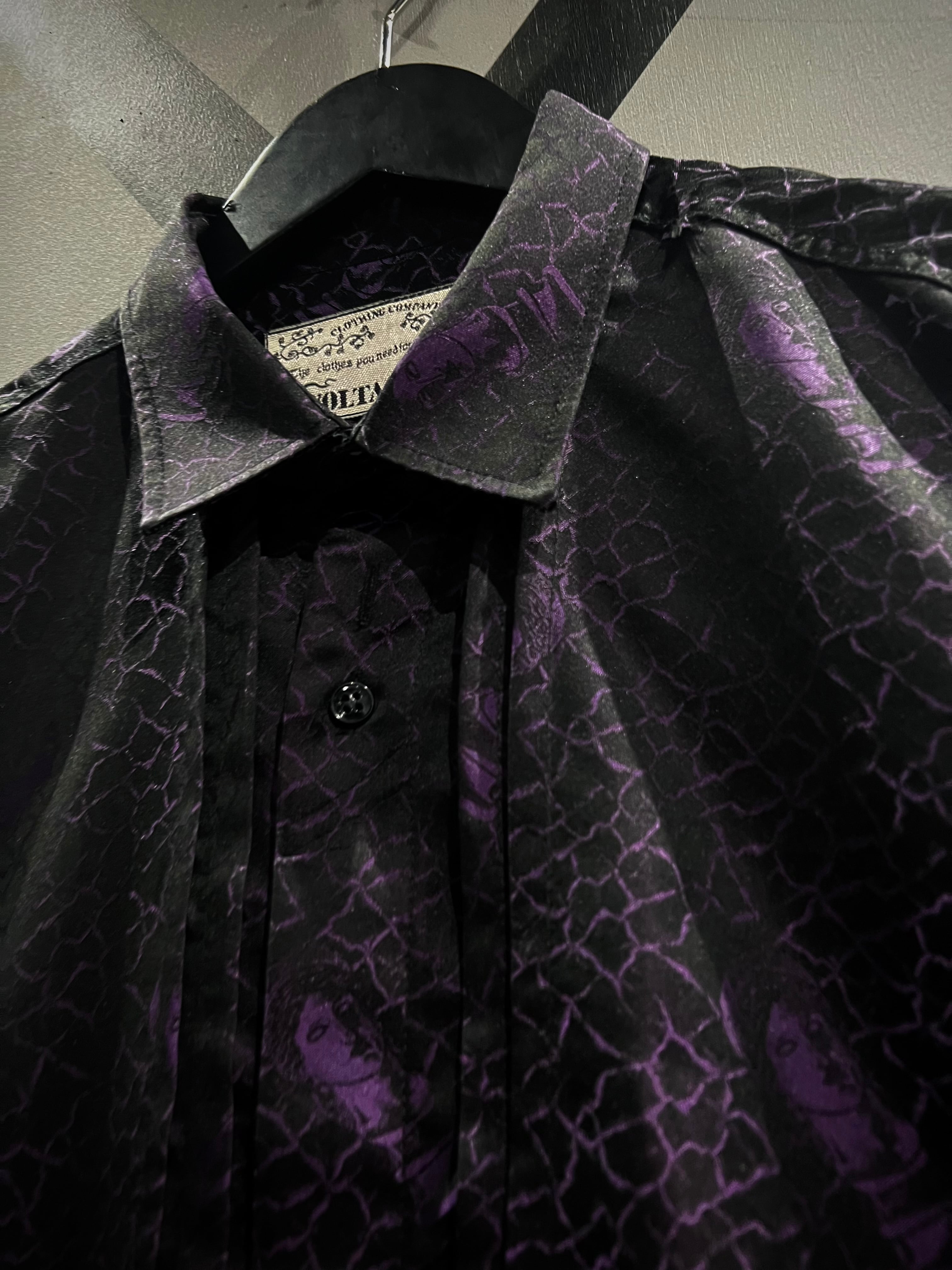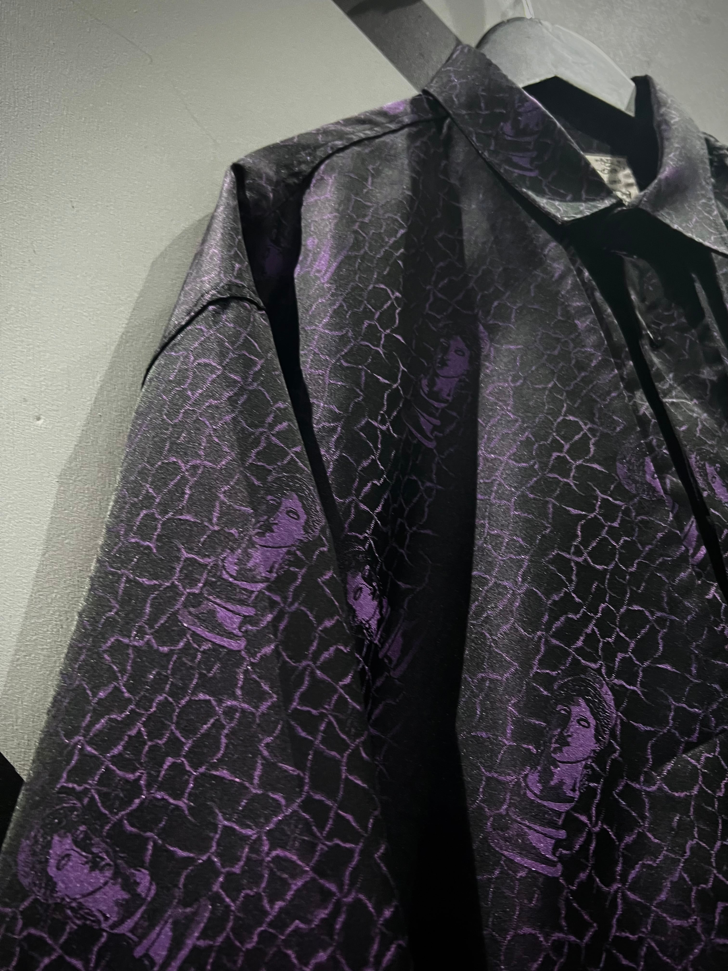 パープル×ブラックのカラーリングをベースに石像の顔を組み込んだ抽象的な総柄を載せた長袖シャツ。