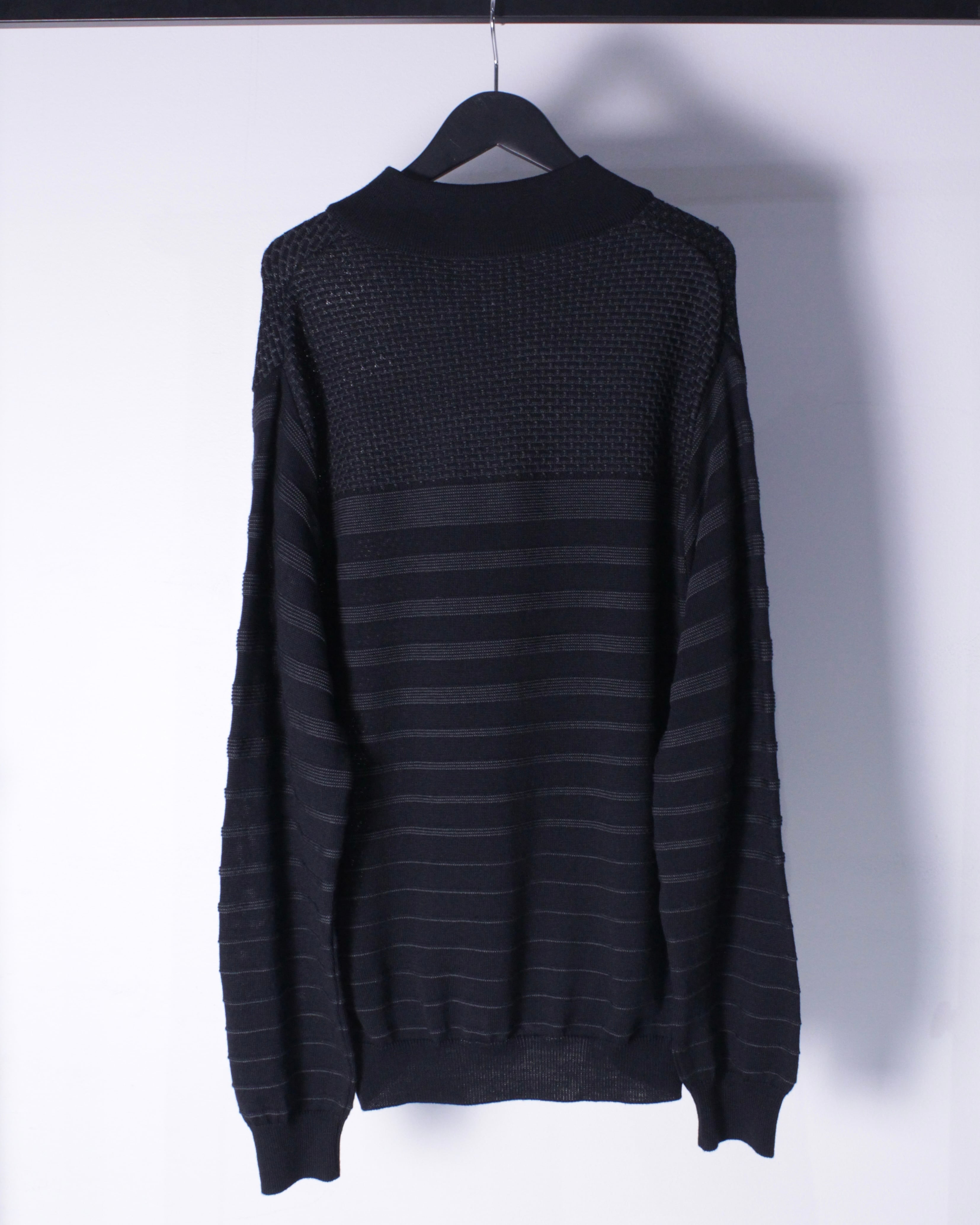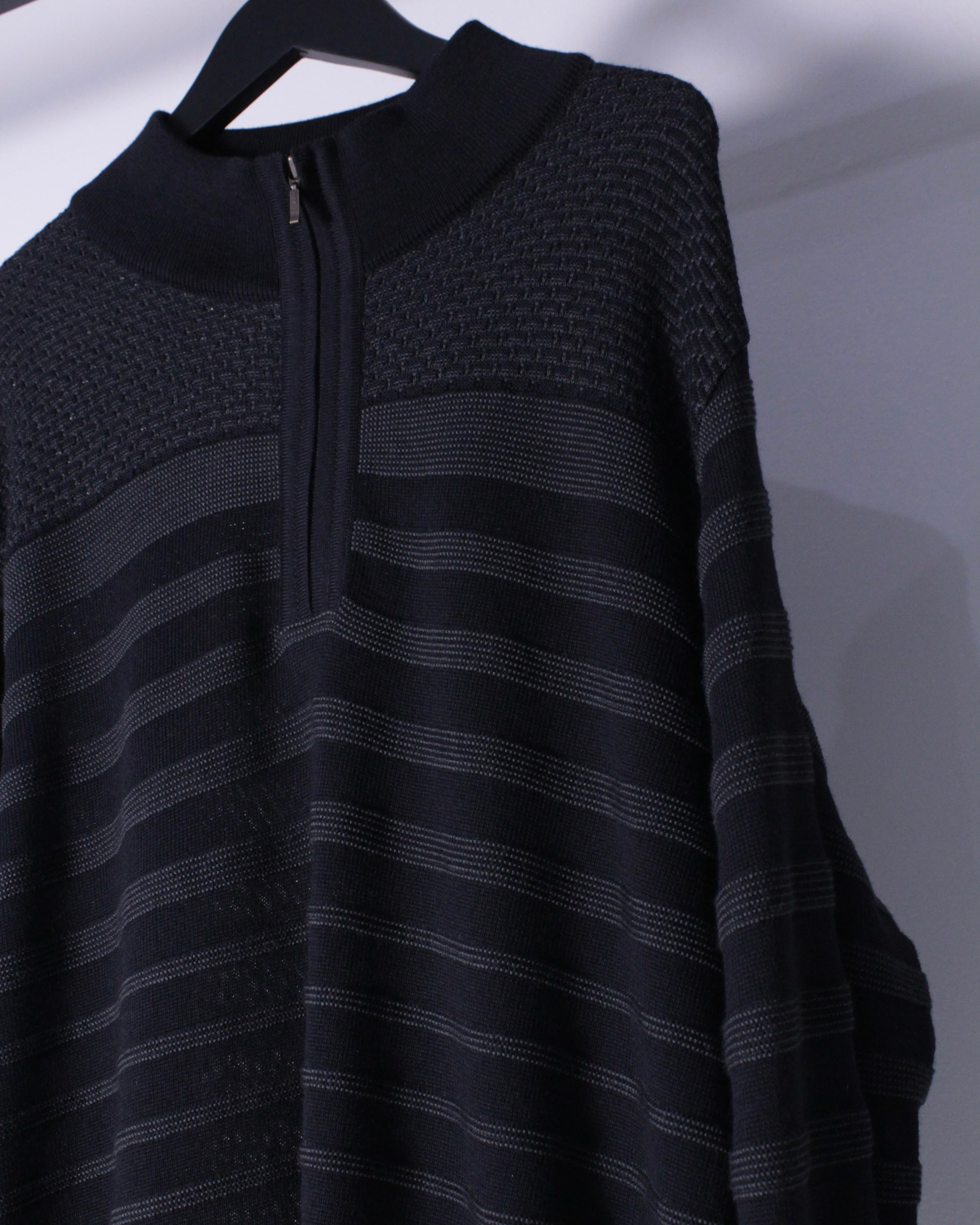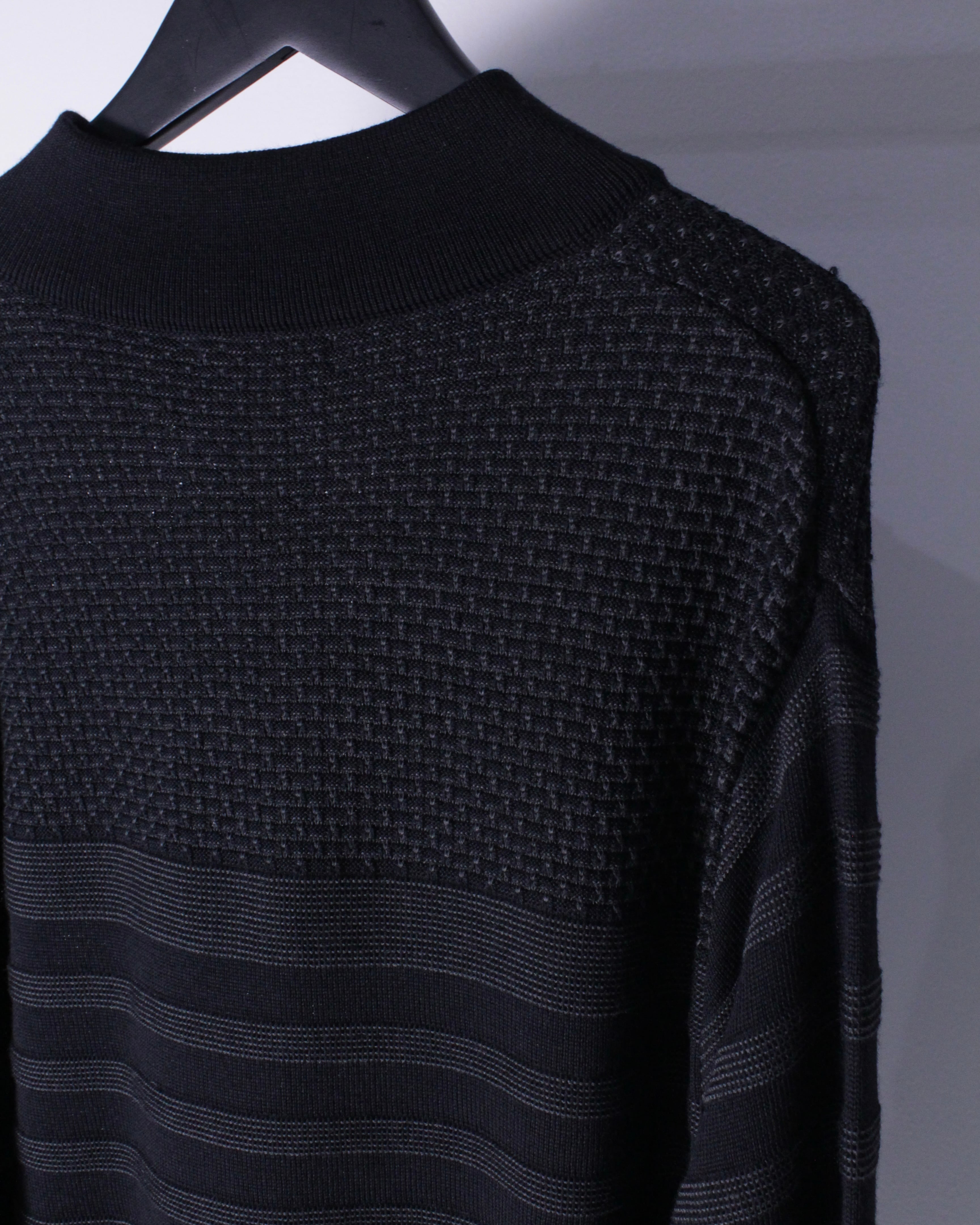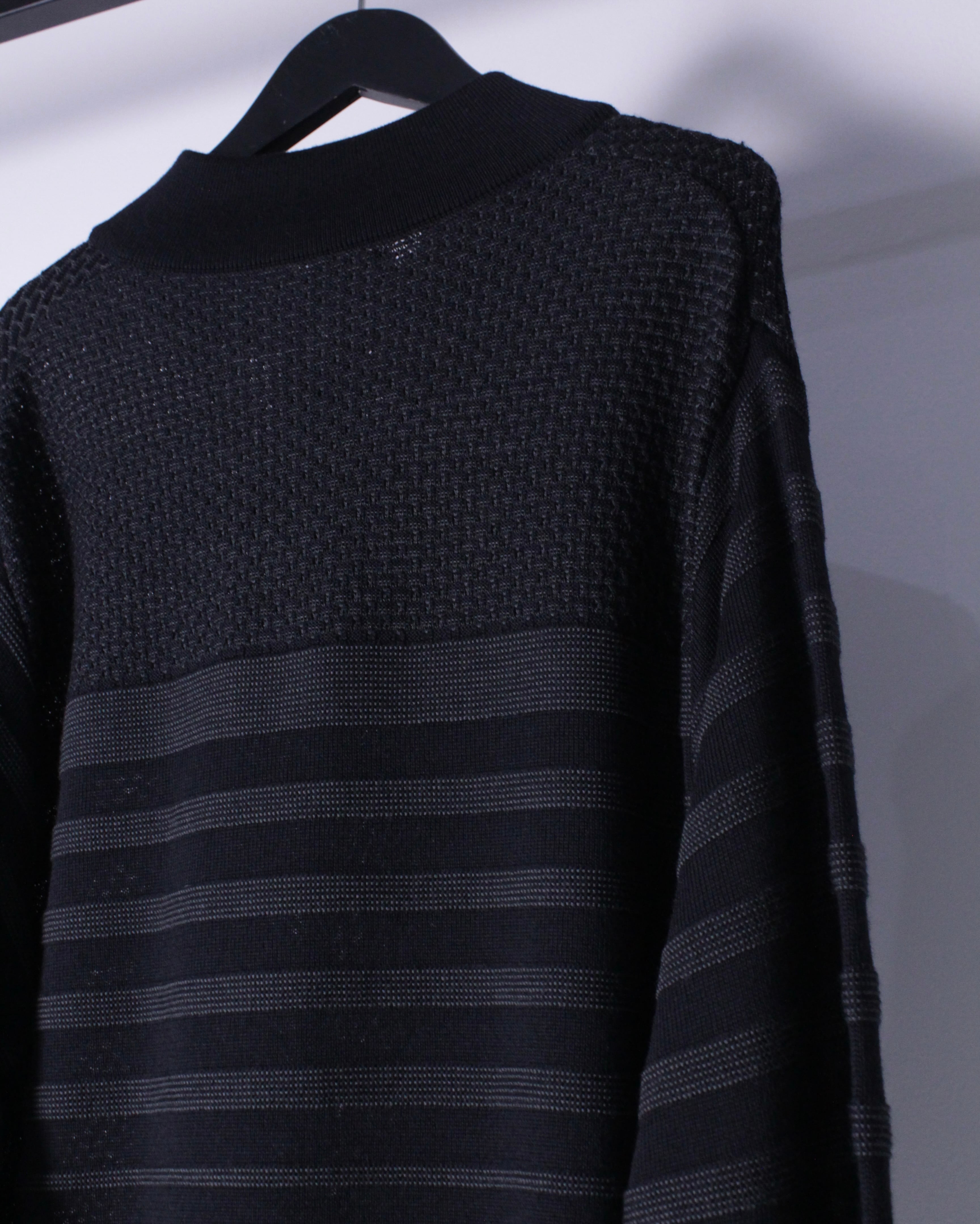 黒×グレーのカラーリングをベースに身頃、アームにボーダーを走らせ、肩周りに編みによって立体的なデザインを施した1着。