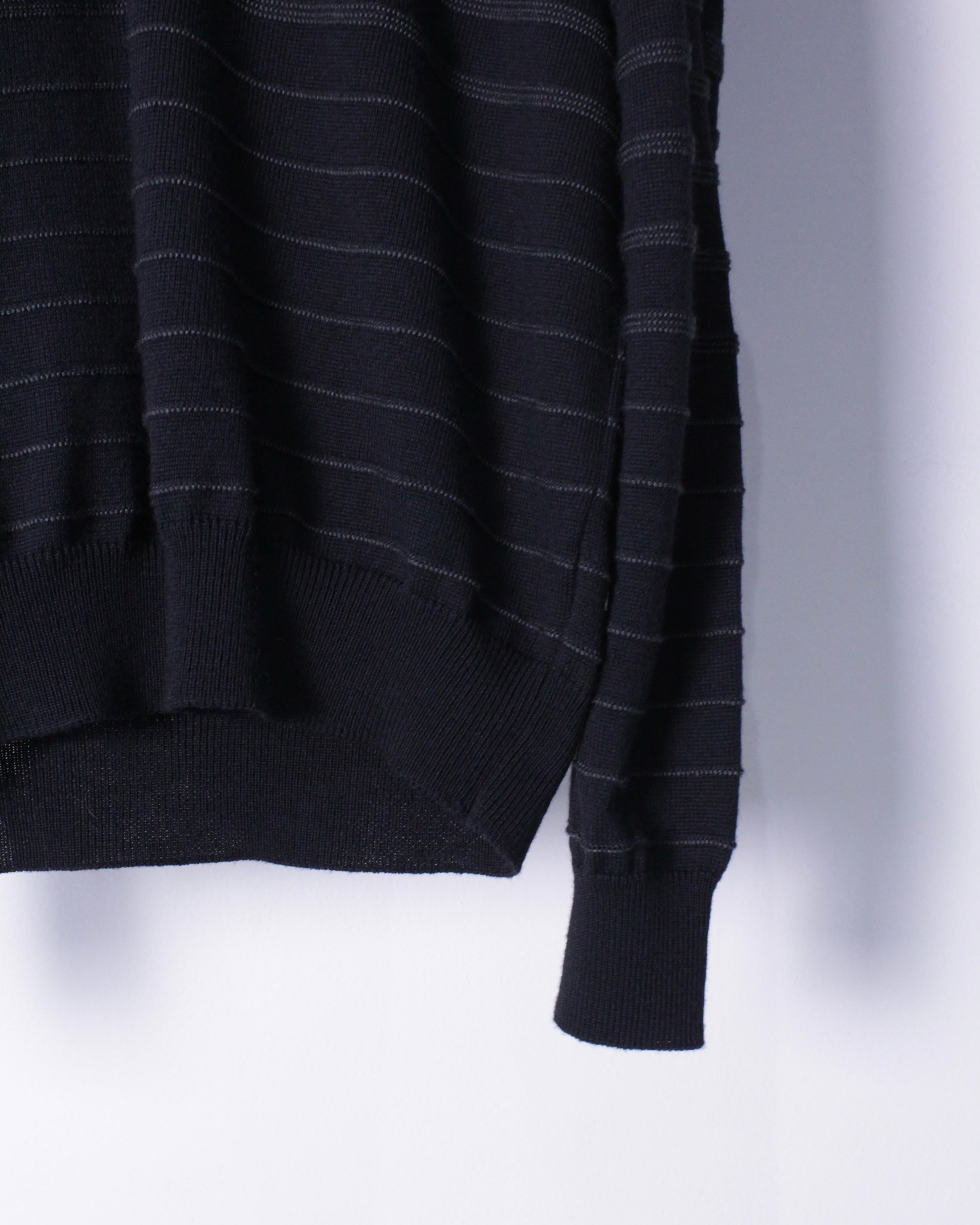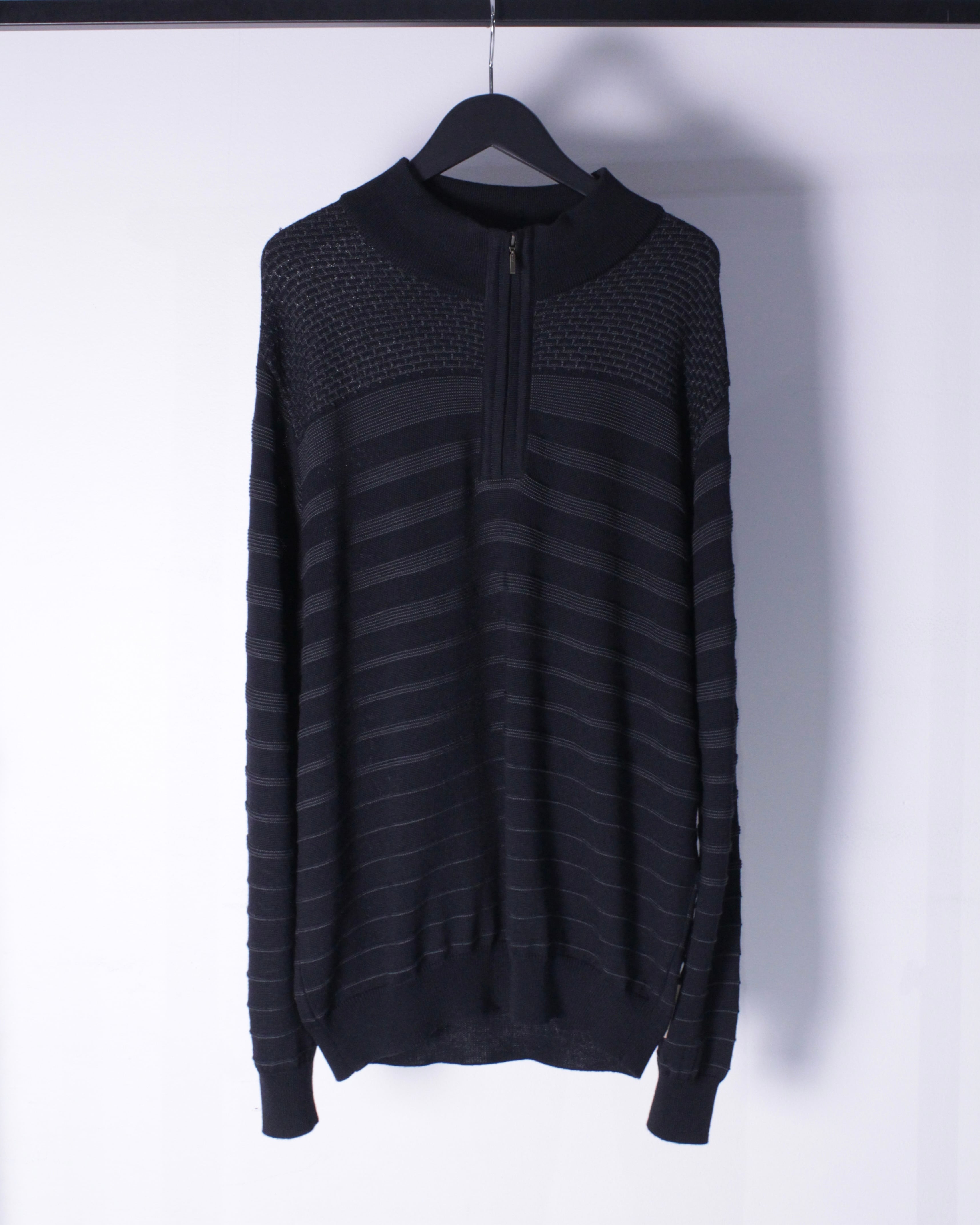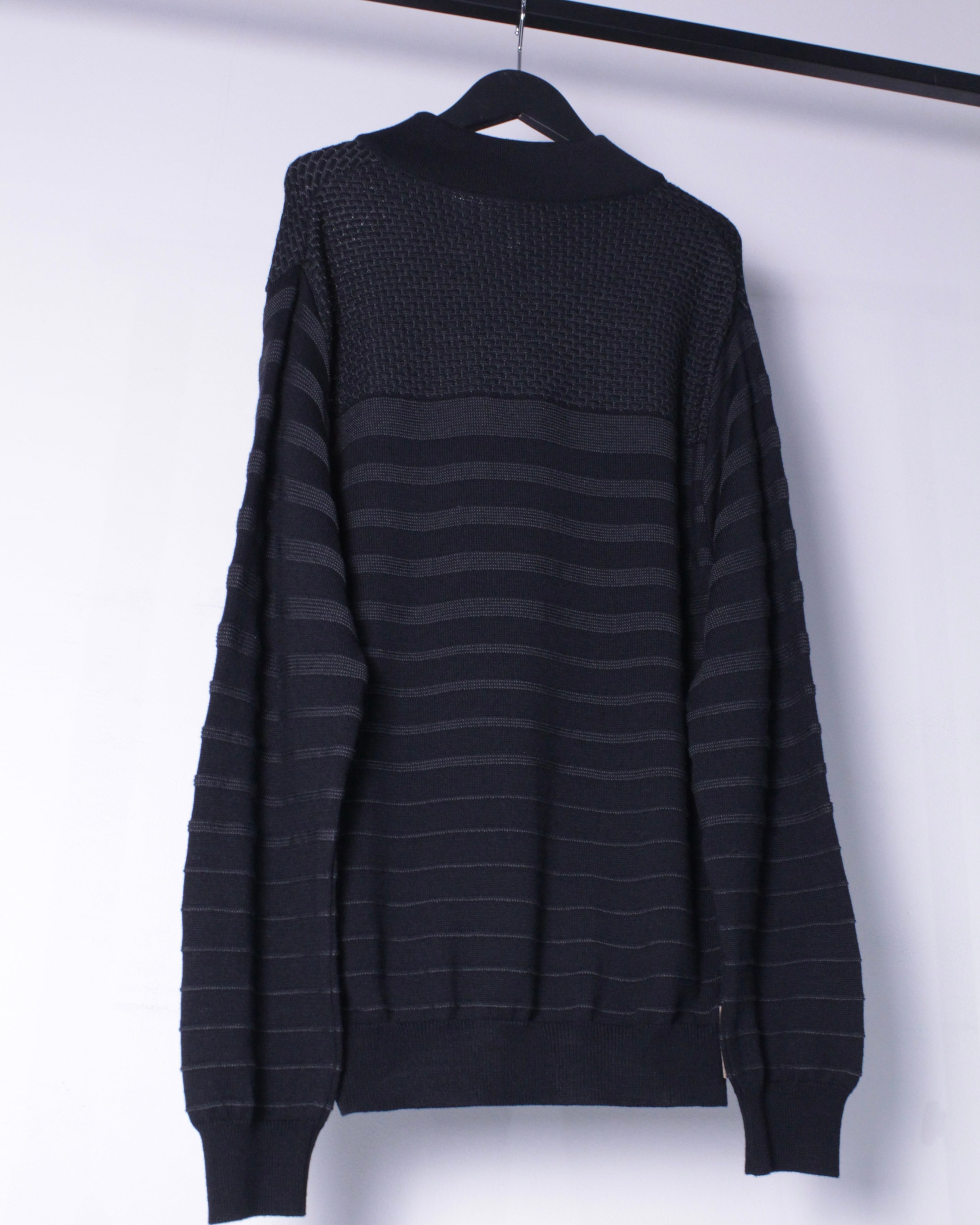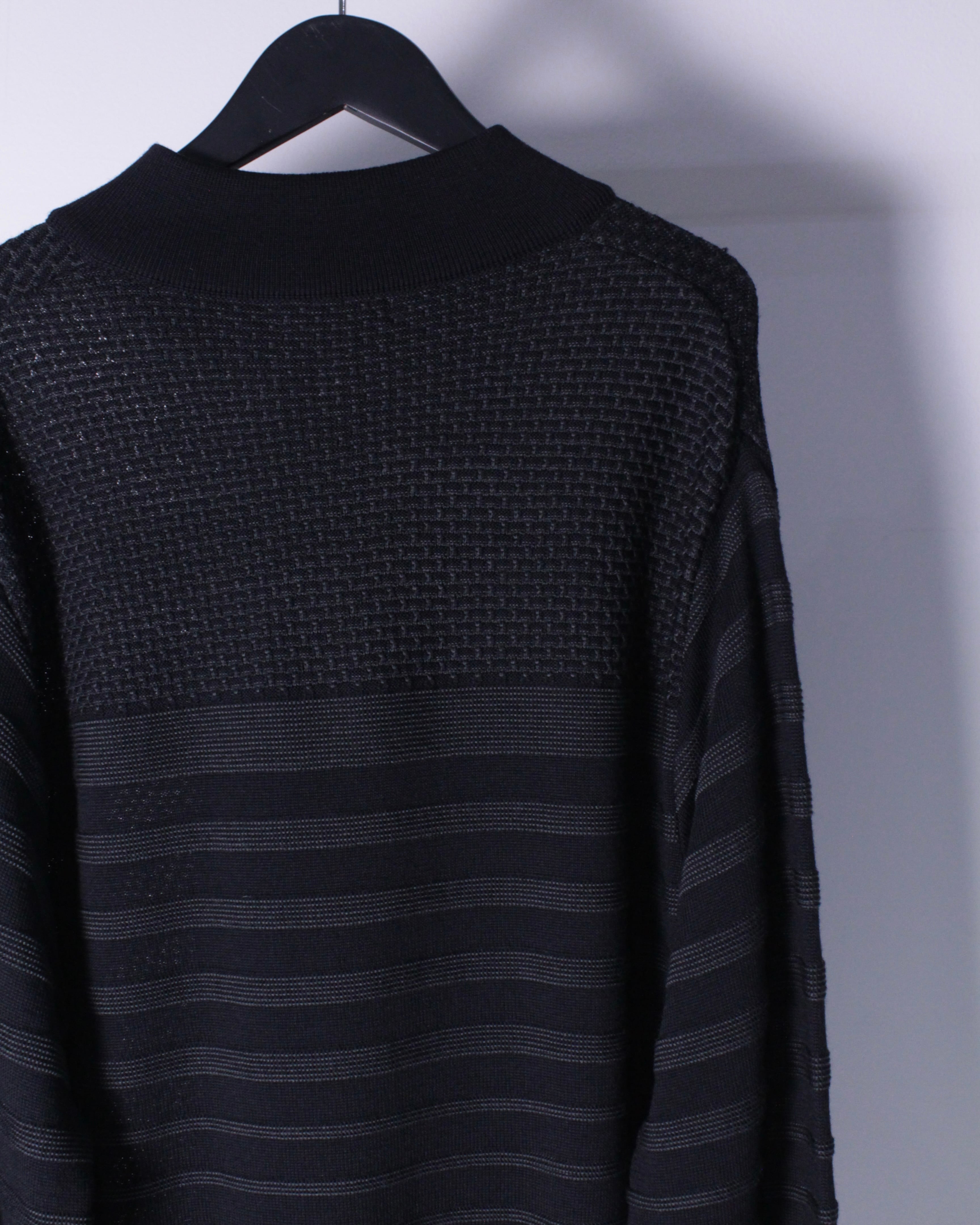 黒×グレーのカラーリングをベースに身頃、アームにボーダーを走らせ、肩周りに編みによって立体的なデザインを施した1着。