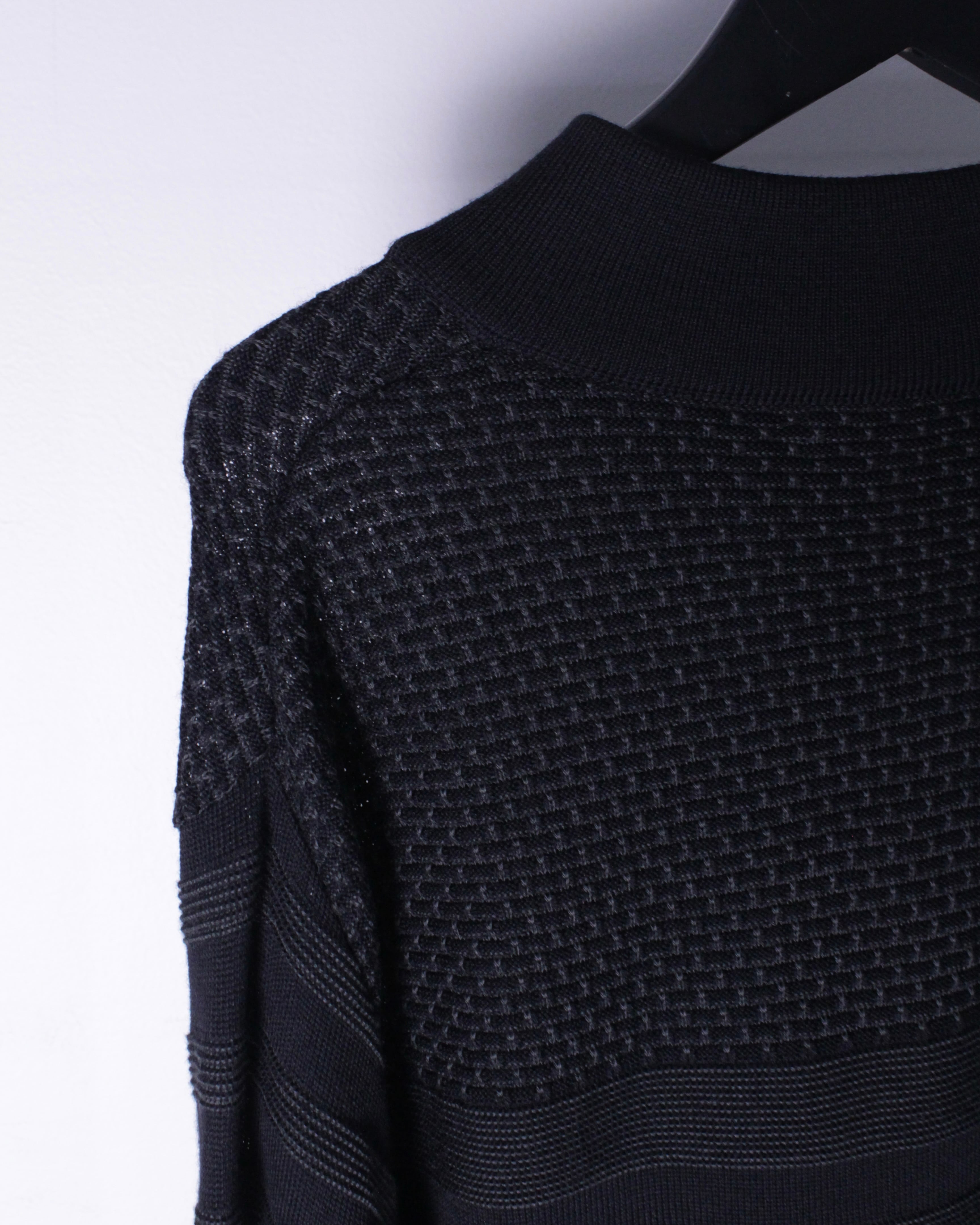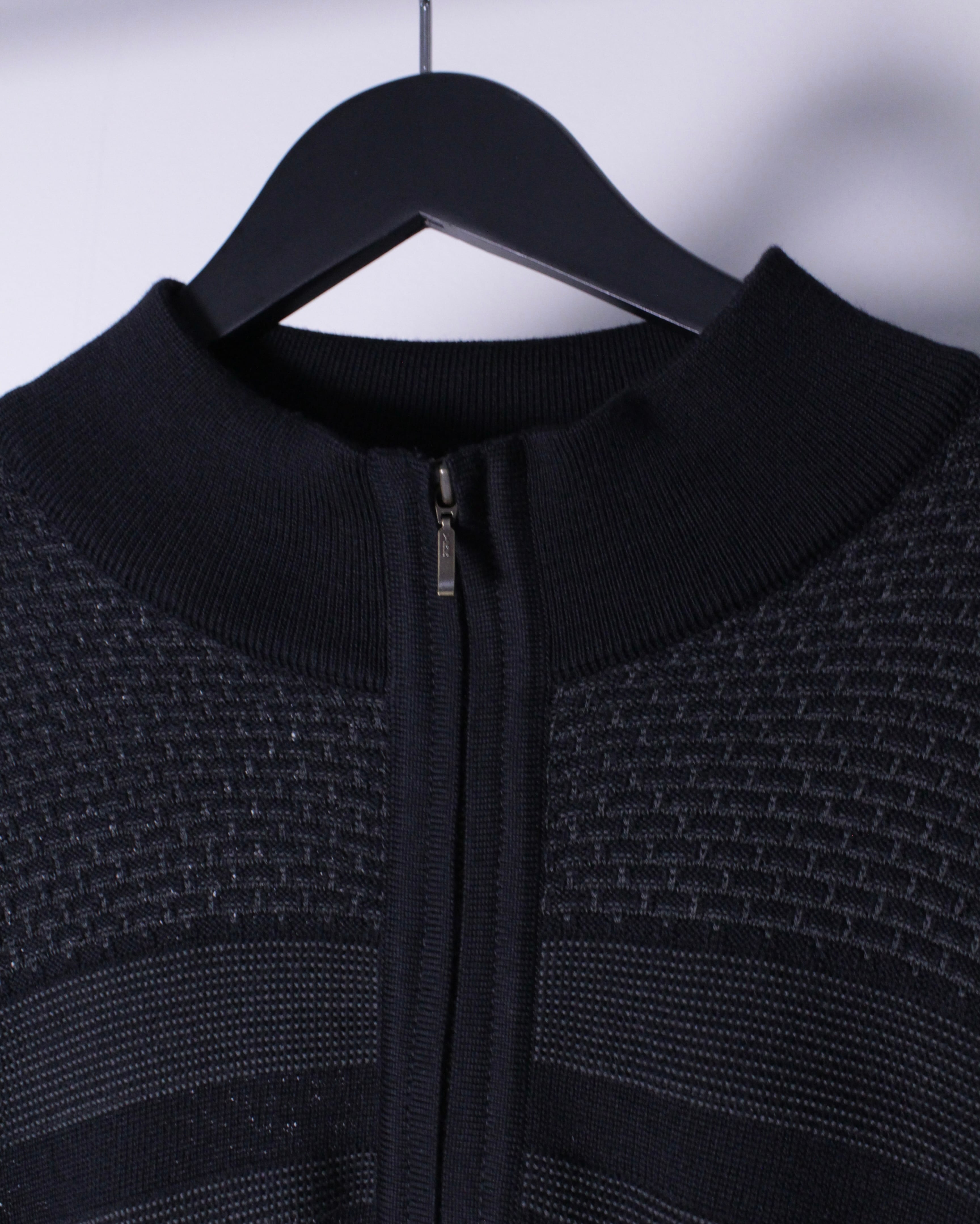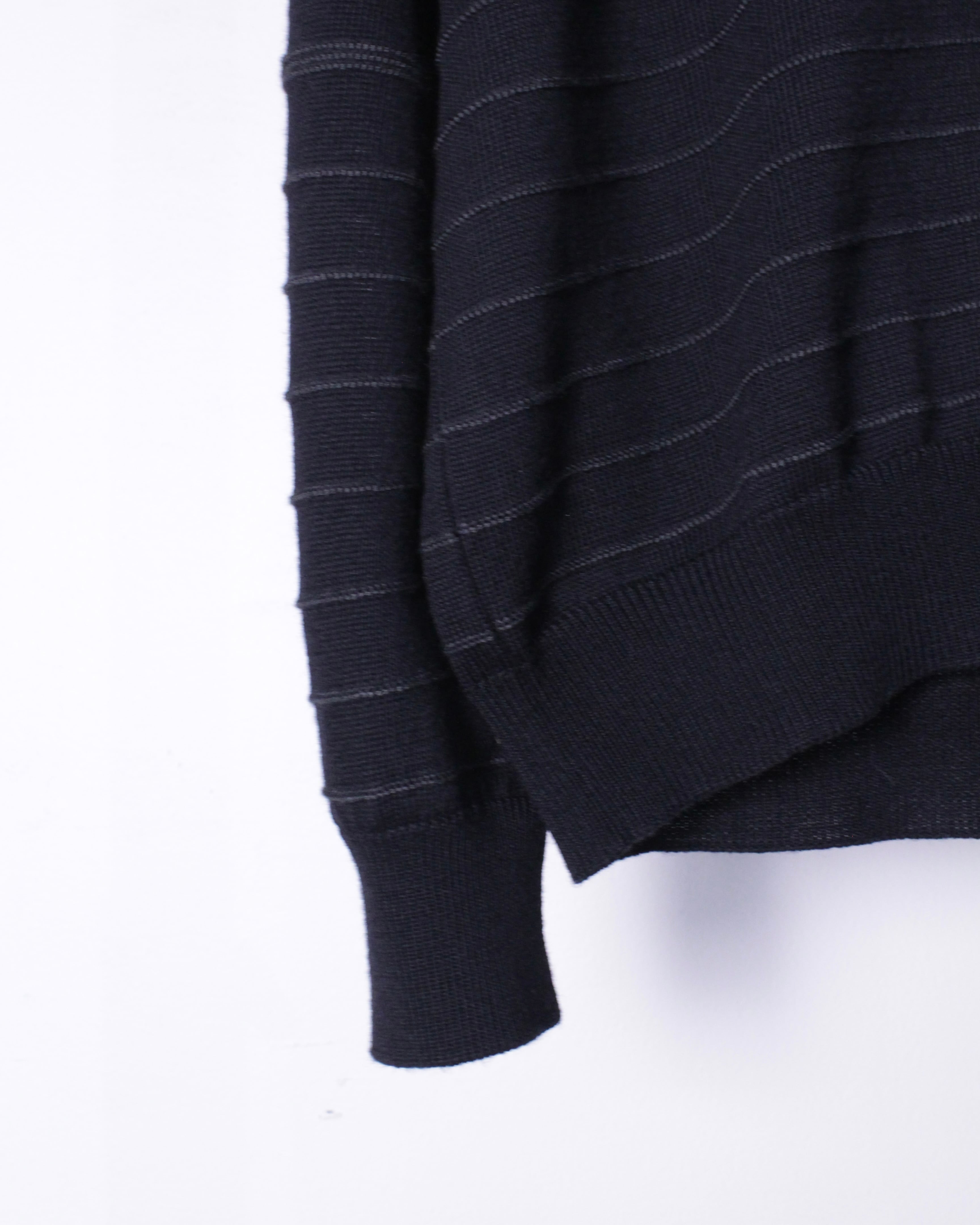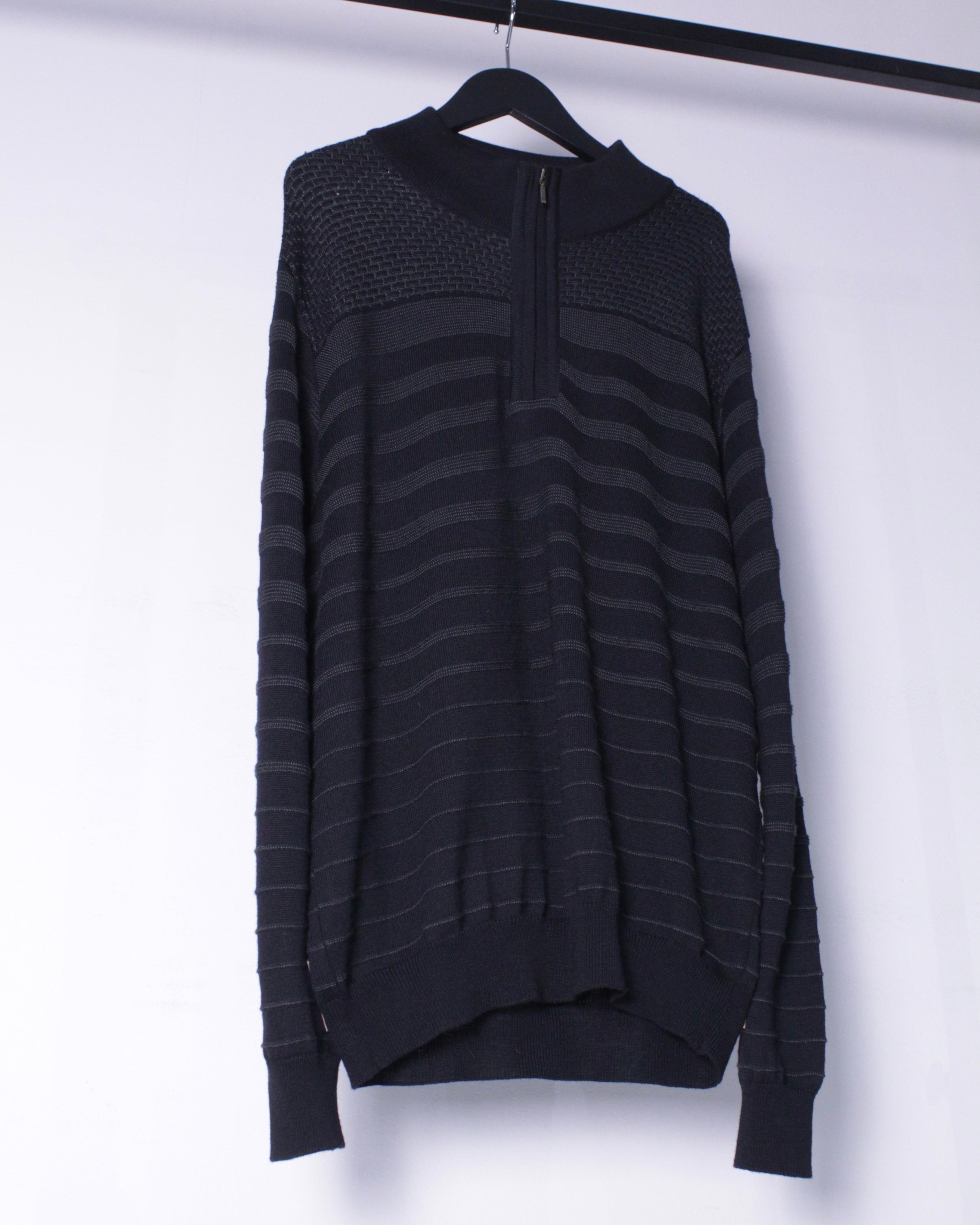 黒×グレーのカラーリングをベースに身頃、アームにボーダーを走らせ、肩周りに編みによって立体的なデザインを施した1着。