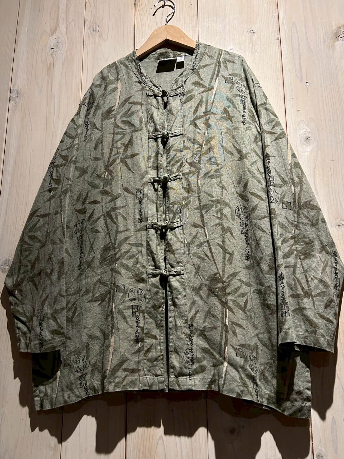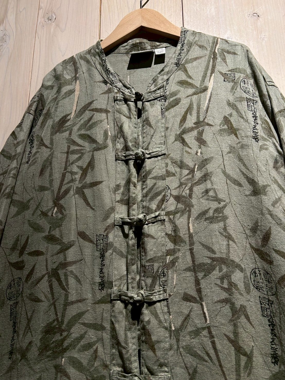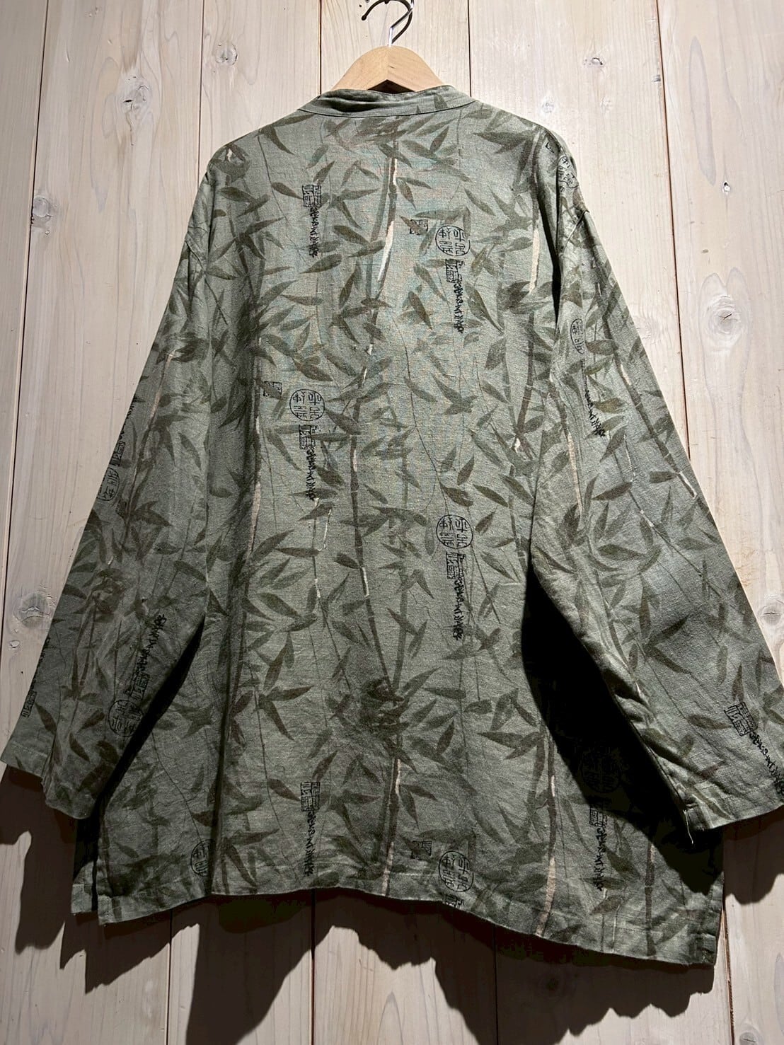 上質なリネンを用いた、くすんだグリーンのボディをベースに漢字や笹の葉を載せた、異国な雰囲気を纏ったチャイナシャツ。