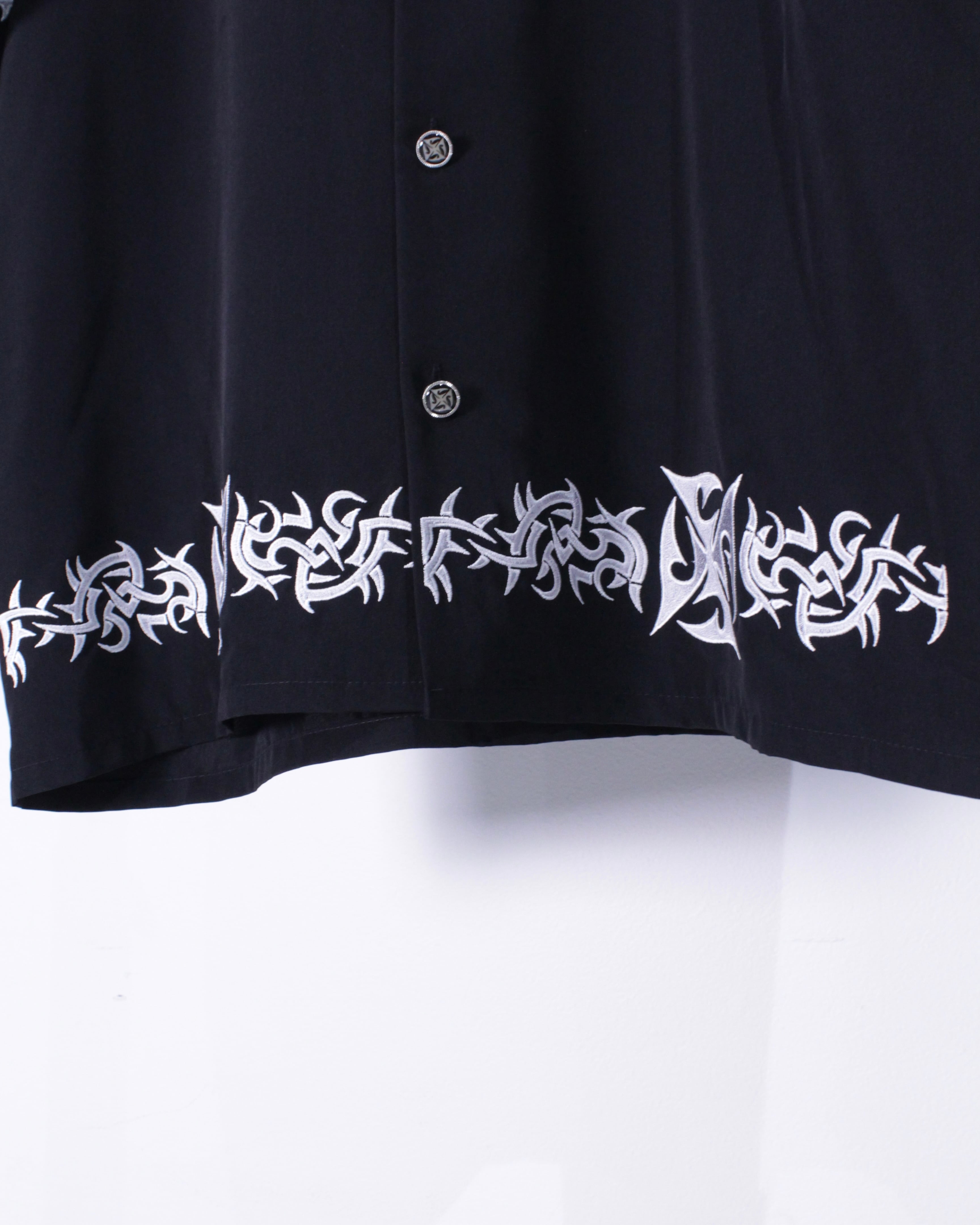 滑らかな質感のブラックのボディに、トライバル調のデザインを刺繍で刻んだ半袖オープンカラーシャツ。