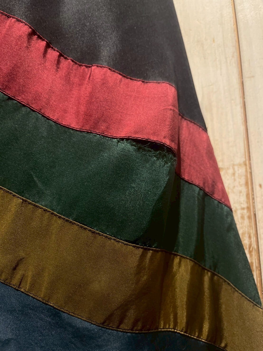 ブラックを基調としたシルクボディに、赤、緑、黄、青といったカラーで切り替えを施し、アーティスティックなデザインに落とし込んだブルゾンジャケット。
