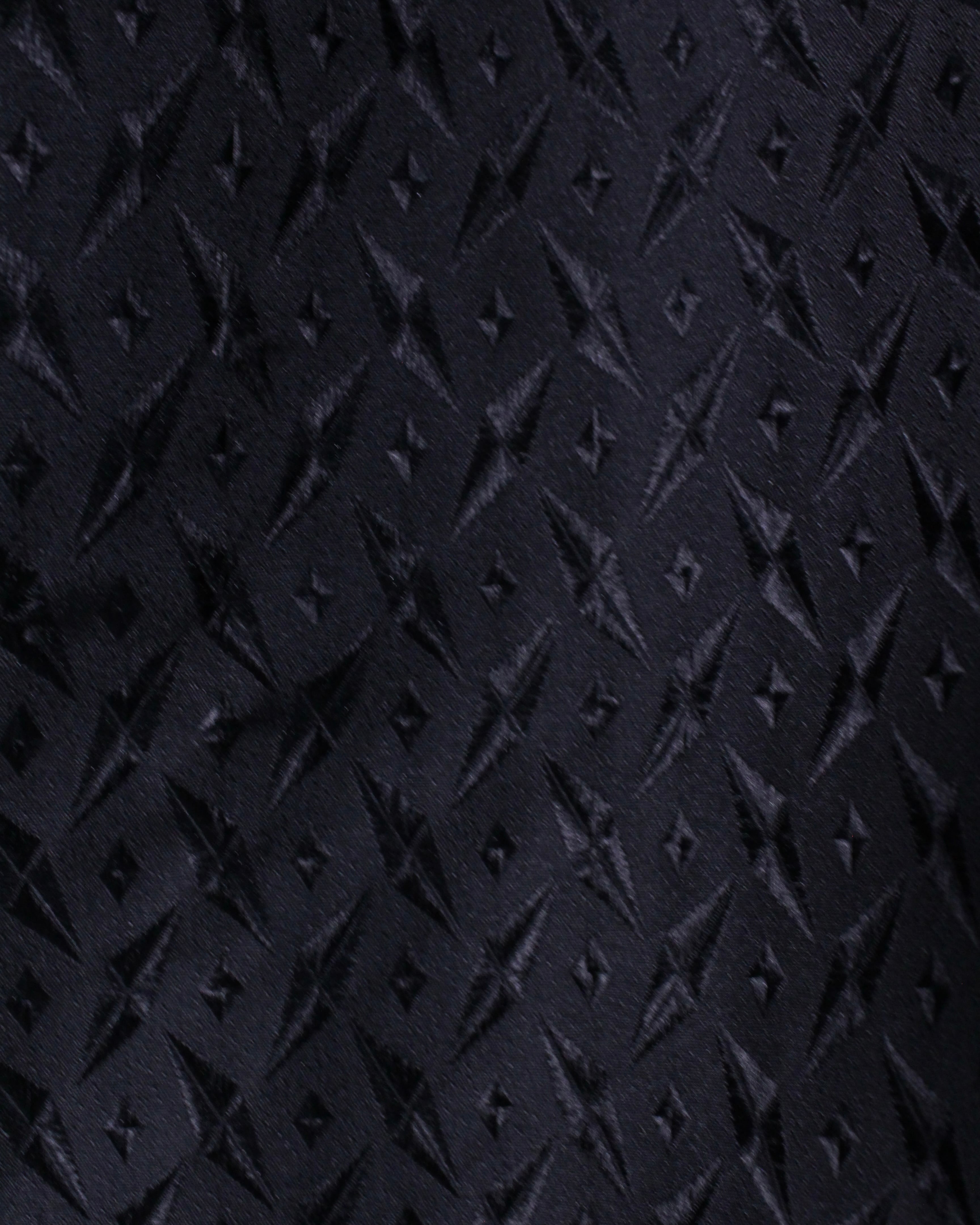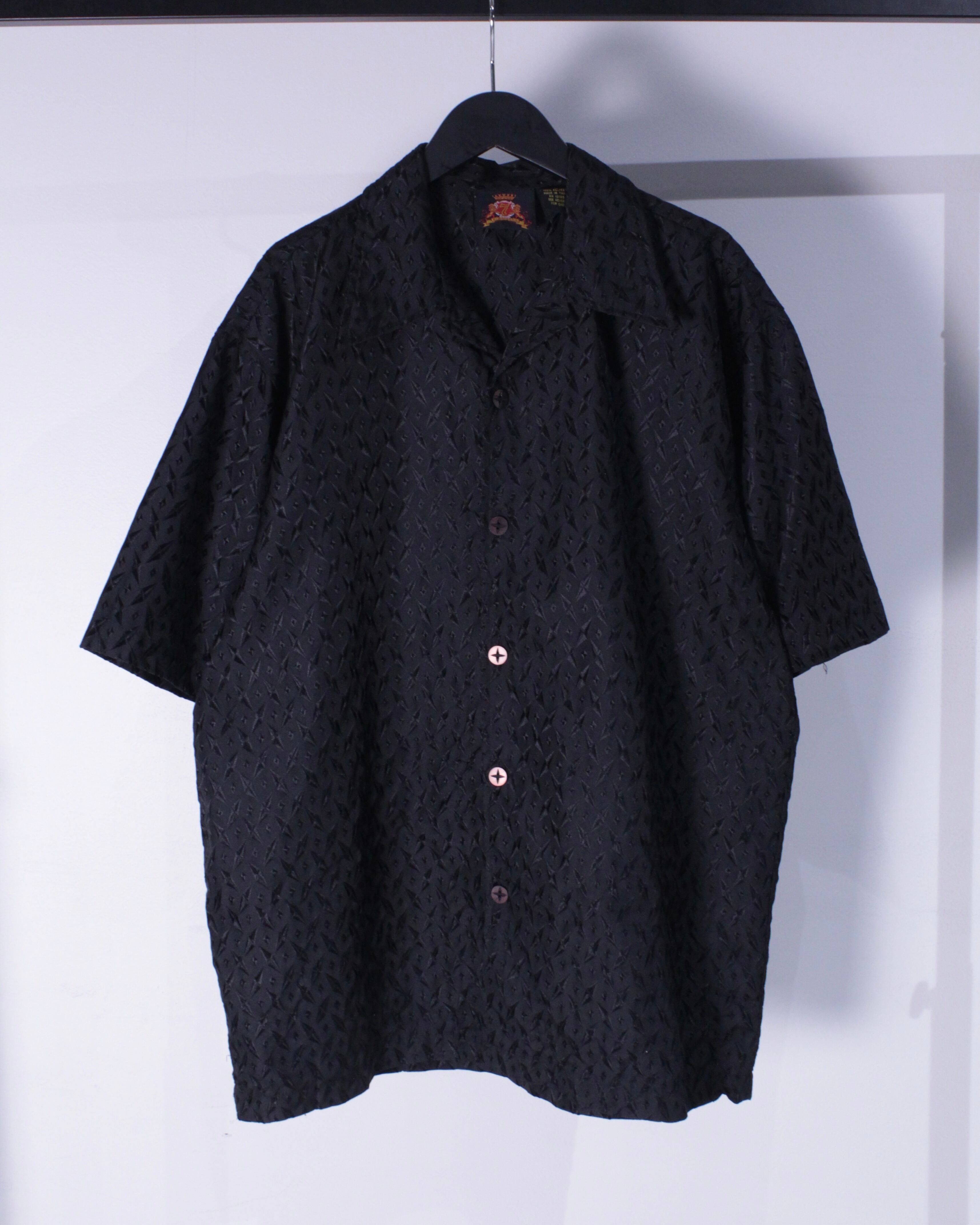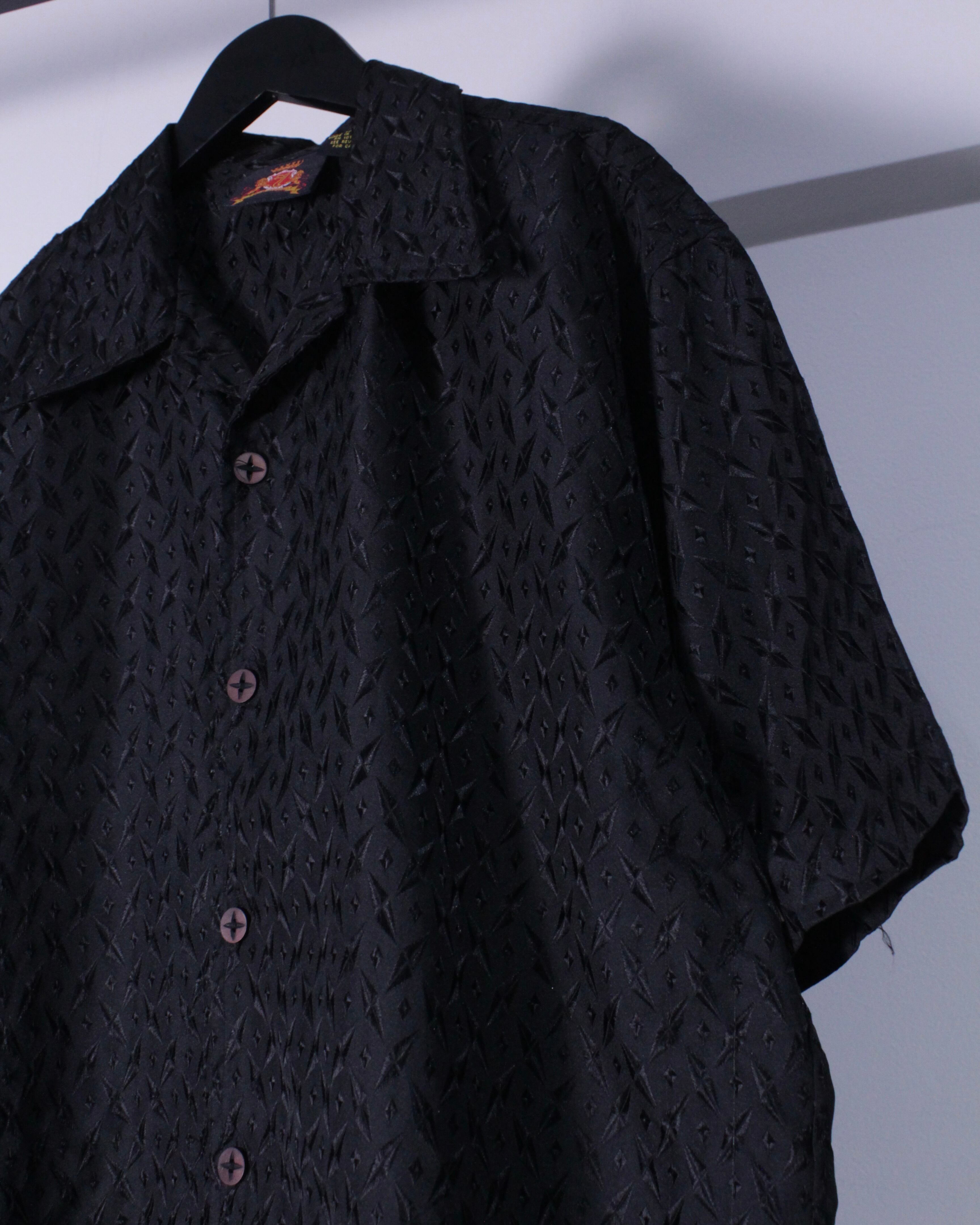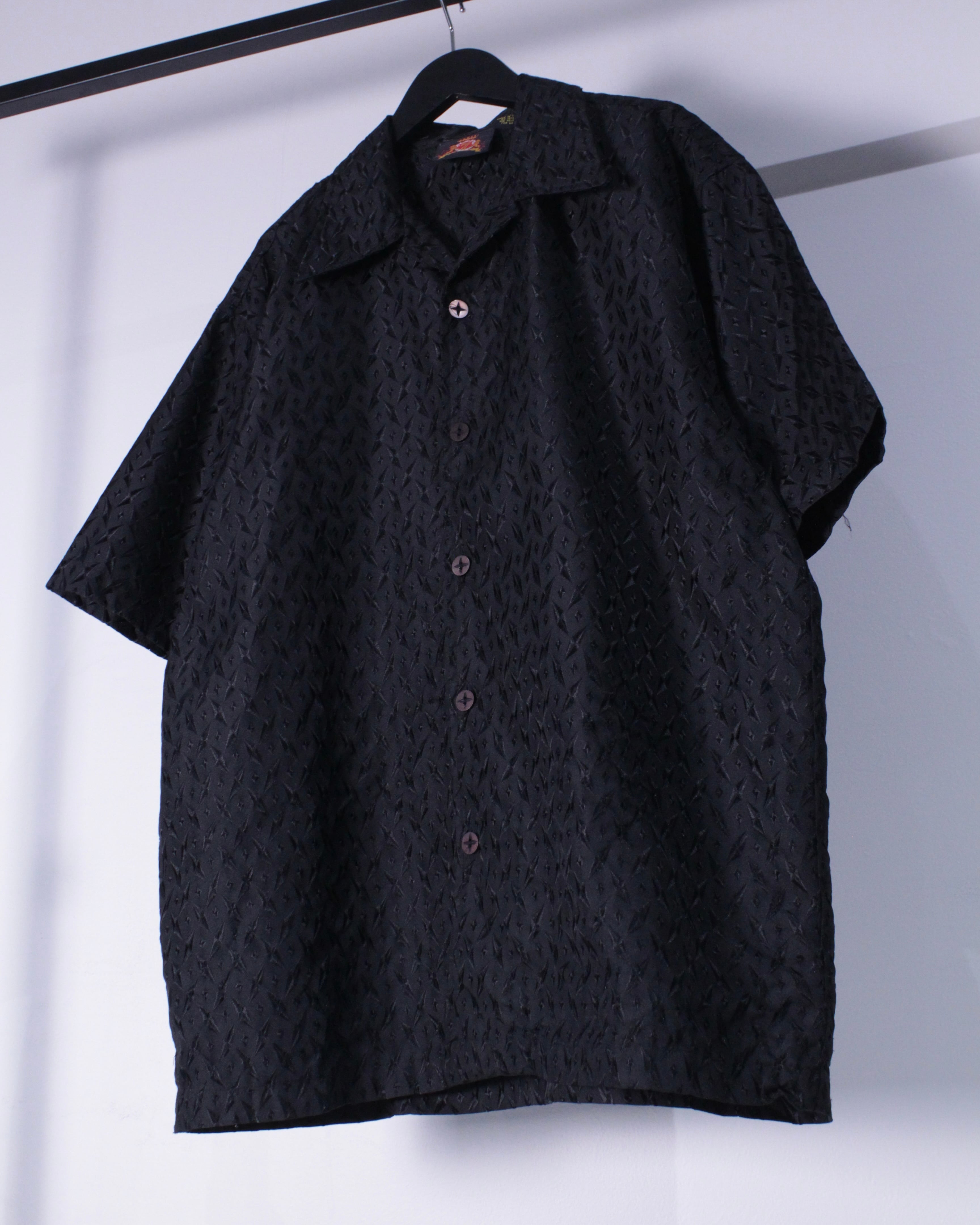 ブラックのボディをベースに、ダイヤモンドシェイプの刺繍を全面に刻み込んだデザイン。ブラック単色でまとめられながらアーティスティックな雰囲気を放つオープンカラー半袖シャツ。