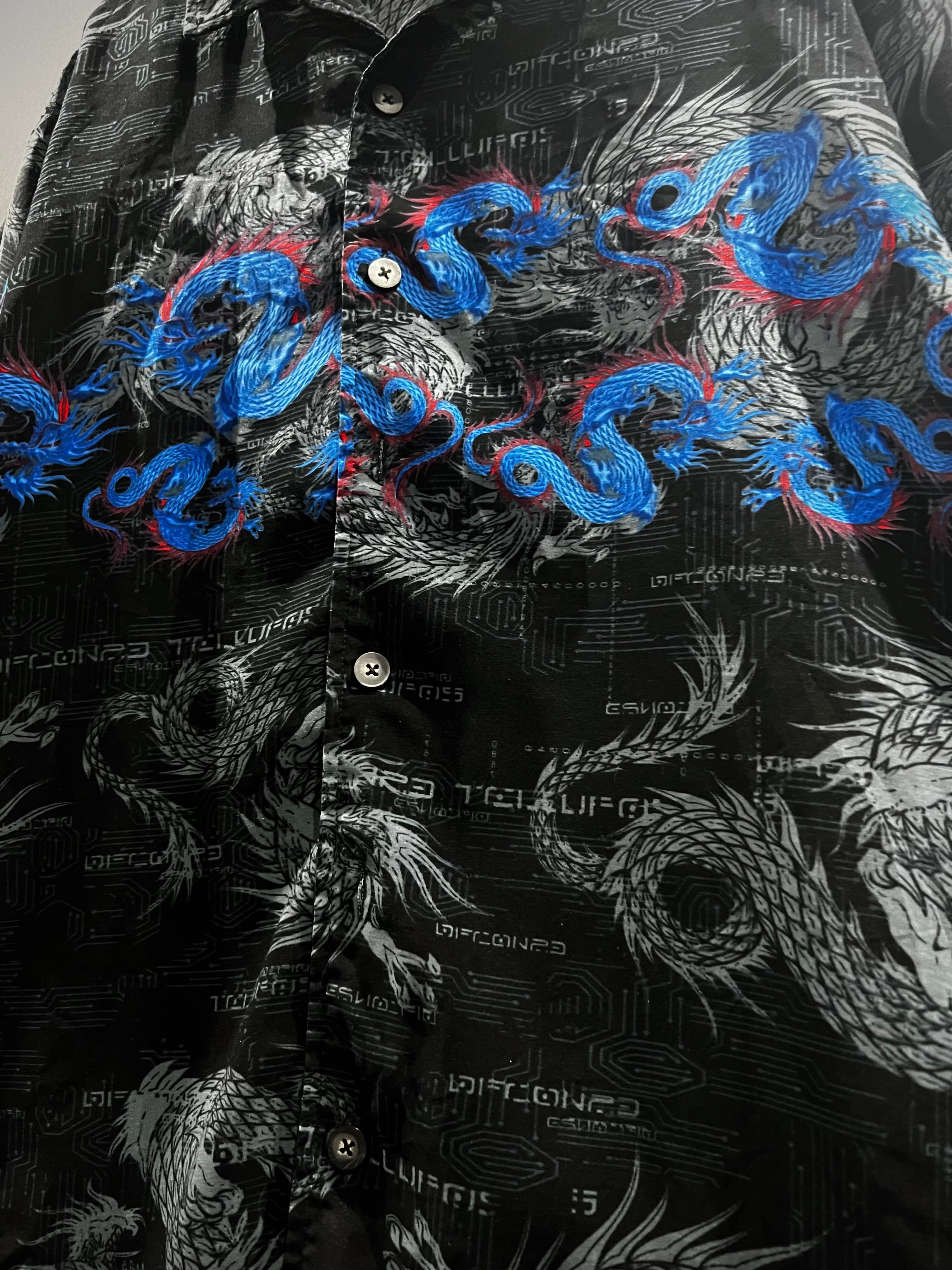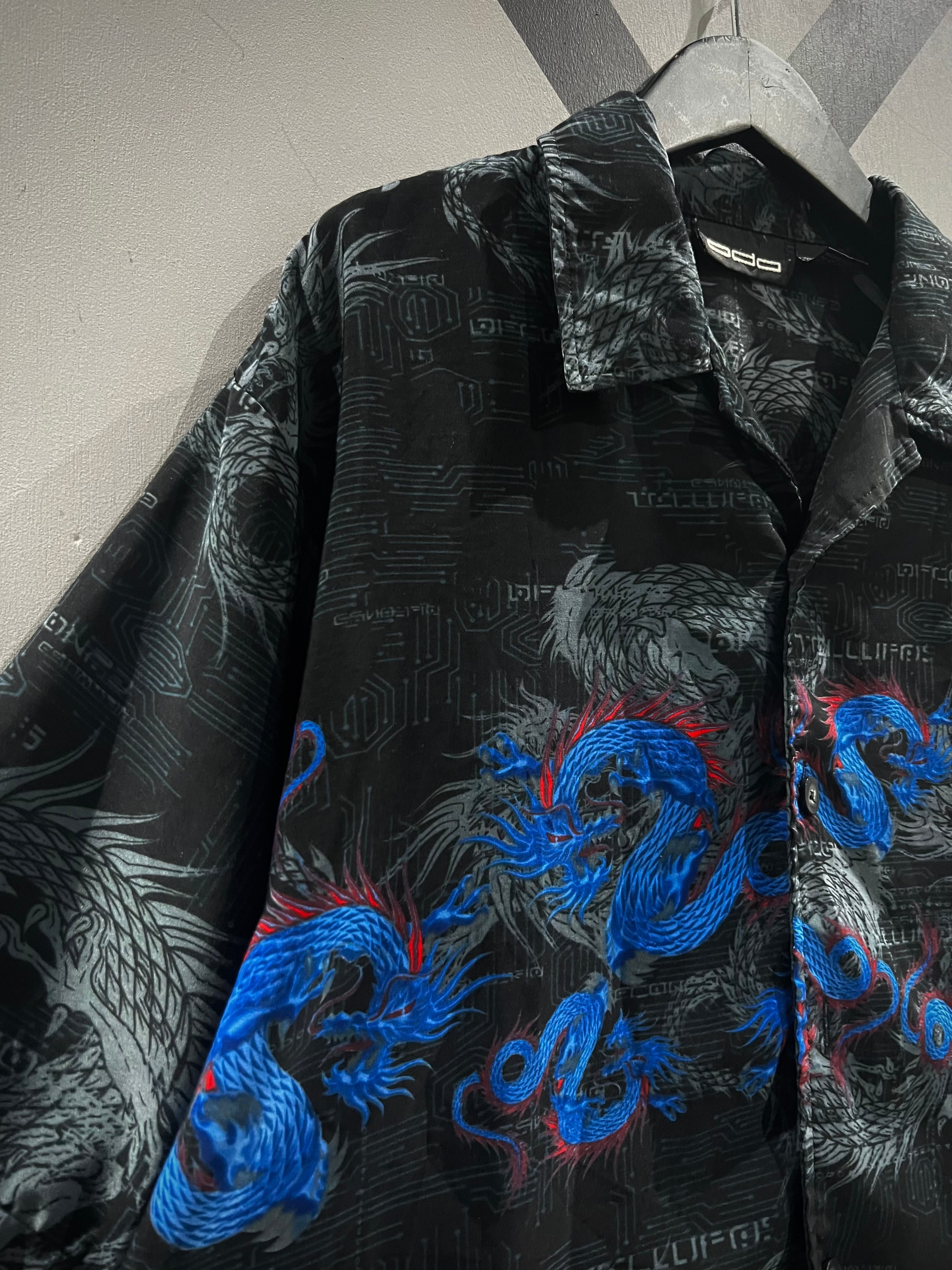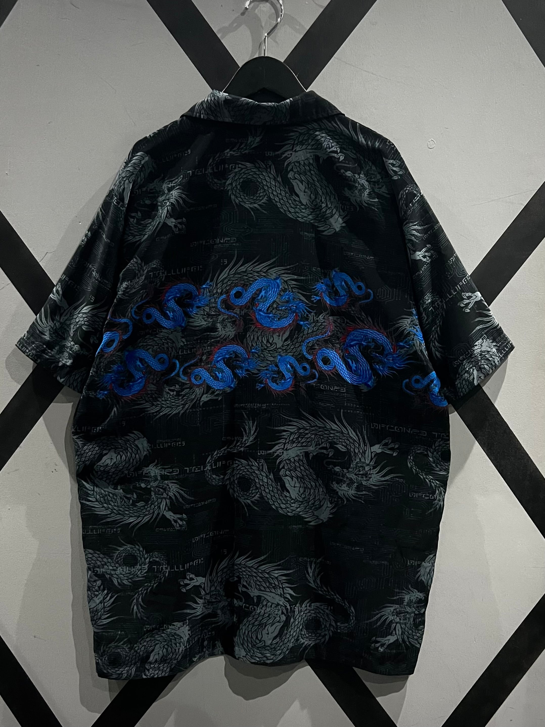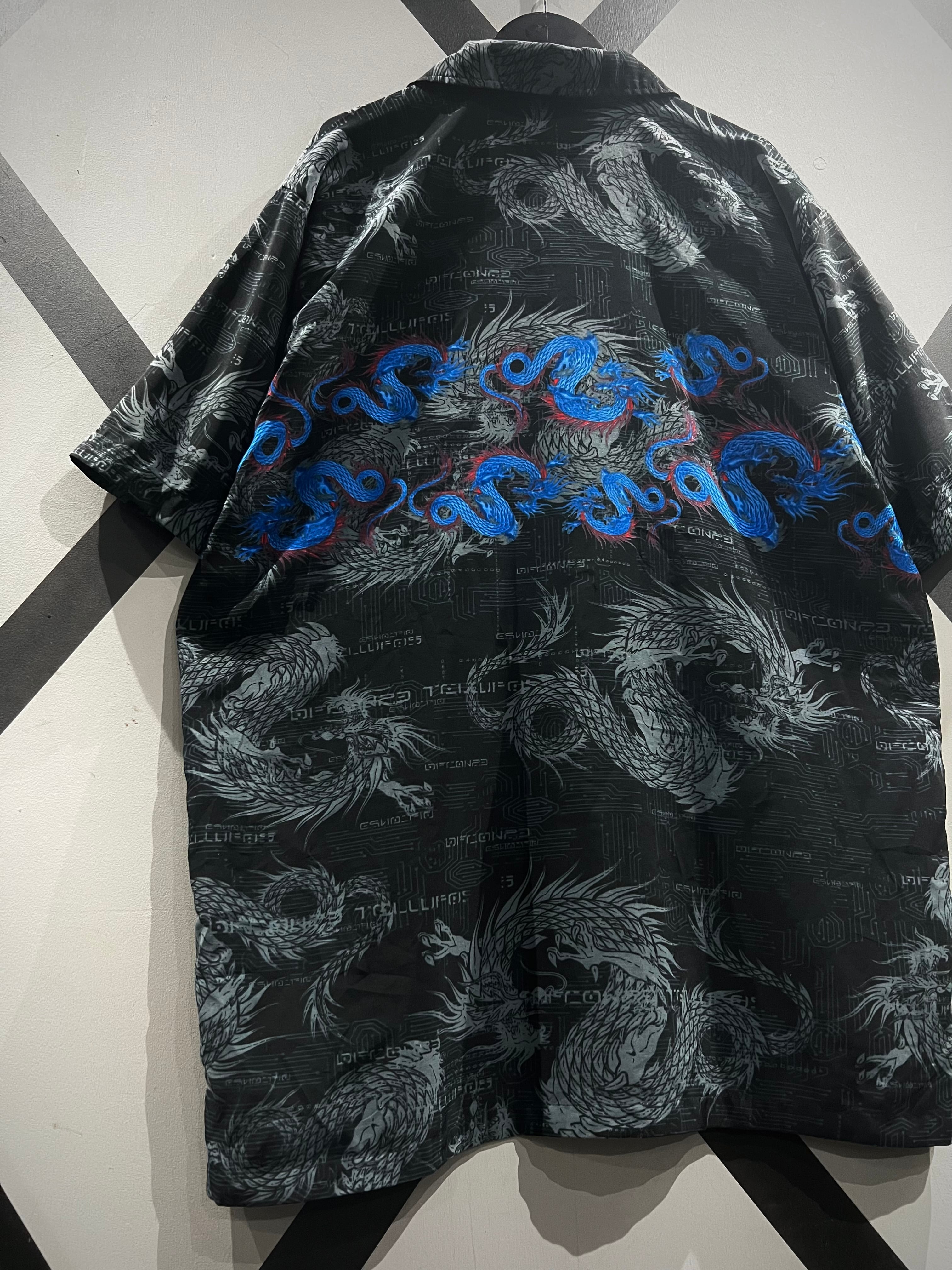 着心地の軽やかなポリエステル素材をベースに、無彩色の龍、鮮やかな青×赤でカラーリングした龍を載せた半袖オープンカラーシャツ。