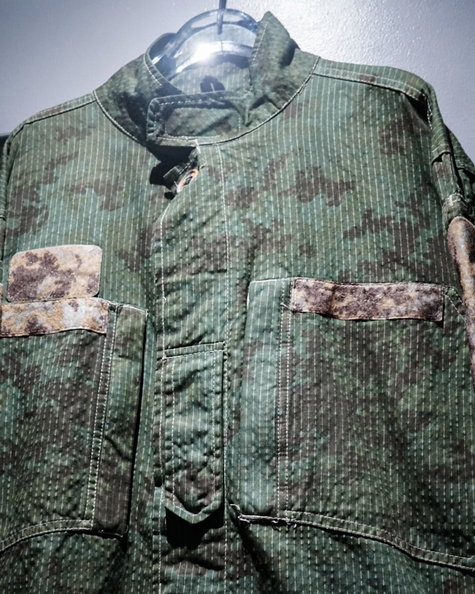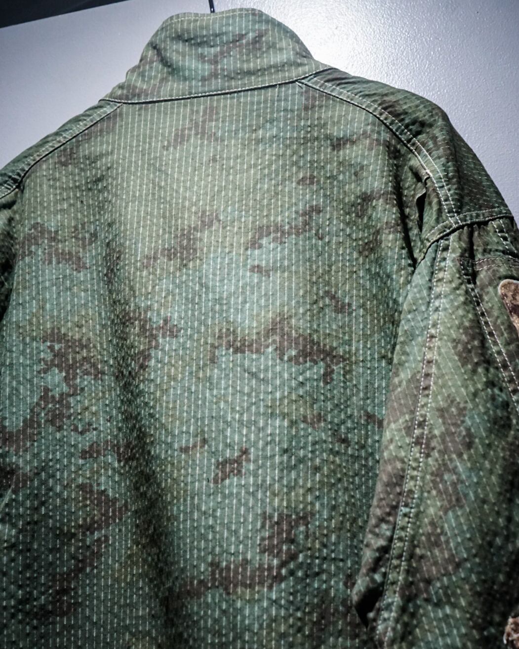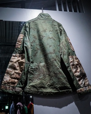 ミリタリーのカモ柄をベースに、イタリア軍特有のベジタトカモの切り替えを施したジャケット。タフな素材感の生地を切り替える事で強度を高めながらデザイン性の高い1着に仕上がっています。