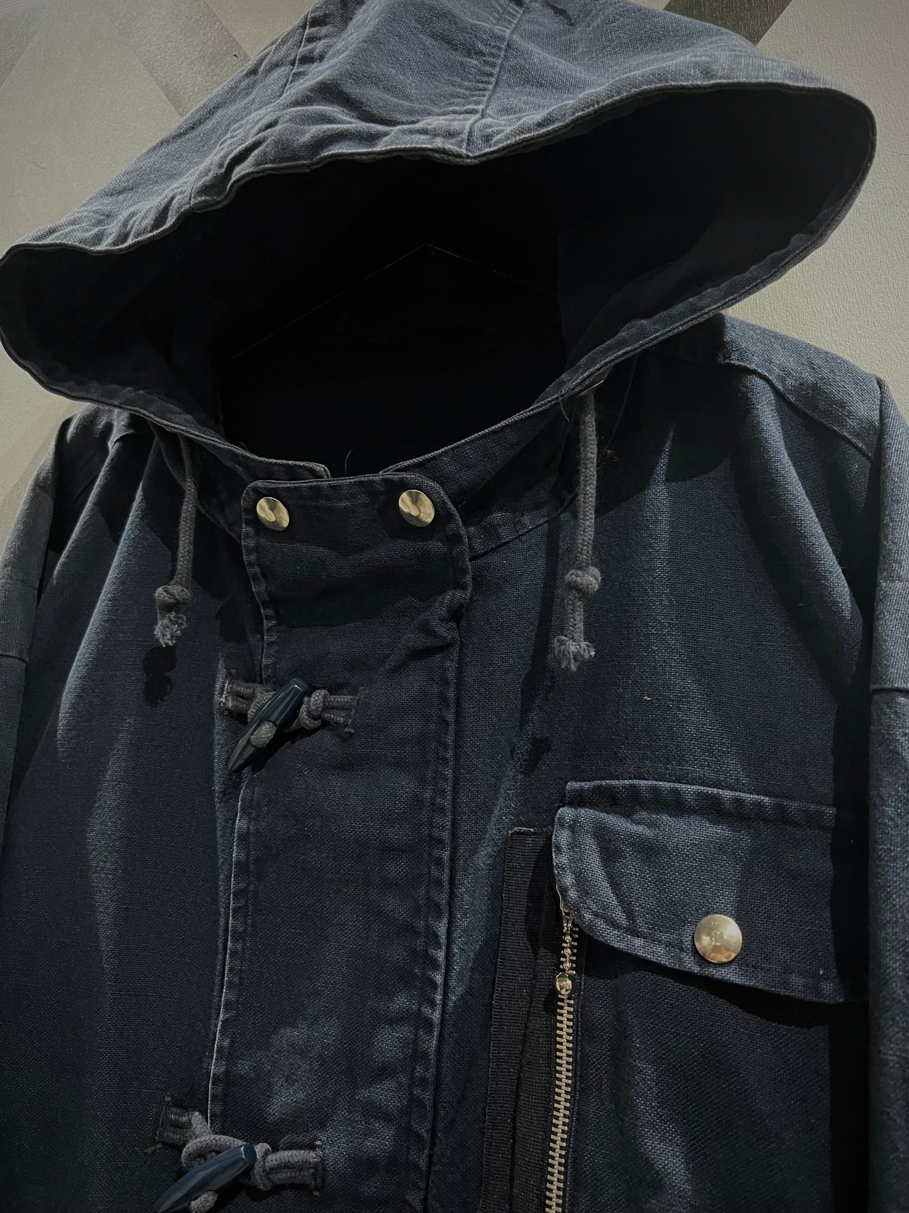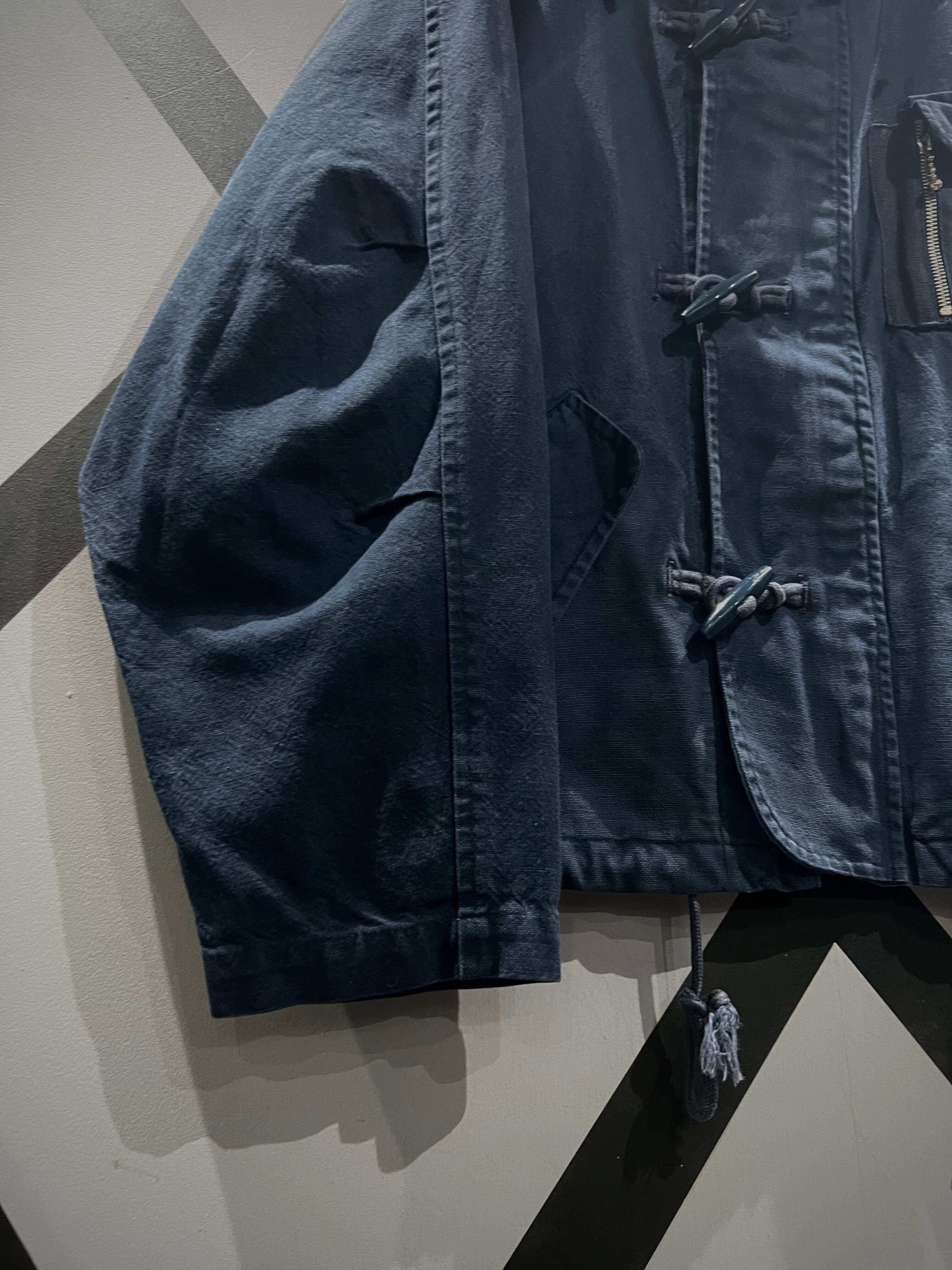 コシのあるネイビーの生地を用いて、フロントにトグルボタンのギミックを載せたフーディジャケット。