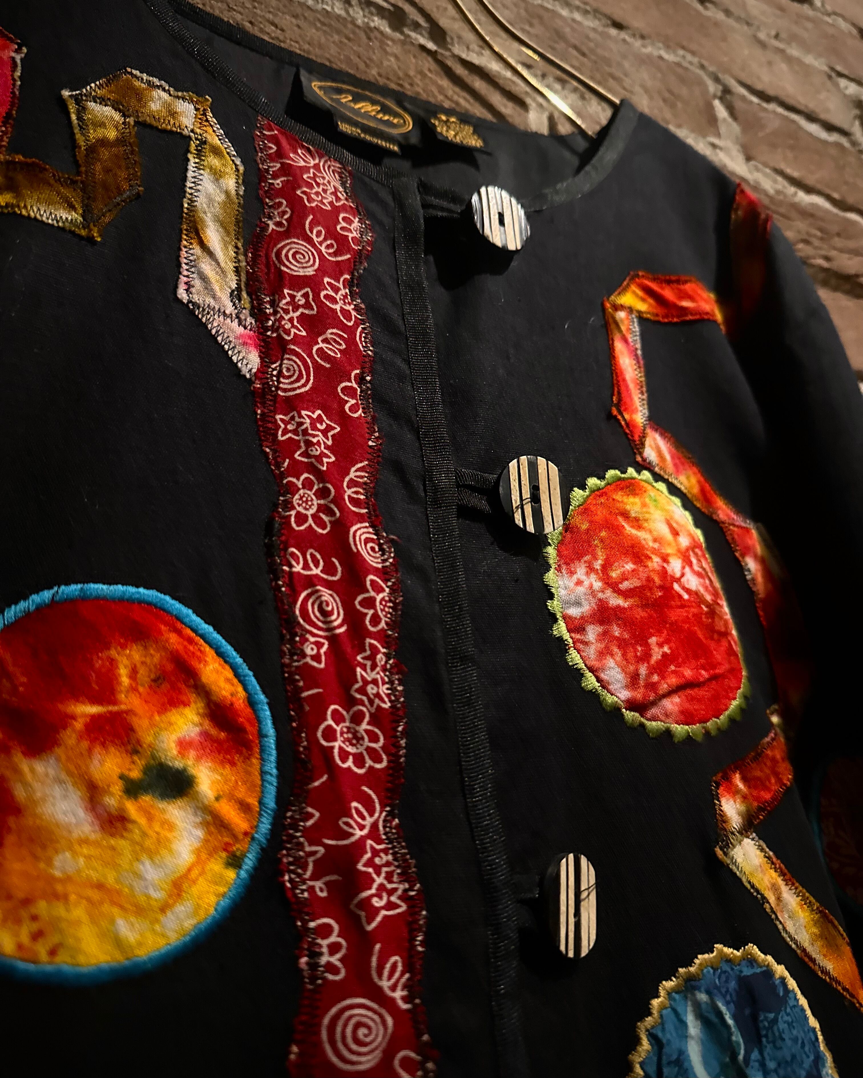 ブラックベースのボディに、色とりどりのアーティスティックなドット柄を載せたジャケット。