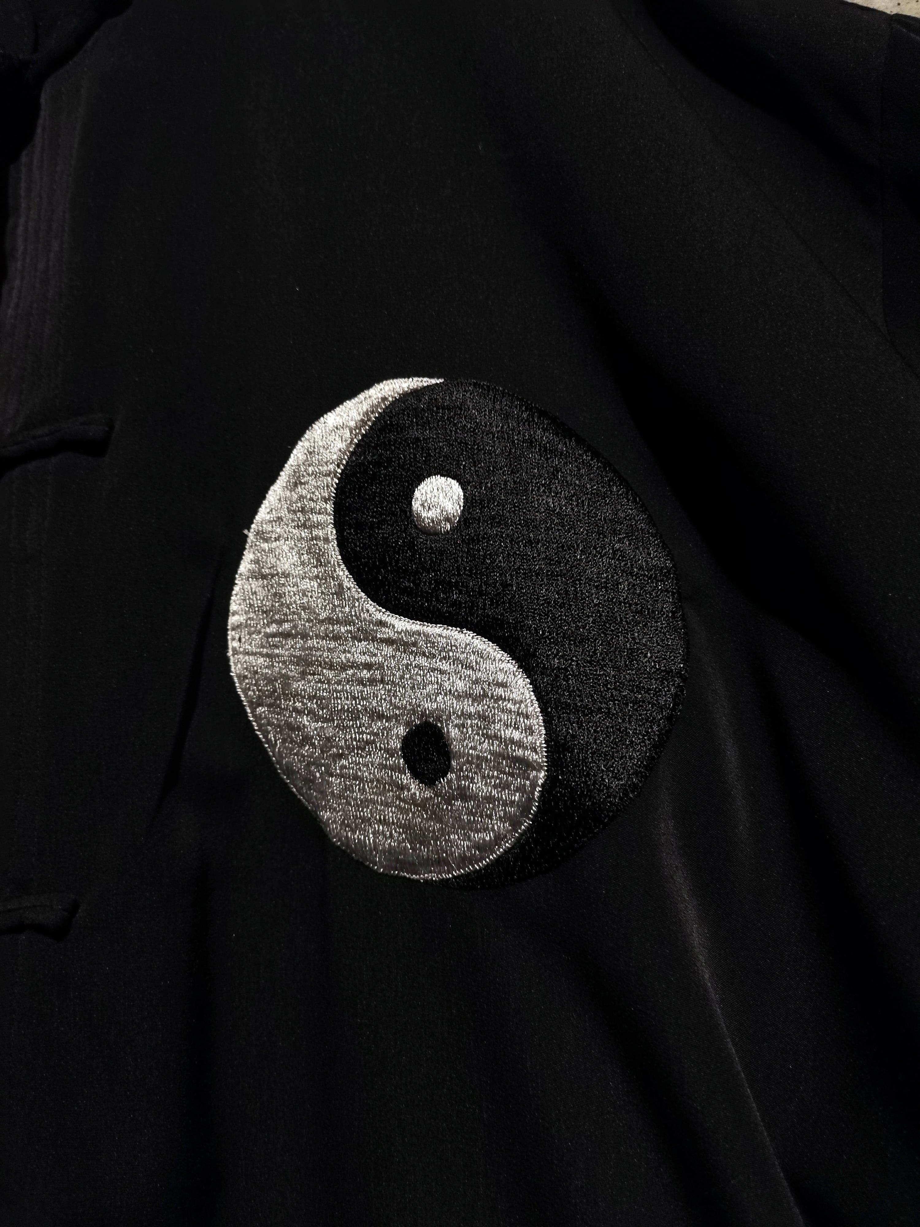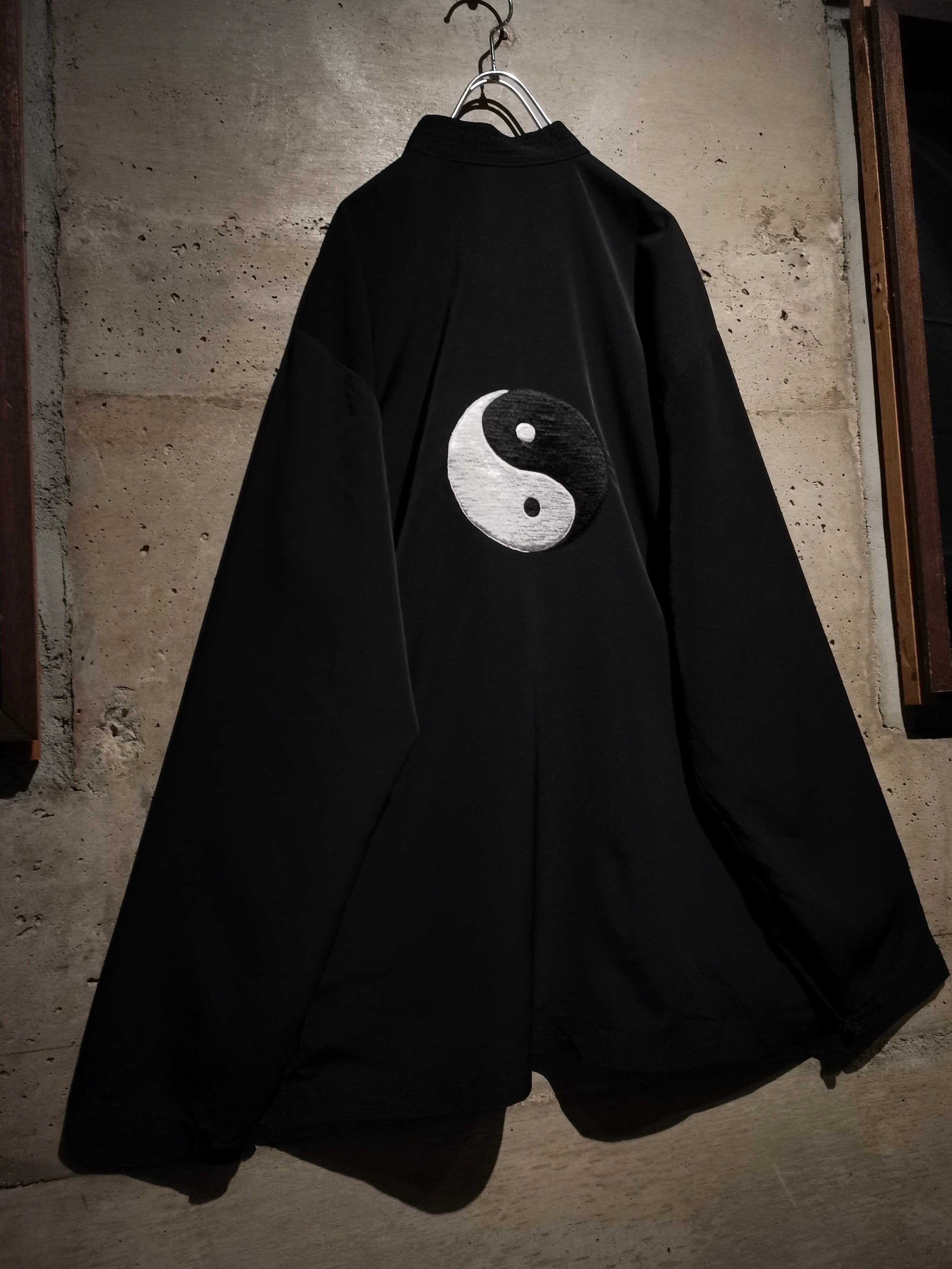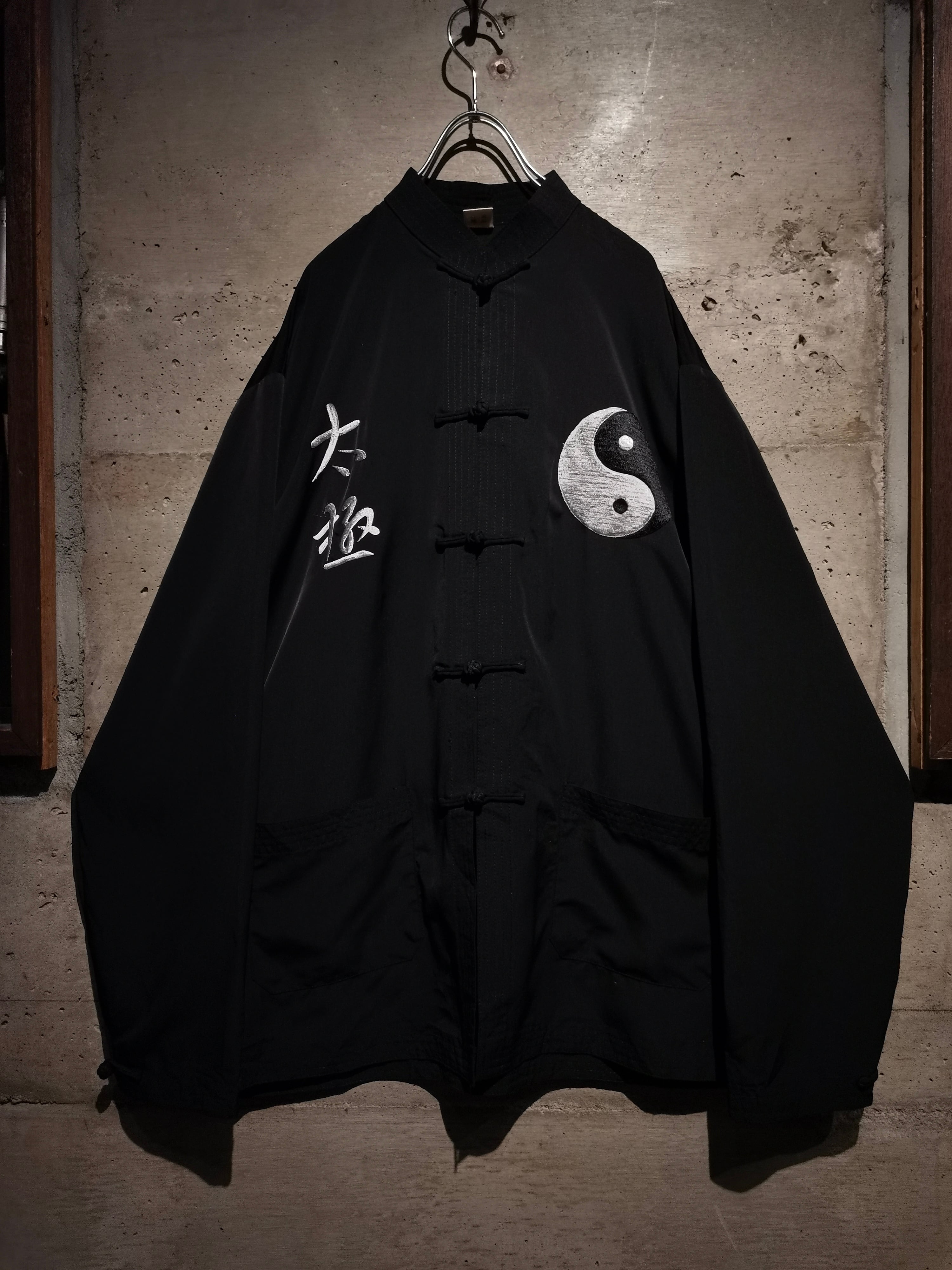 ツルッと滑らかな質感のボディに、"太極"の文字と陰陽のマークを刺繍によって刻み込んだチャイナシャツ。