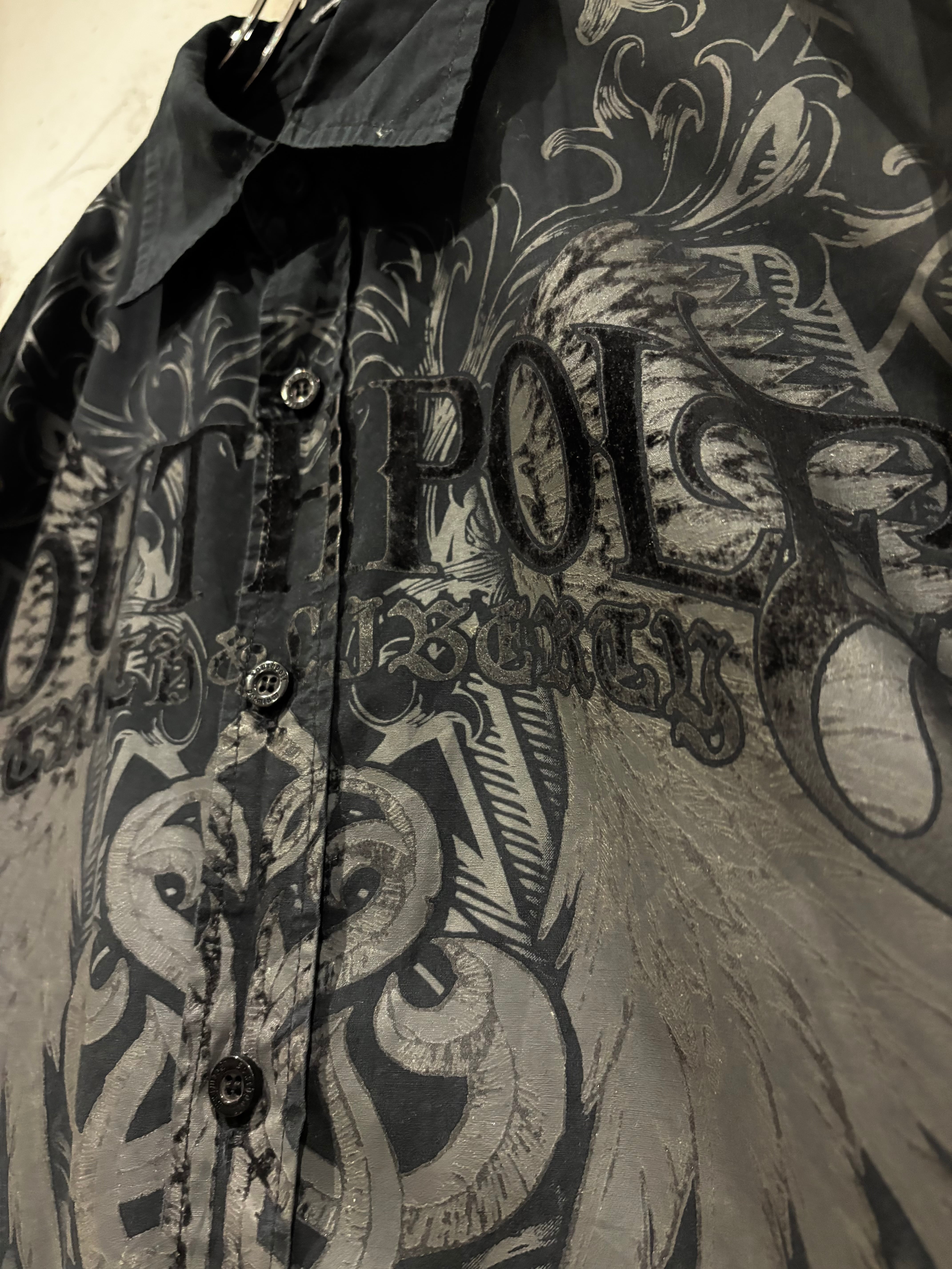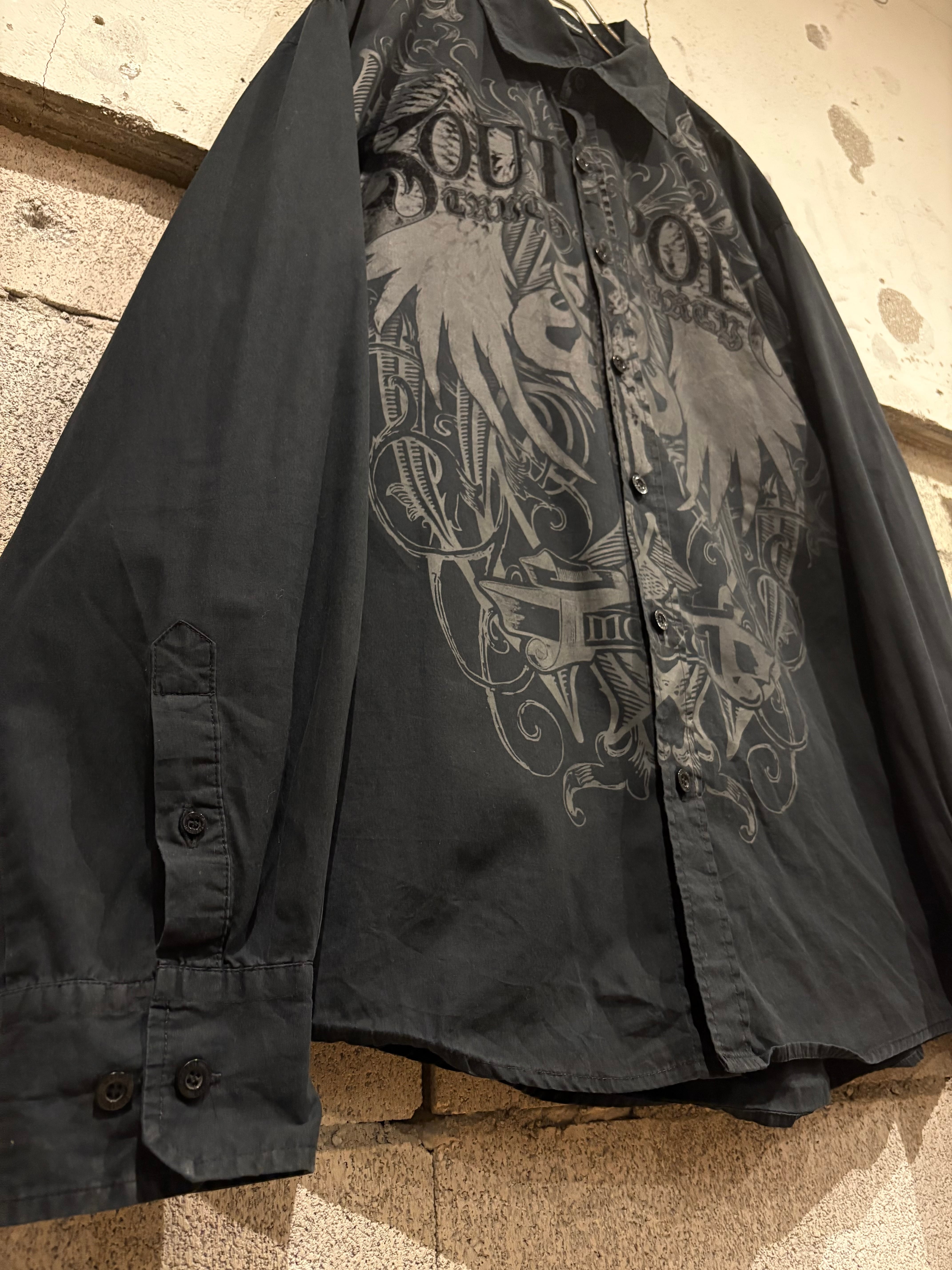 ブラックのボディをベースに、ゴシック風のタッチでブランドロゴを載せた長袖シャツ。